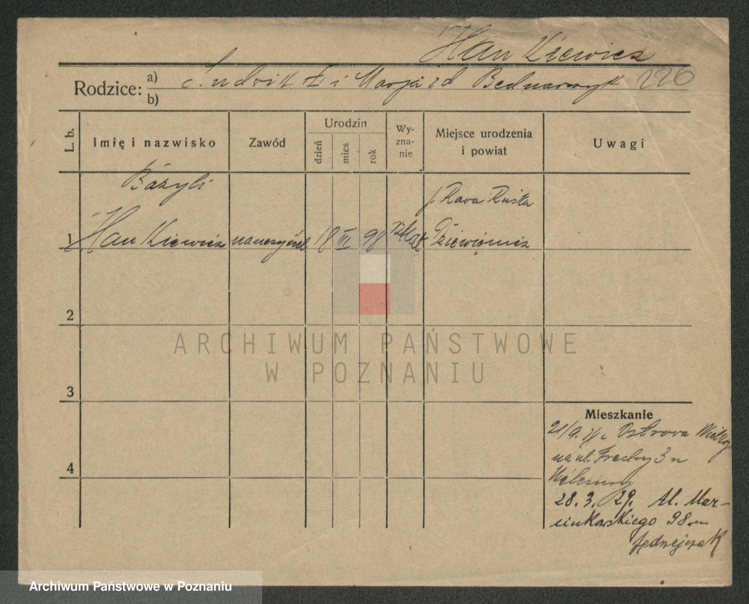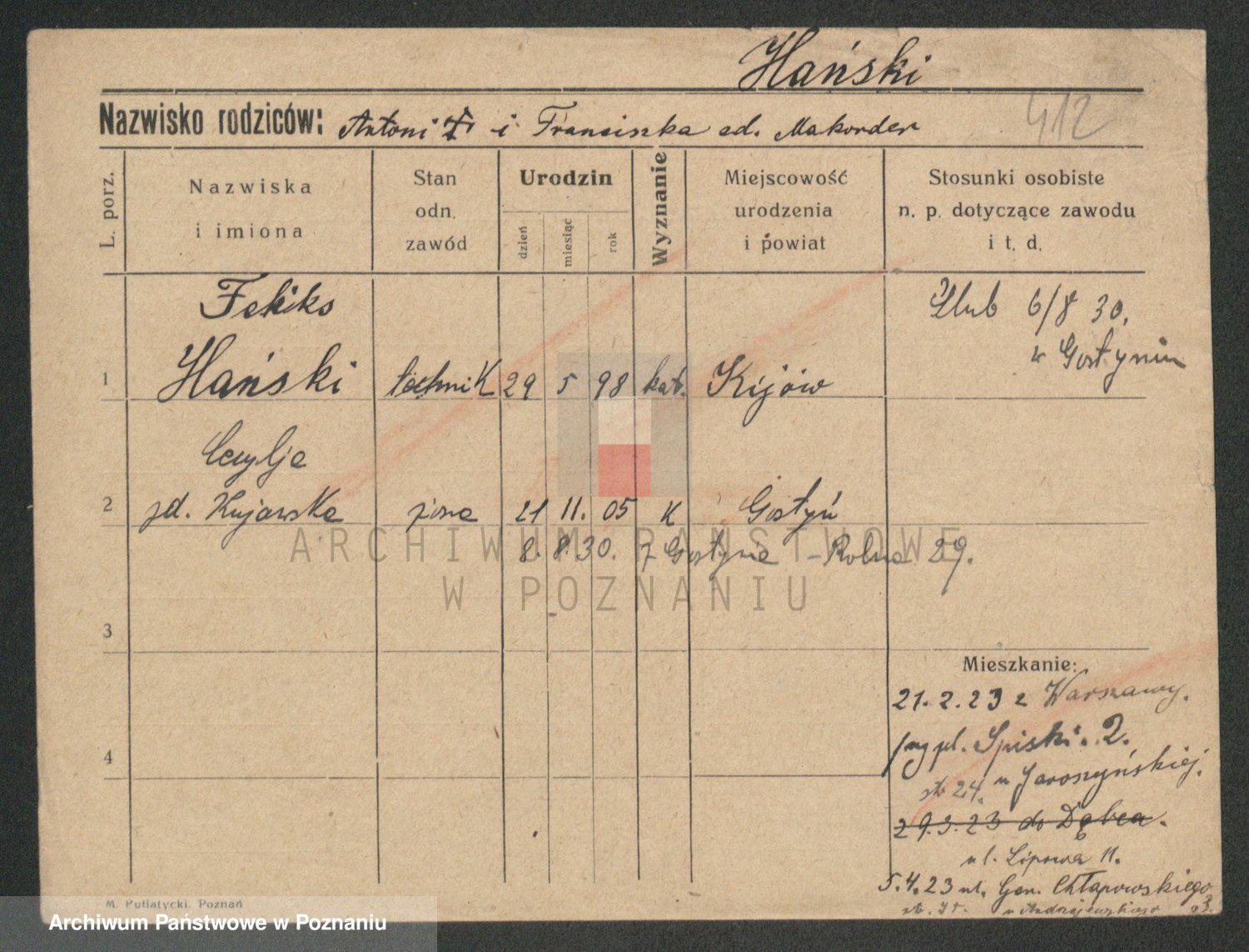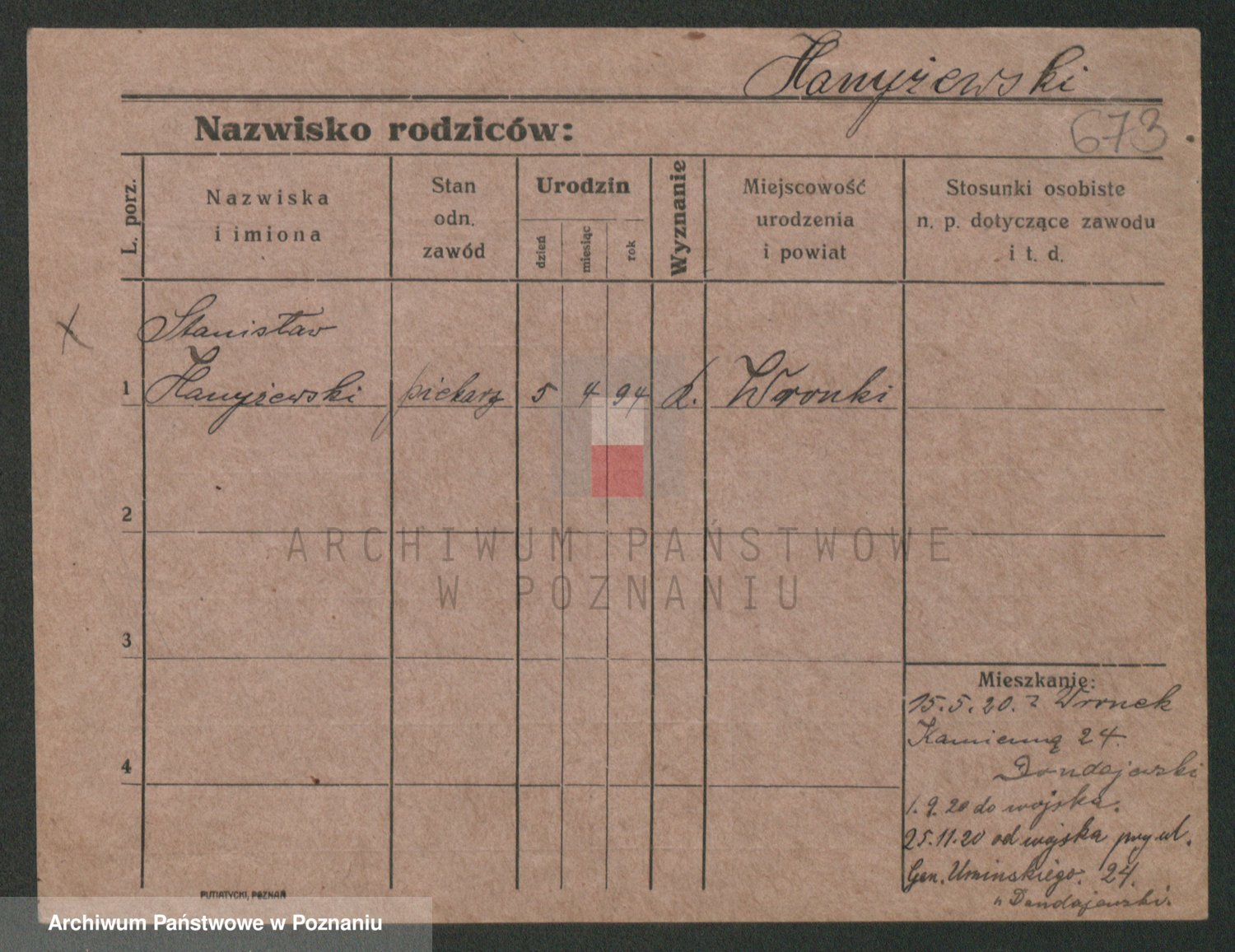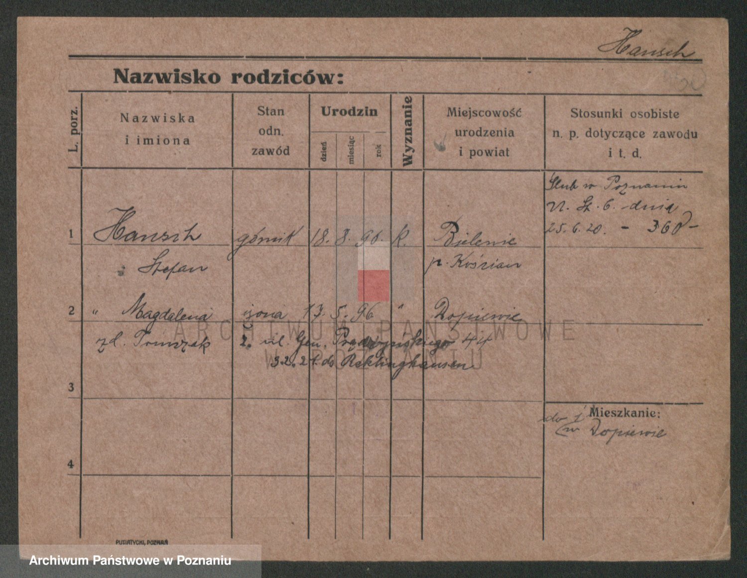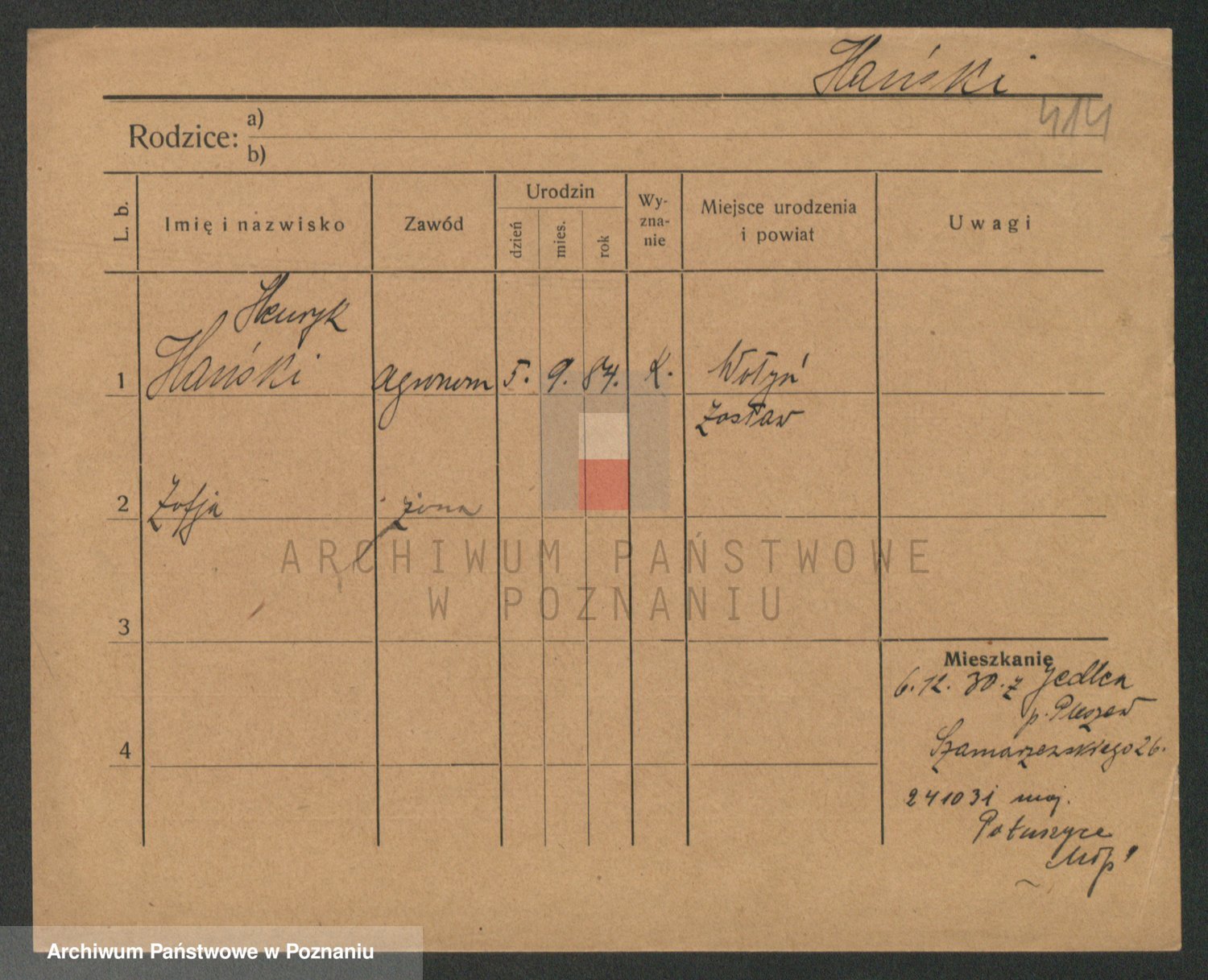 Podgląd karty osobowej dostępny jest po kliknięciu na nazwisko lub ikonkę karty. Można dokonywać powiększenia (ikony na górze) lub przechodzić między kolejnymi skanami (strzałki po bokach).