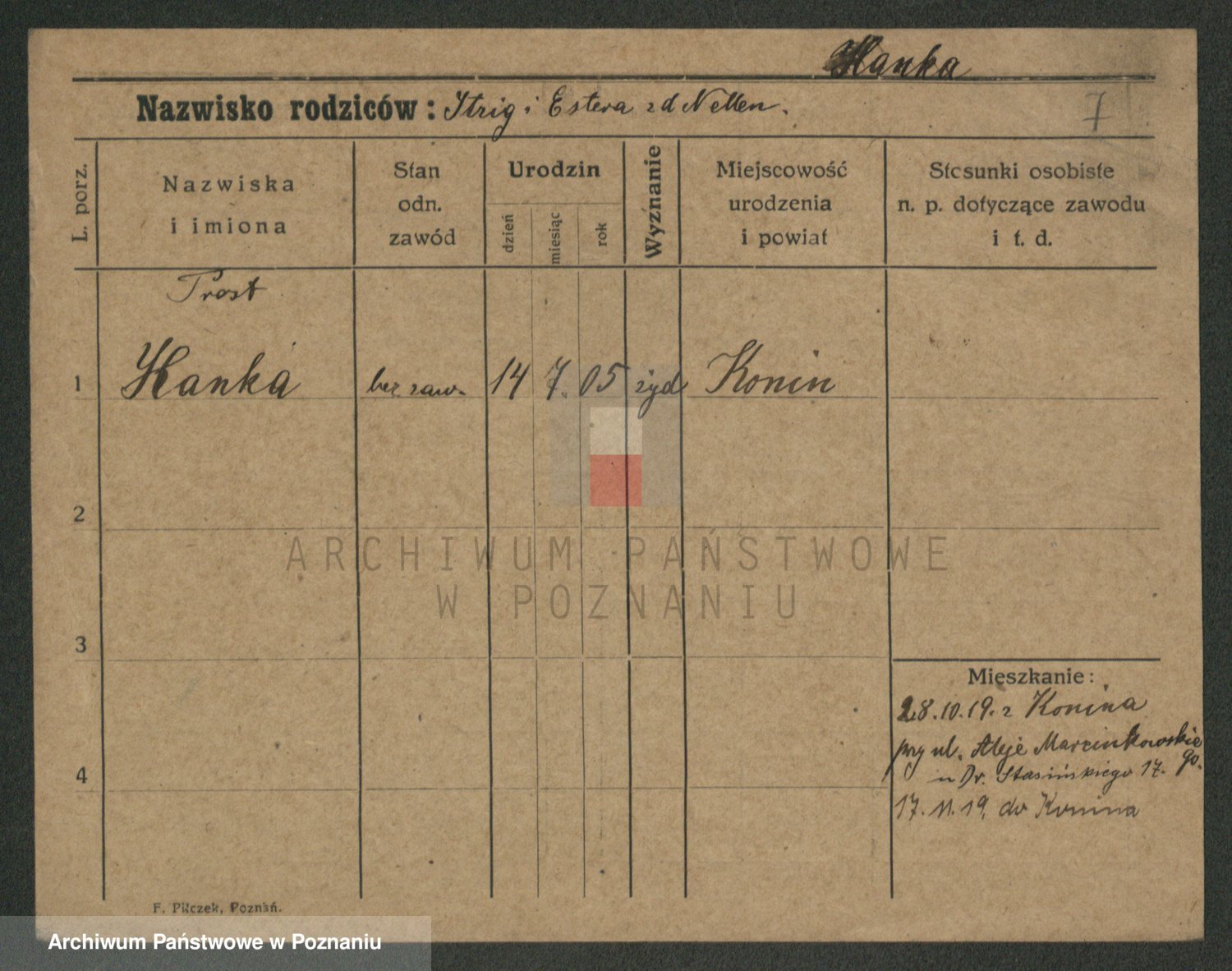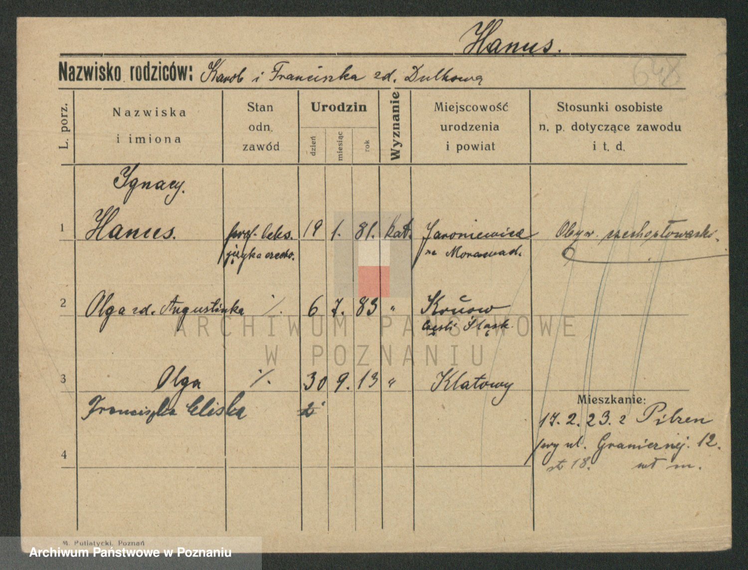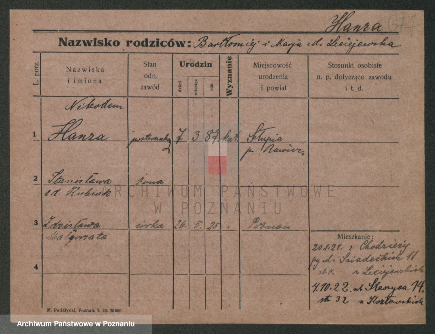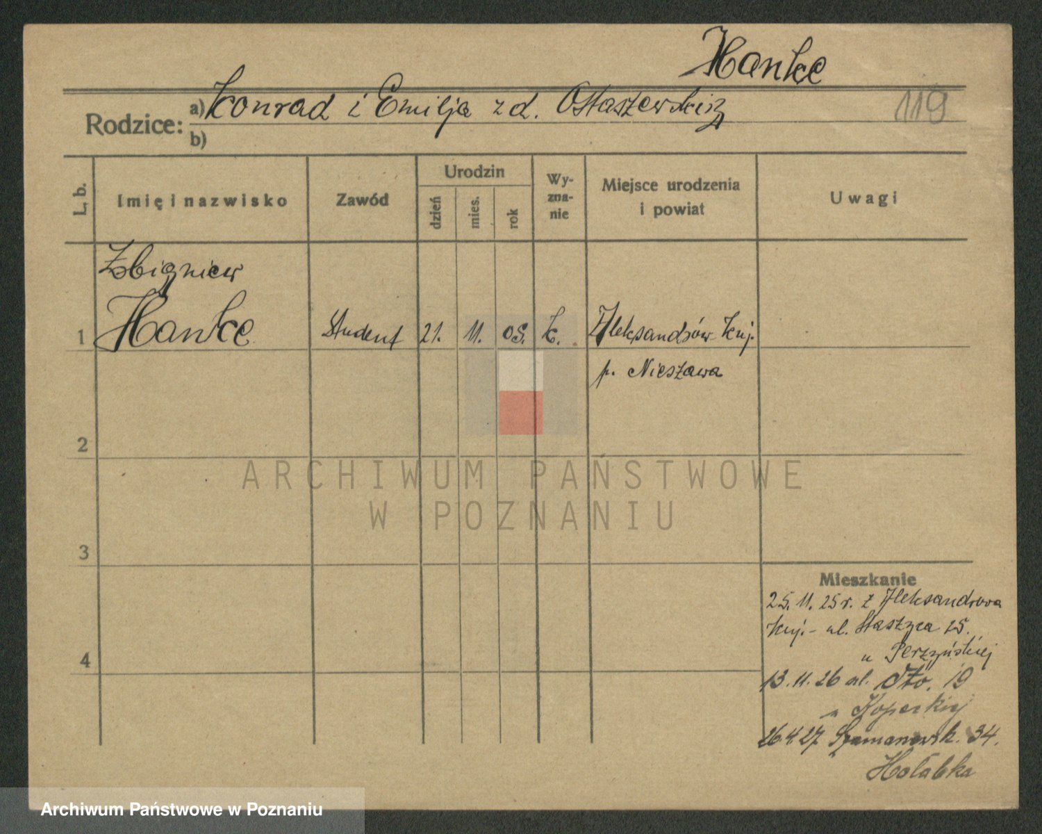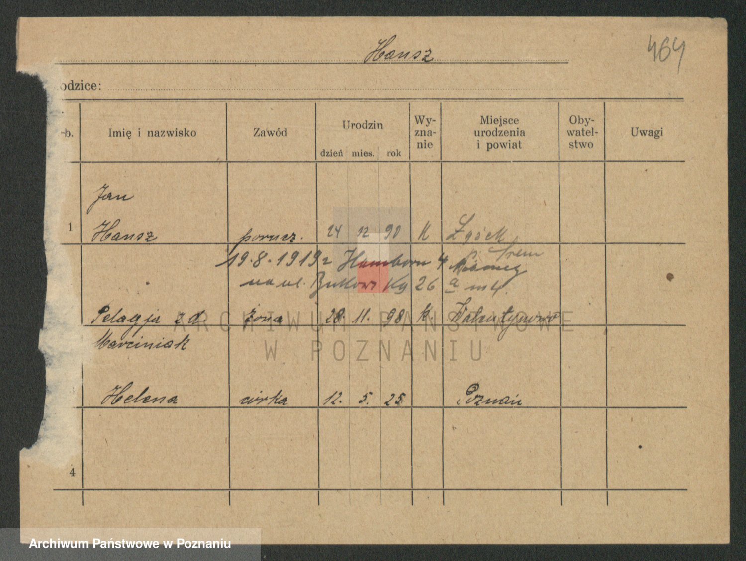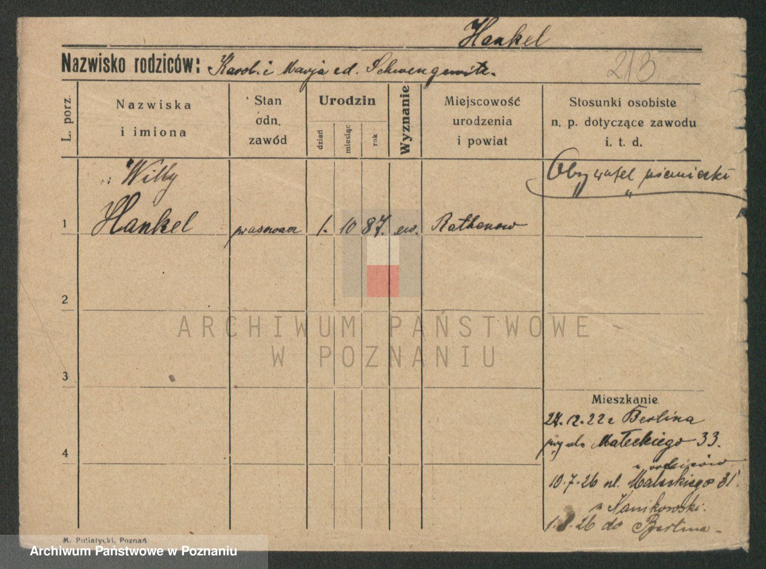 Podgląd karty osobowej dostępny jest po kliknięciu na nazwisko lub ikonkę karty. Można dokonywać powiększenia (ikony na górze) lub przechodzić między kolejnymi skanami (strzałki po bokach).
