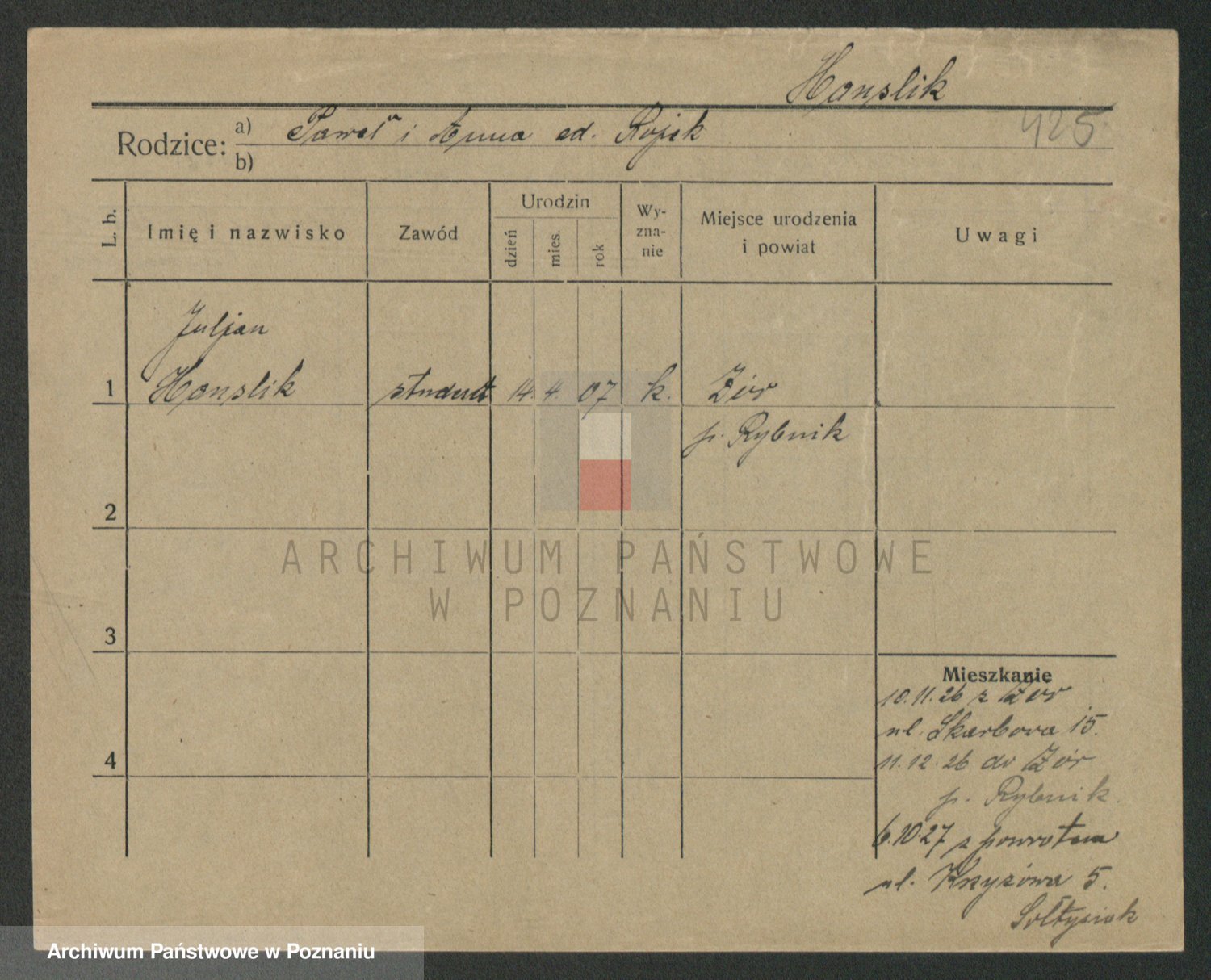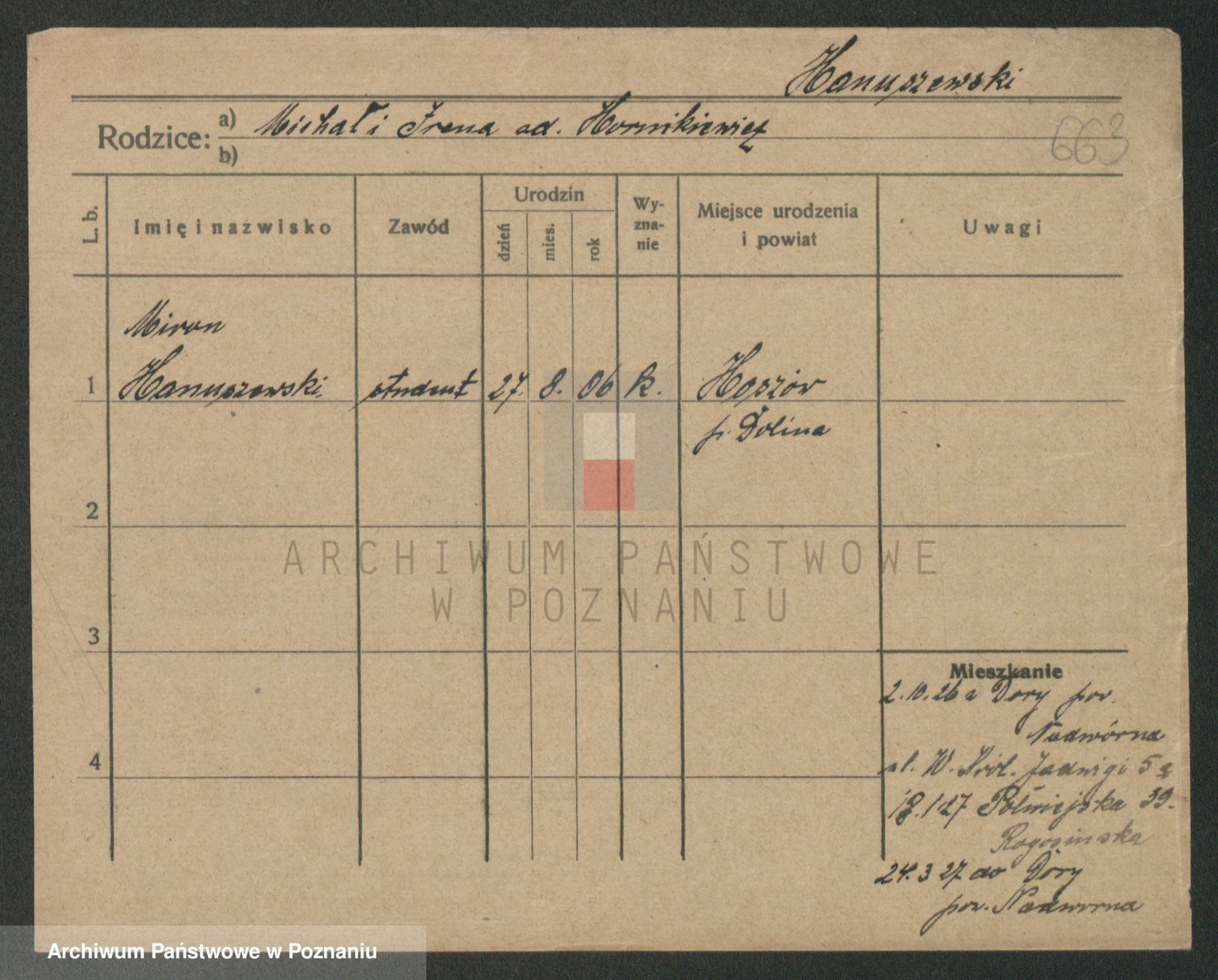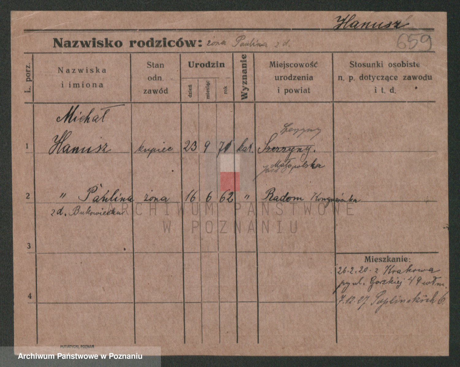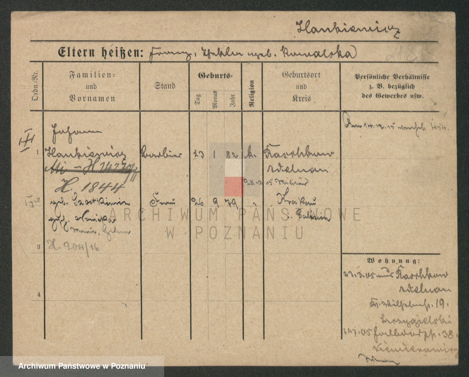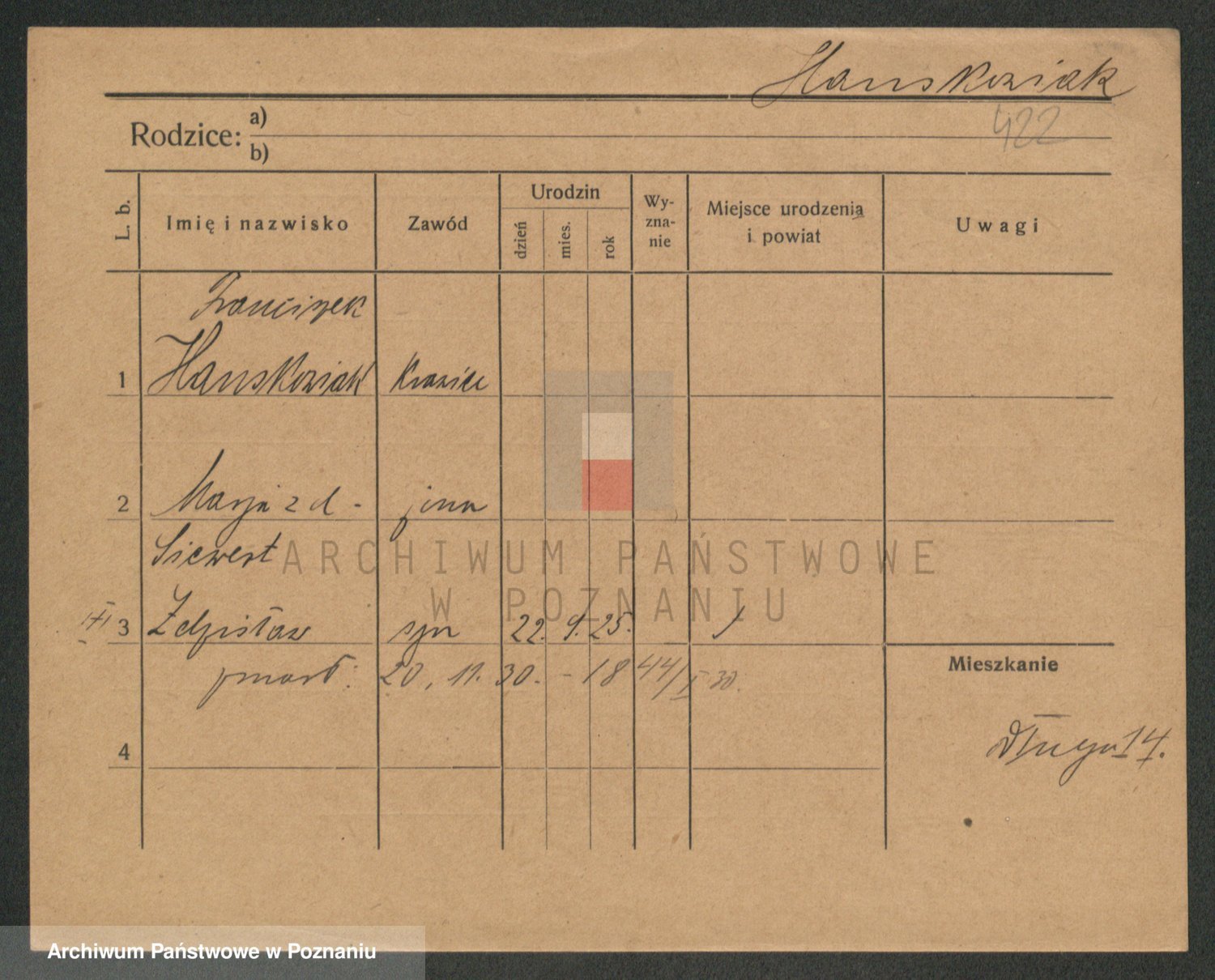 Podgląd karty osobowej dostępny jest po kliknięciu na nazwisko lub ikonkę karty. Można dokonywać powiększenia (ikony na górze) lub przechodzić między kolejnymi skanami (strzałki po bokach).