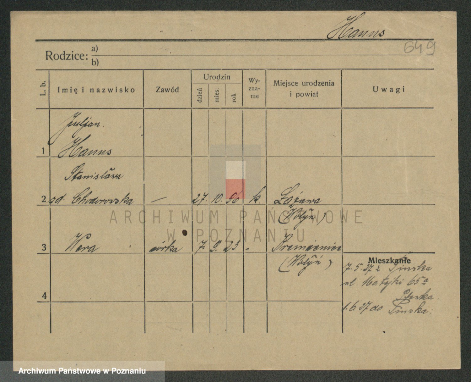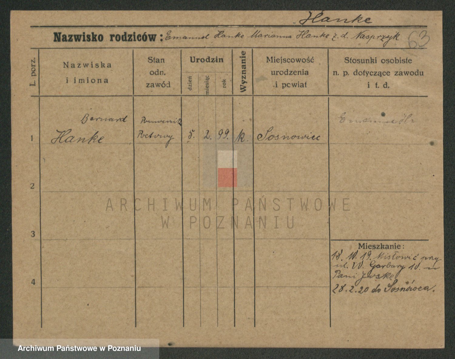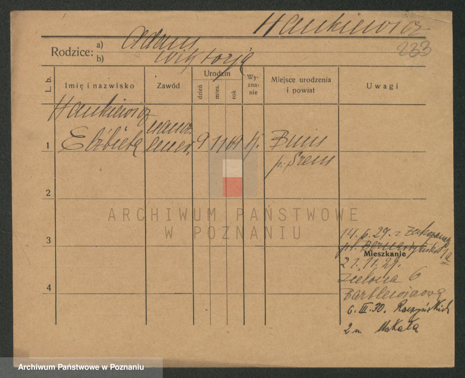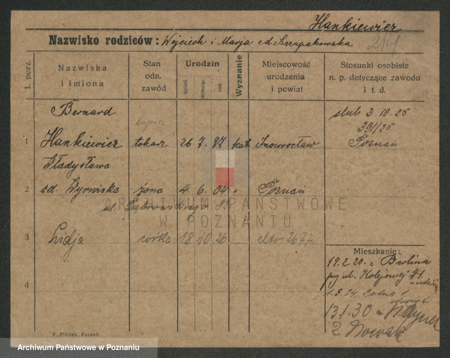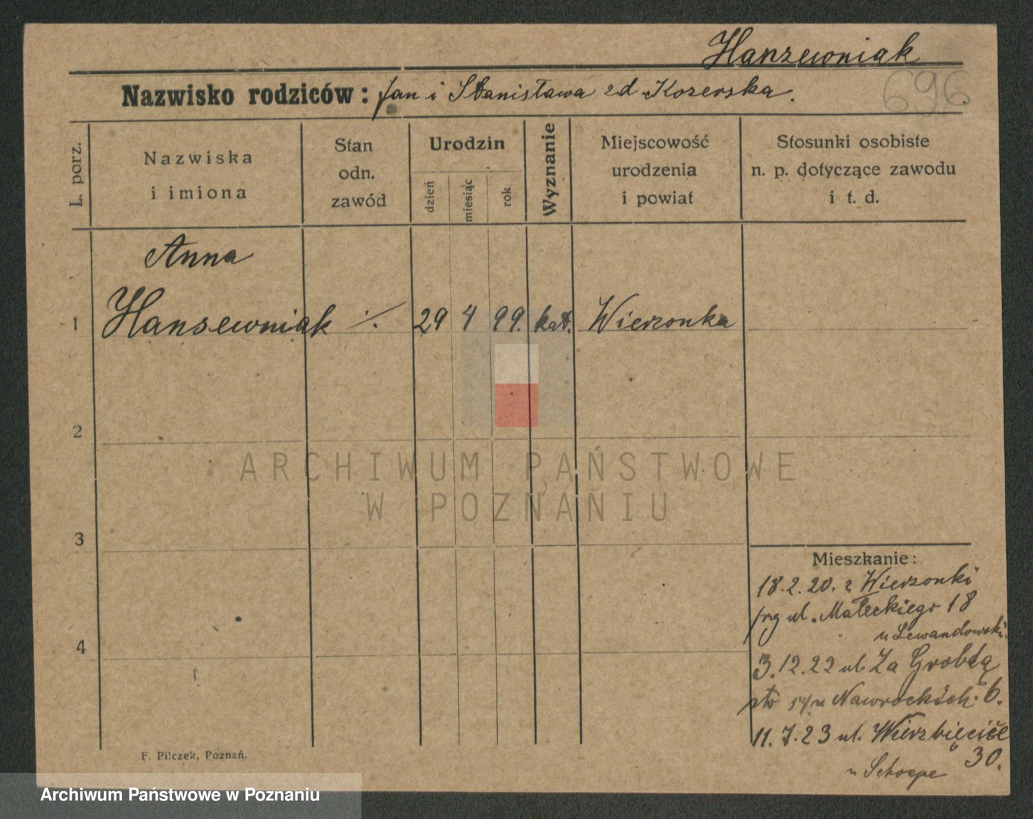 Podgląd karty osobowej dostępny jest po kliknięciu na nazwisko lub ikonkę karty. Można dokonywać powiększenia (ikony na górze) lub przechodzić między kolejnymi skanami (strzałki po bokach).