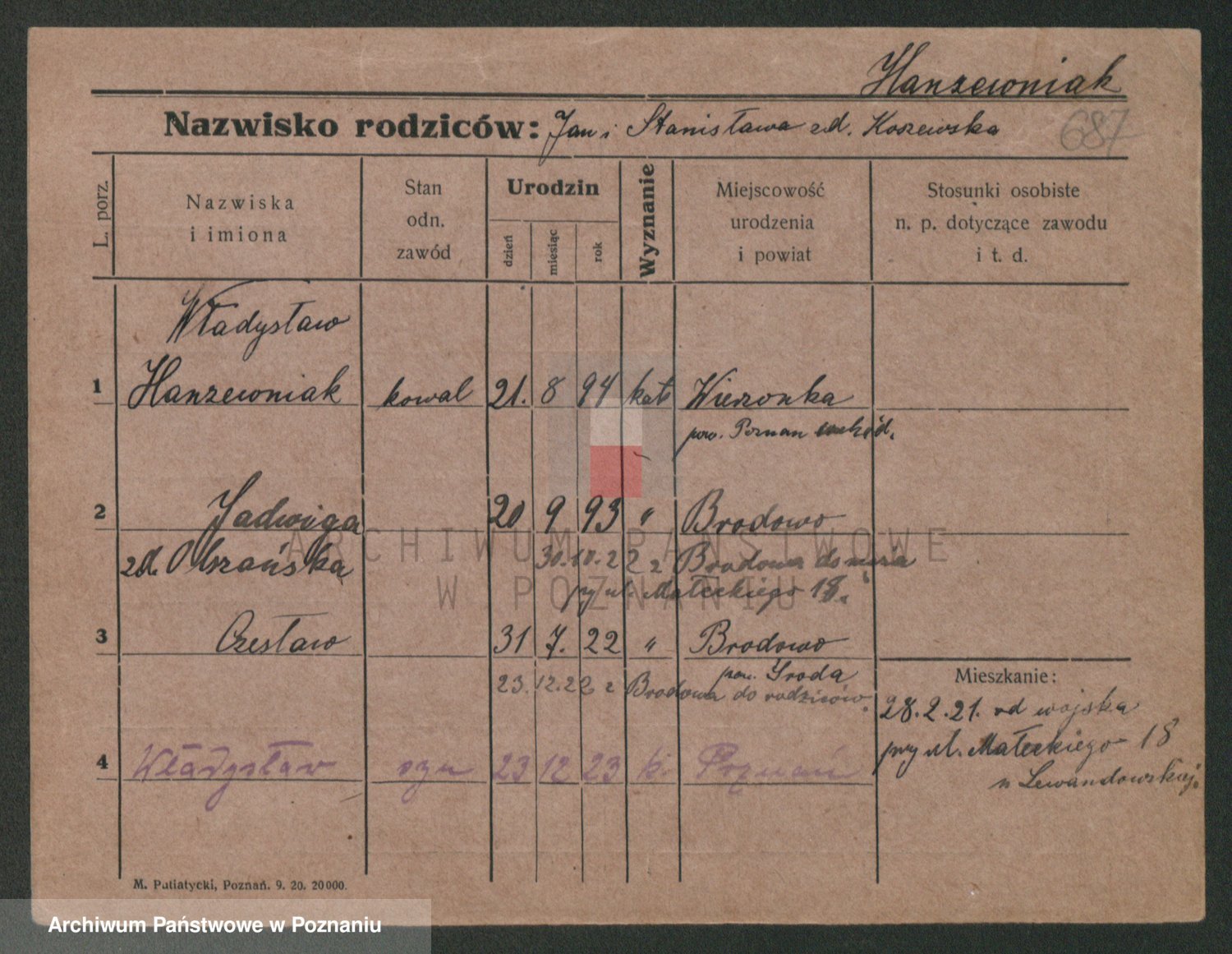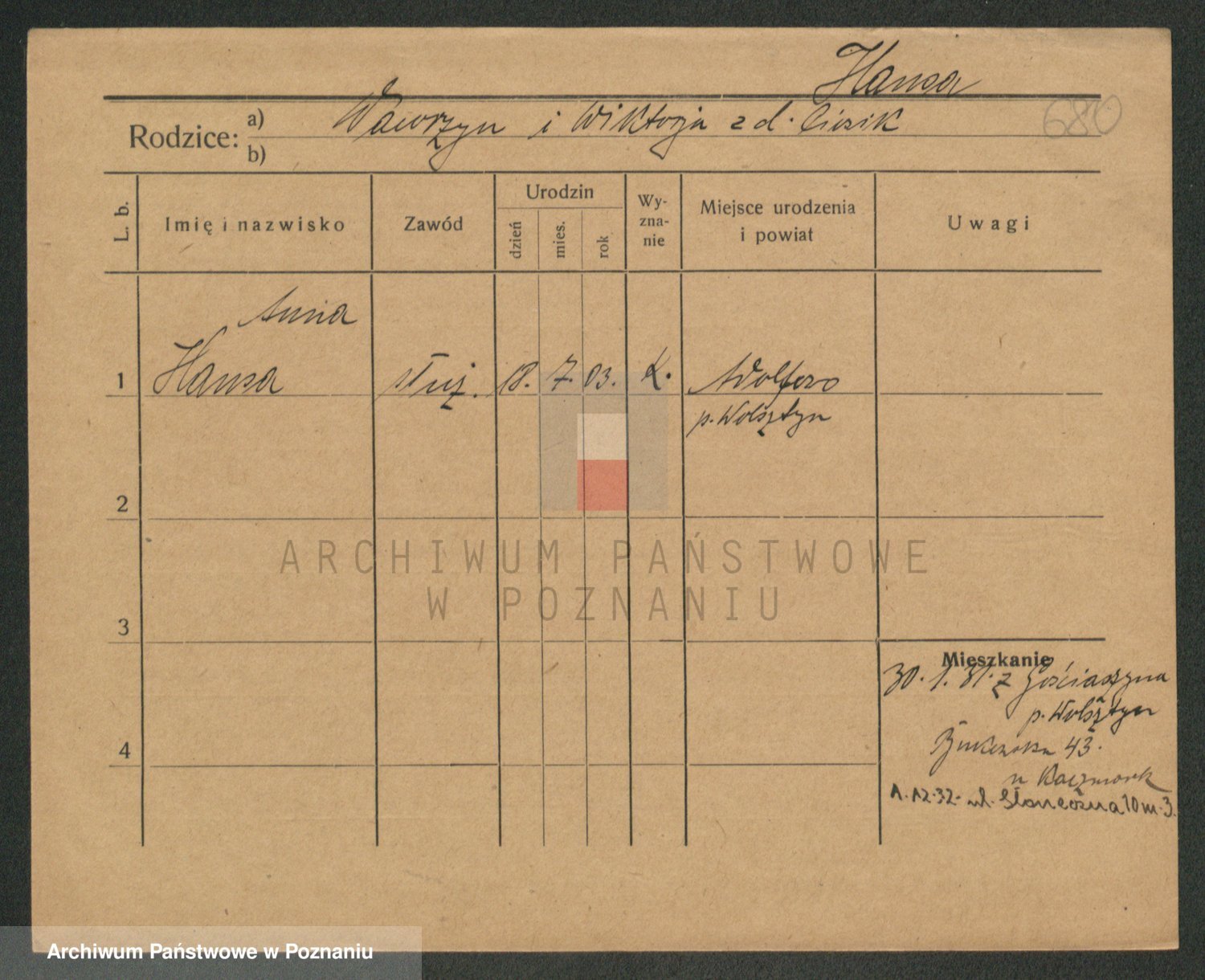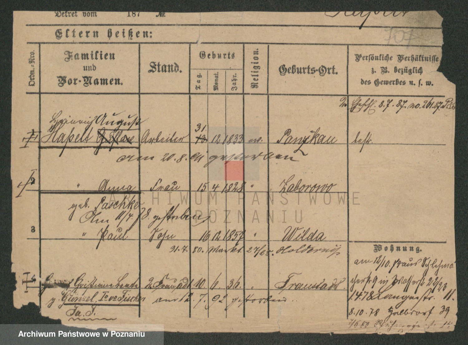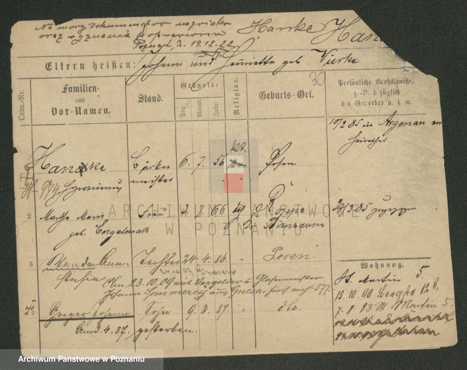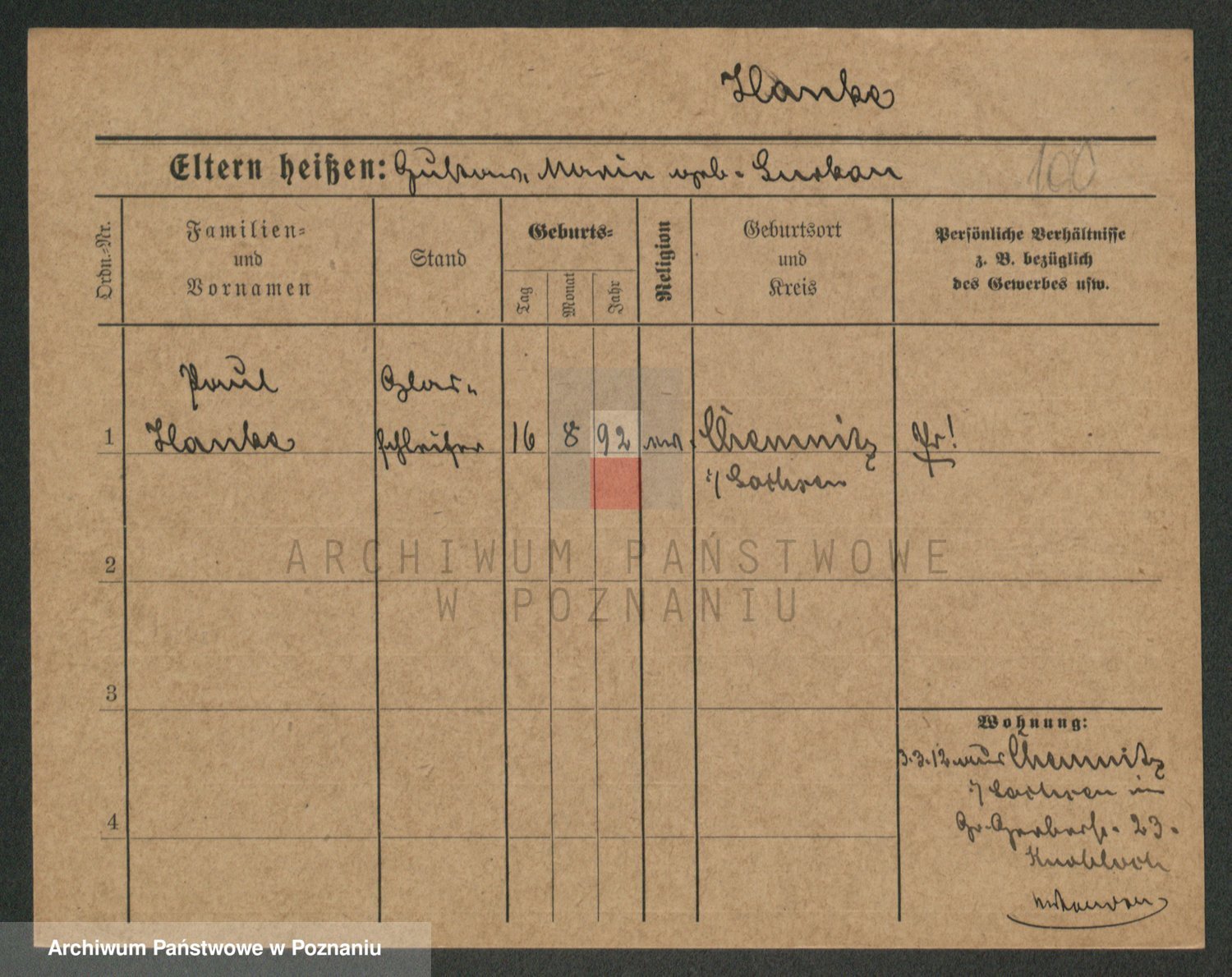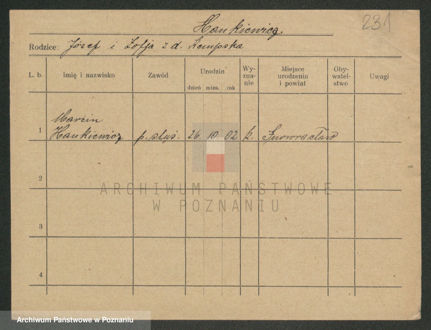 Podgląd karty osobowej dostępny jest po kliknięciu na nazwisko lub ikonkę karty. Można dokonywać powiększenia (ikony na górze) lub przechodzić między kolejnymi skanami (strzałki po bokach).
