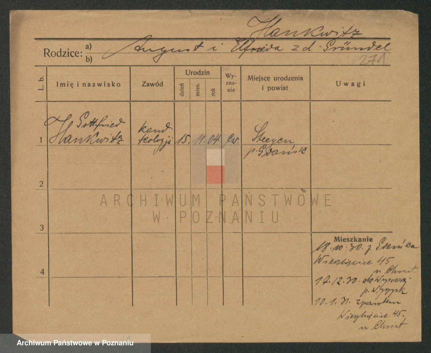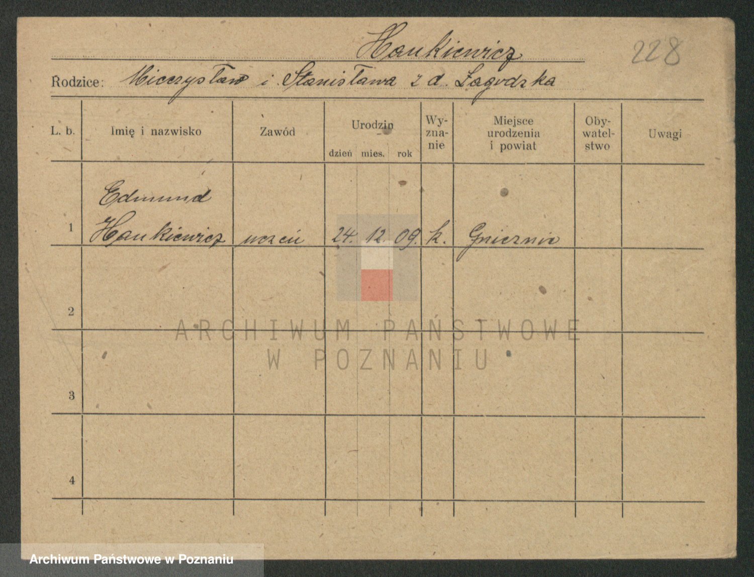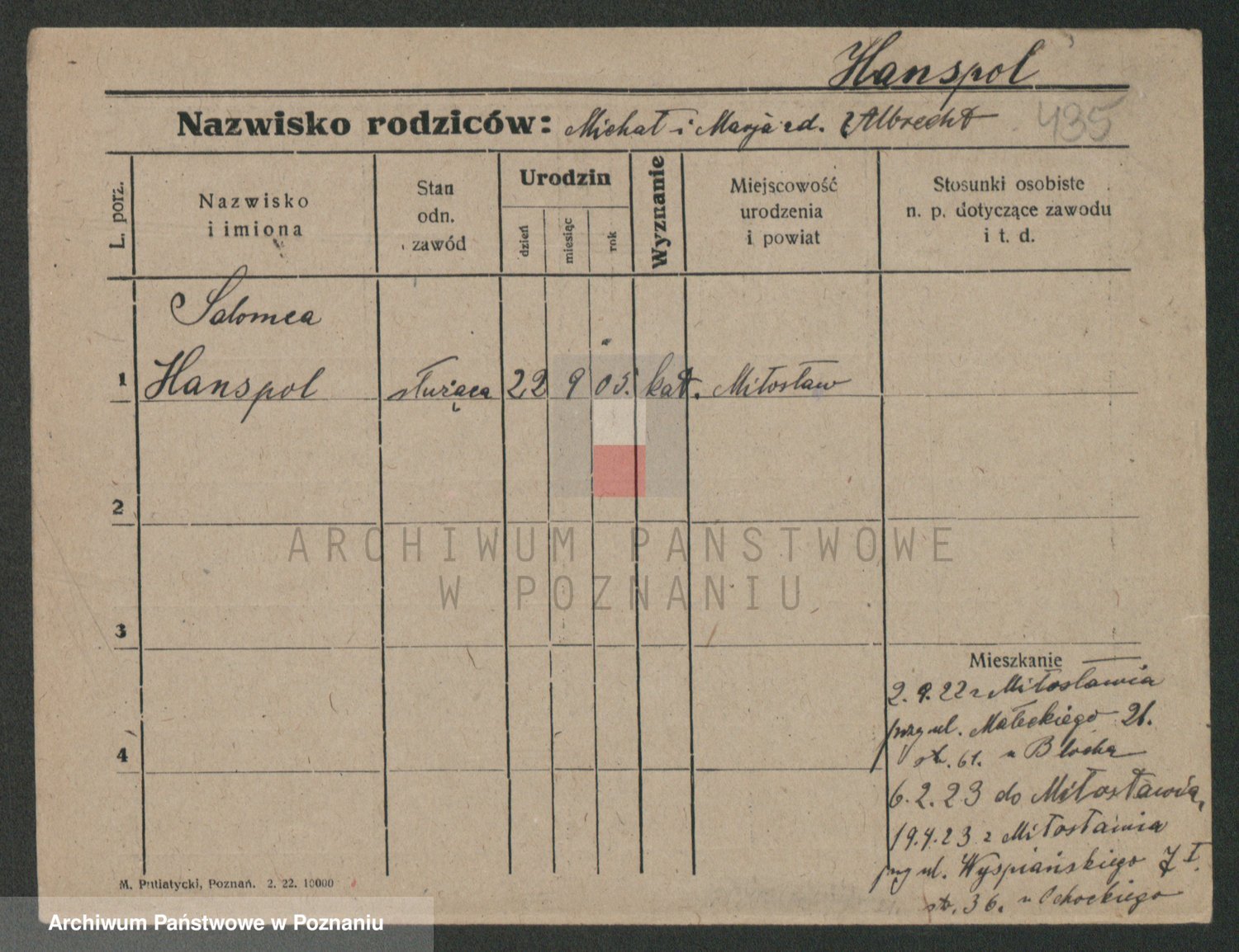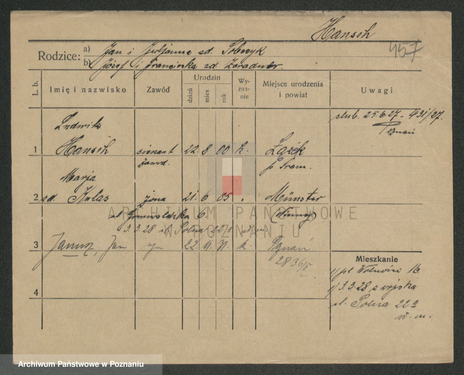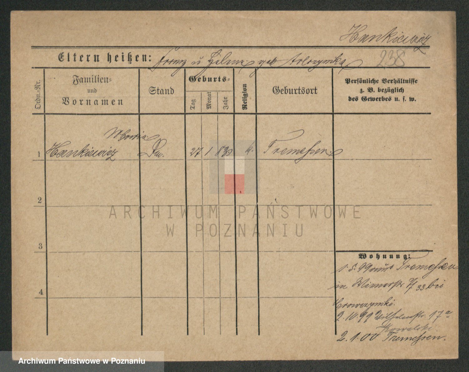 Podgląd karty osobowej dostępny jest po kliknięciu na nazwisko lub ikonkę karty. Można dokonywać powiększenia (ikony na górze) lub przechodzić między kolejnymi skanami (strzałki po bokach).