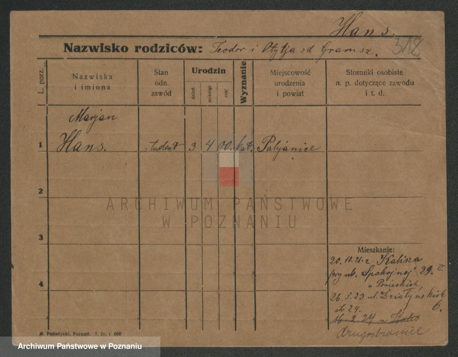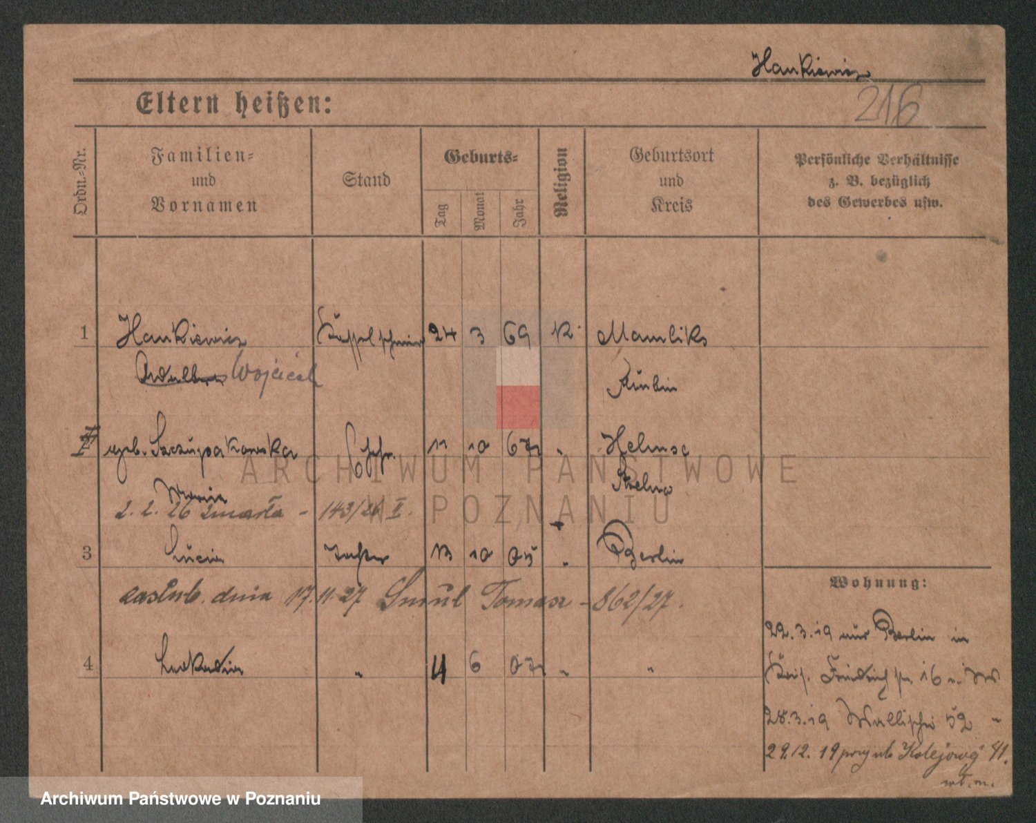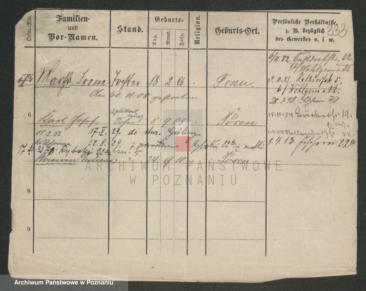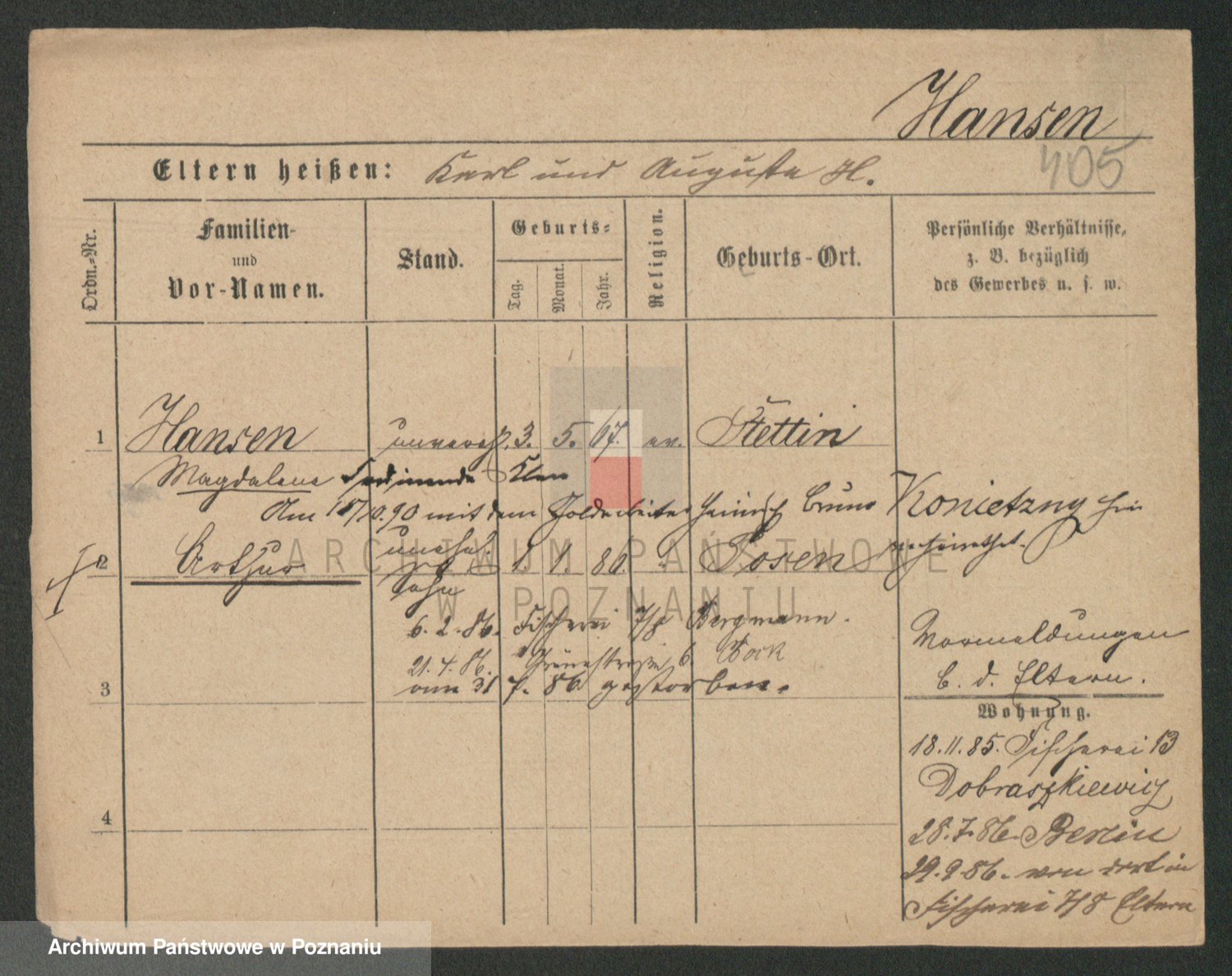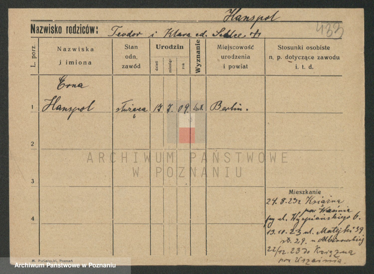 Podgląd karty osobowej dostępny jest po kliknięciu na nazwisko lub ikonkę karty. Można dokonywać powiększenia (ikony na górze) lub przechodzić między kolejnymi skanami (strzałki po bokach).