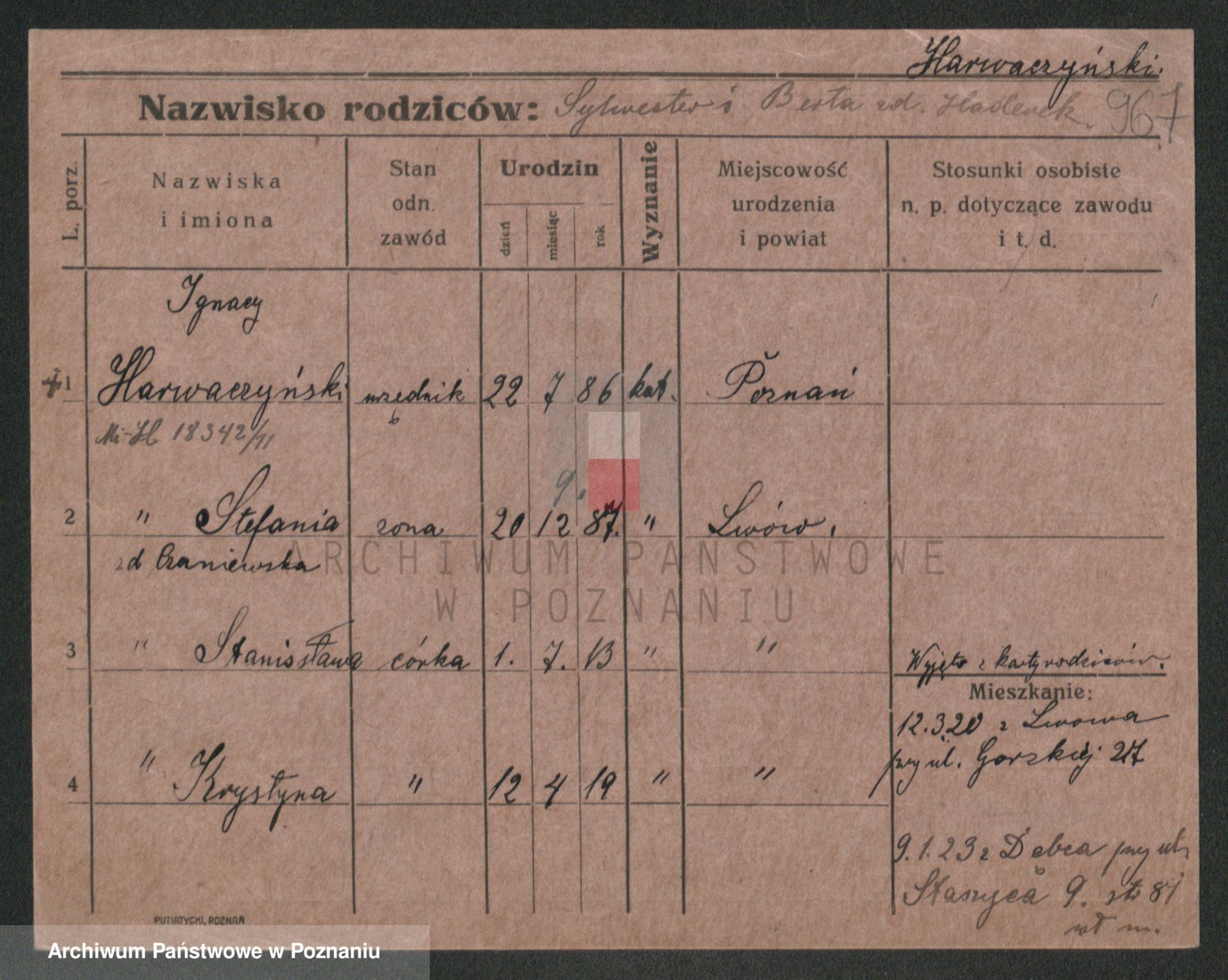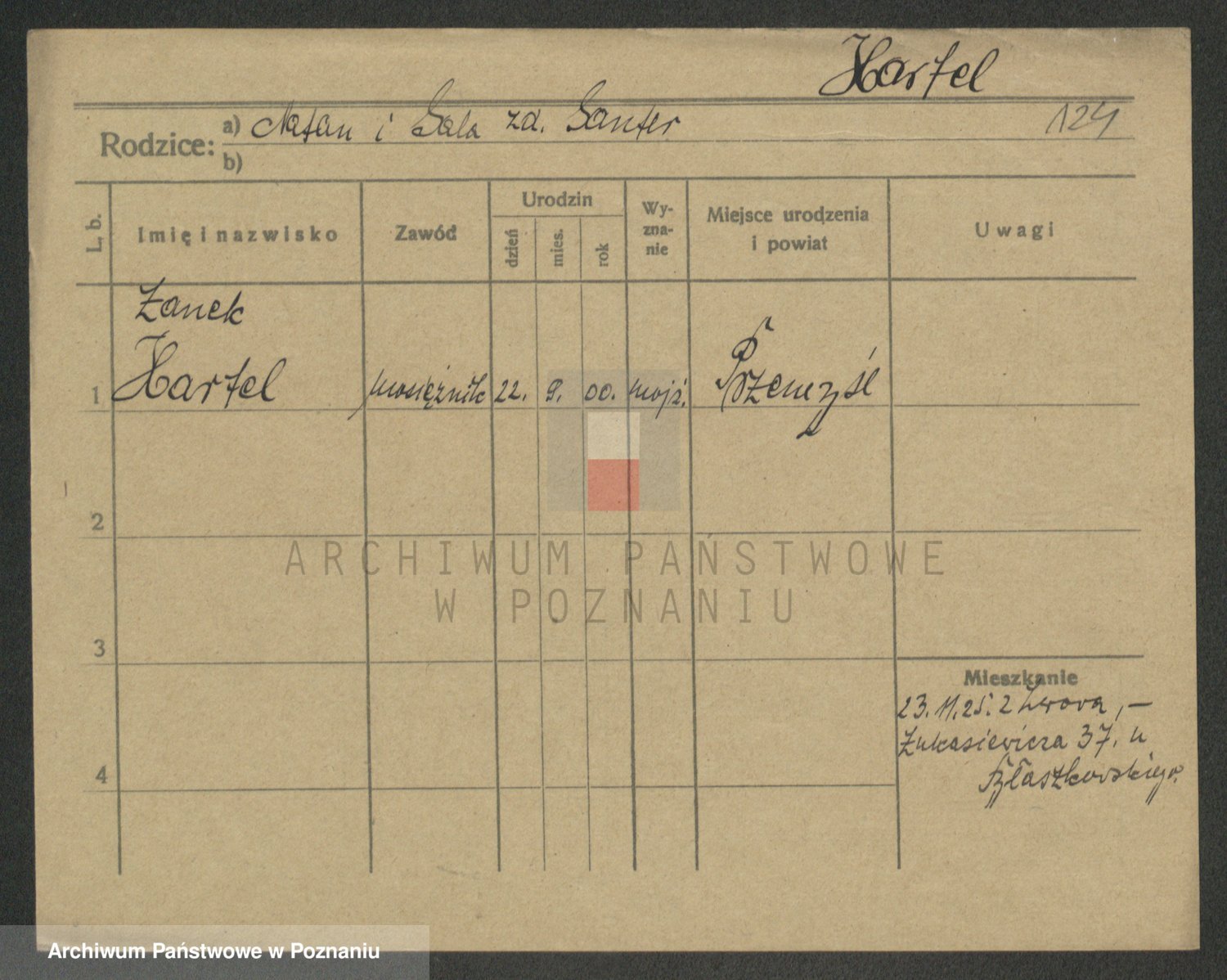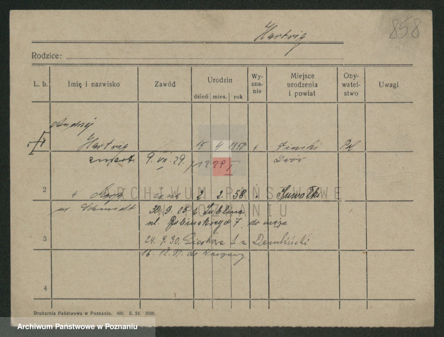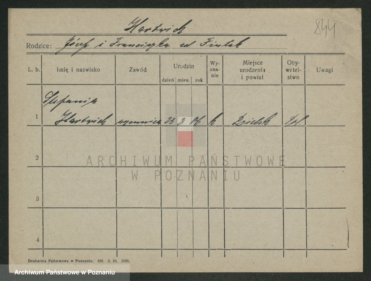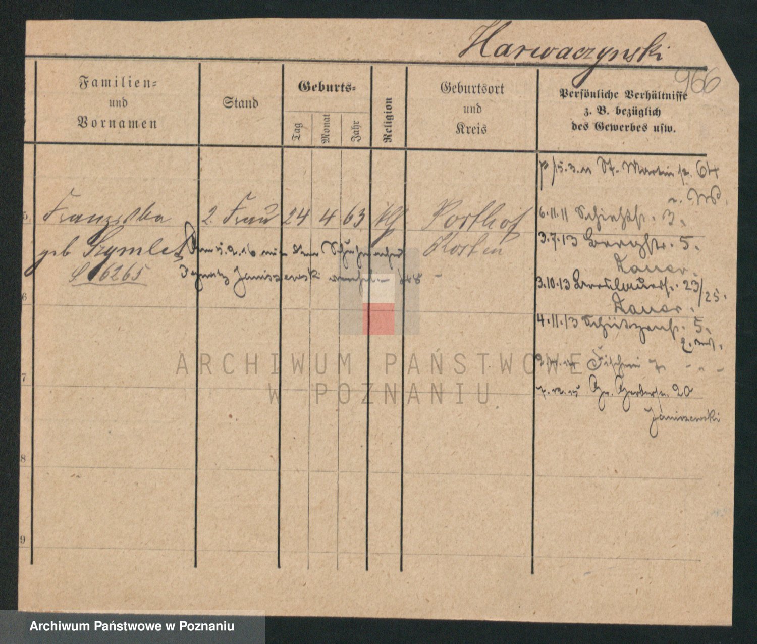 Podgląd karty osobowej dostępny jest po kliknięciu na nazwisko lub ikonkę karty. Można dokonywać powiększenia (ikony na górze) lub przechodzić między kolejnymi skanami (strzałki po bokach).