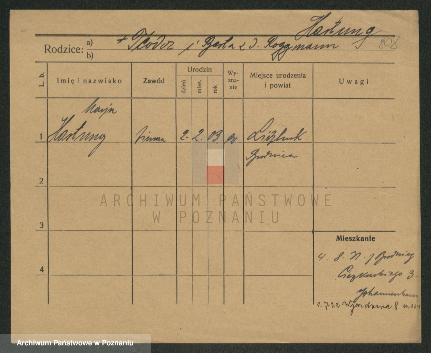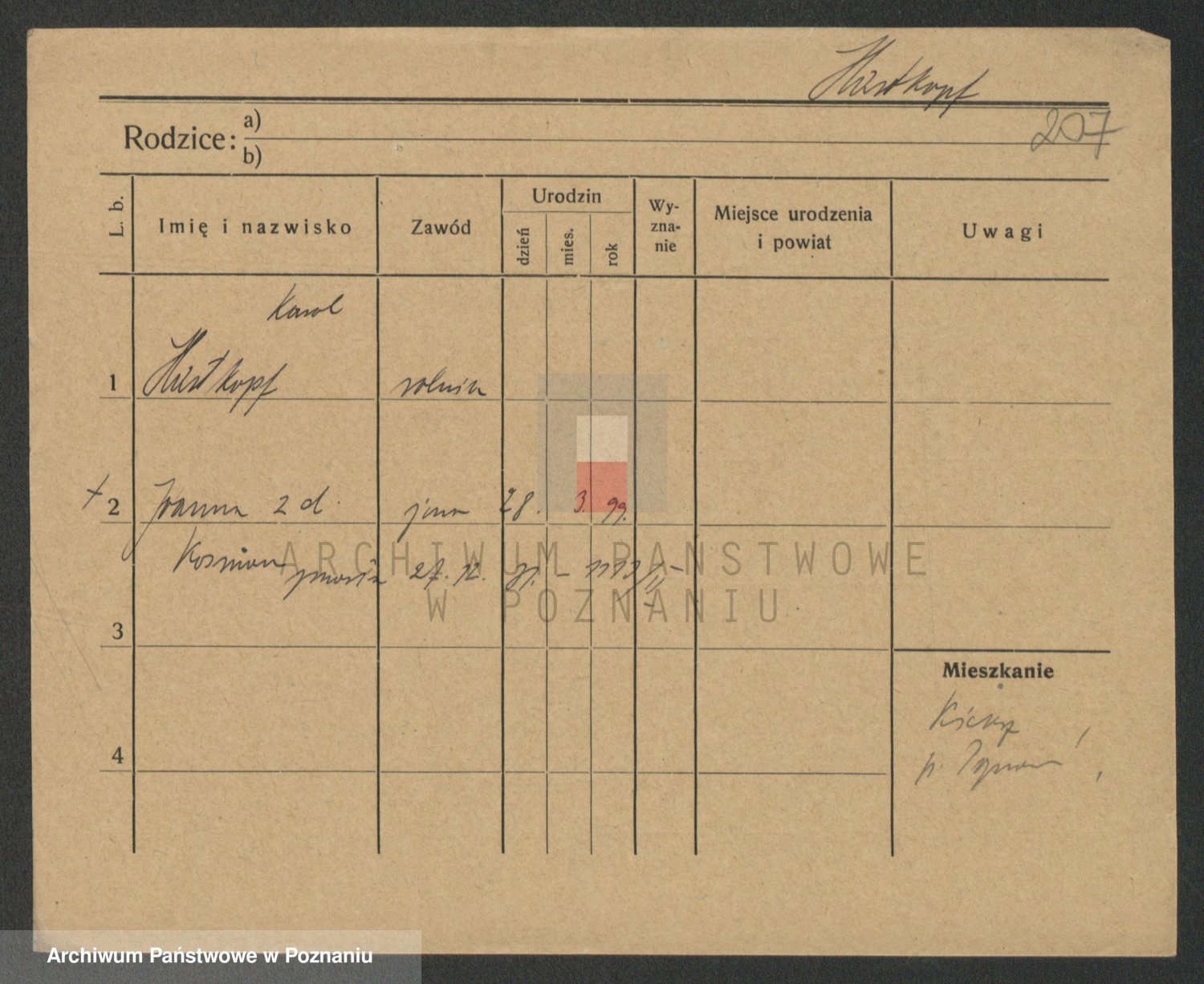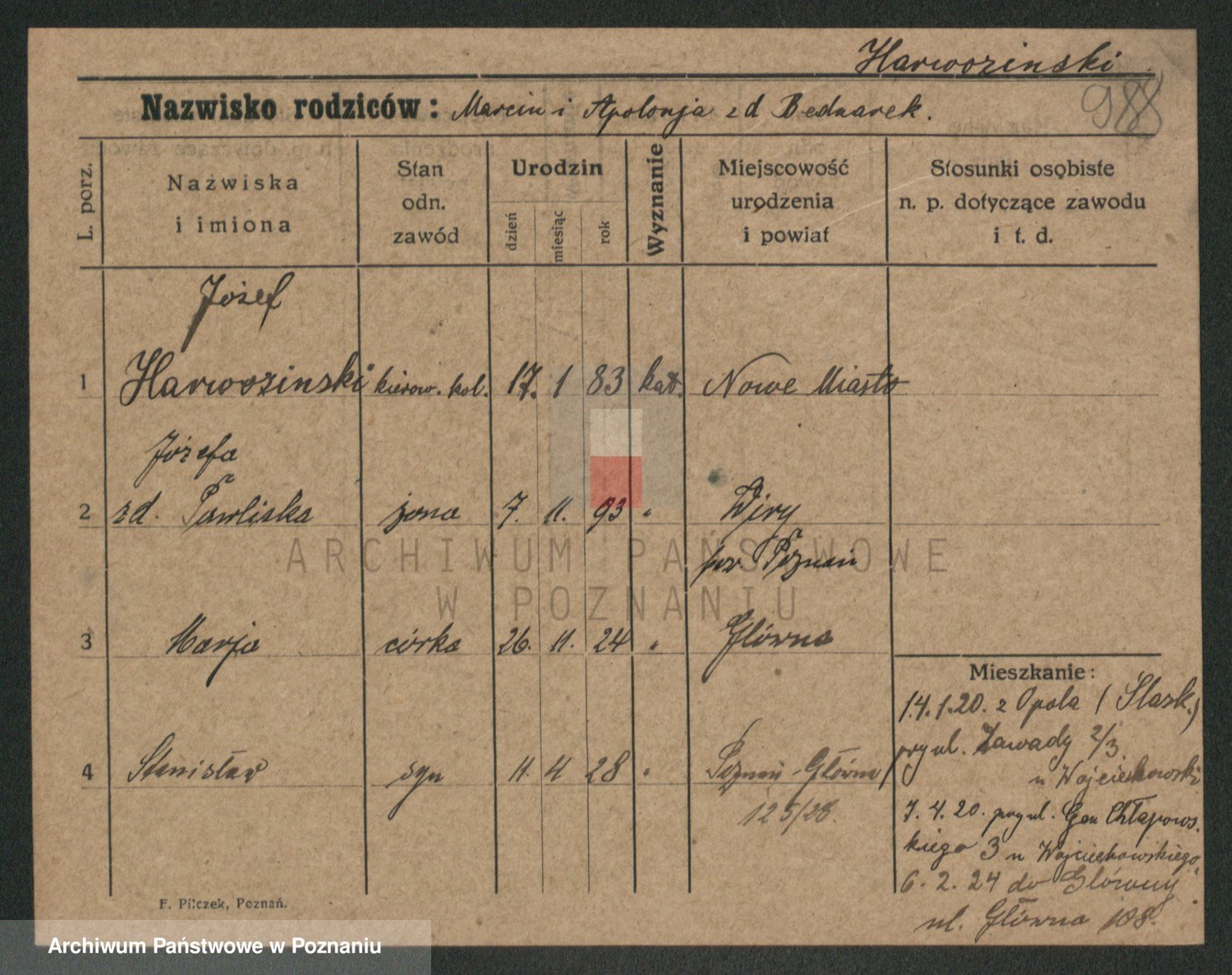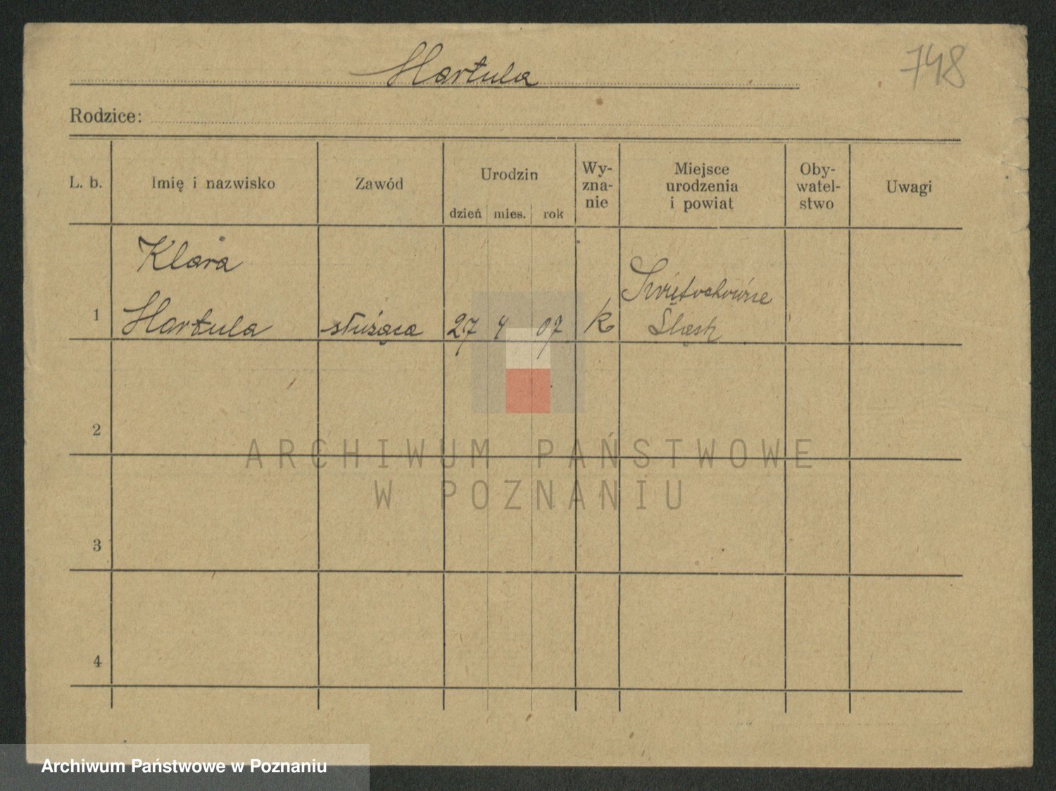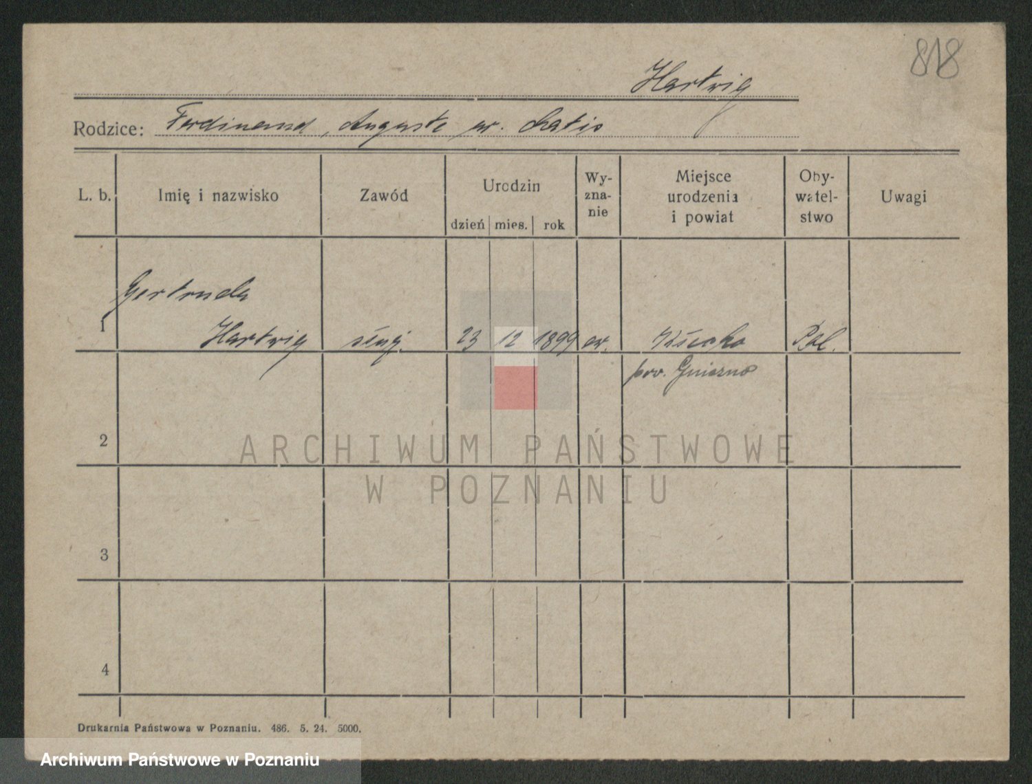 Podgląd karty osobowej dostępny jest po kliknięciu na nazwisko lub ikonkę karty. Można dokonywać powiększenia (ikony na górze) lub przechodzić między kolejnymi skanami (strzałki po bokach).