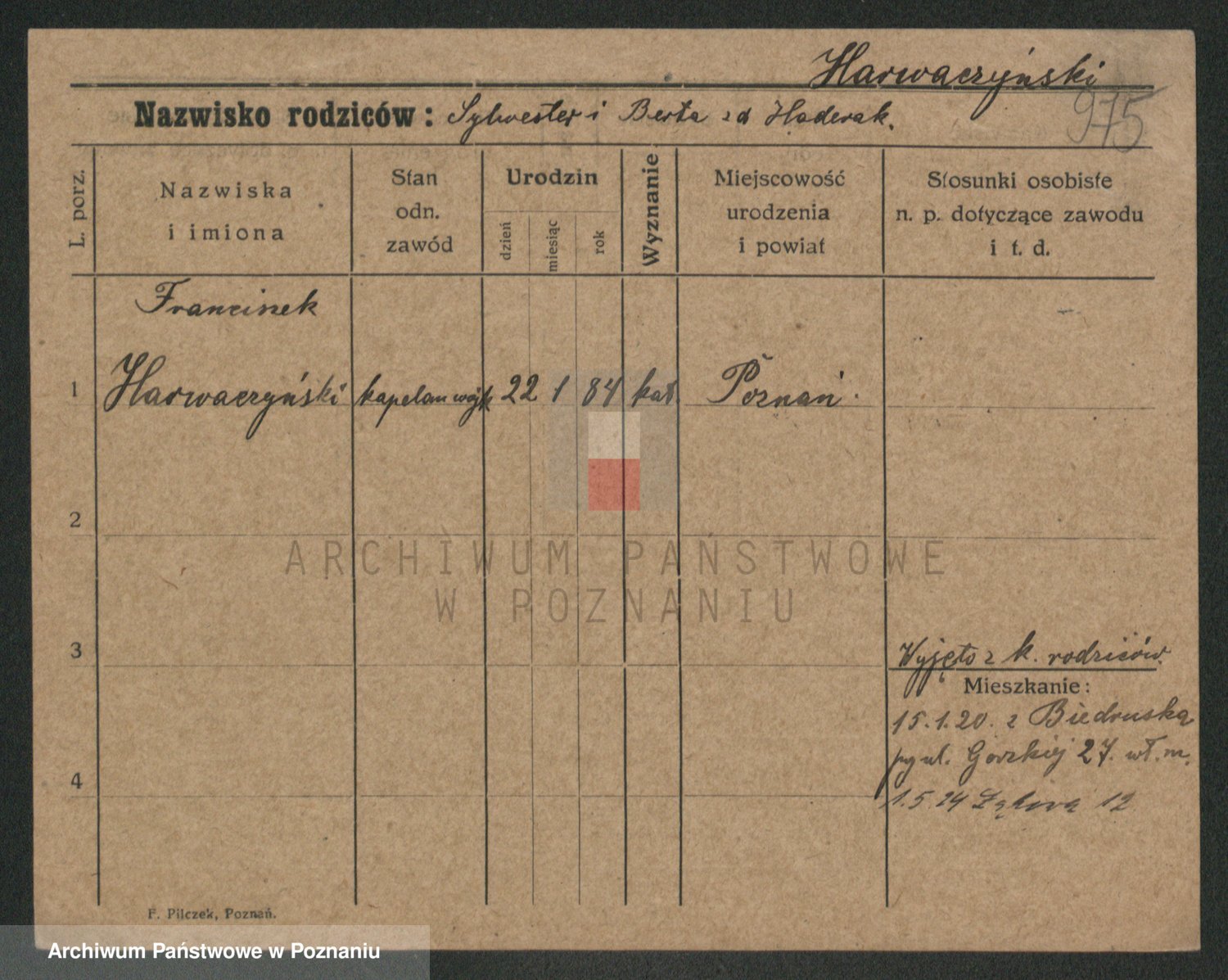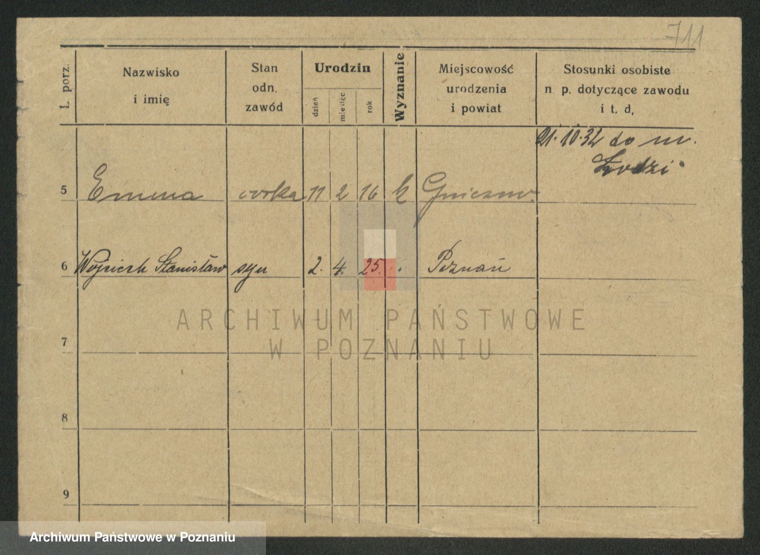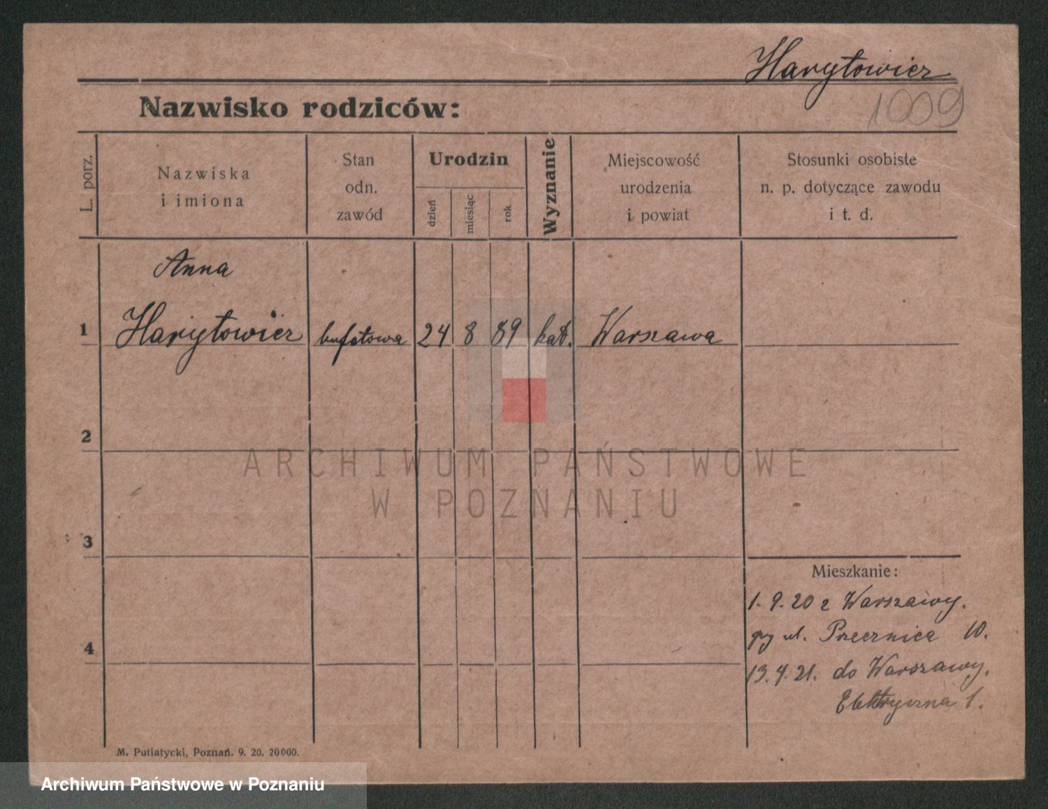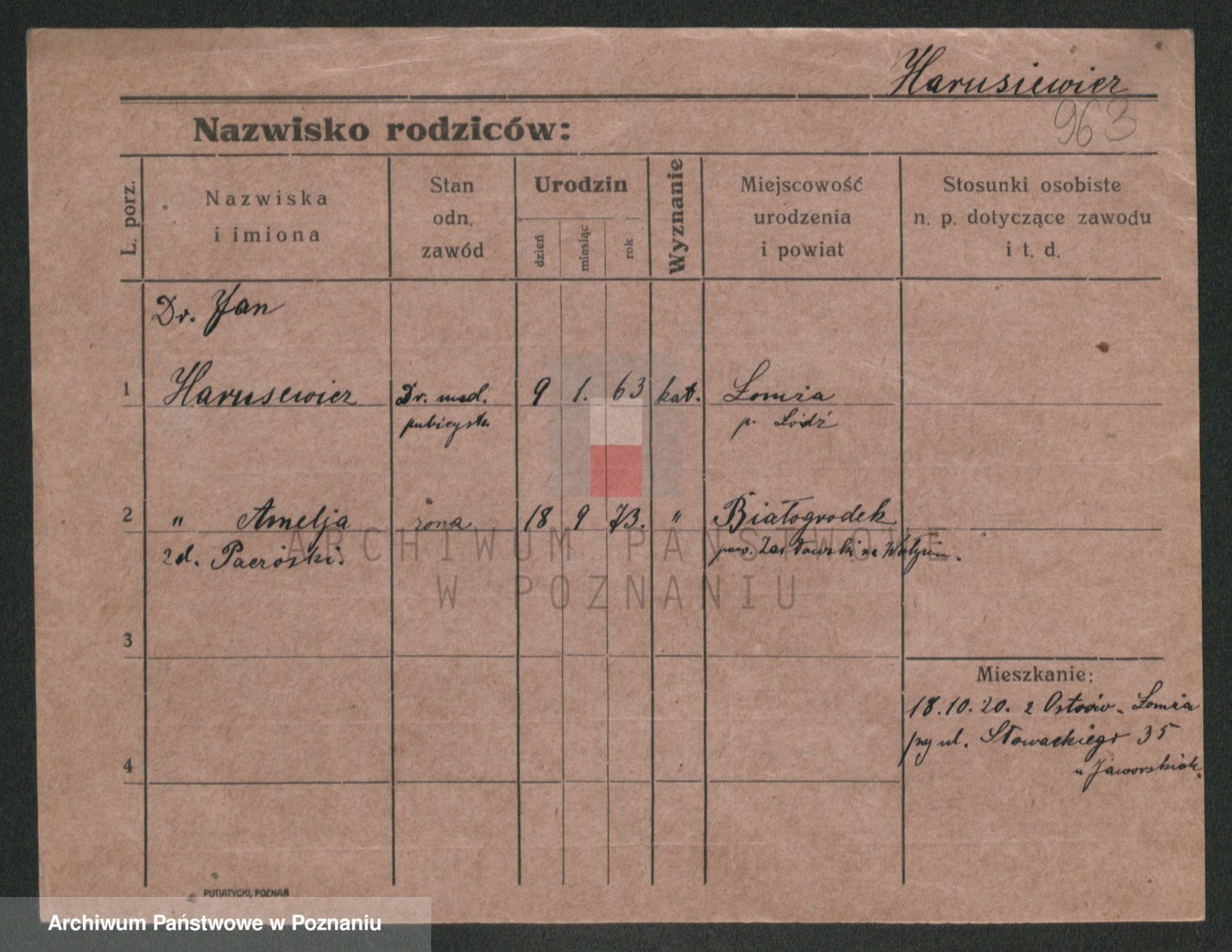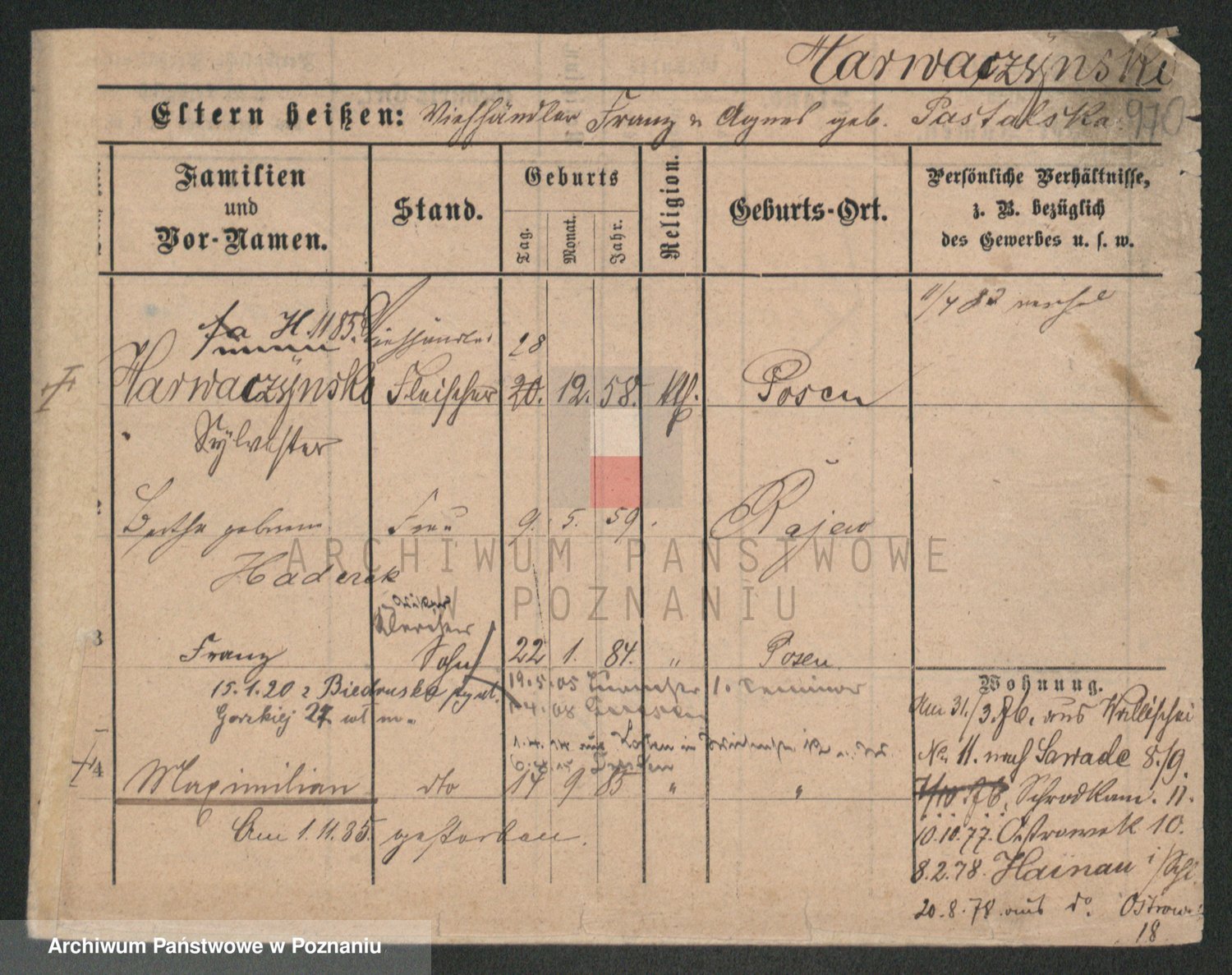 Podgląd karty osobowej dostępny jest po kliknięciu na nazwisko lub ikonkę karty. Można dokonywać powiększenia (ikony na górze) lub przechodzić między kolejnymi skanami (strzałki po bokach).
