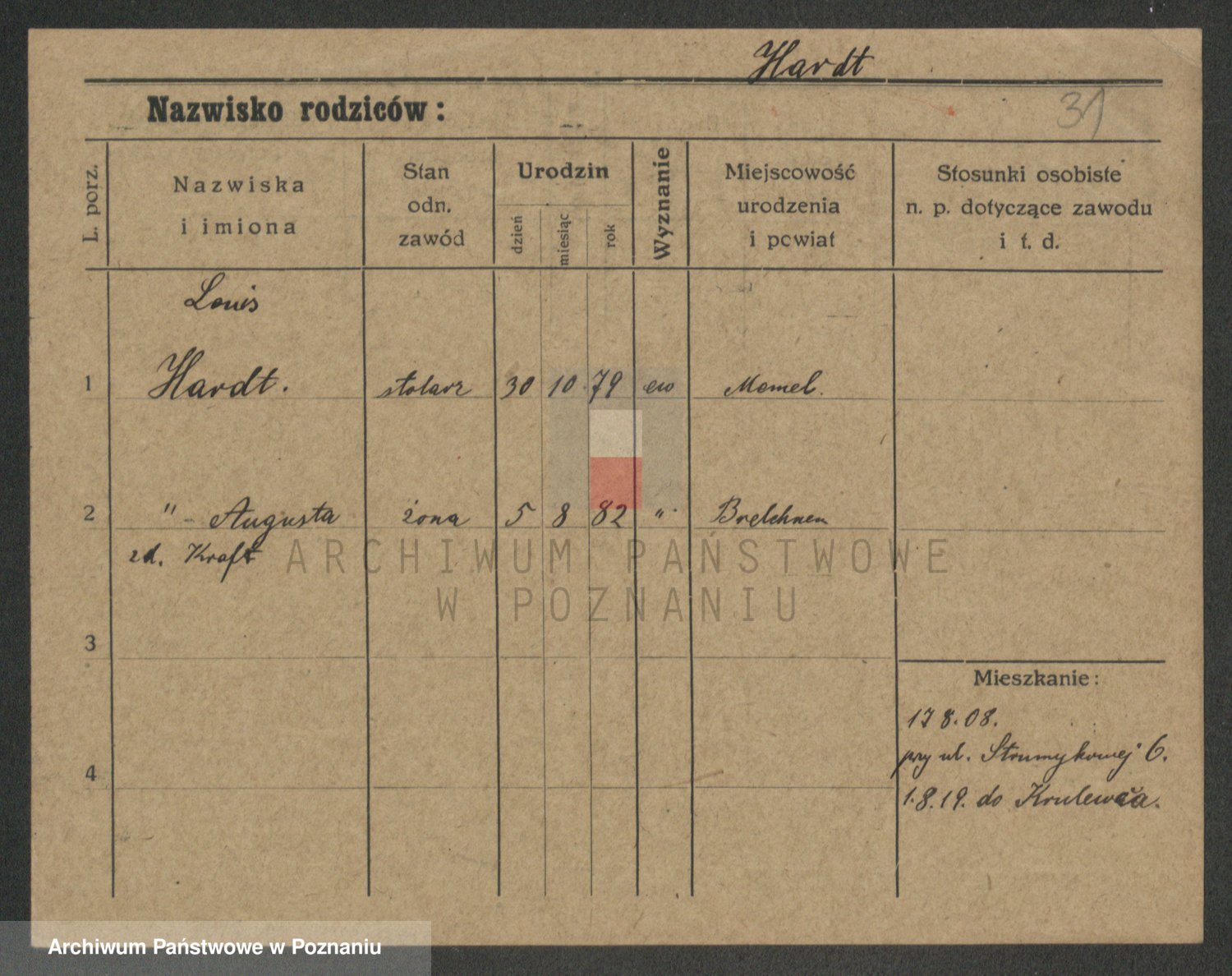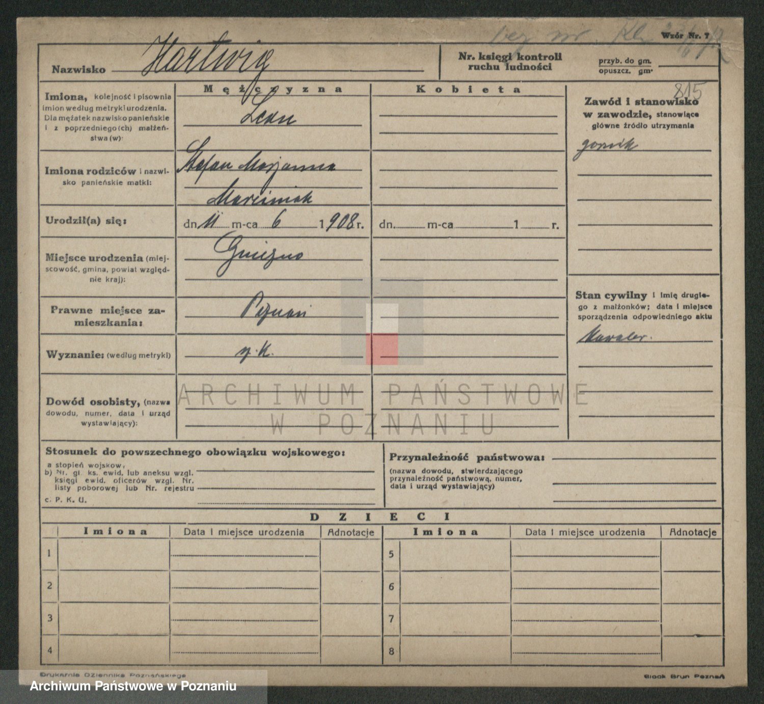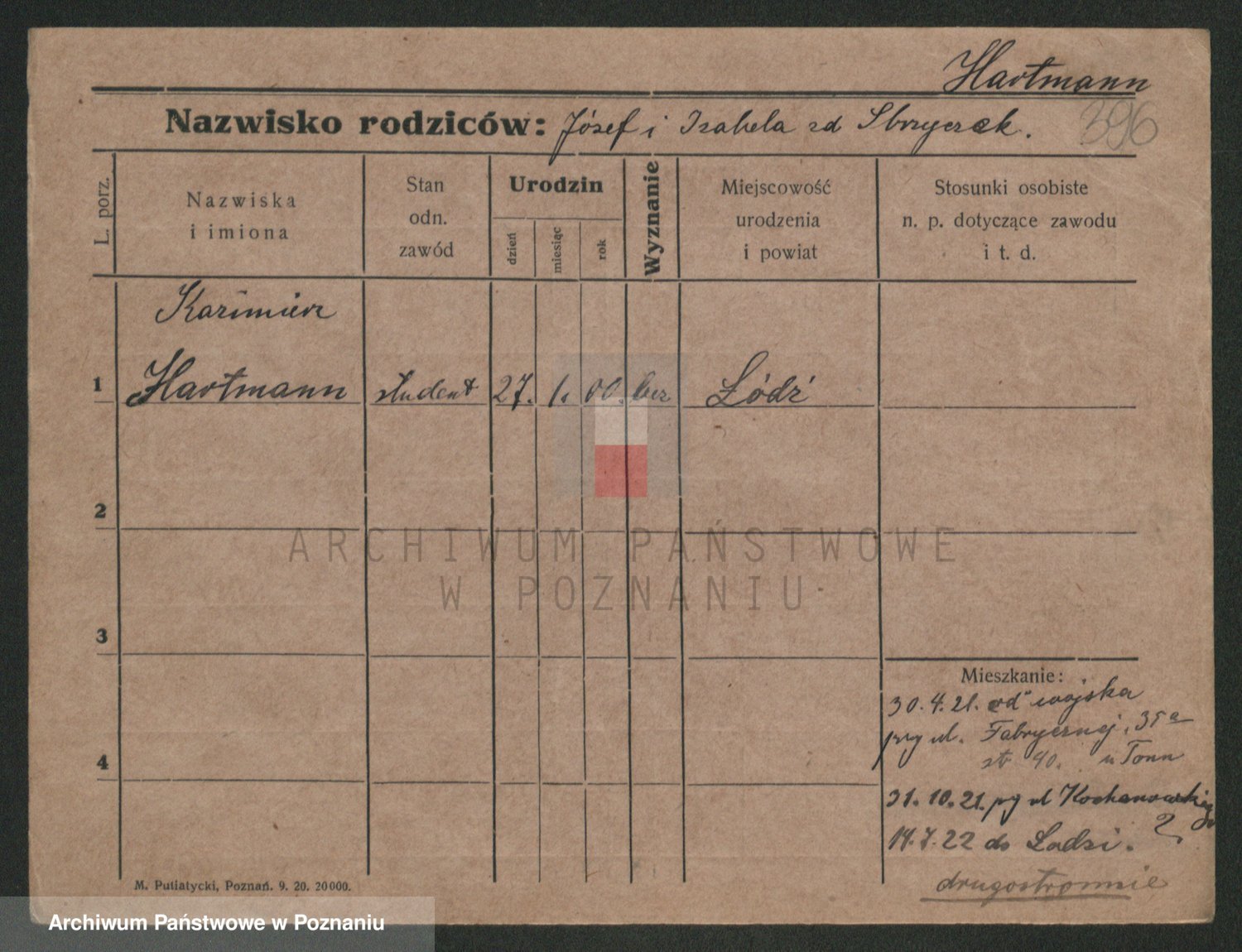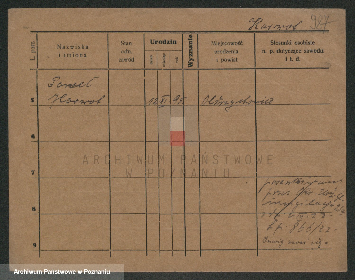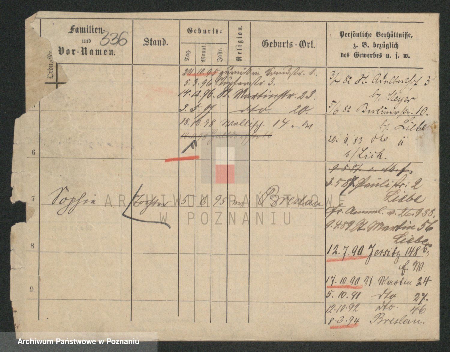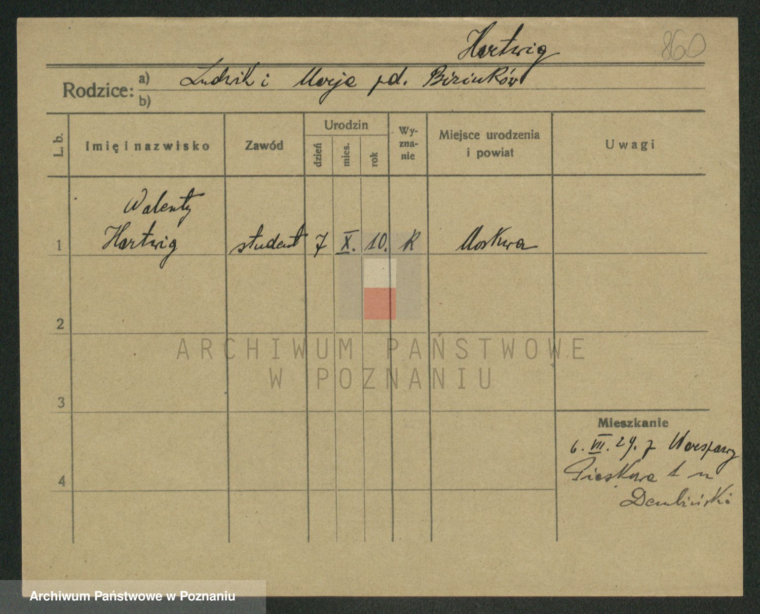 Podgląd karty osobowej dostępny jest po kliknięciu na nazwisko lub ikonkę karty. Można dokonywać powiększenia (ikony na górze) lub przechodzić między kolejnymi skanami (strzałki po bokach).