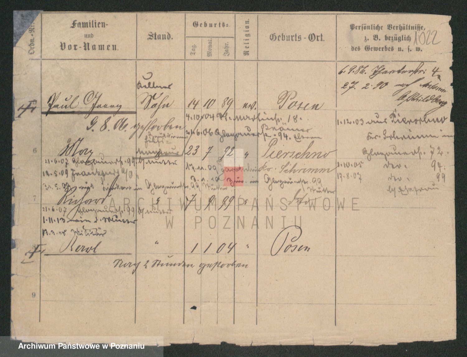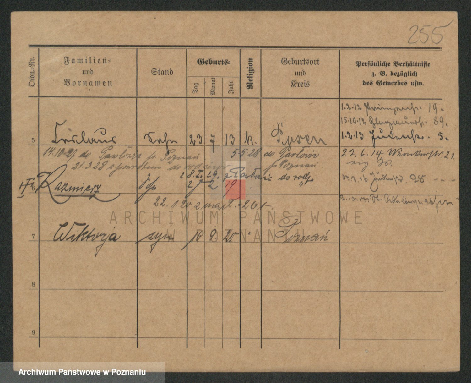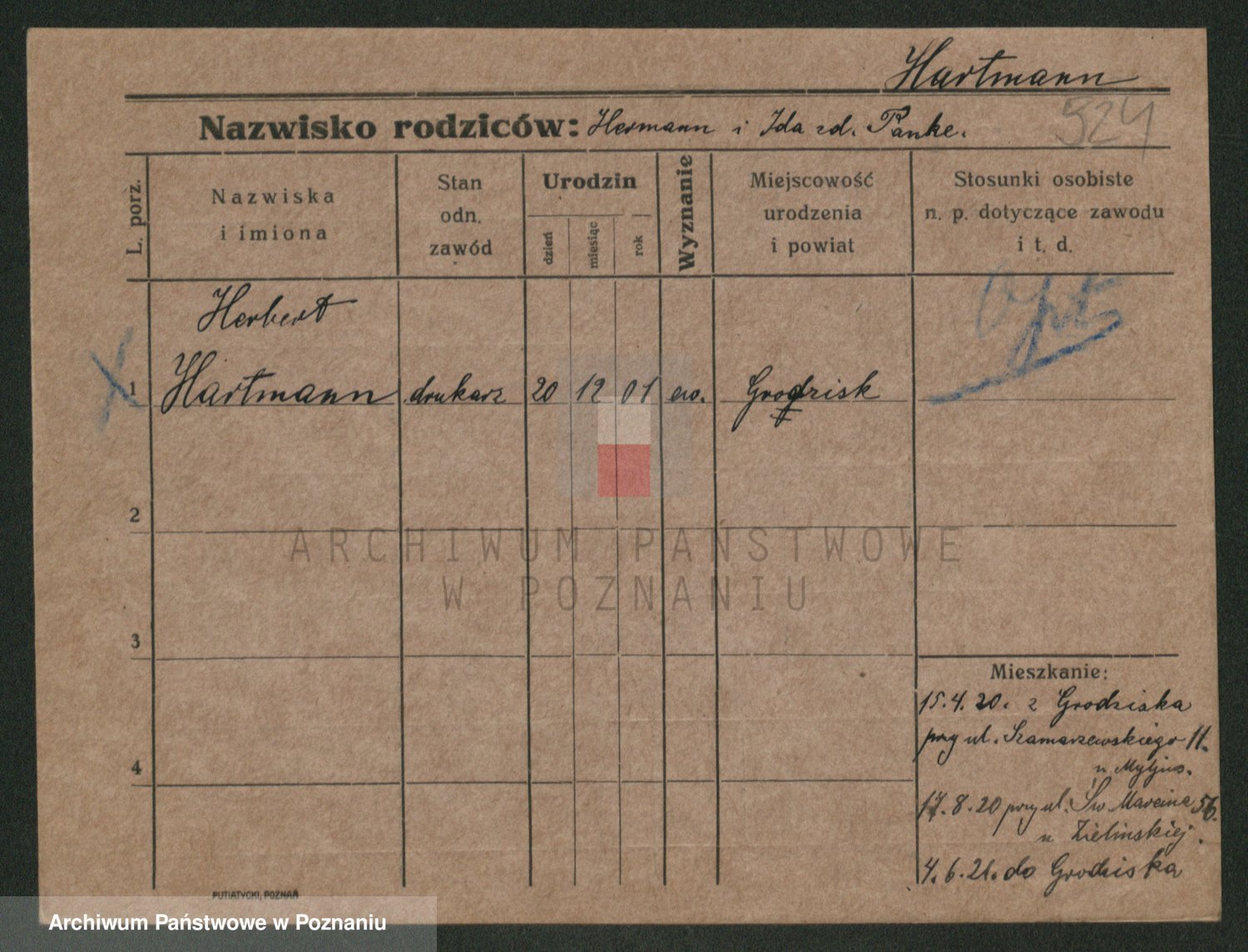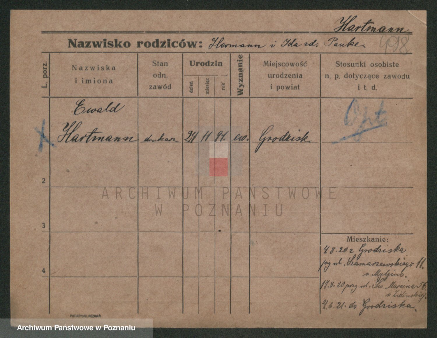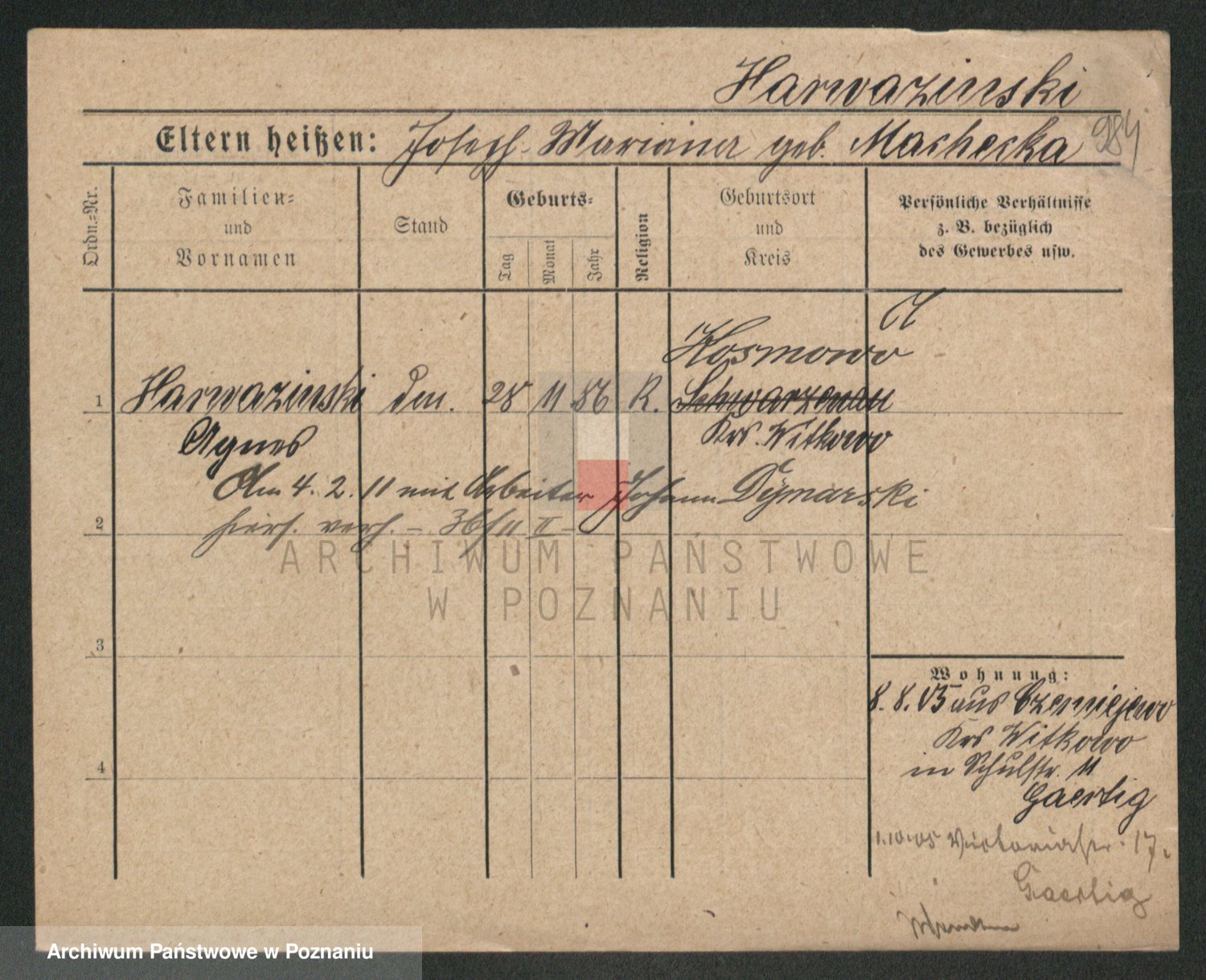 Podgląd karty osobowej dostępny jest po kliknięciu na nazwisko lub ikonkę karty. Można dokonywać powiększenia (ikony na górze) lub przechodzić między kolejnymi skanami (strzałki po bokach).