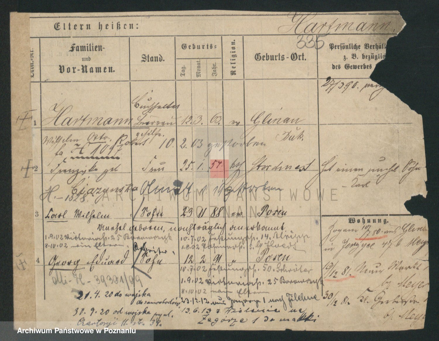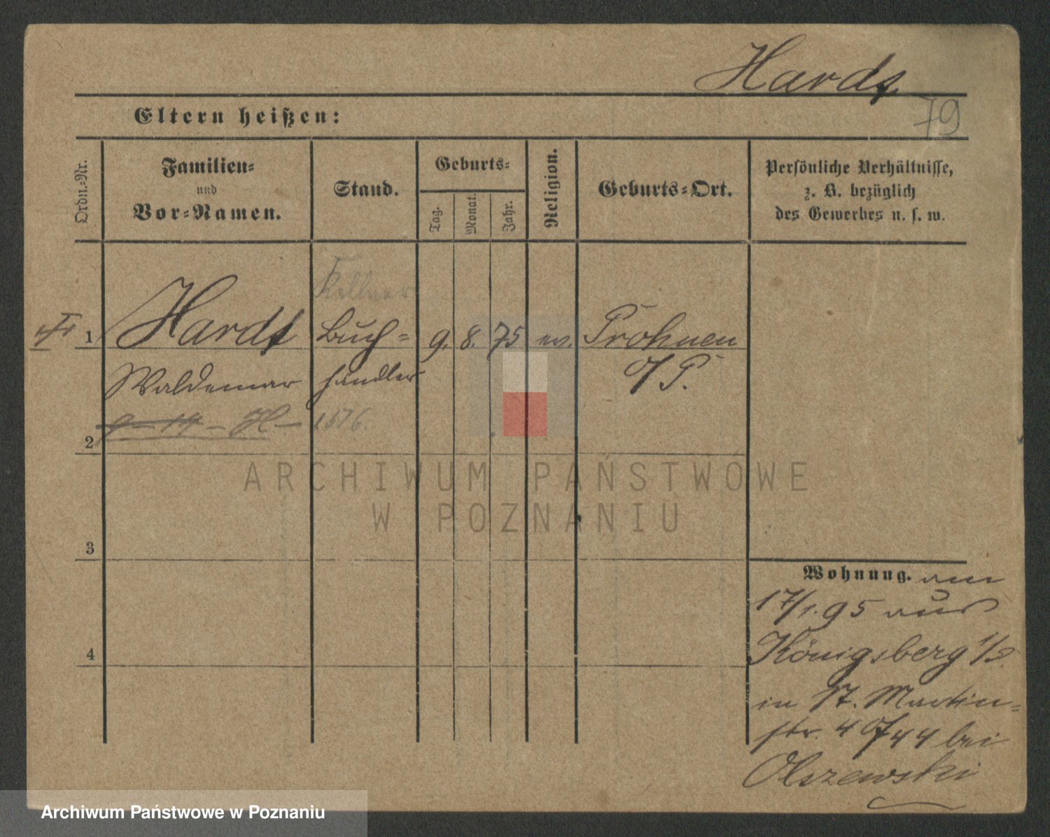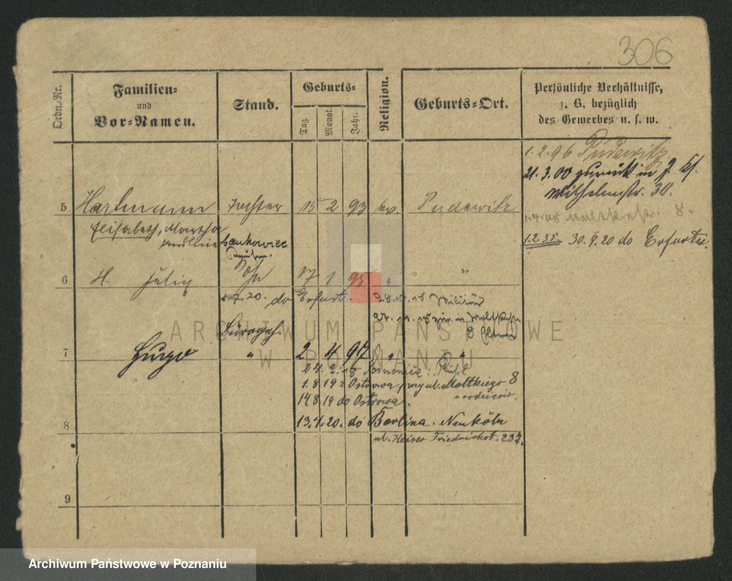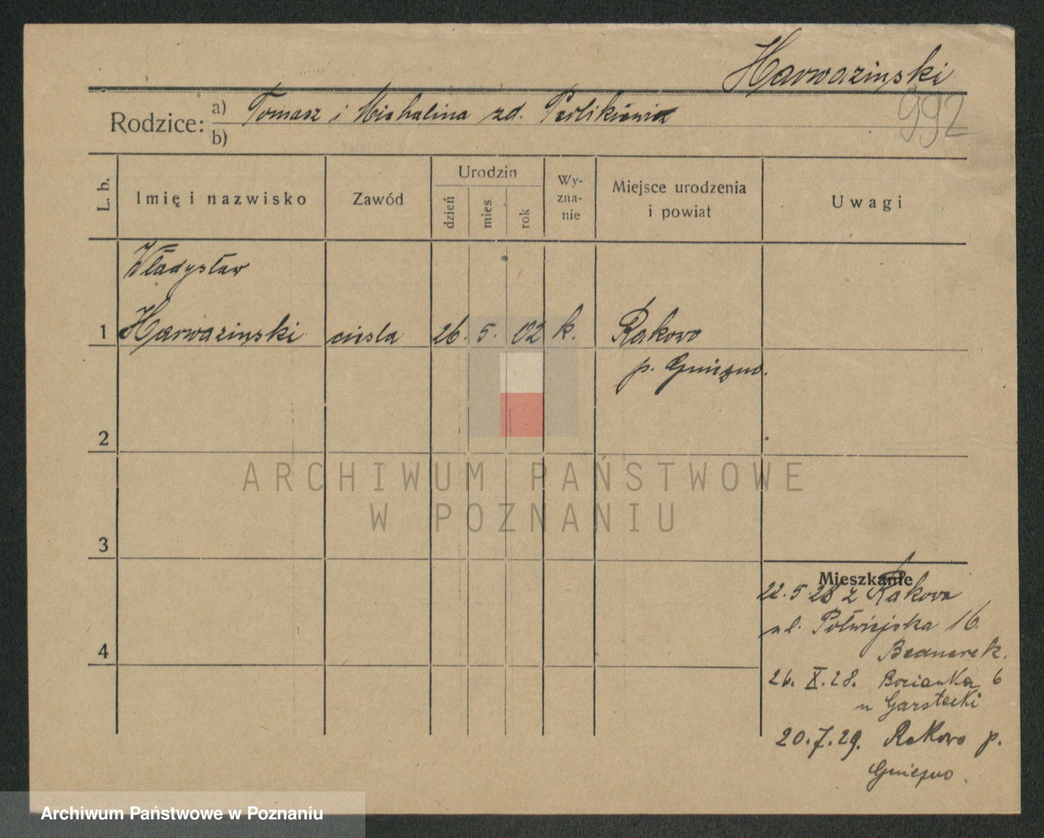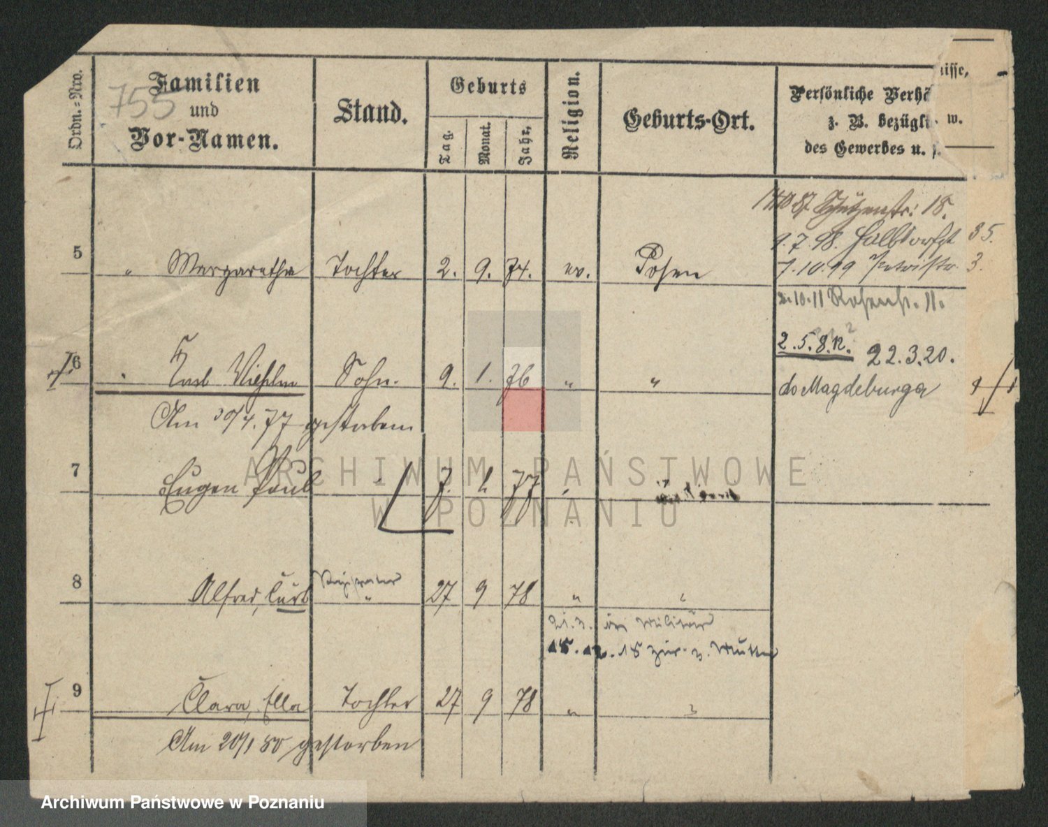 Podgląd karty osobowej dostępny jest po kliknięciu na nazwisko lub ikonkę karty. Można dokonywać powiększenia (ikony na górze) lub przechodzić między kolejnymi skanami (strzałki po bokach).