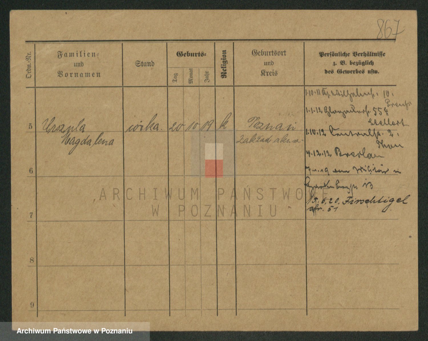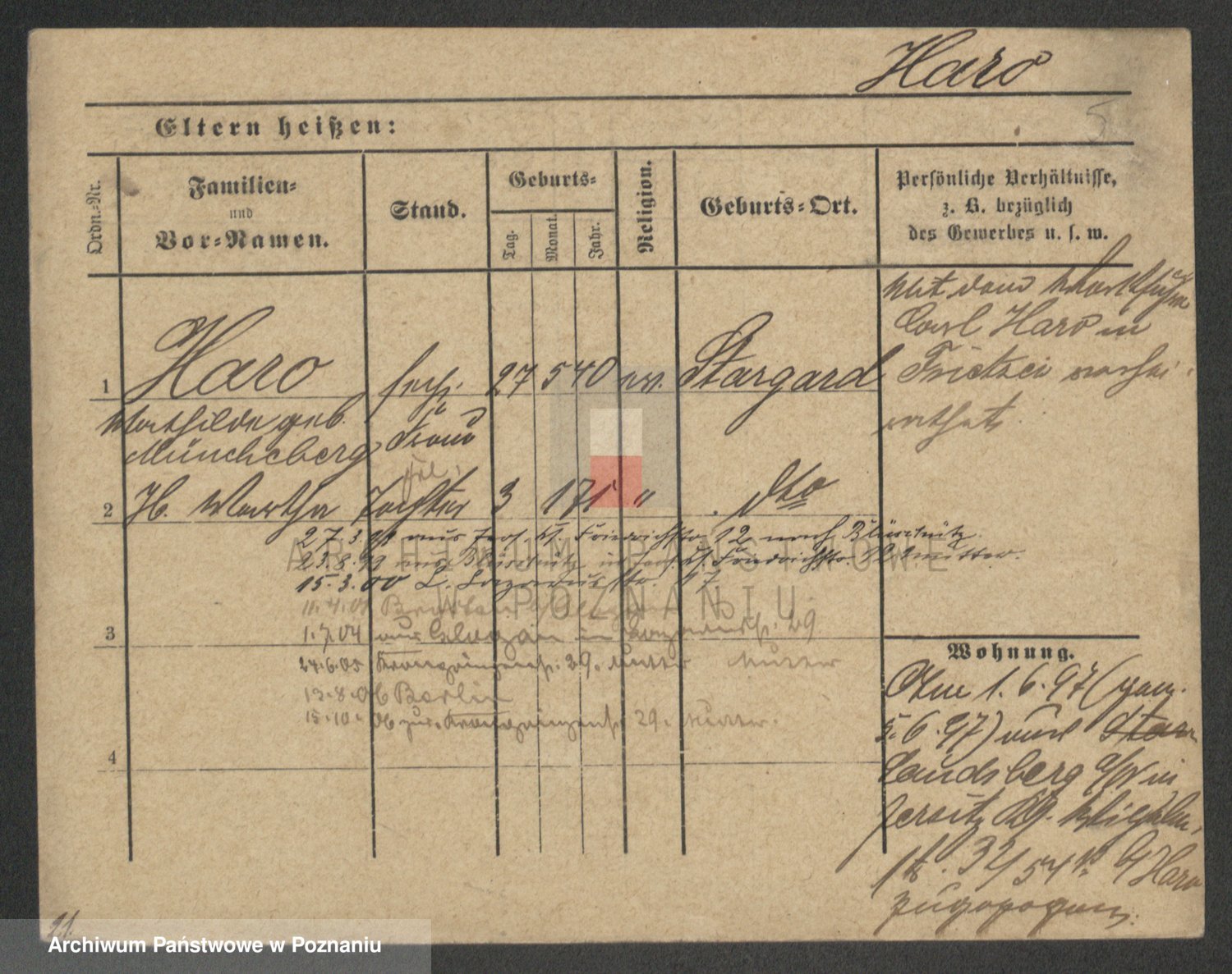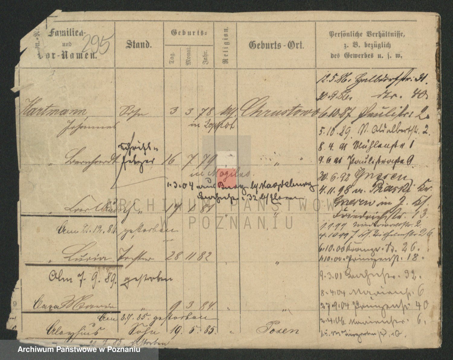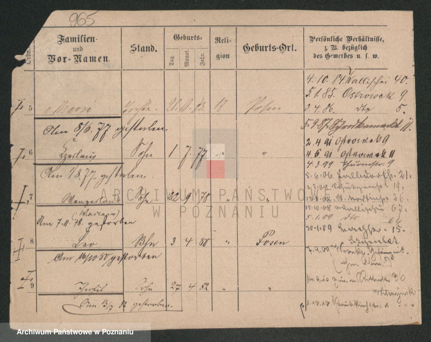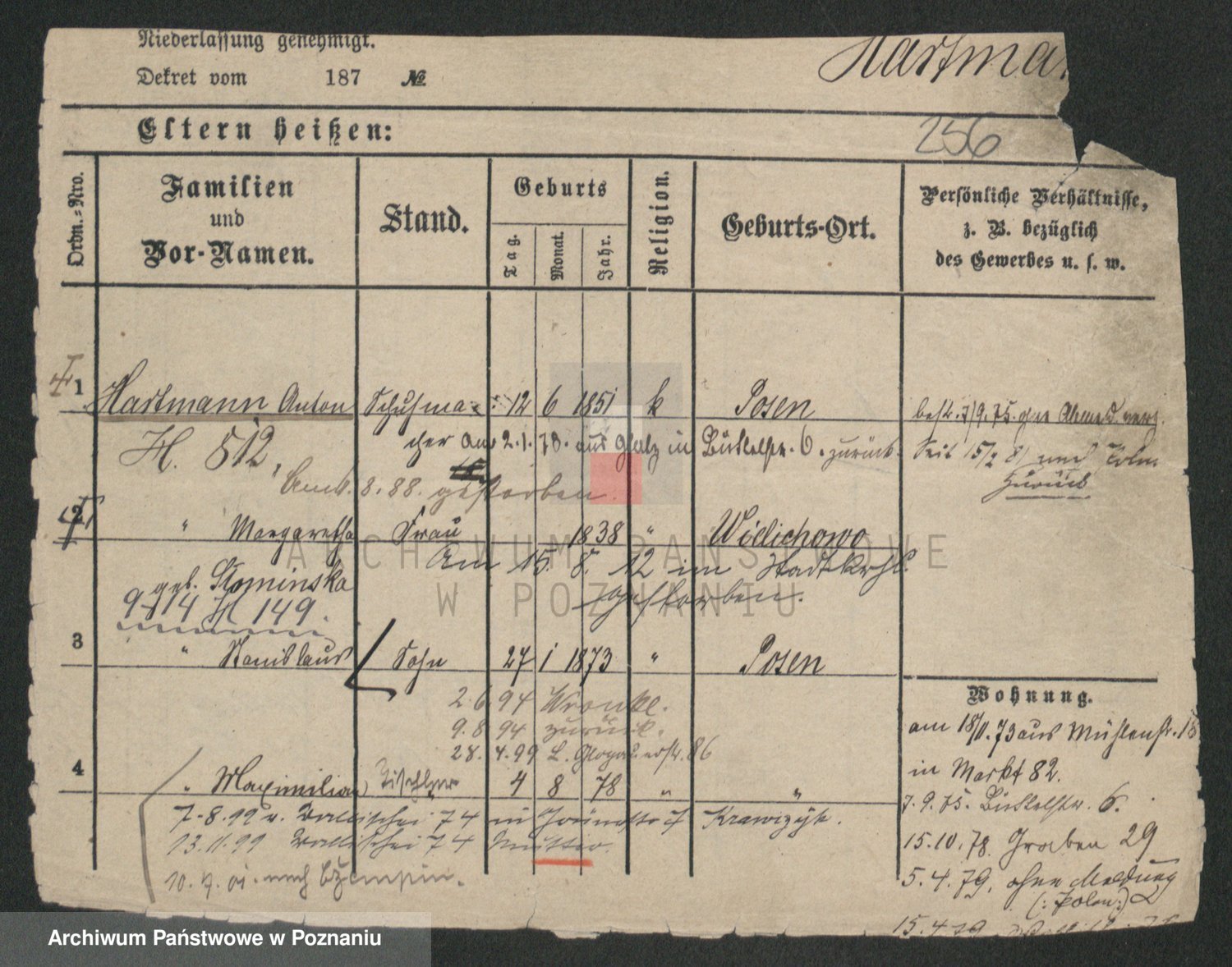 Podgląd karty osobowej dostępny jest po kliknięciu na nazwisko lub ikonkę karty. Można dokonywać powiększenia (ikony na górze) lub przechodzić między kolejnymi skanami (strzałki po bokach).