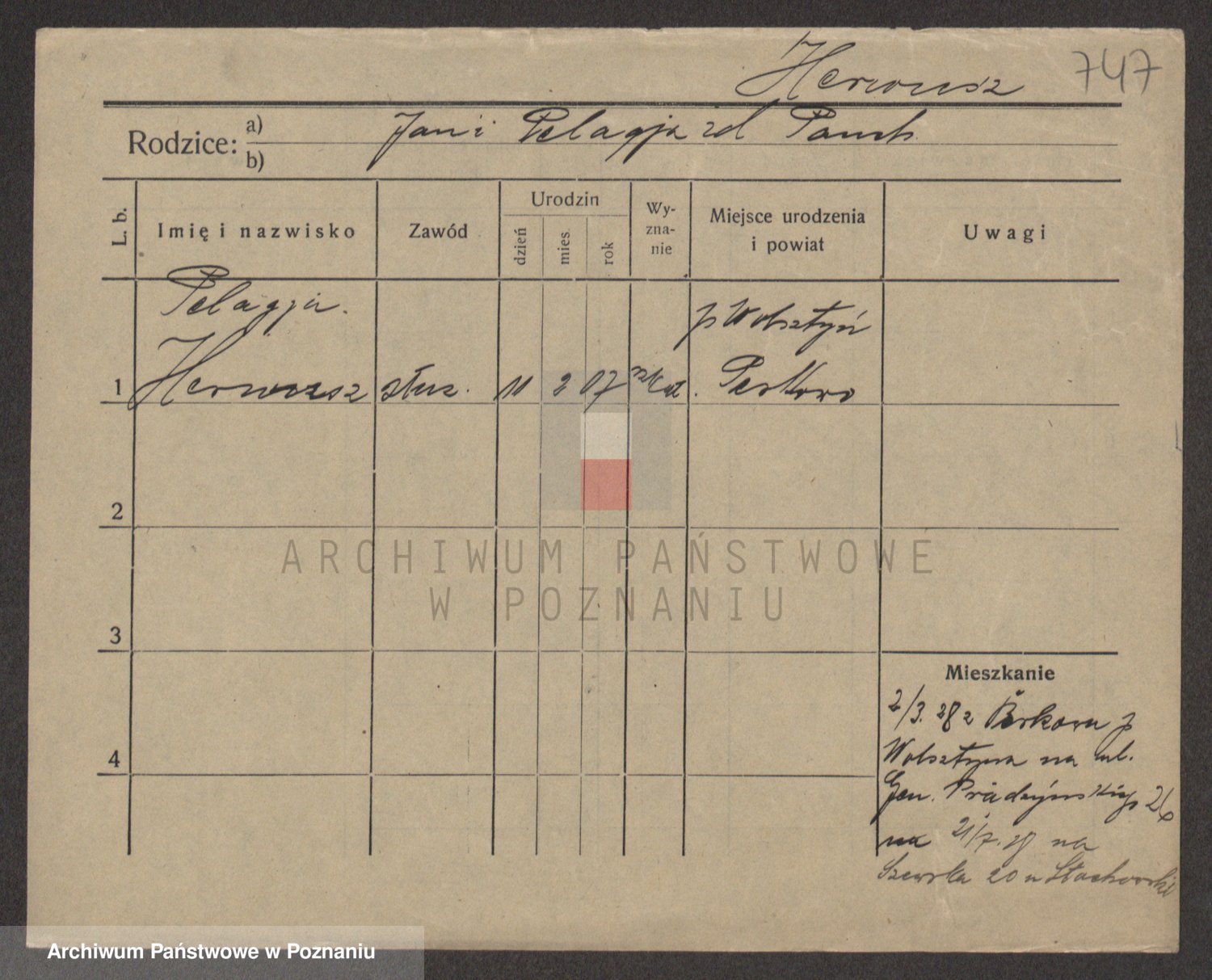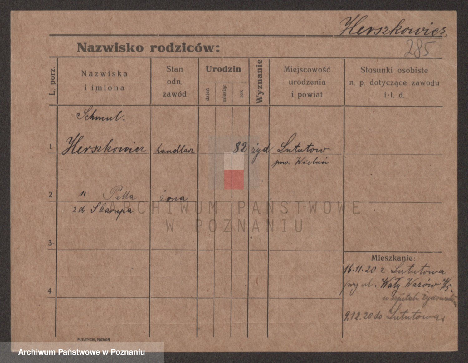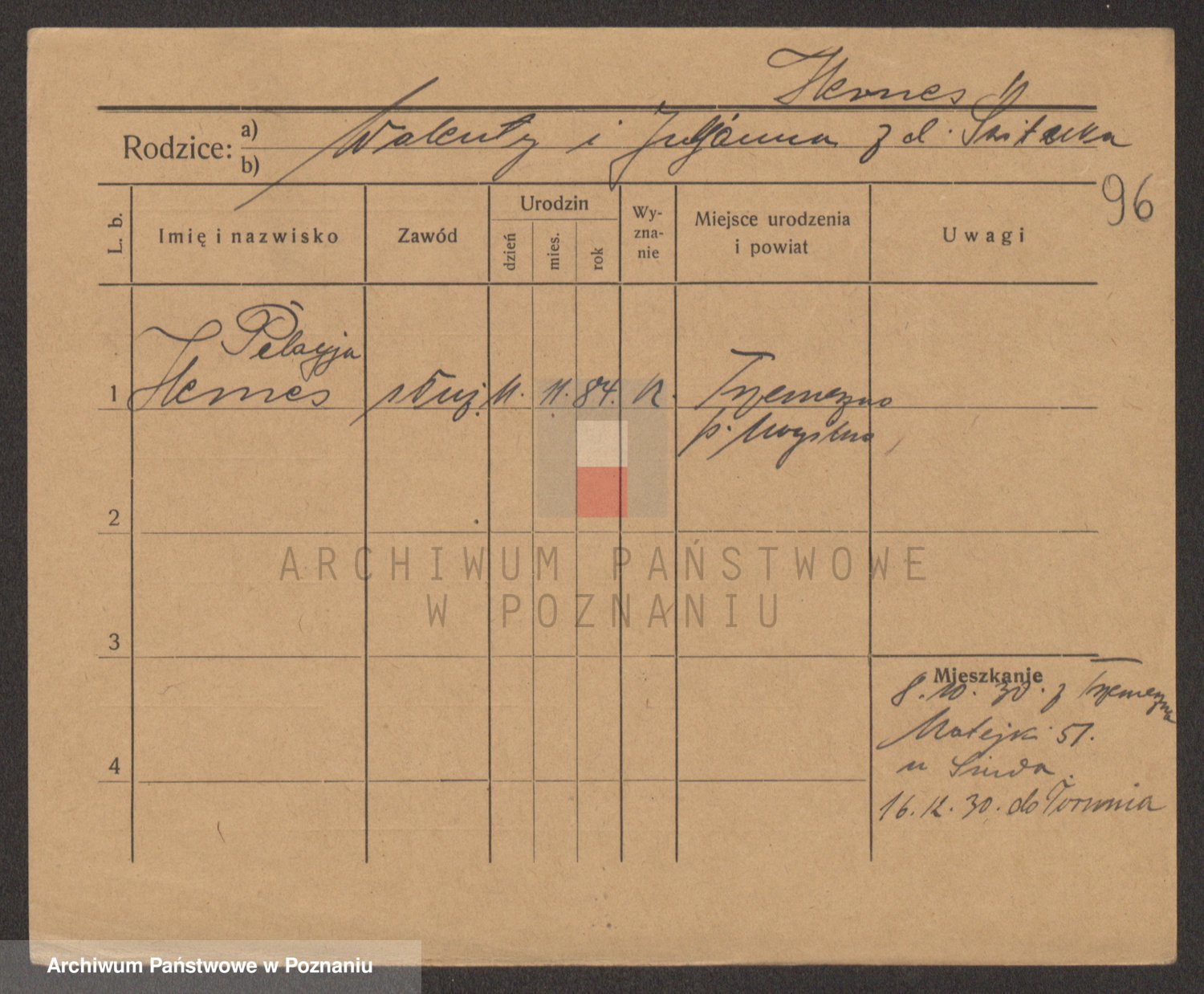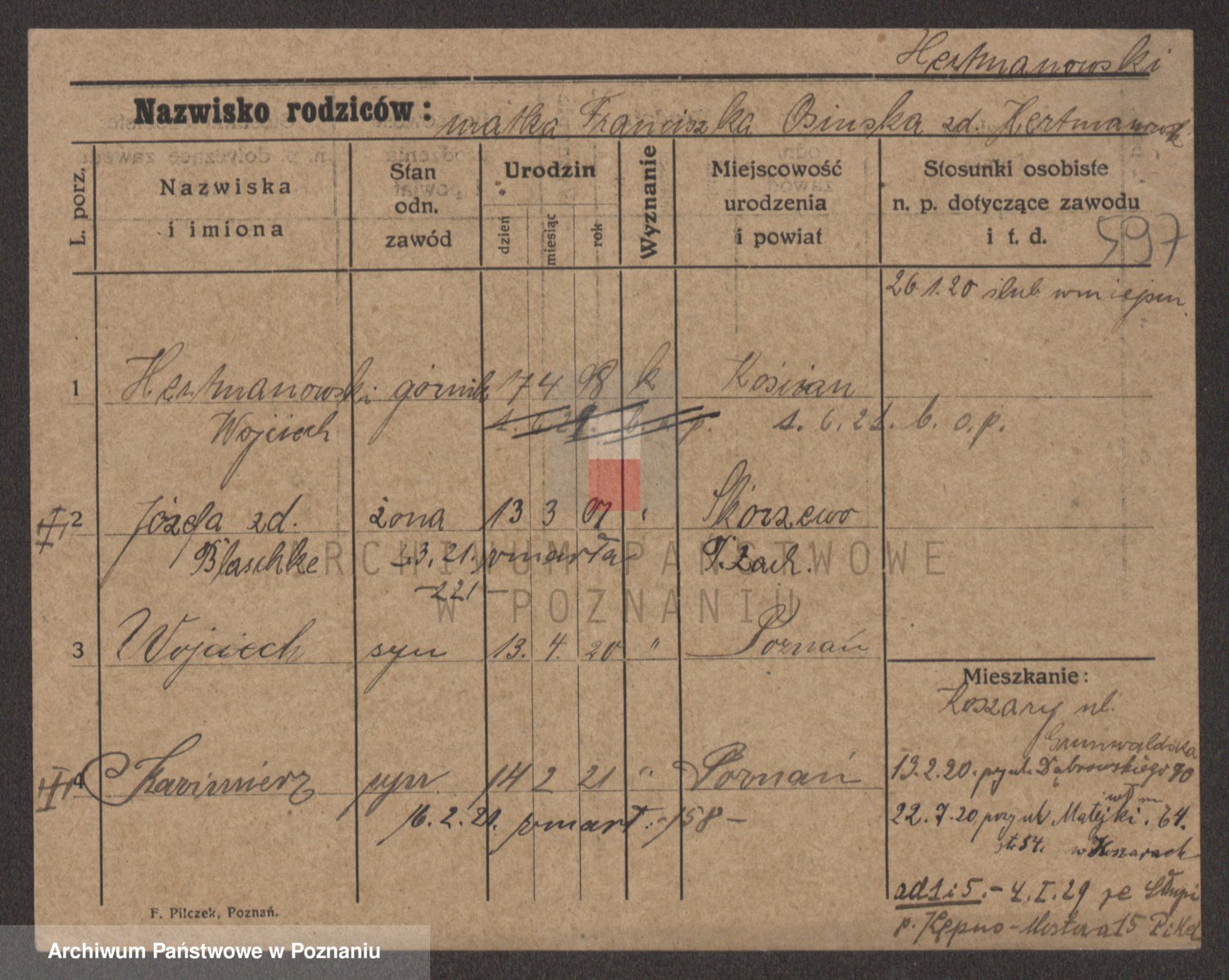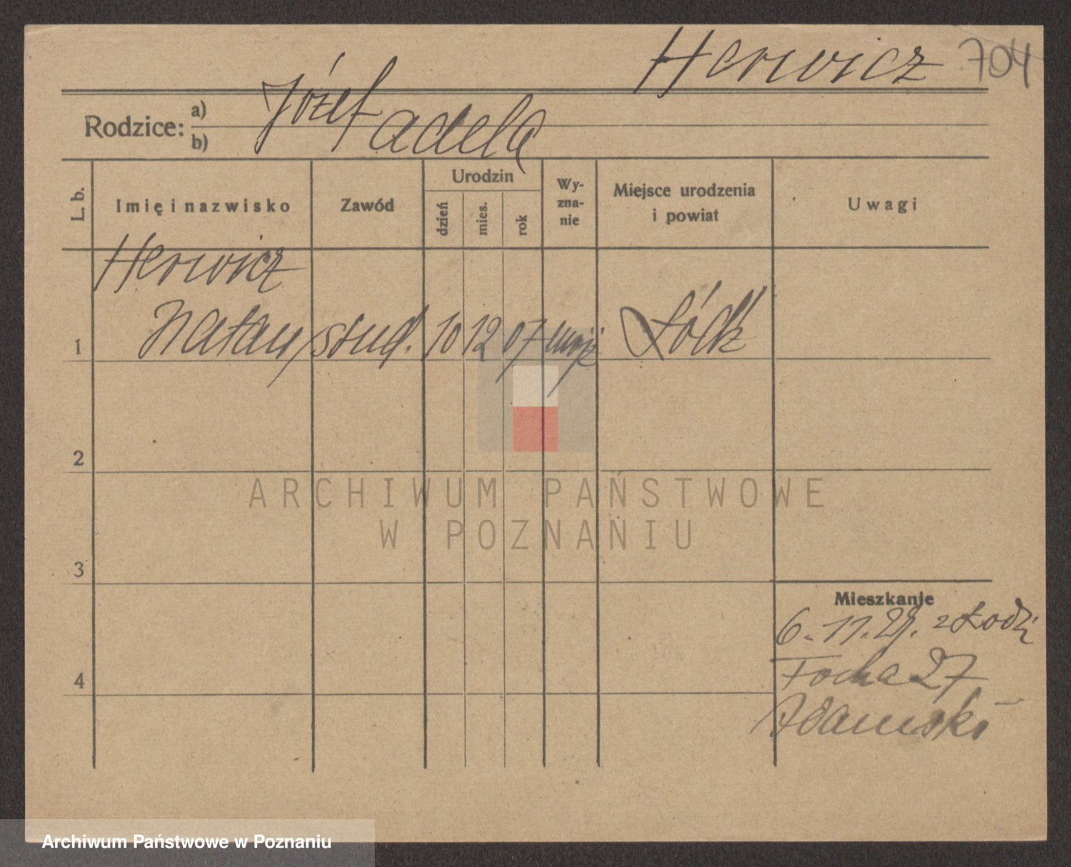 Podgląd karty osobowej dostępny jest po kliknięciu na nazwisko lub ikonkę karty. Można dokonywać powiększenia (ikony na górze) lub przechodzić między kolejnymi skanami (strzałki po bokach).