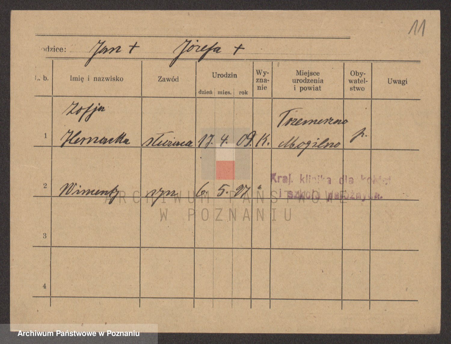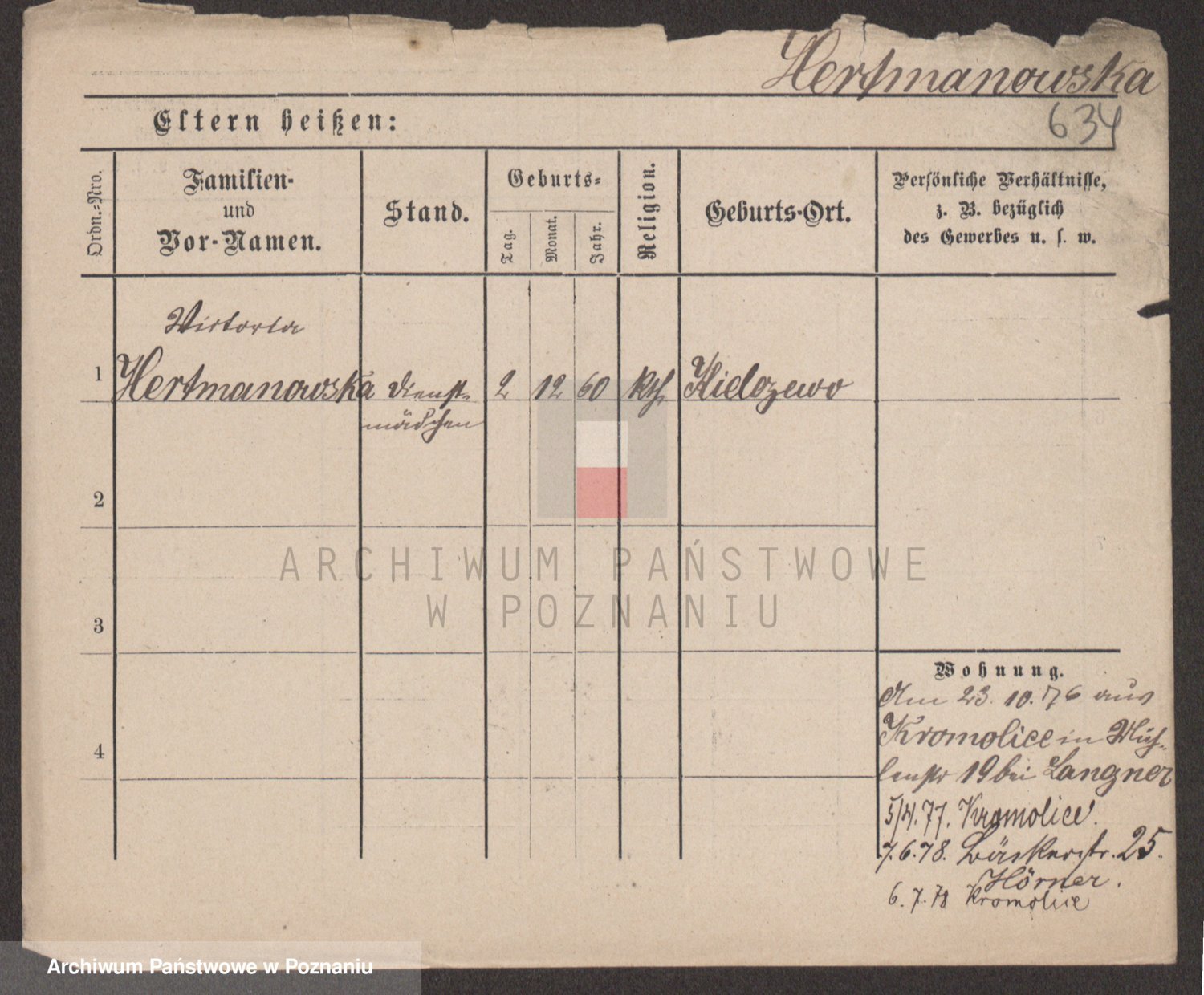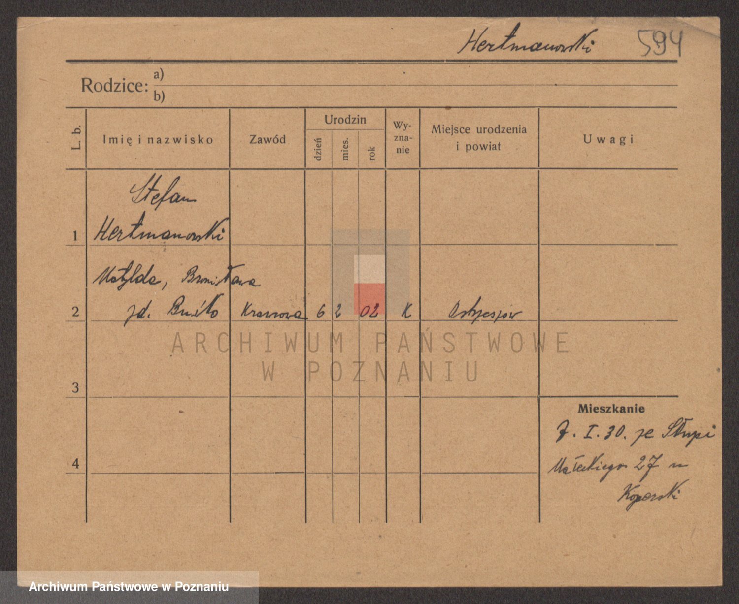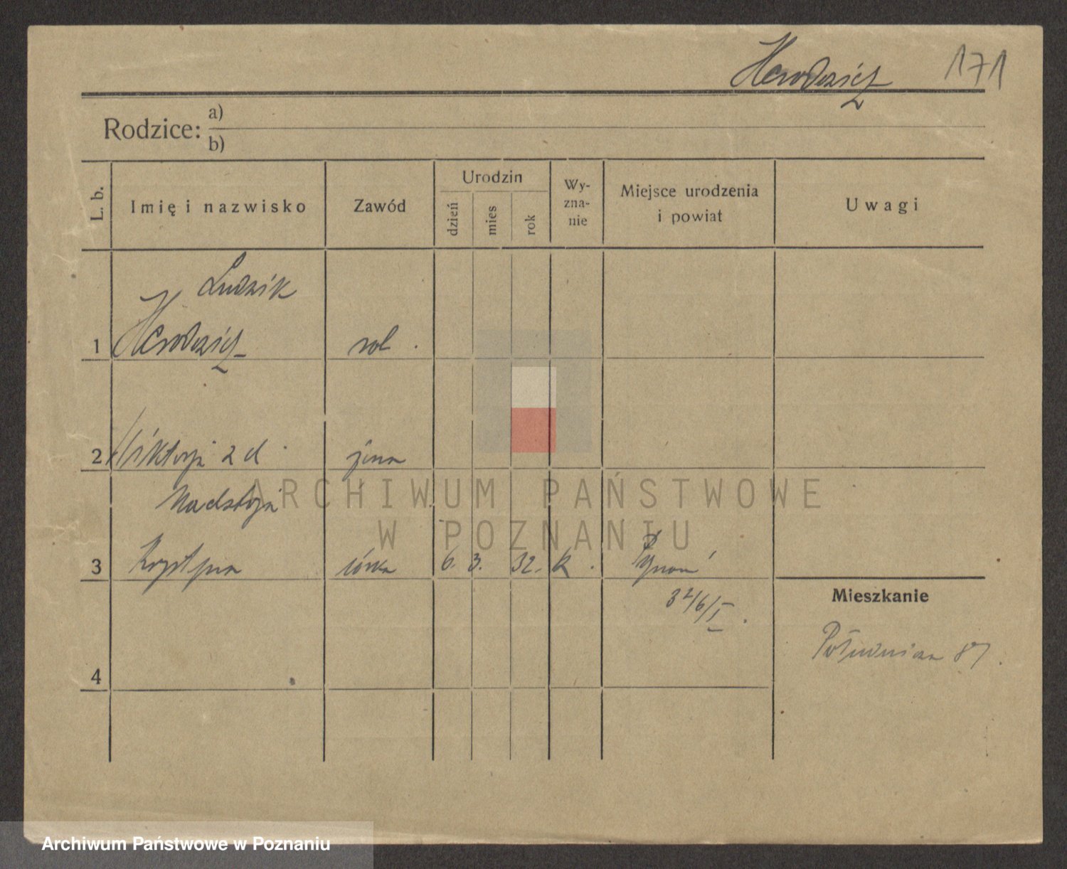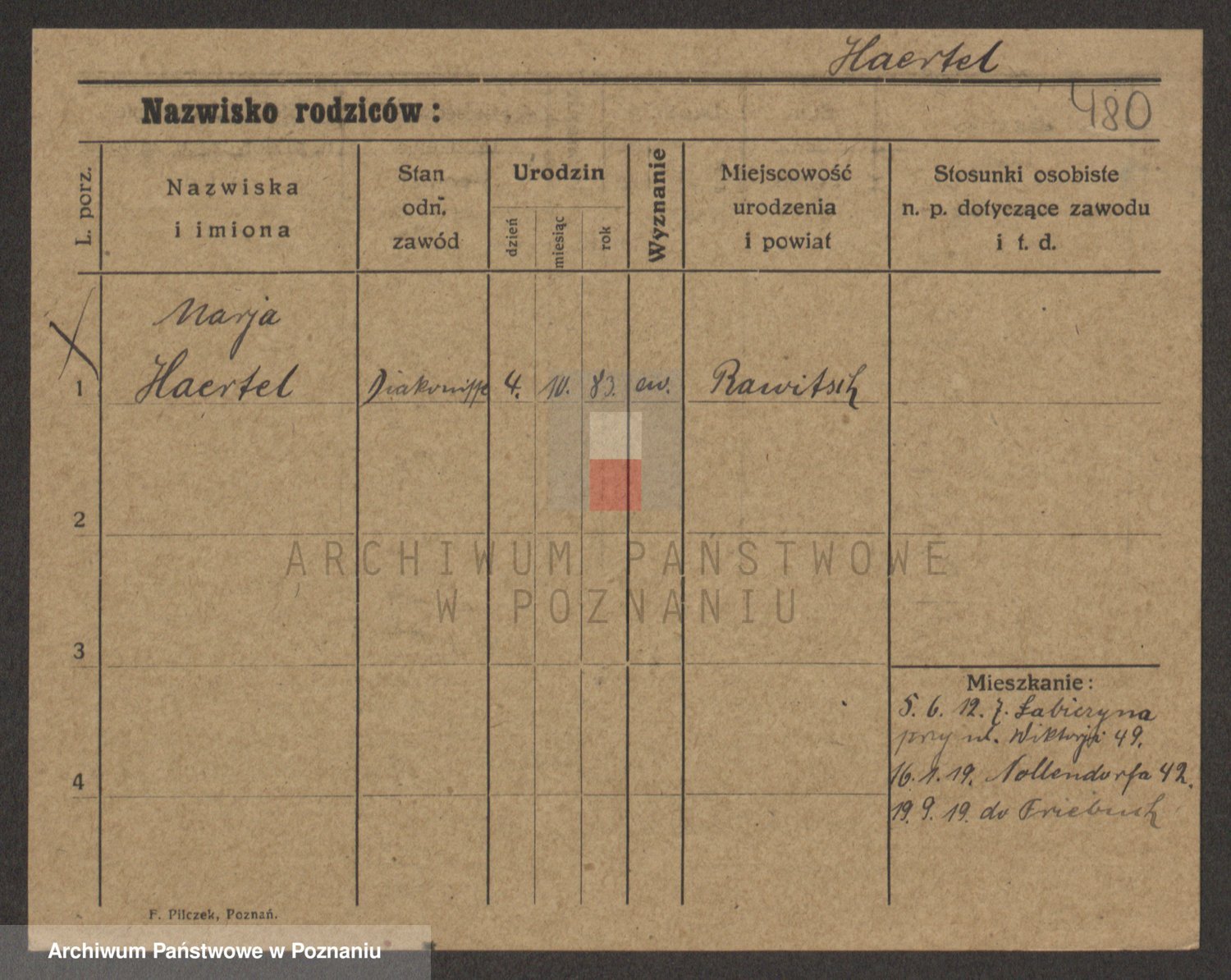 Podgląd karty osobowej dostępny jest po kliknięciu na nazwisko lub ikonkę karty. Można dokonywać powiększenia (ikony na górze) lub przechodzić między kolejnymi skanami (strzałki po bokach).