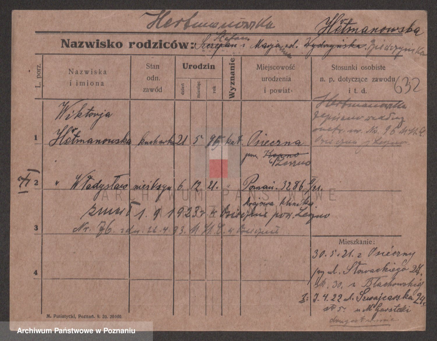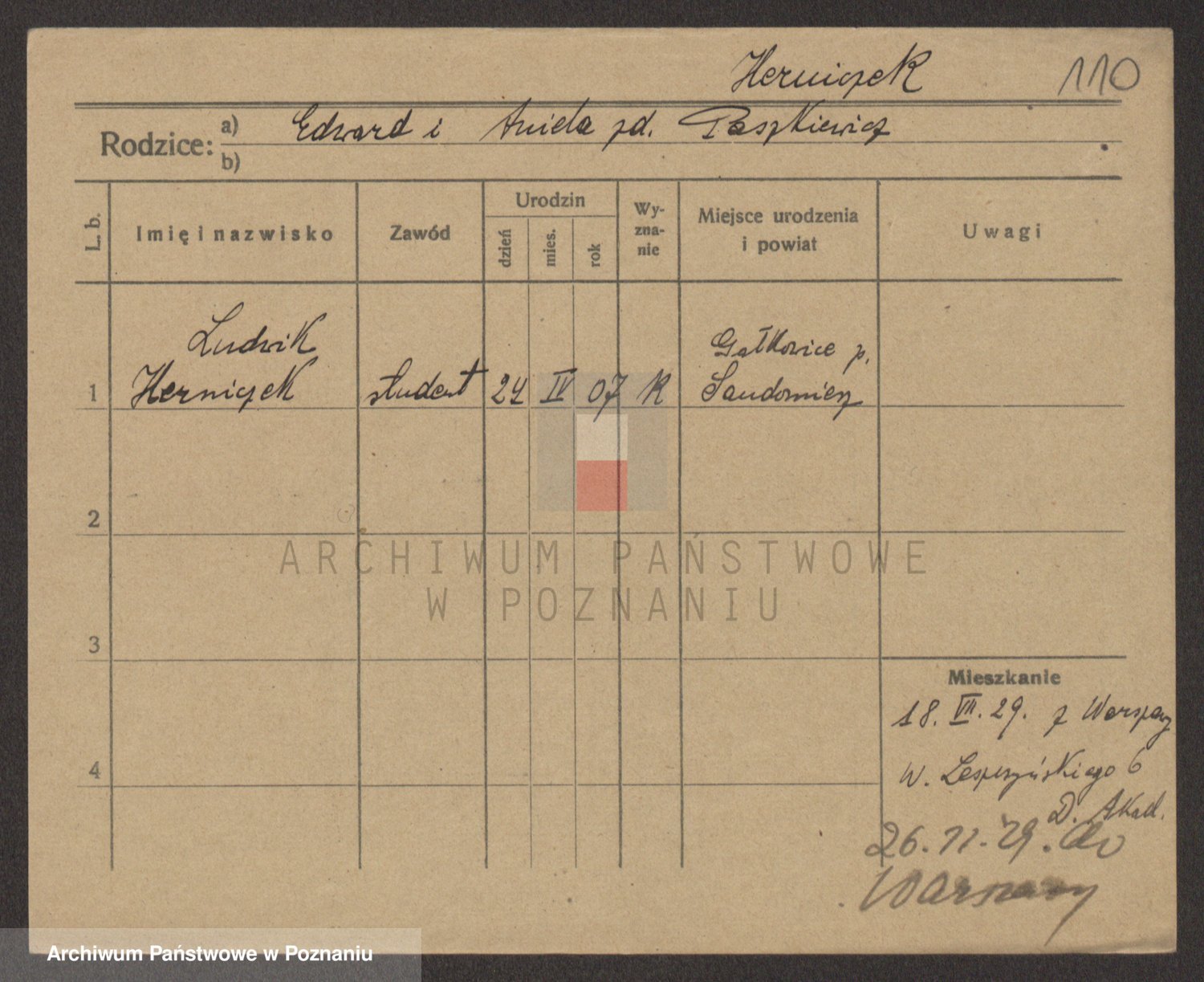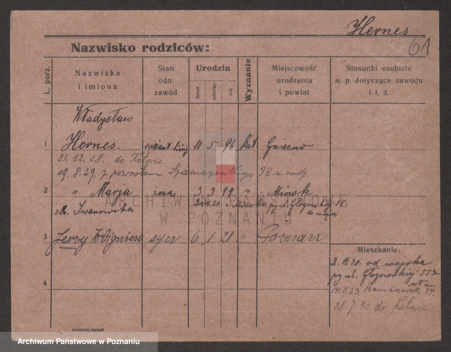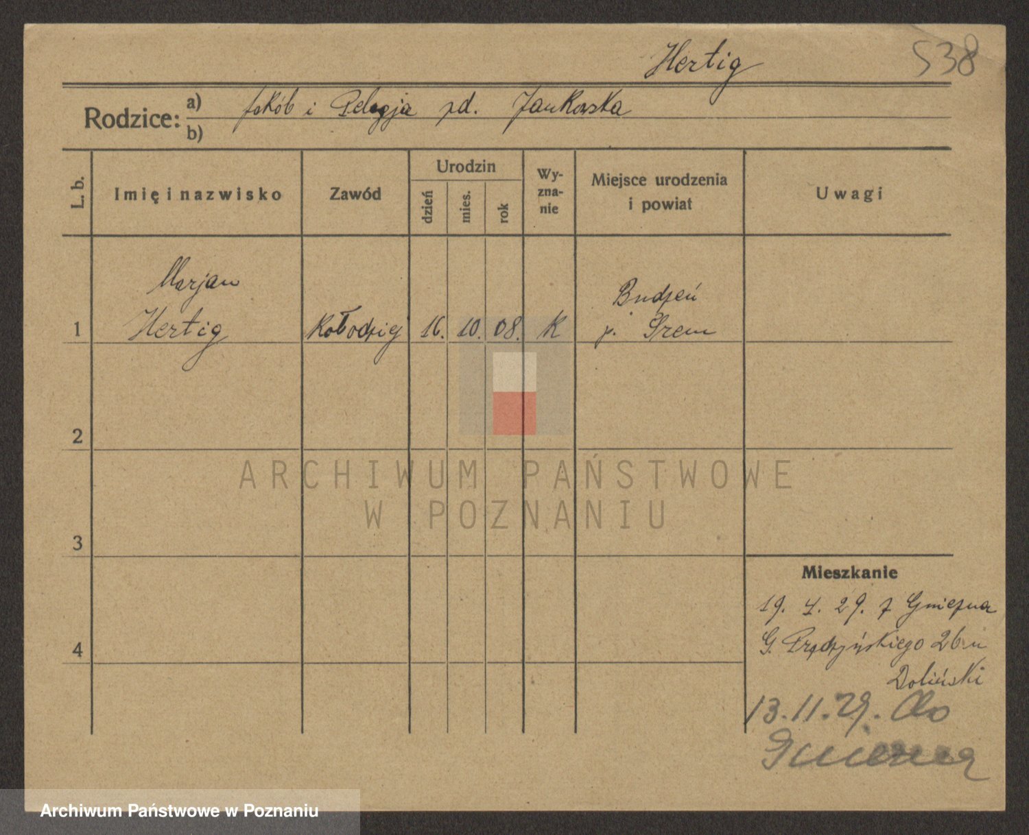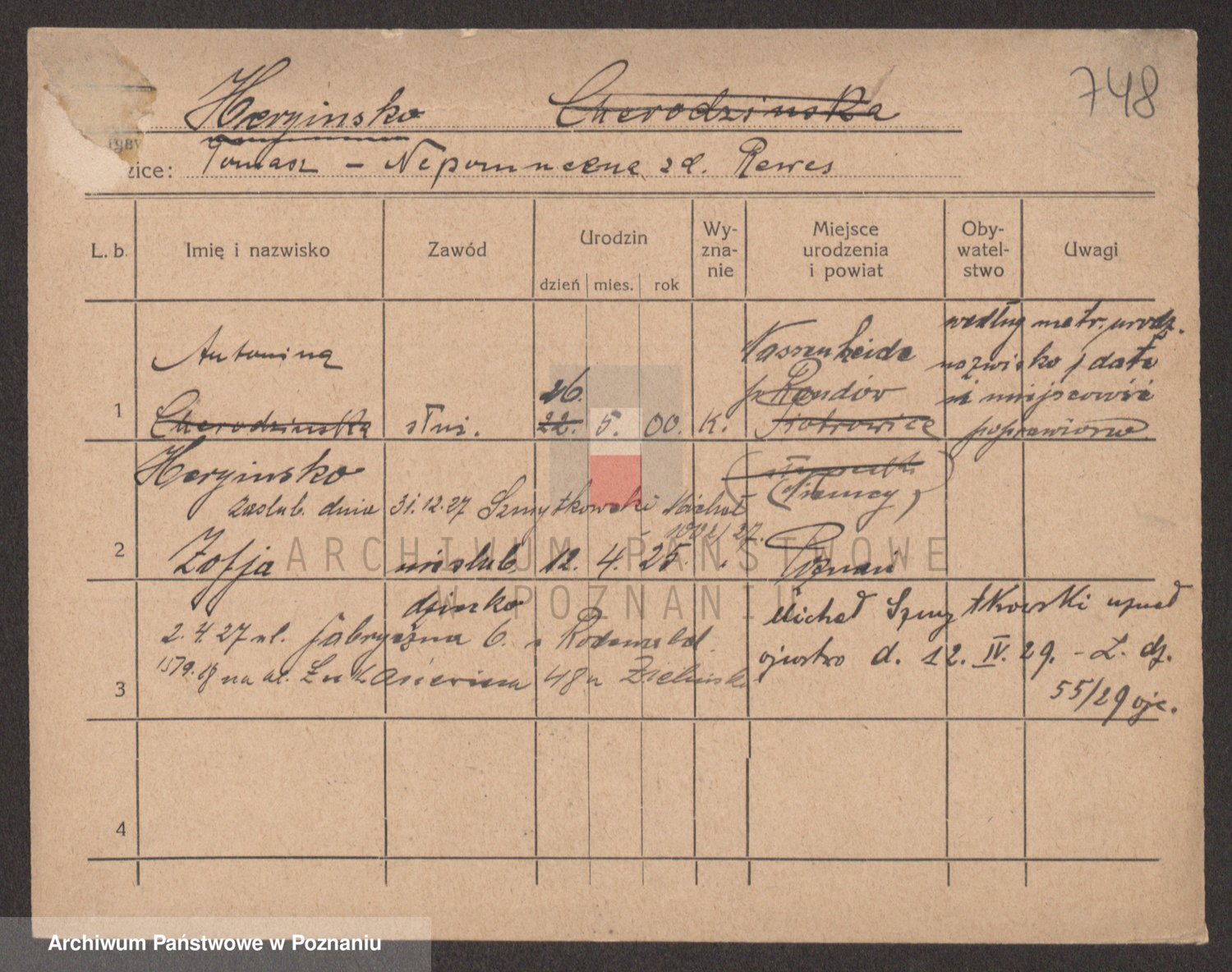 Podgląd karty osobowej dostępny jest po kliknięciu na nazwisko lub ikonkę karty. Można dokonywać powiększenia (ikony na górze) lub przechodzić między kolejnymi skanami (strzałki po bokach).