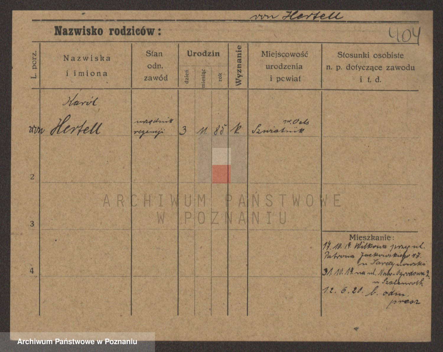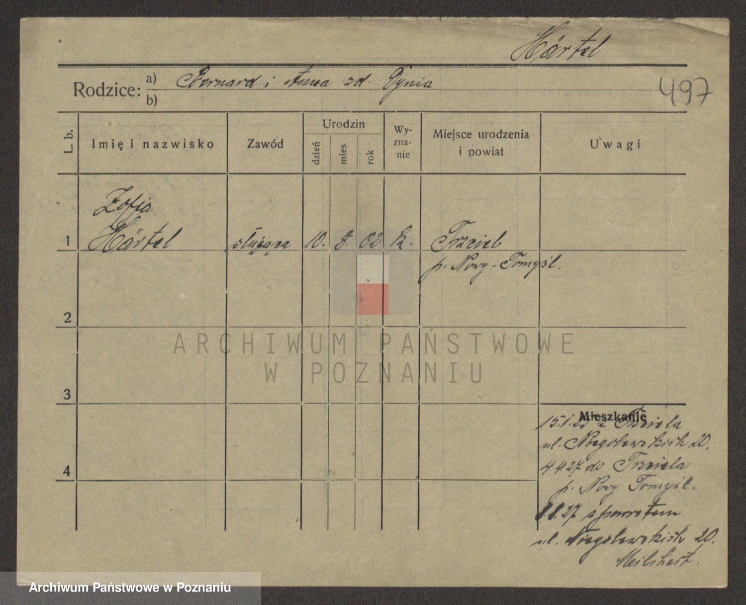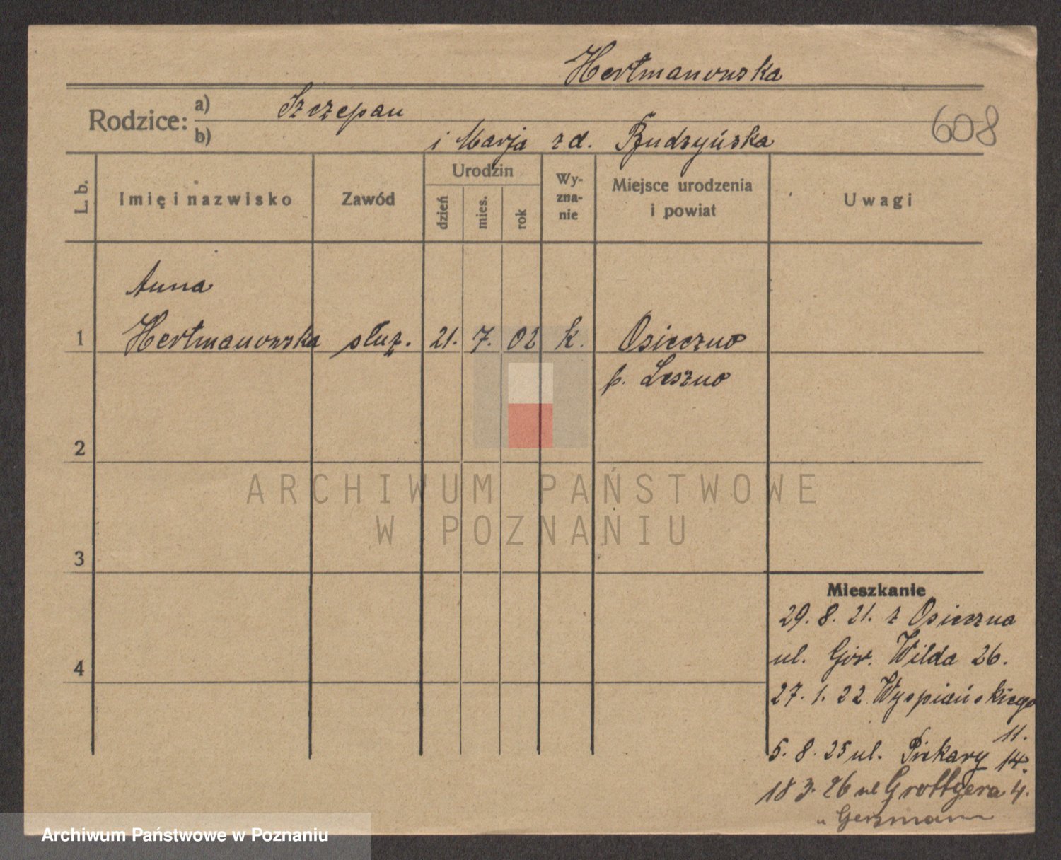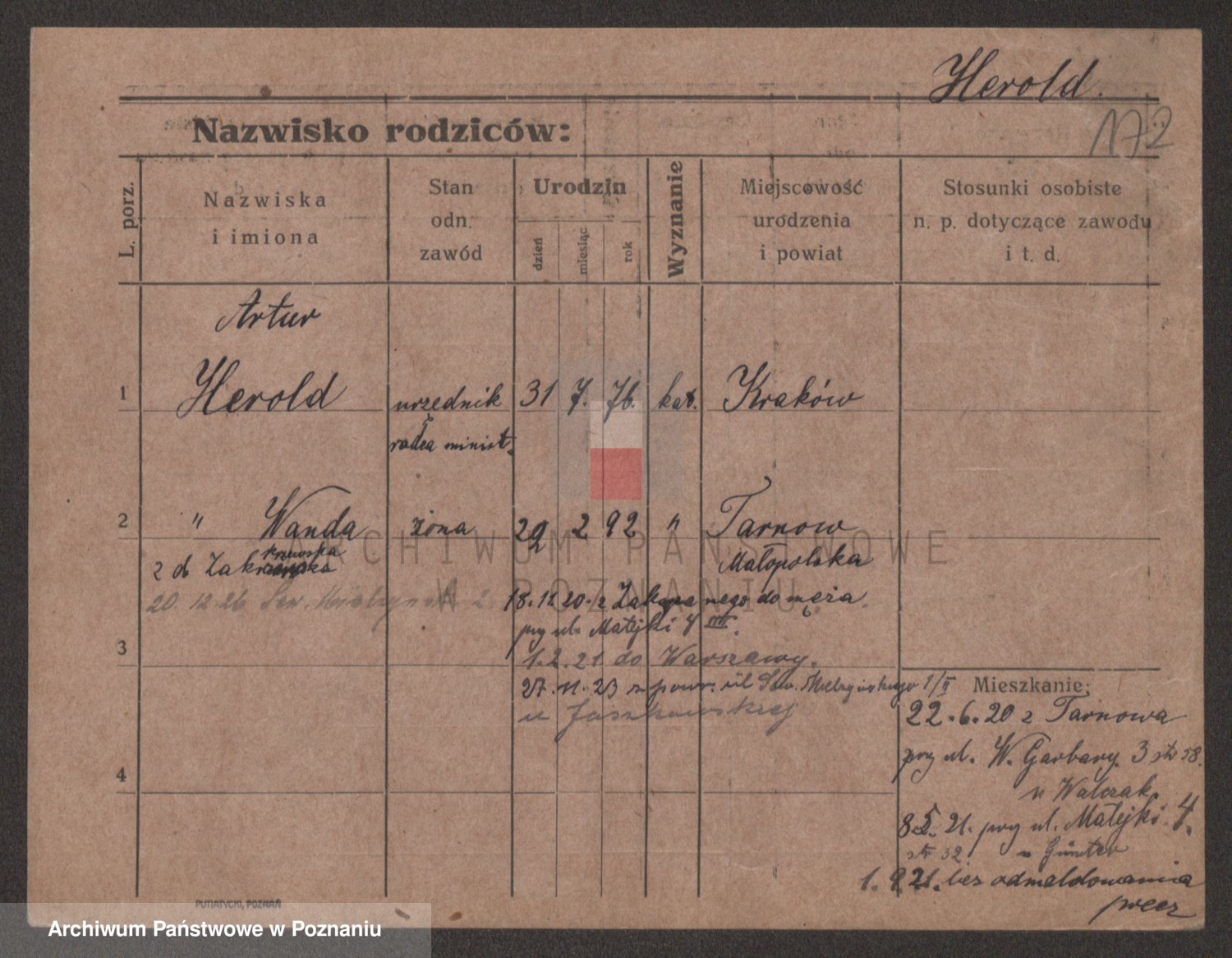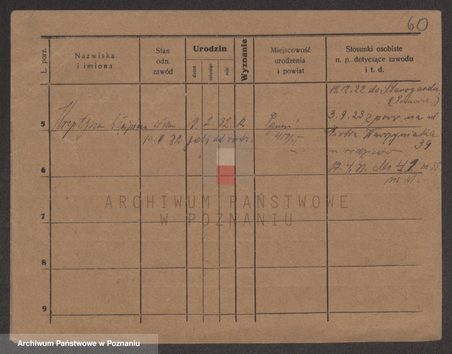 Podgląd karty osobowej dostępny jest po kliknięciu na nazwisko lub ikonkę karty. Można dokonywać powiększenia (ikony na górze) lub przechodzić między kolejnymi skanami (strzałki po bokach).