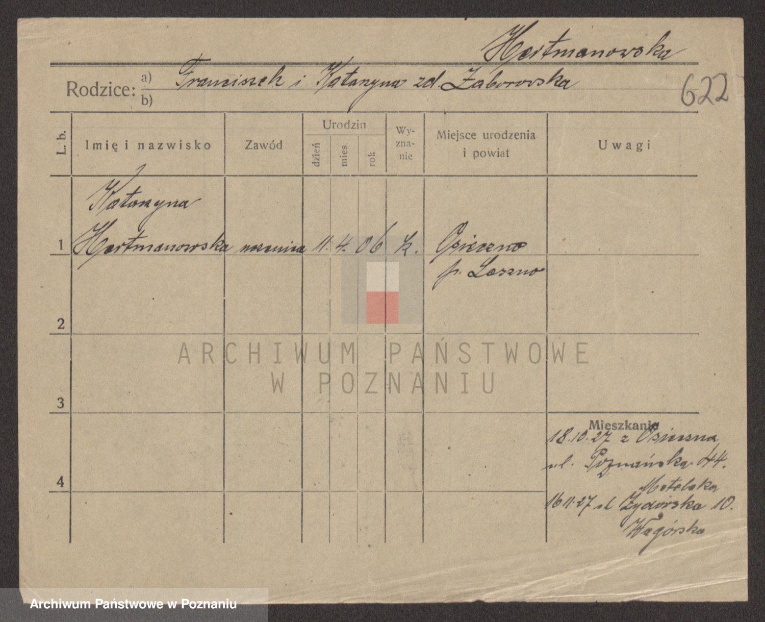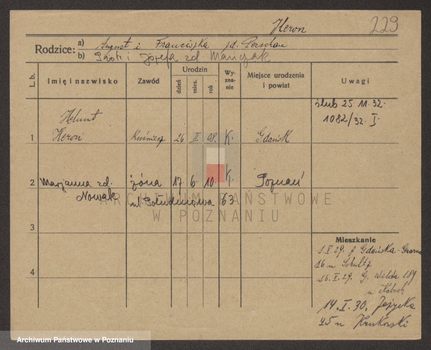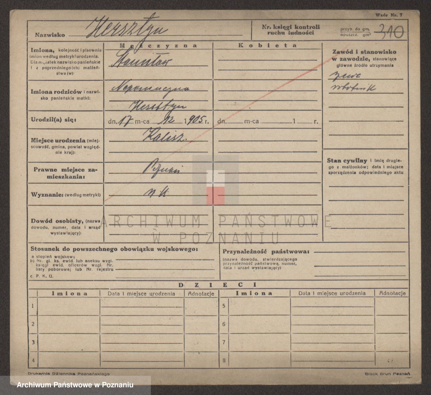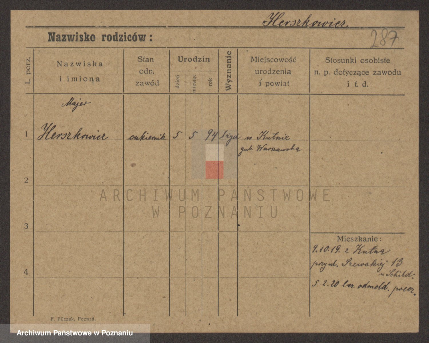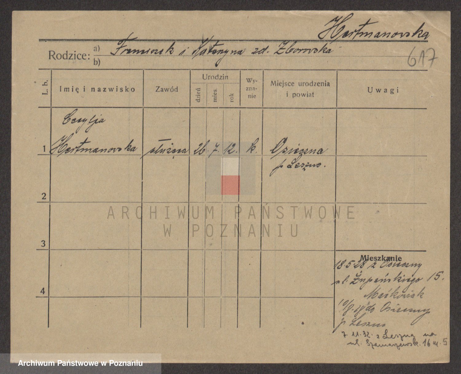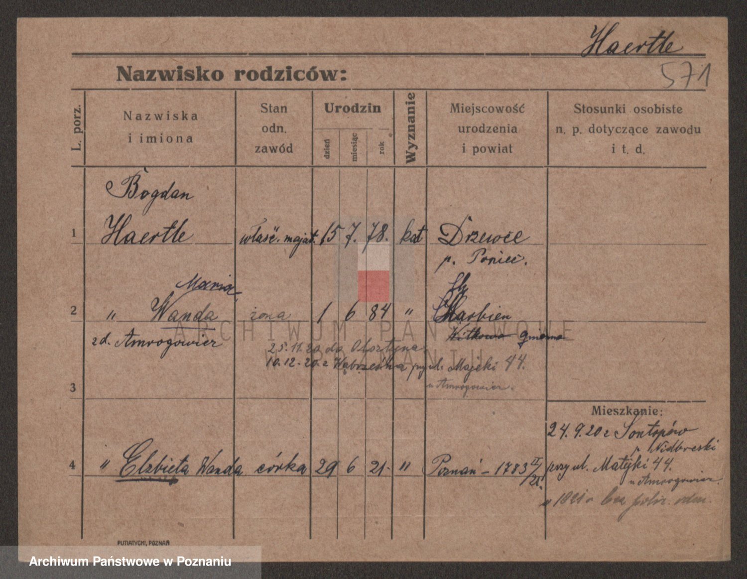 Podgląd karty osobowej dostępny jest po kliknięciu na nazwisko lub ikonkę karty. Można dokonywać powiększenia (ikony na górze) lub przechodzić między kolejnymi skanami (strzałki po bokach).