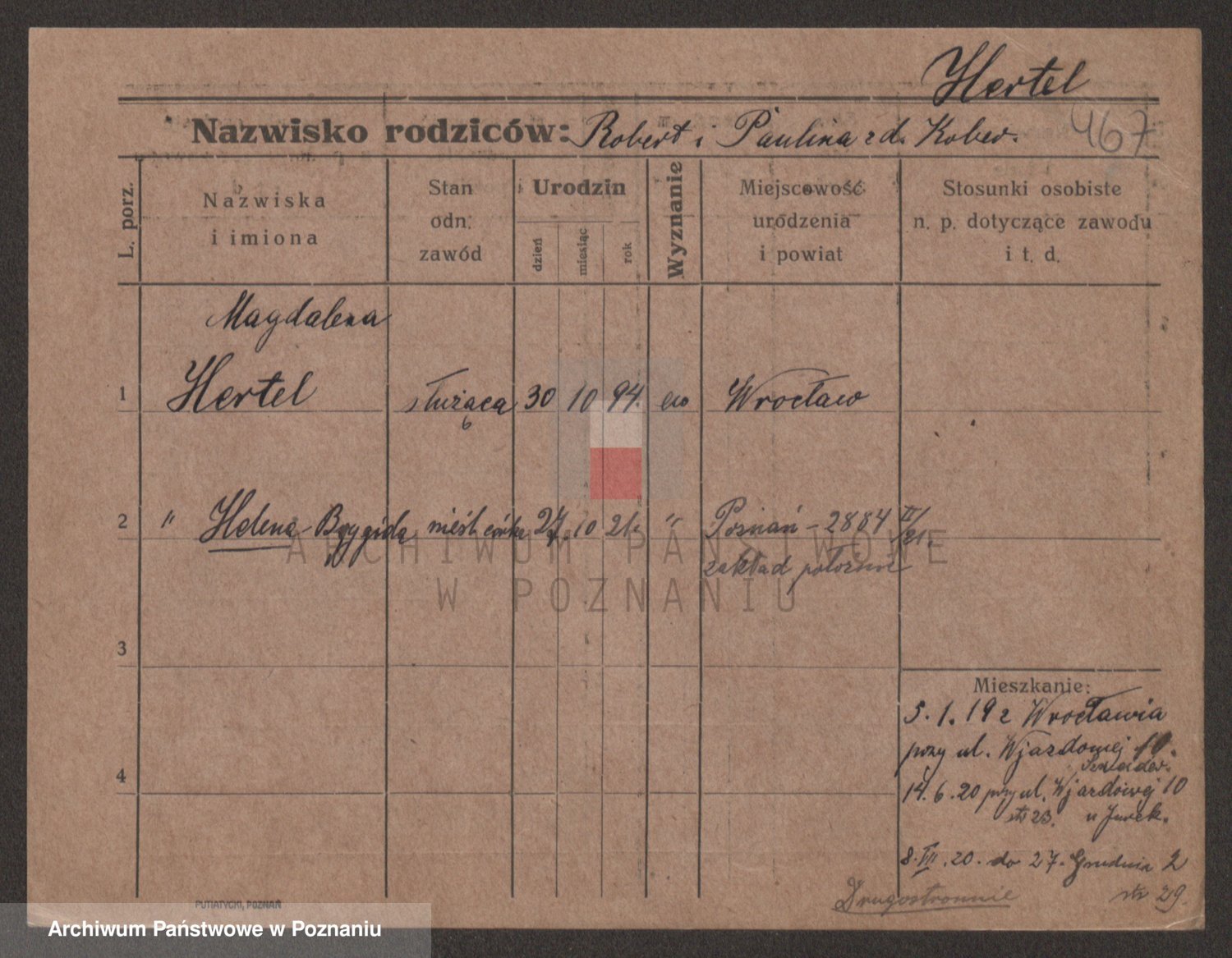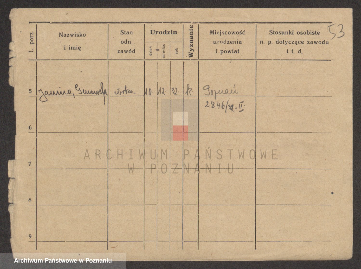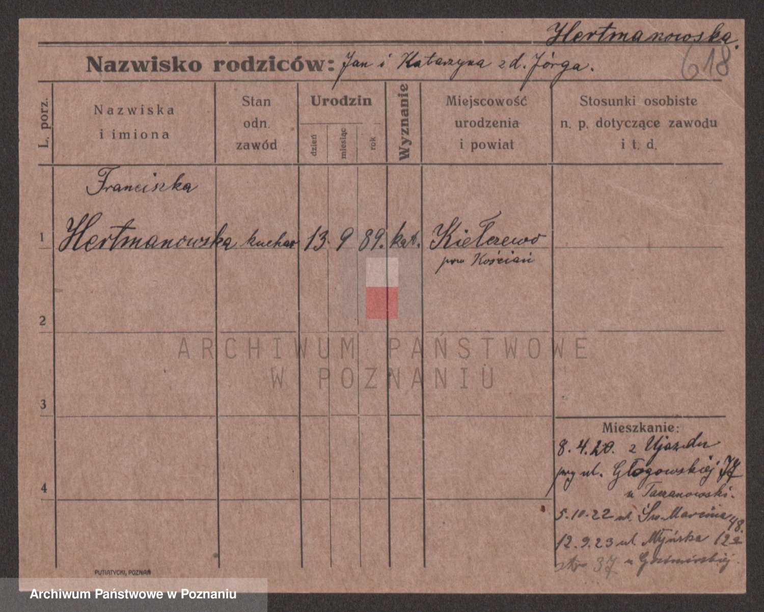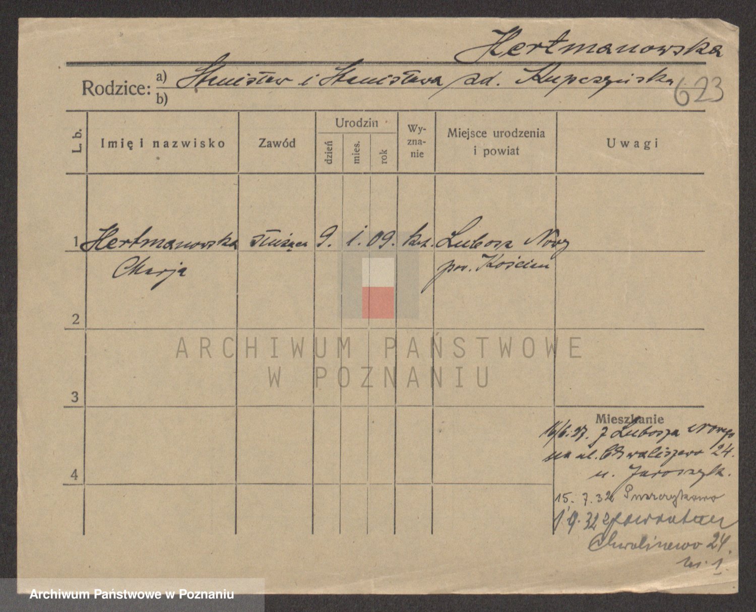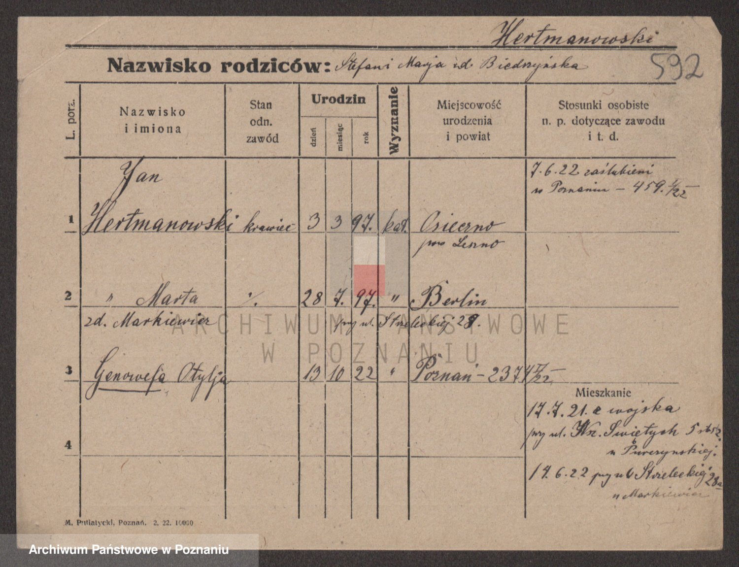 Podgląd karty osobowej dostępny jest po kliknięciu na nazwisko lub ikonkę karty. Można dokonywać powiększenia (ikony na górze) lub przechodzić między kolejnymi skanami (strzałki po bokach).