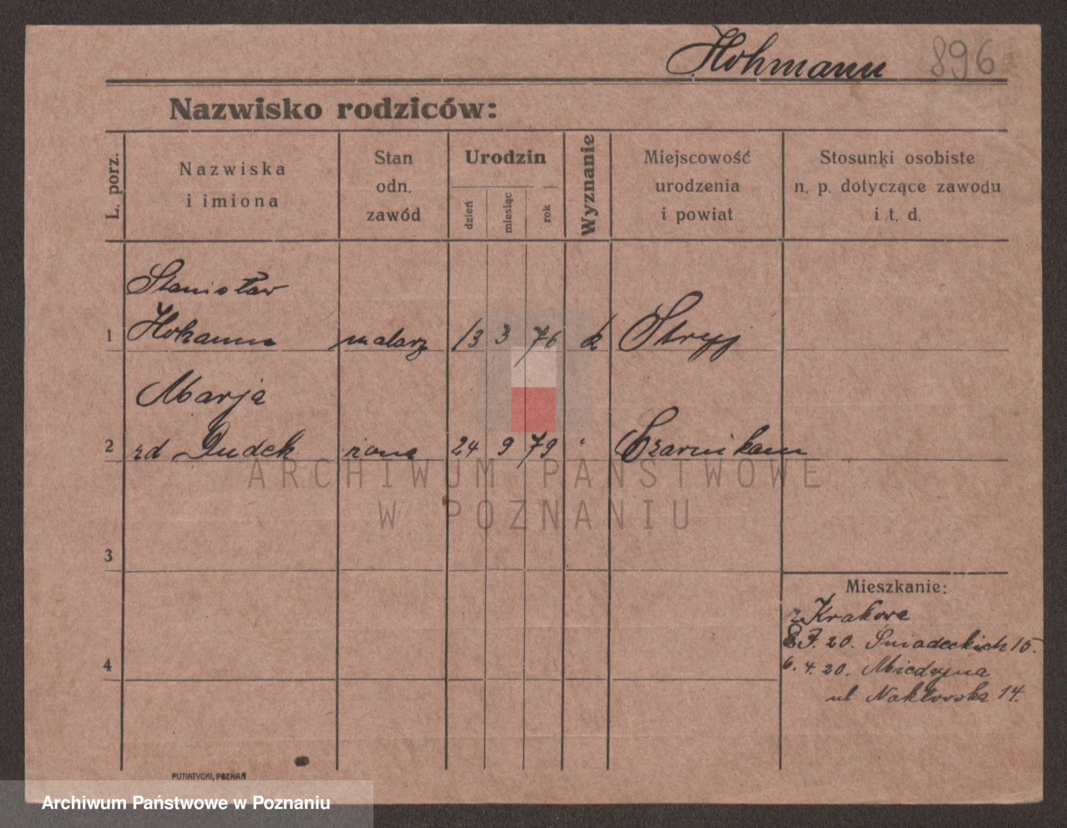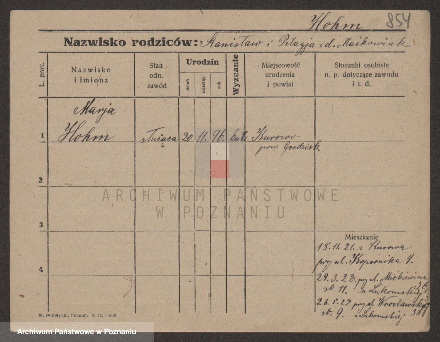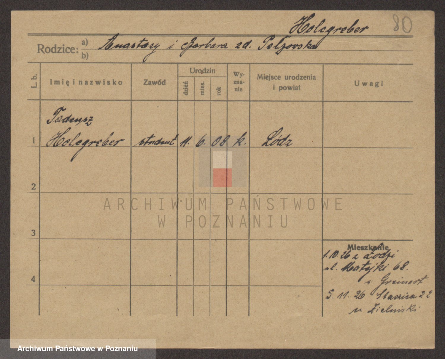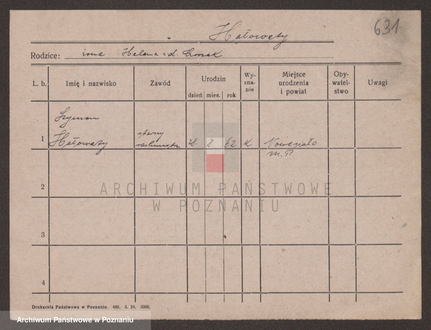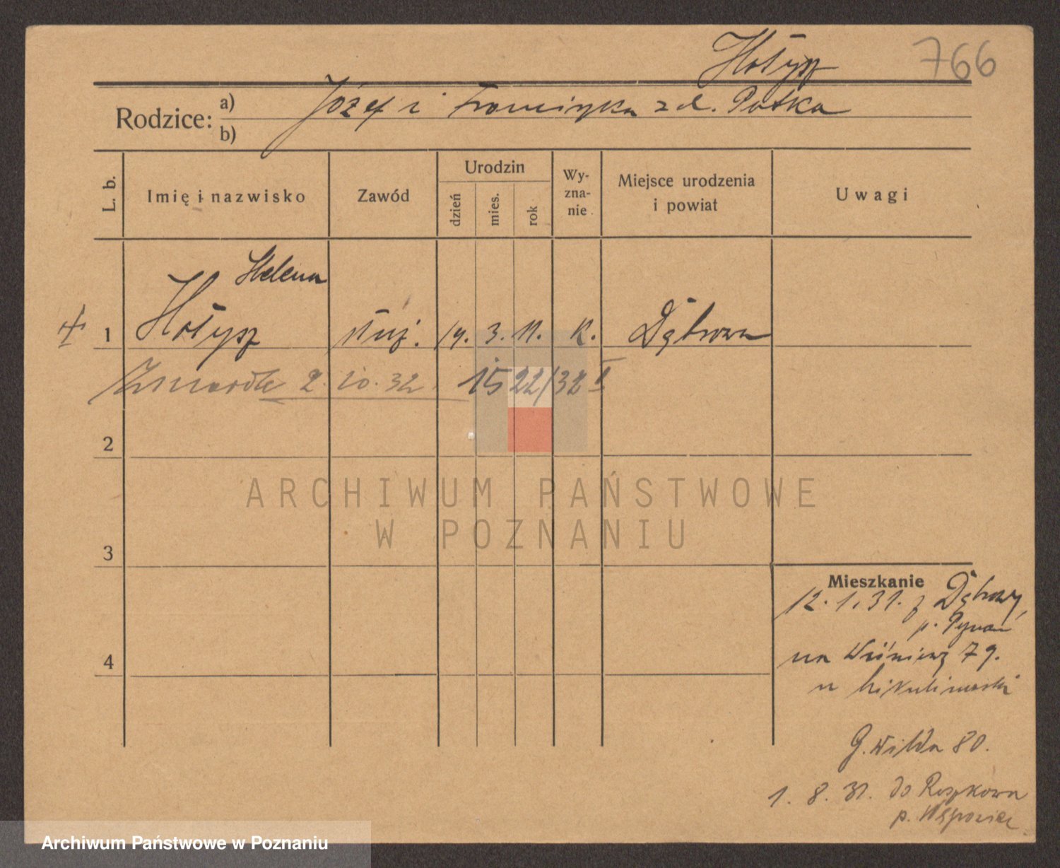 Podgląd karty osobowej dostępny jest po kliknięciu na nazwisko lub ikonkę karty. Można dokonywać powiększenia (ikony na górze) lub przechodzić między kolejnymi skanami (strzałki po bokach).