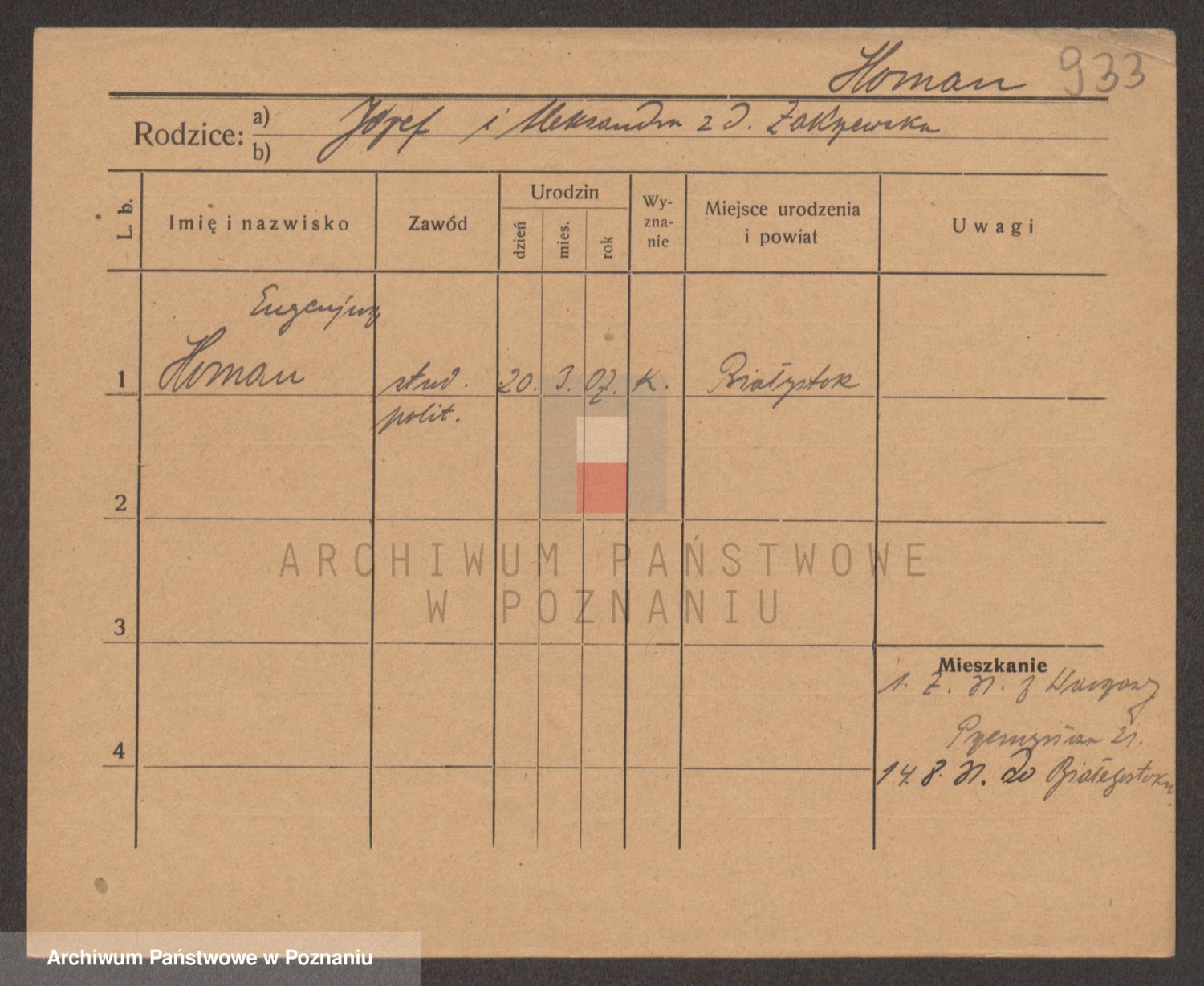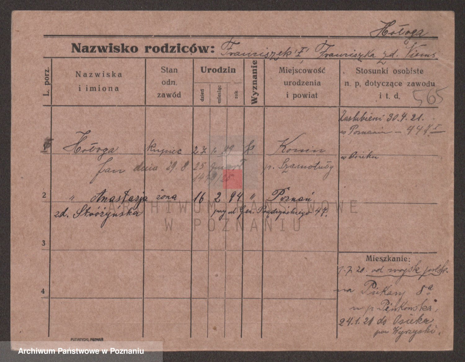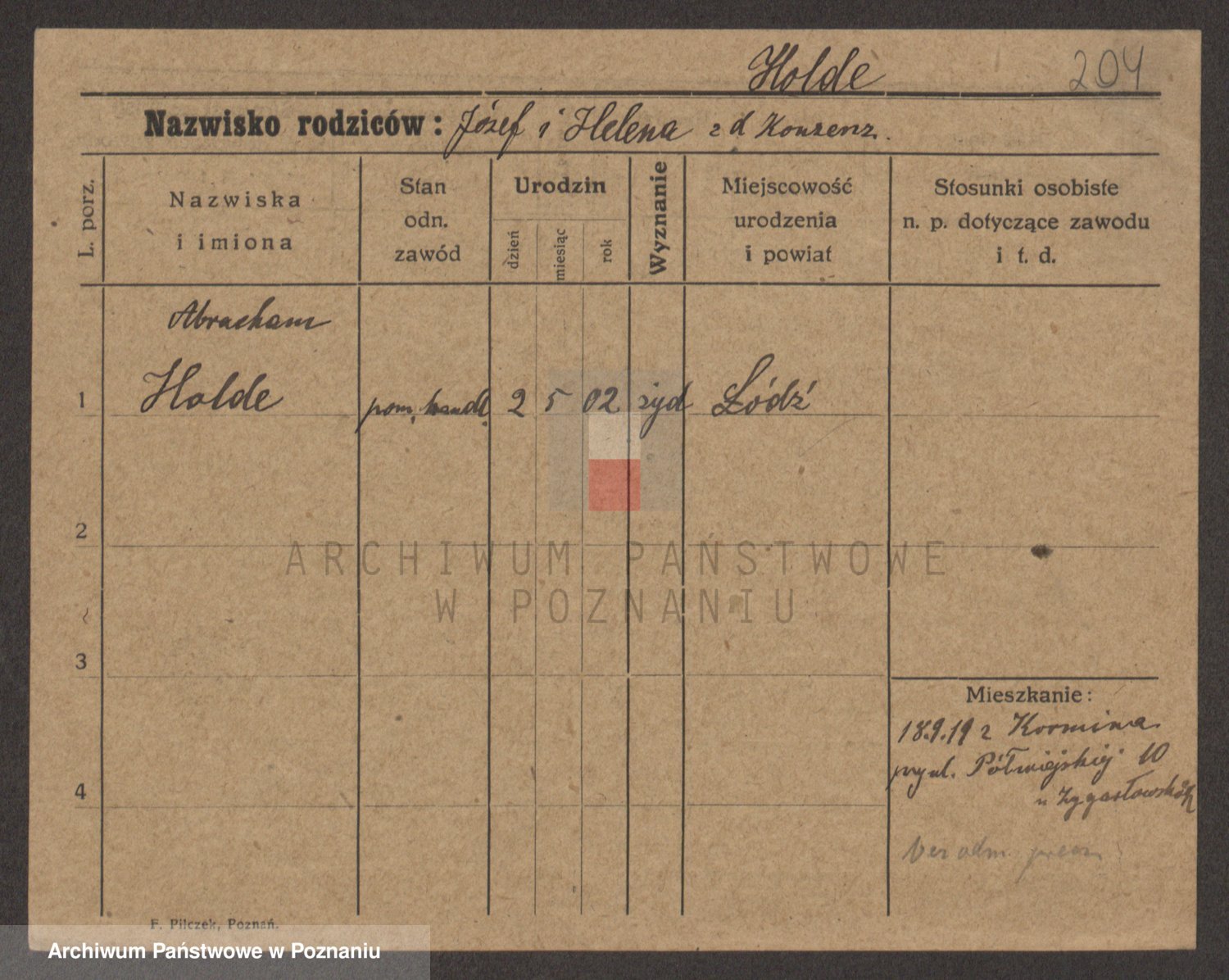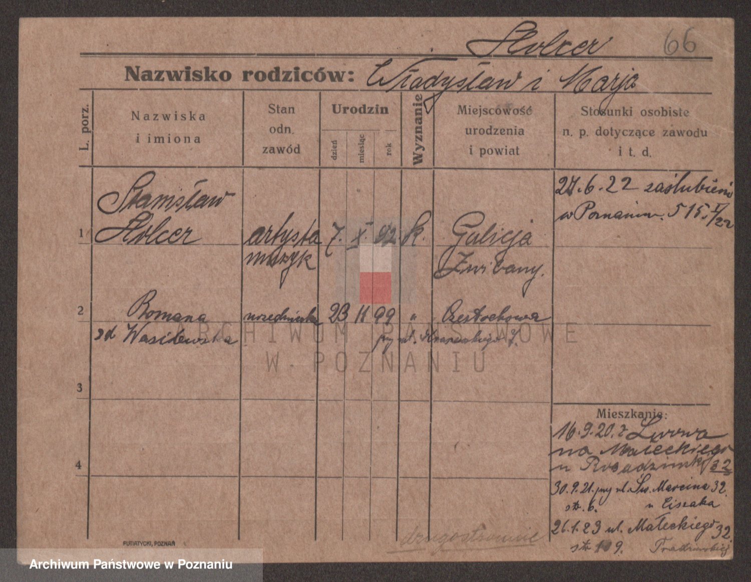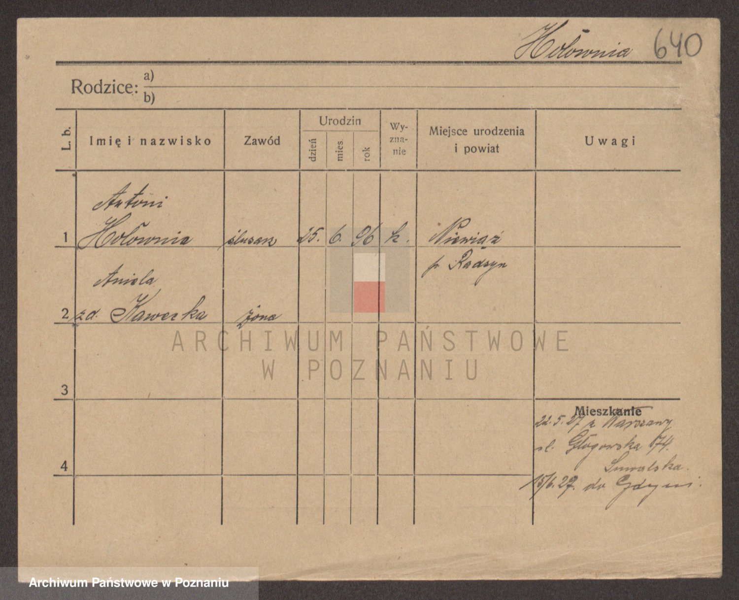 Podgląd karty osobowej dostępny jest po kliknięciu na nazwisko lub ikonkę karty. Można dokonywać powiększenia (ikony na górze) lub przechodzić między kolejnymi skanami (strzałki po bokach).