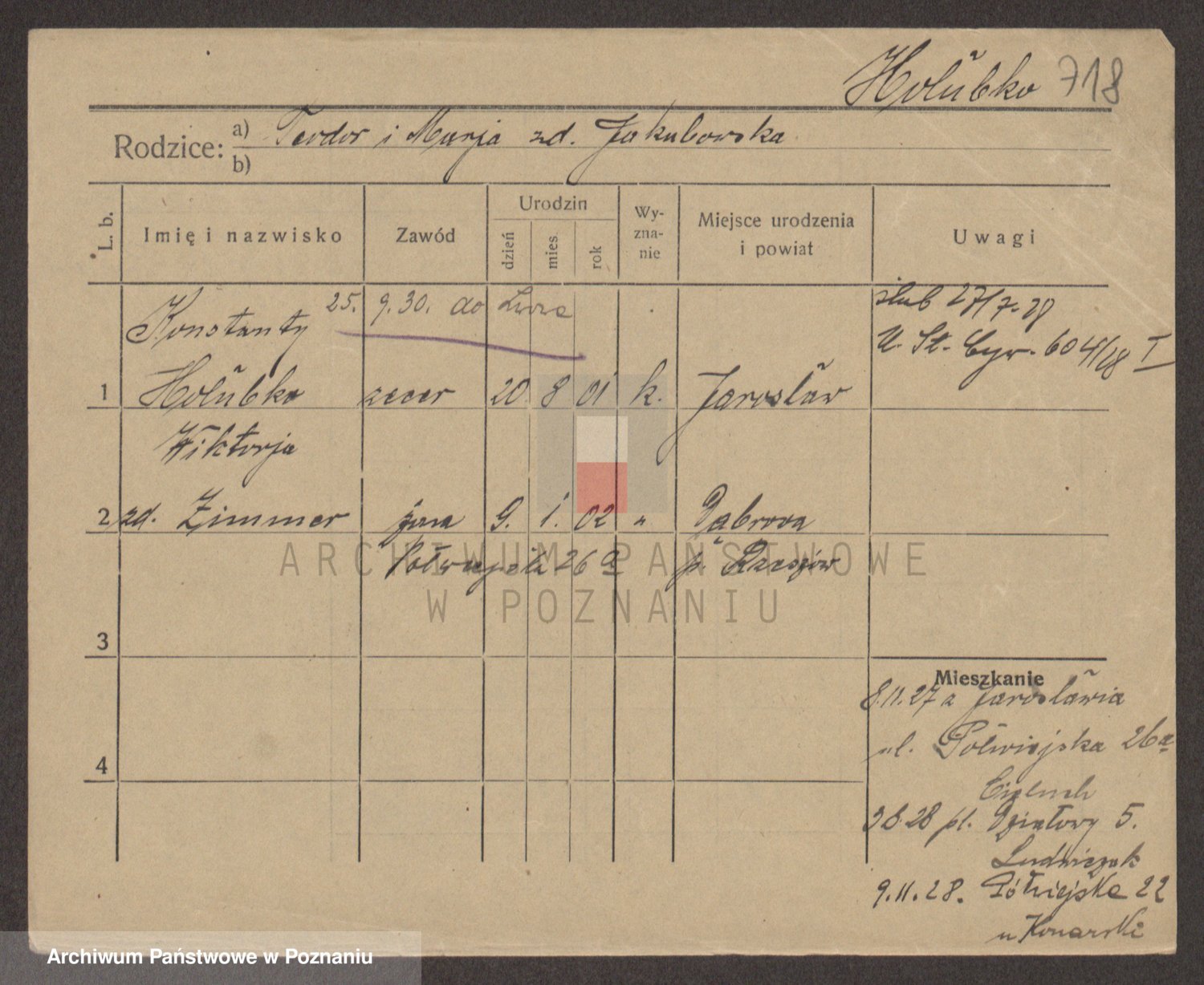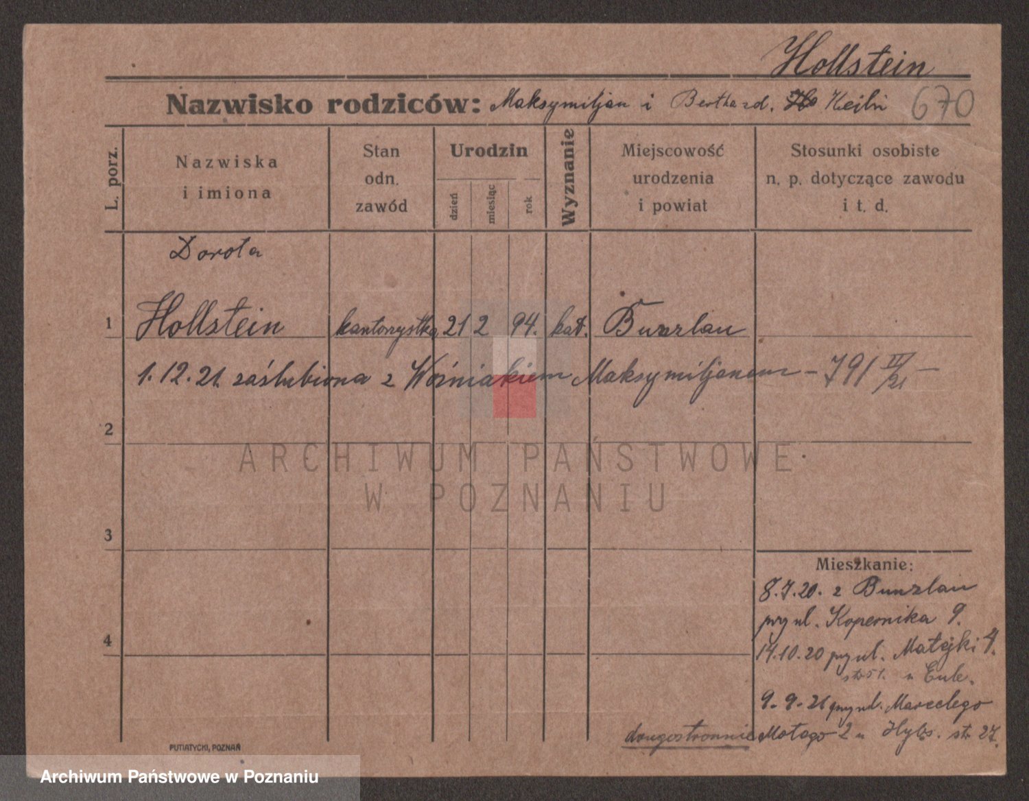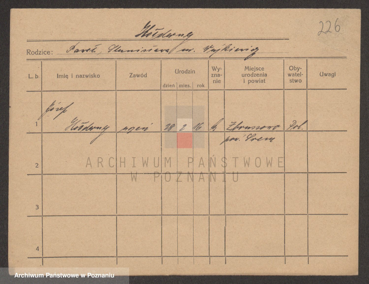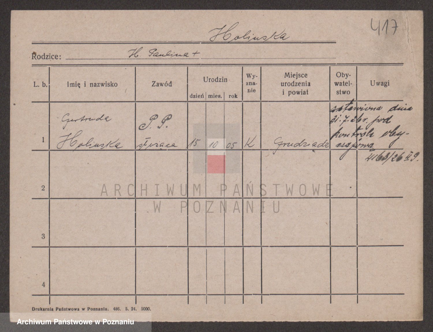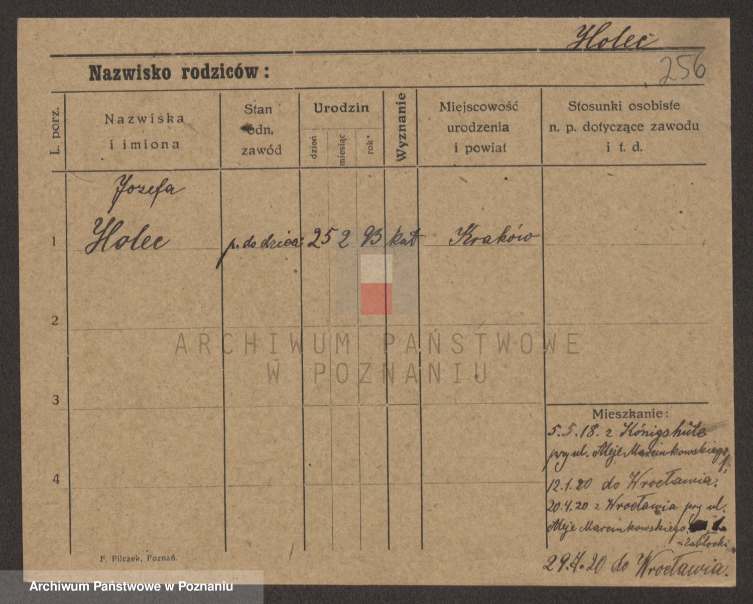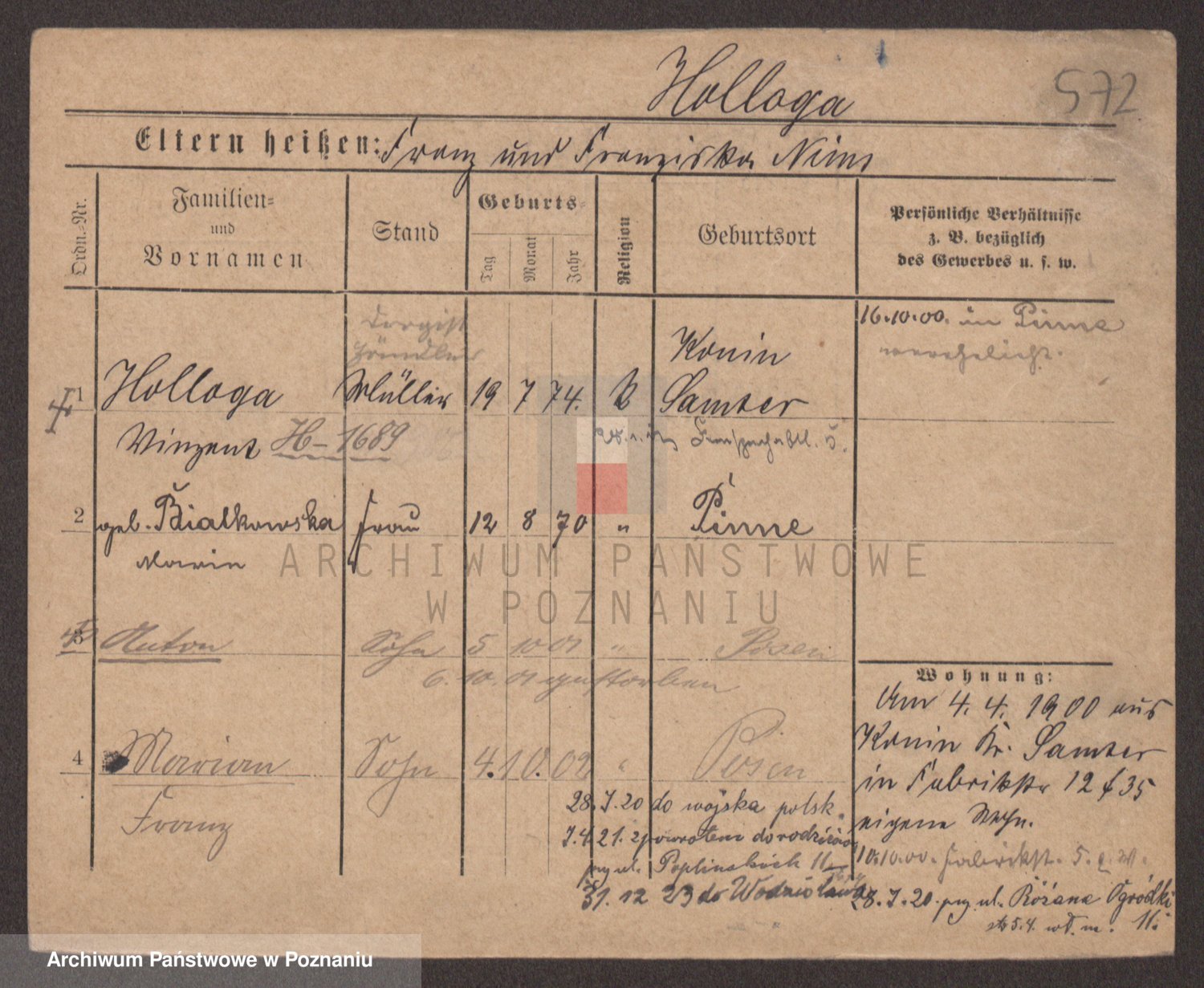 Podgląd karty osobowej dostępny jest po kliknięciu na nazwisko lub ikonkę karty. Można dokonywać powiększenia (ikony na górze) lub przechodzić między kolejnymi skanami (strzałki po bokach).