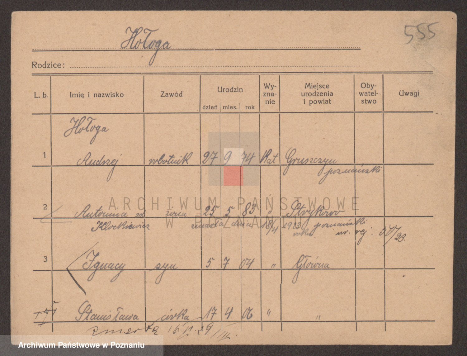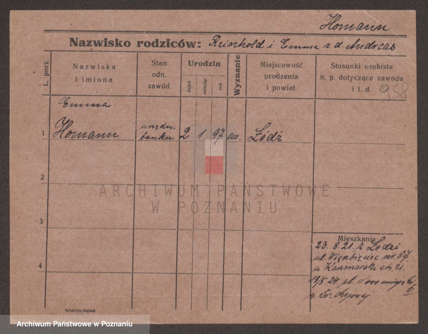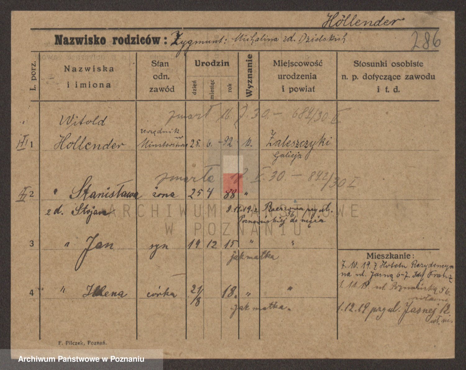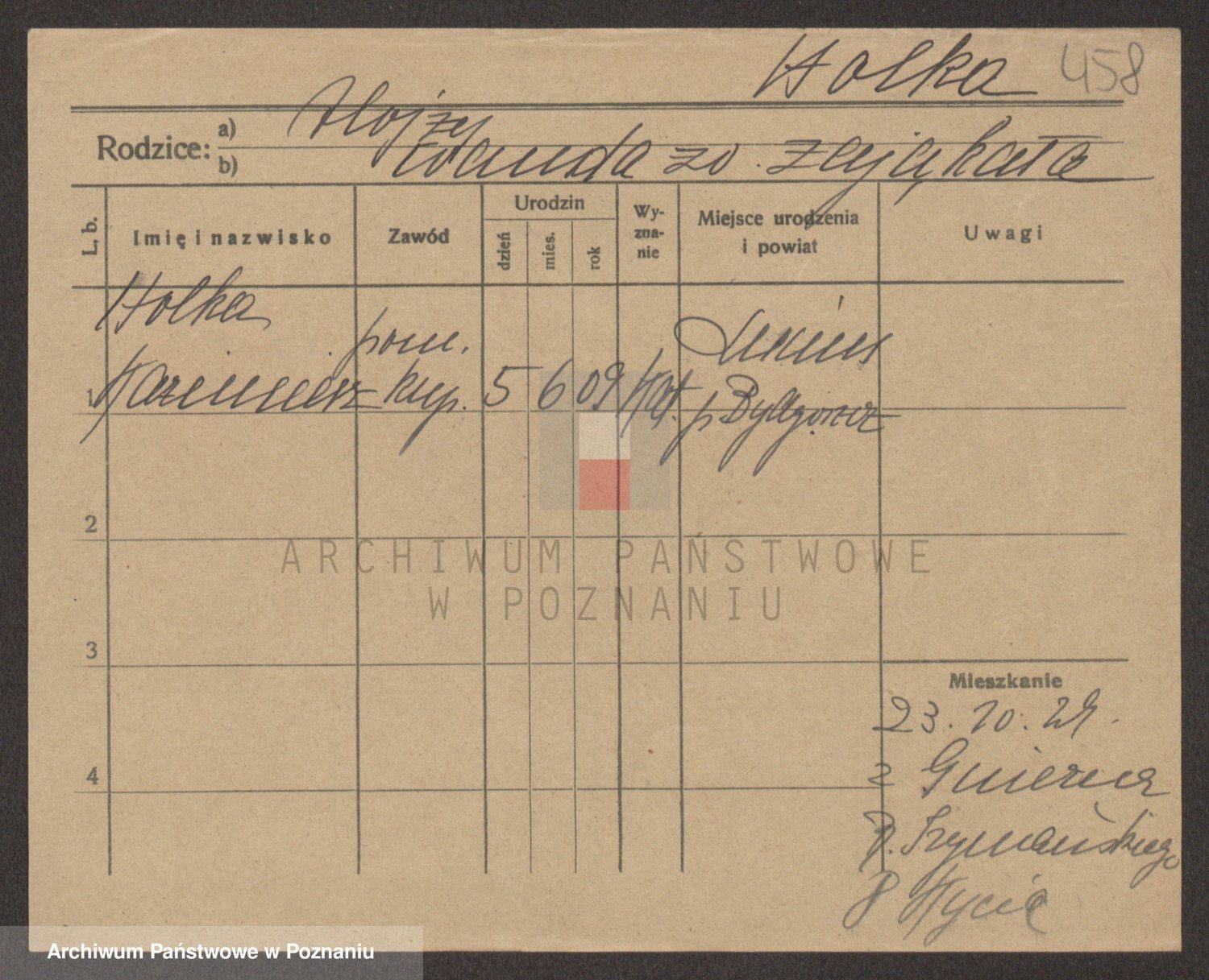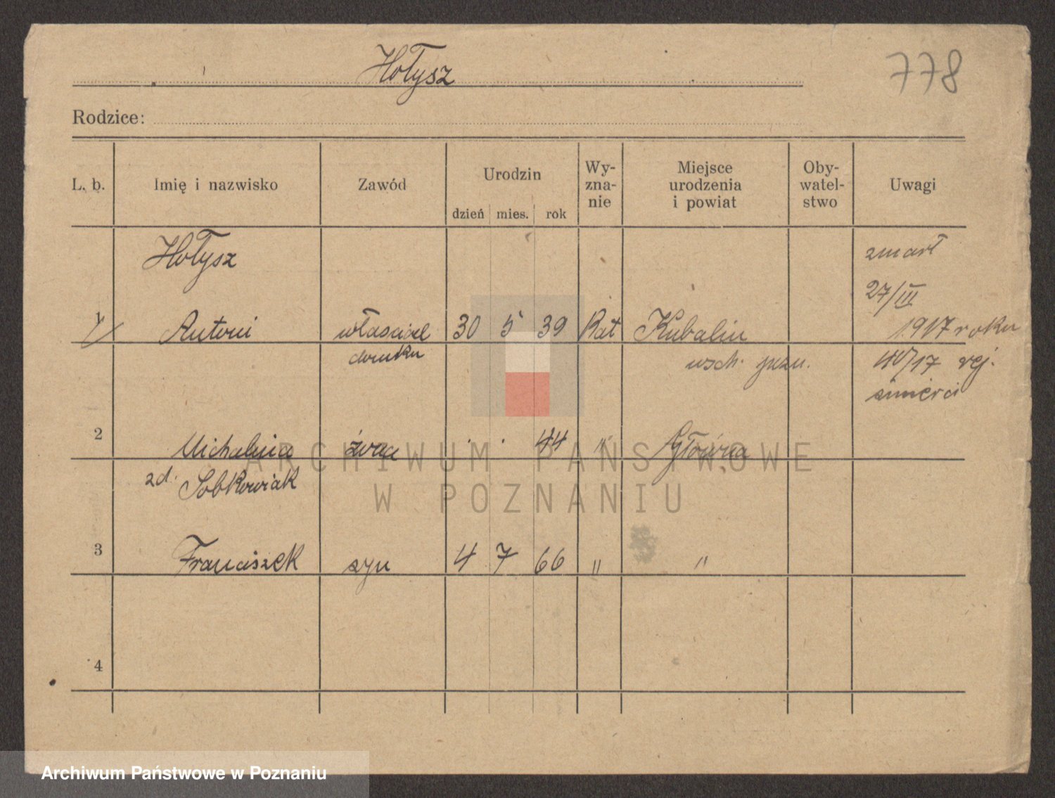 Podgląd karty osobowej dostępny jest po kliknięciu na nazwisko lub ikonkę karty. Można dokonywać powiększenia (ikony na górze) lub przechodzić między kolejnymi skanami (strzałki po bokach).