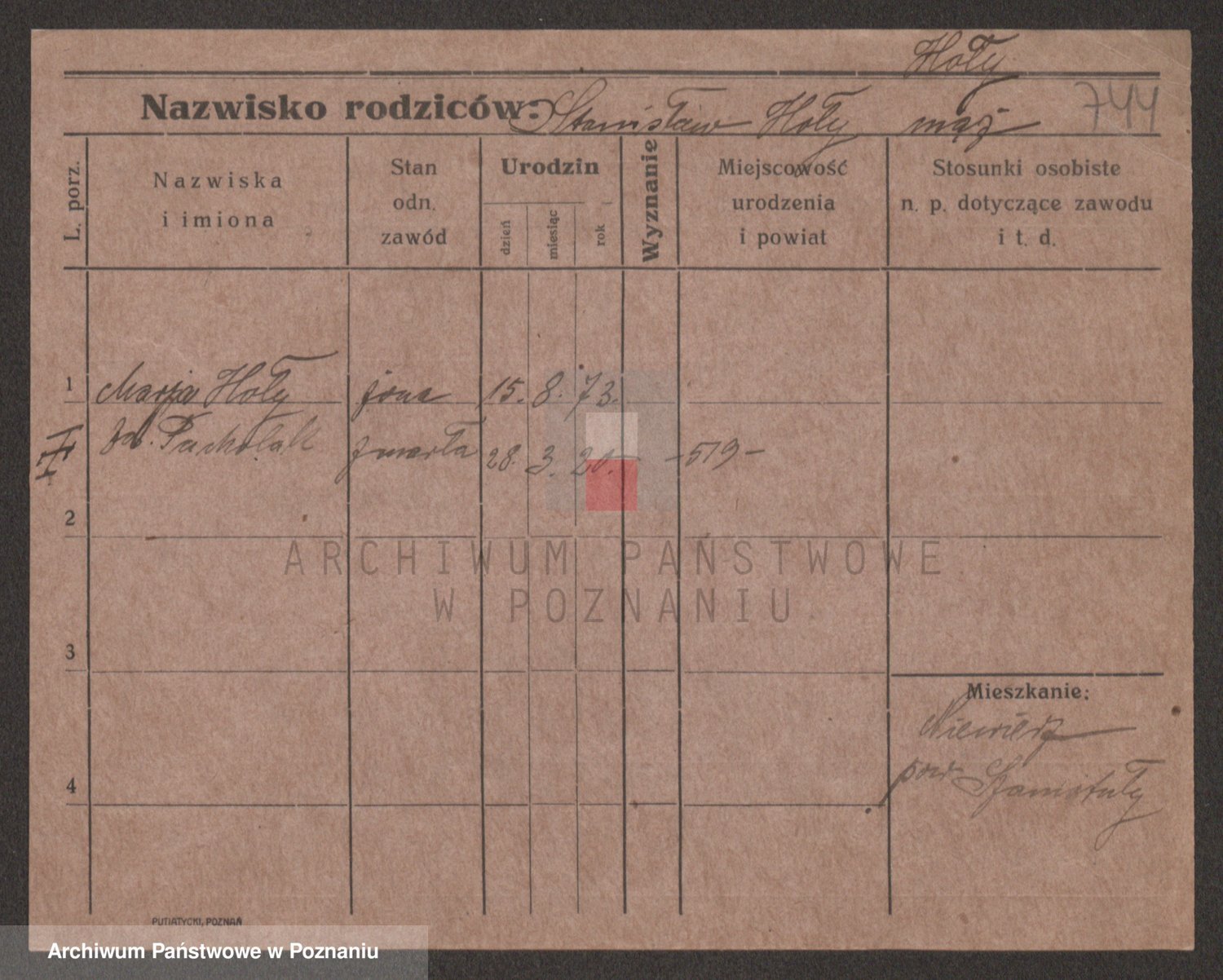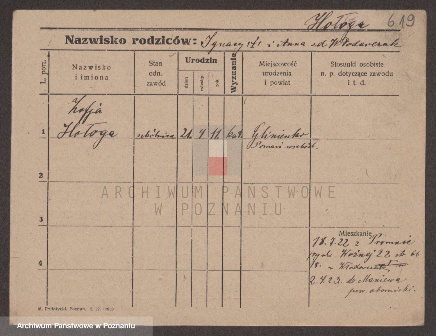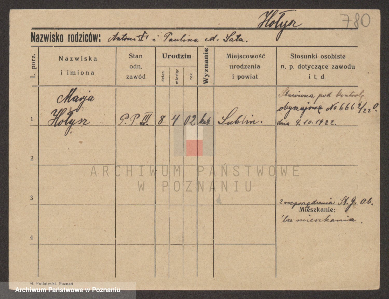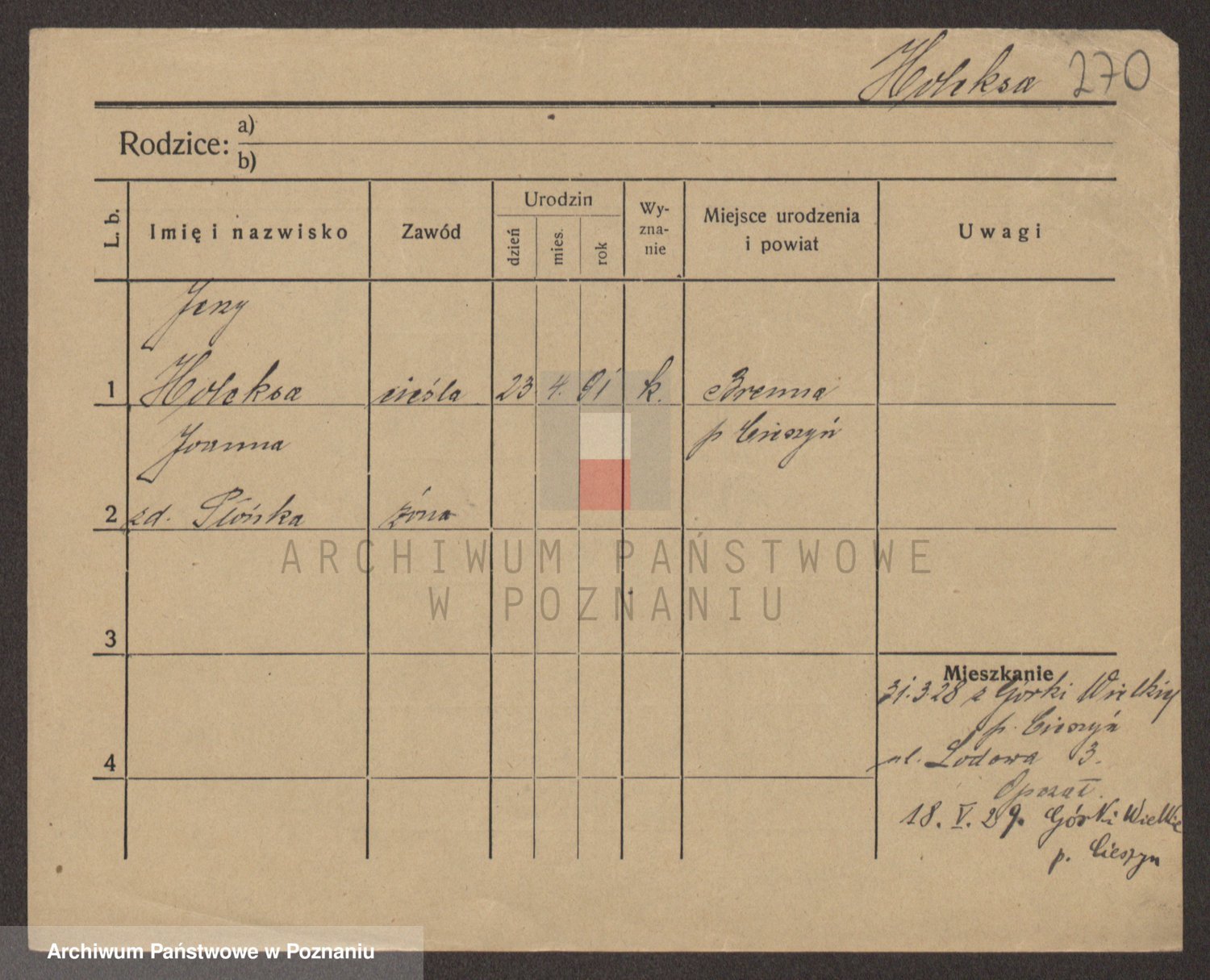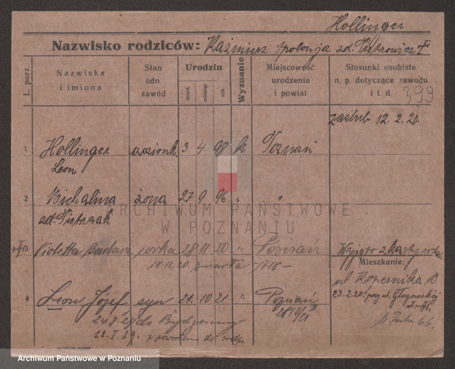 Podgląd karty osobowej dostępny jest po kliknięciu na nazwisko lub ikonkę karty. Można dokonywać powiększenia (ikony na górze) lub przechodzić między kolejnymi skanami (strzałki po bokach).