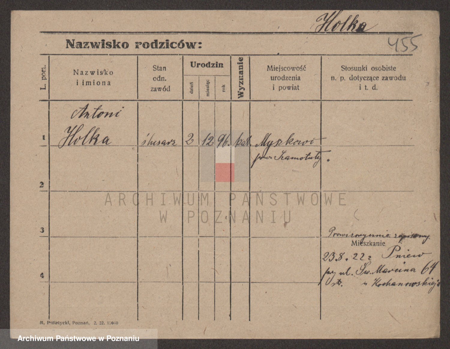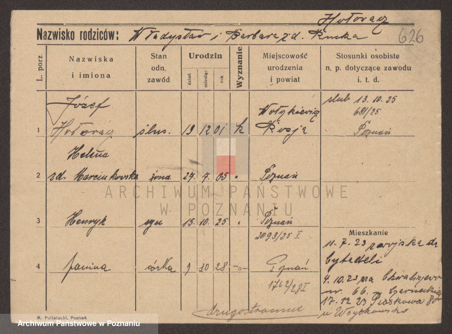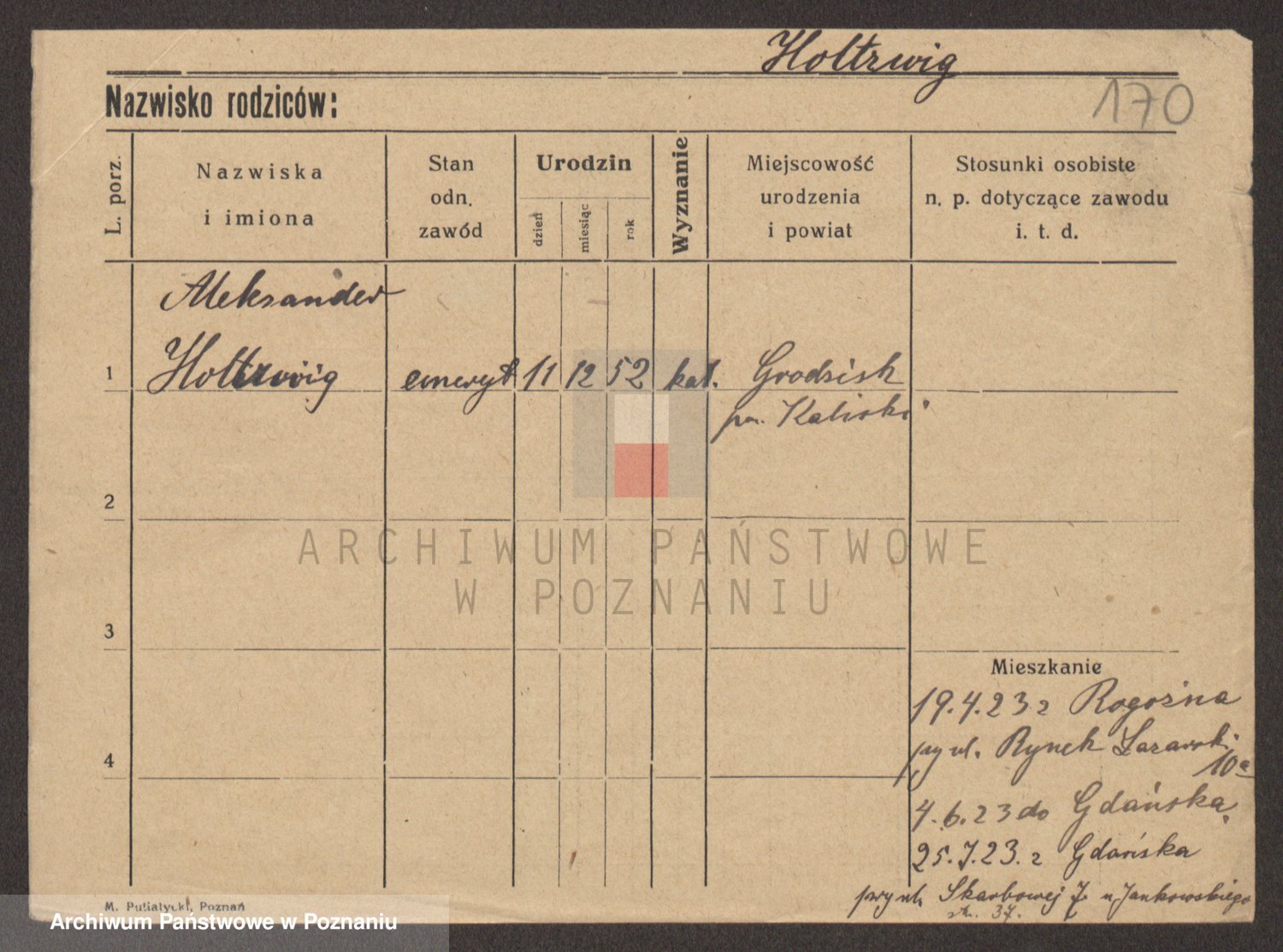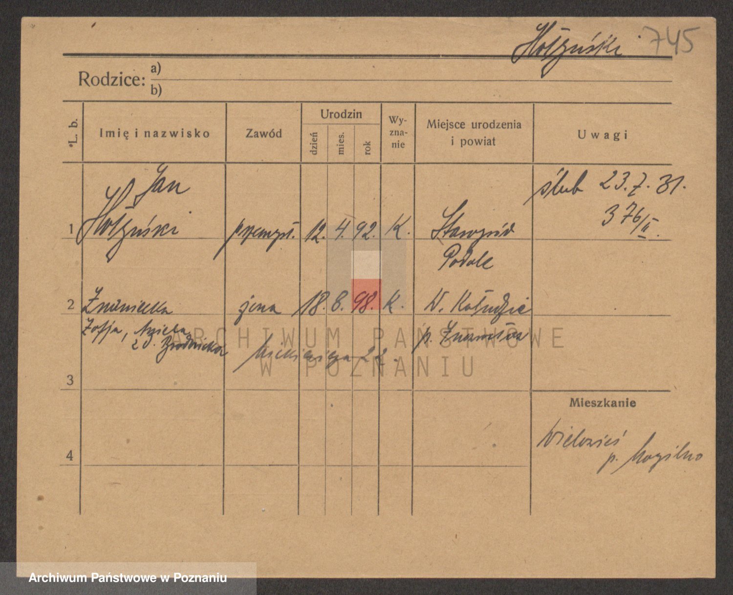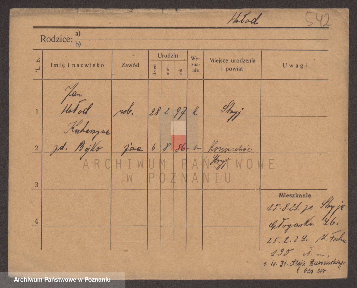 Podgląd karty osobowej dostępny jest po kliknięciu na nazwisko lub ikonkę karty. Można dokonywać powiększenia (ikony na górze) lub przechodzić między kolejnymi skanami (strzałki po bokach).
