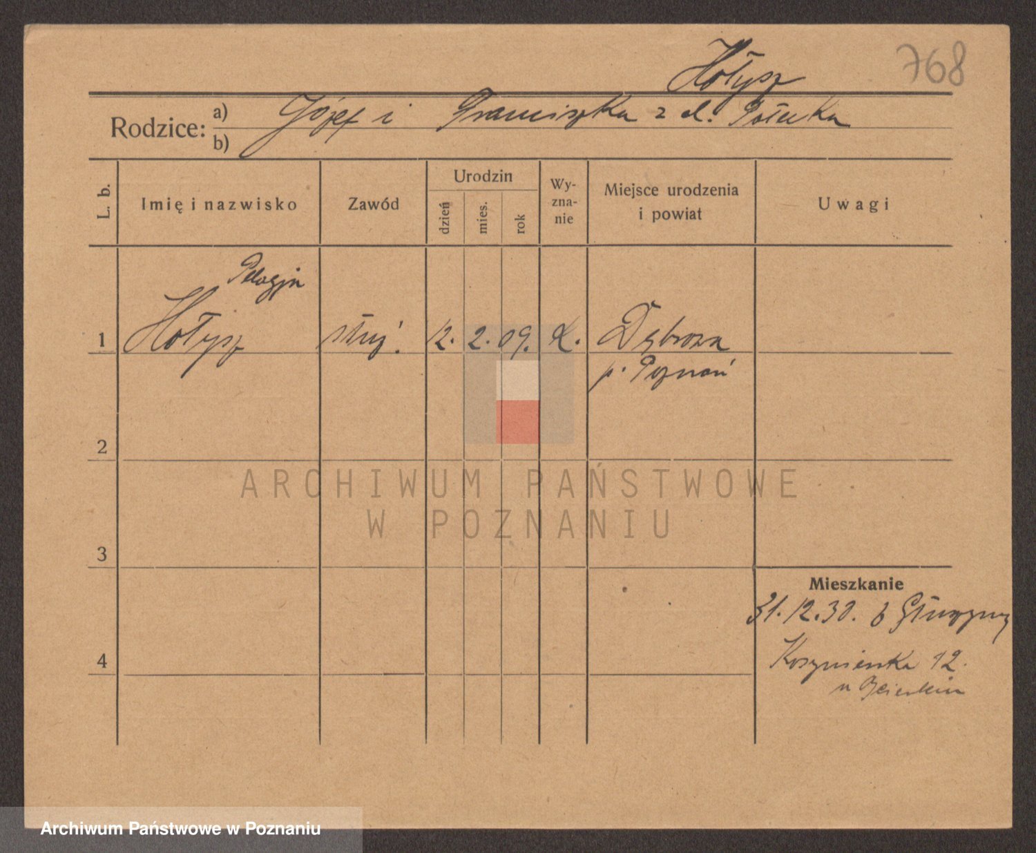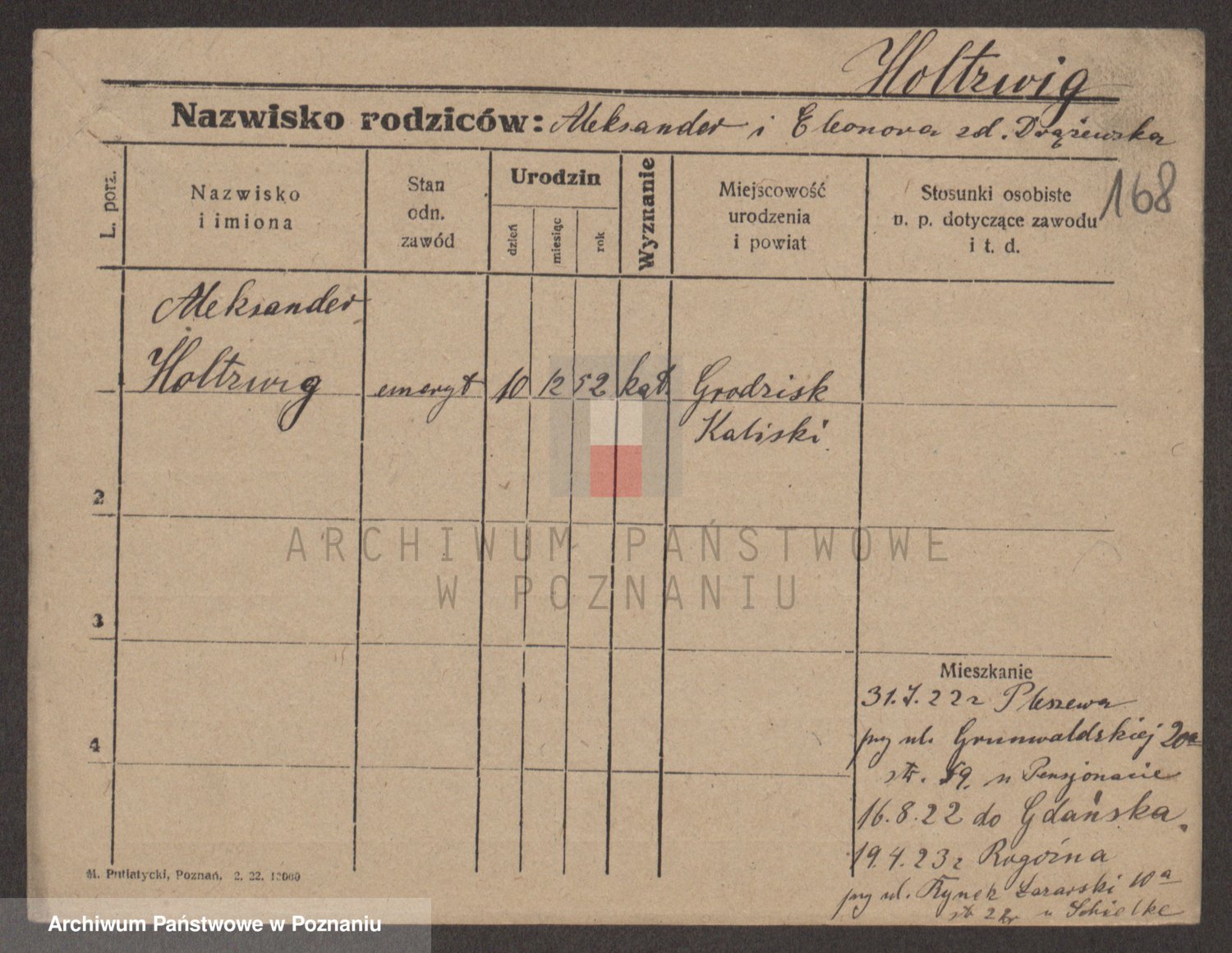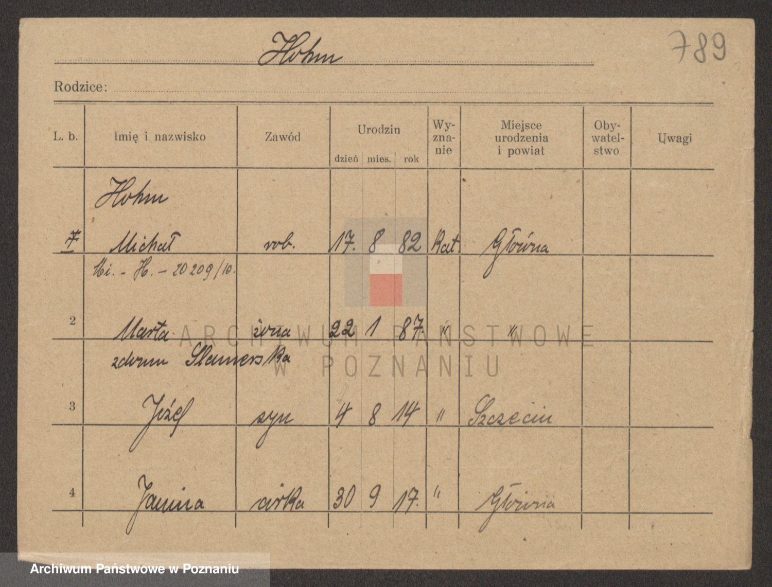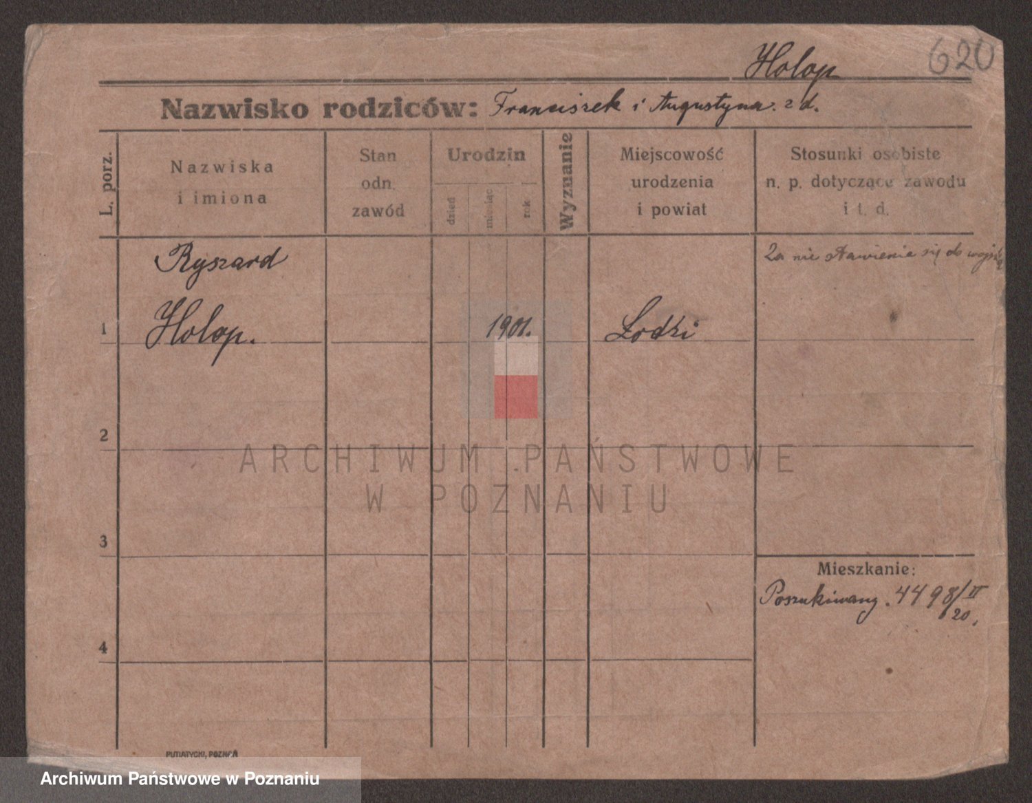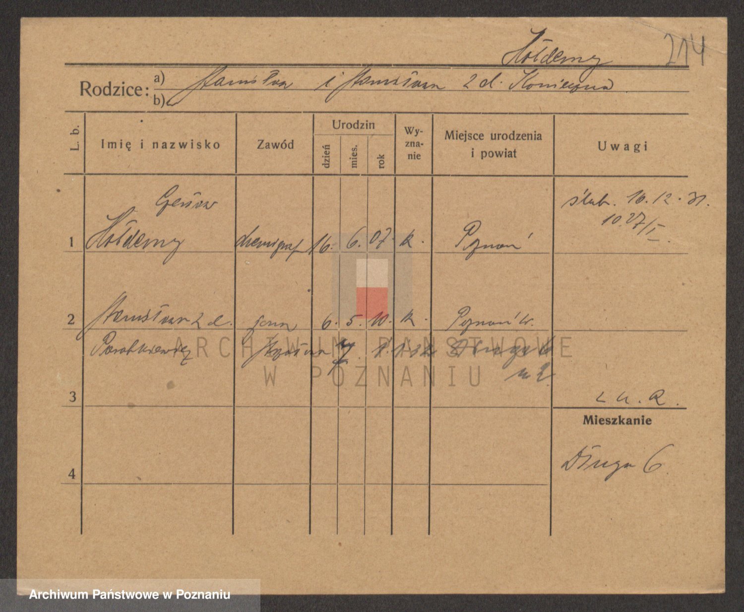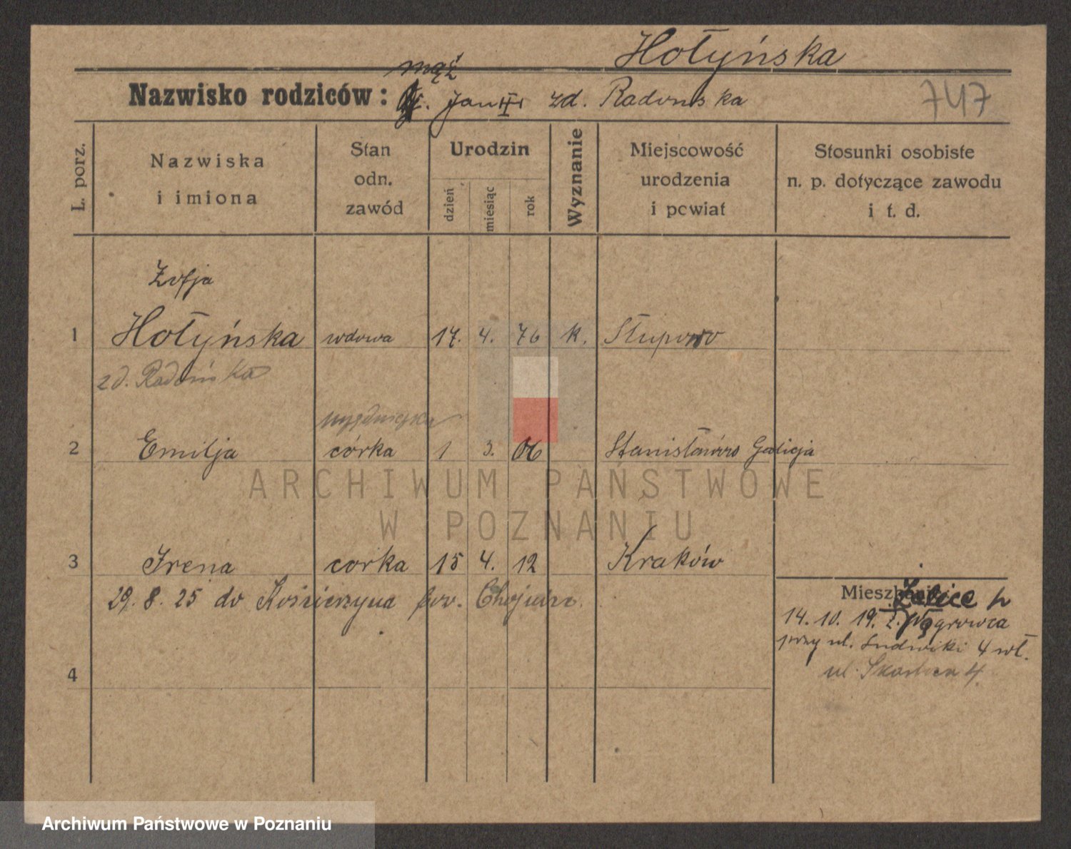 Podgląd karty osobowej dostępny jest po kliknięciu na nazwisko lub ikonkę karty. Można dokonywać powiększenia (ikony na górze) lub przechodzić między kolejnymi skanami (strzałki po bokach).
