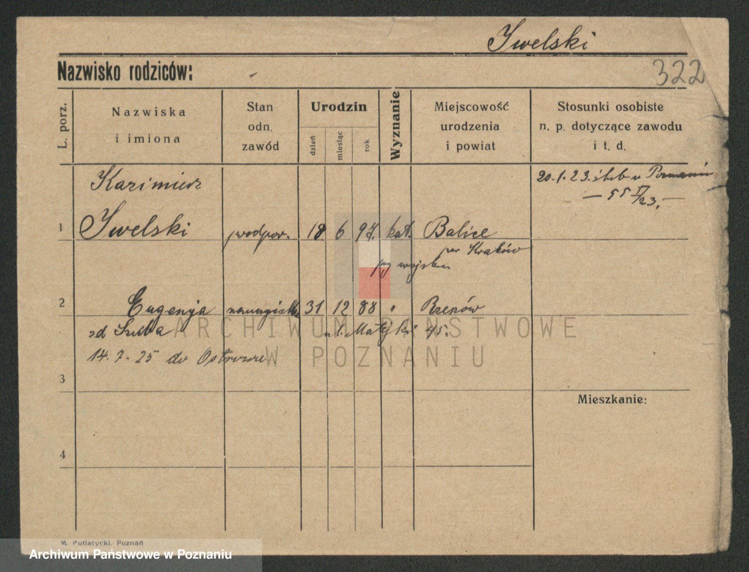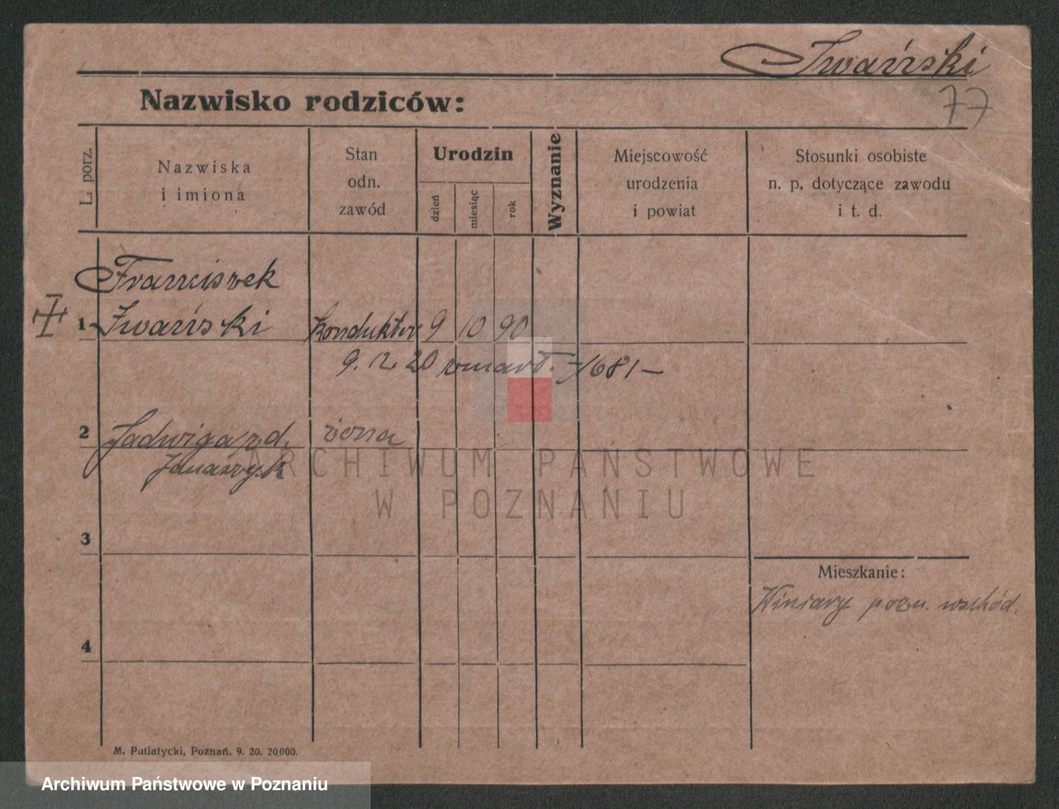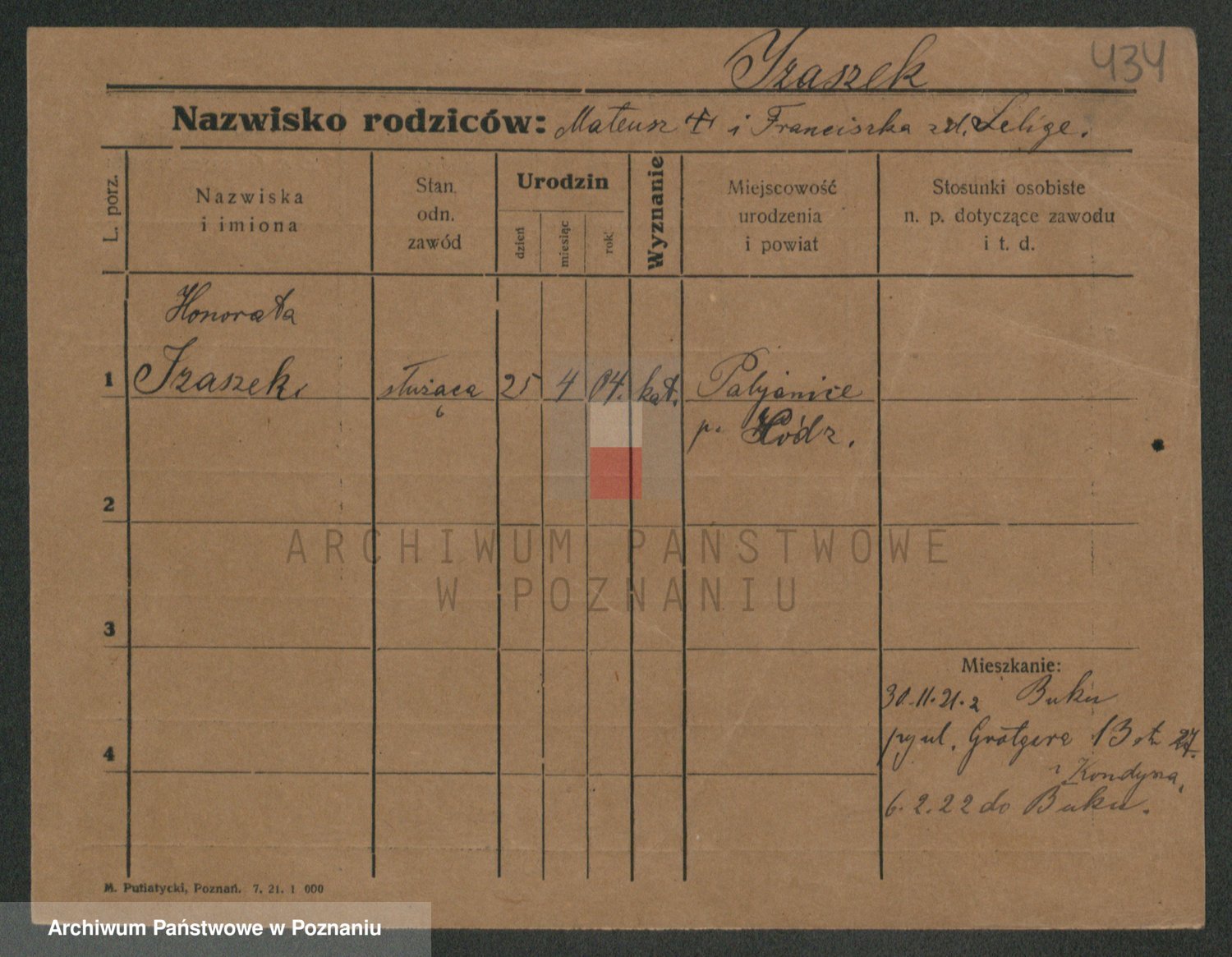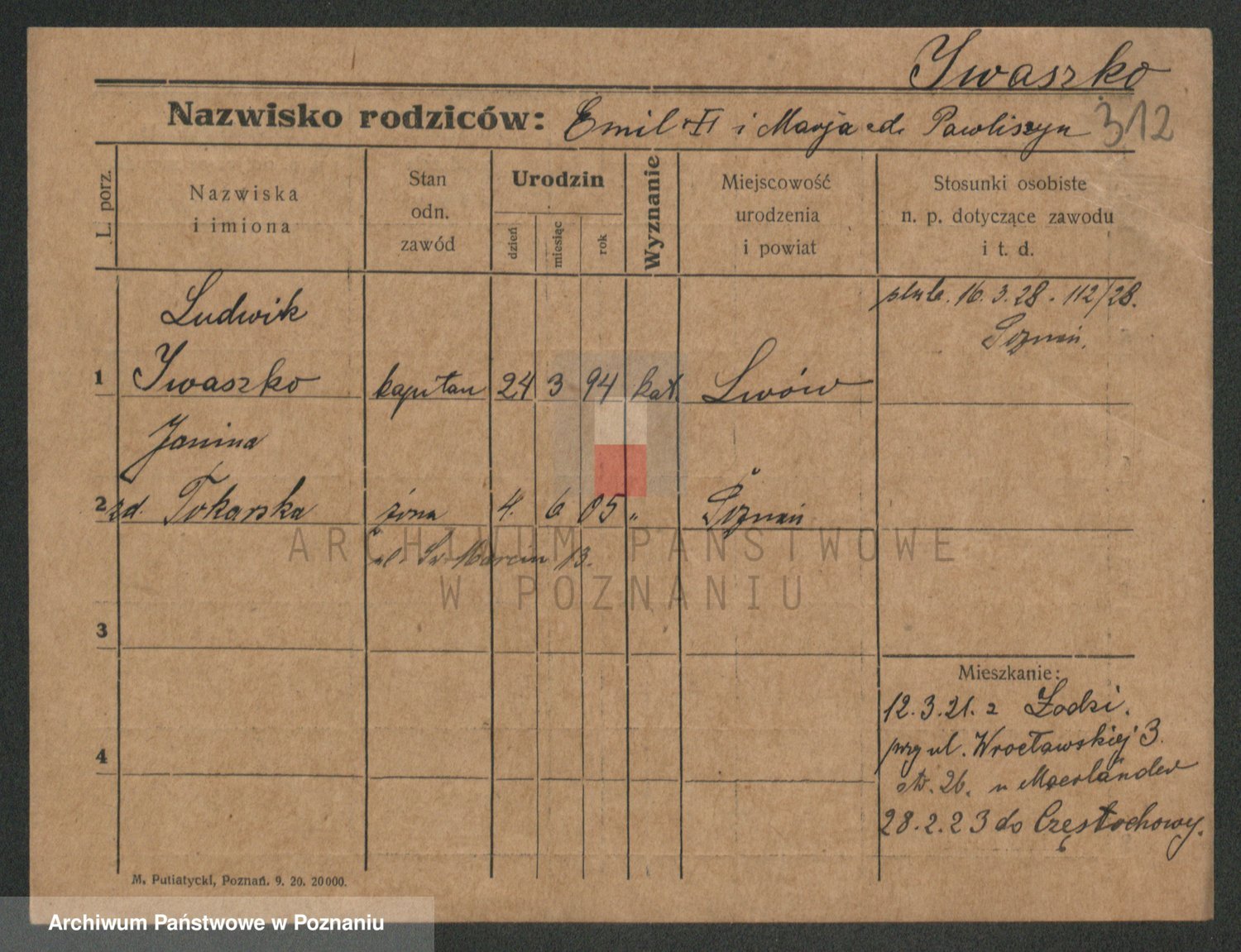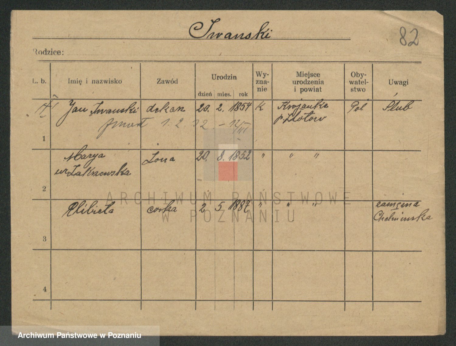 Podgląd karty osobowej dostępny jest po kliknięciu na nazwisko lub ikonkę karty. Można dokonywać powiększenia (ikony na górze) lub przechodzić między kolejnymi skanami (strzałki po bokach).