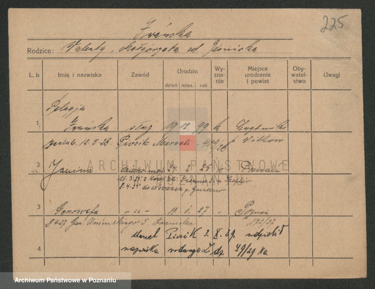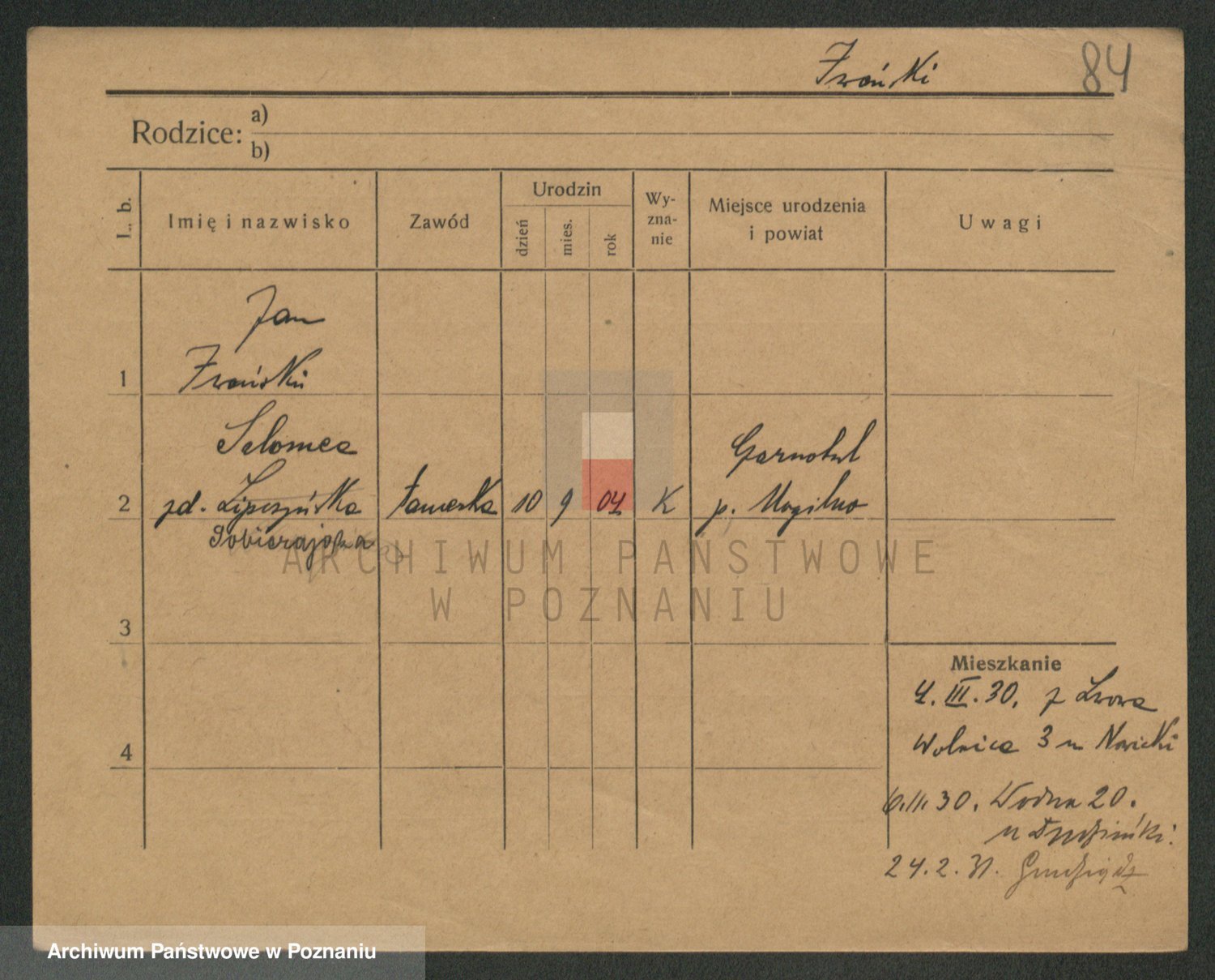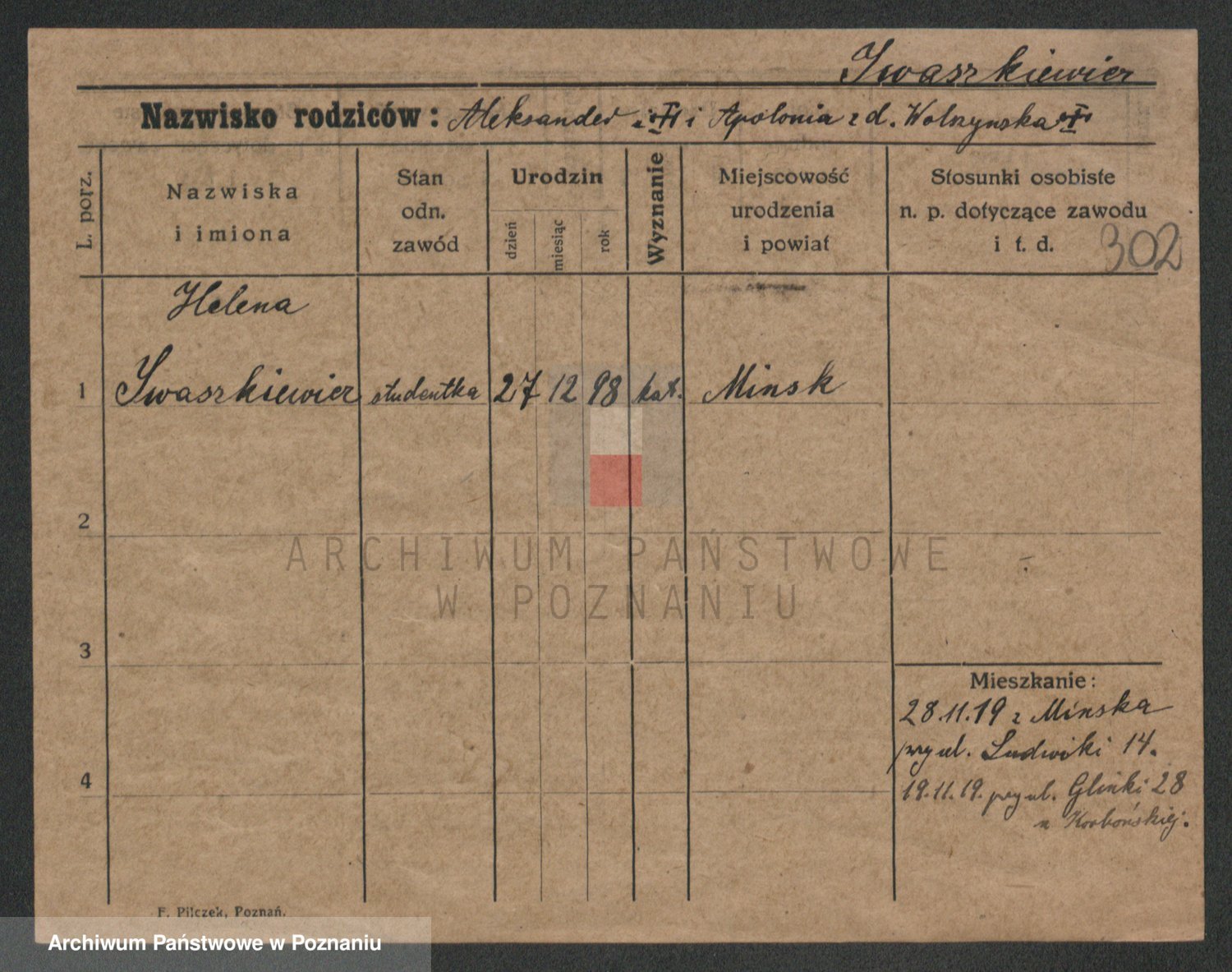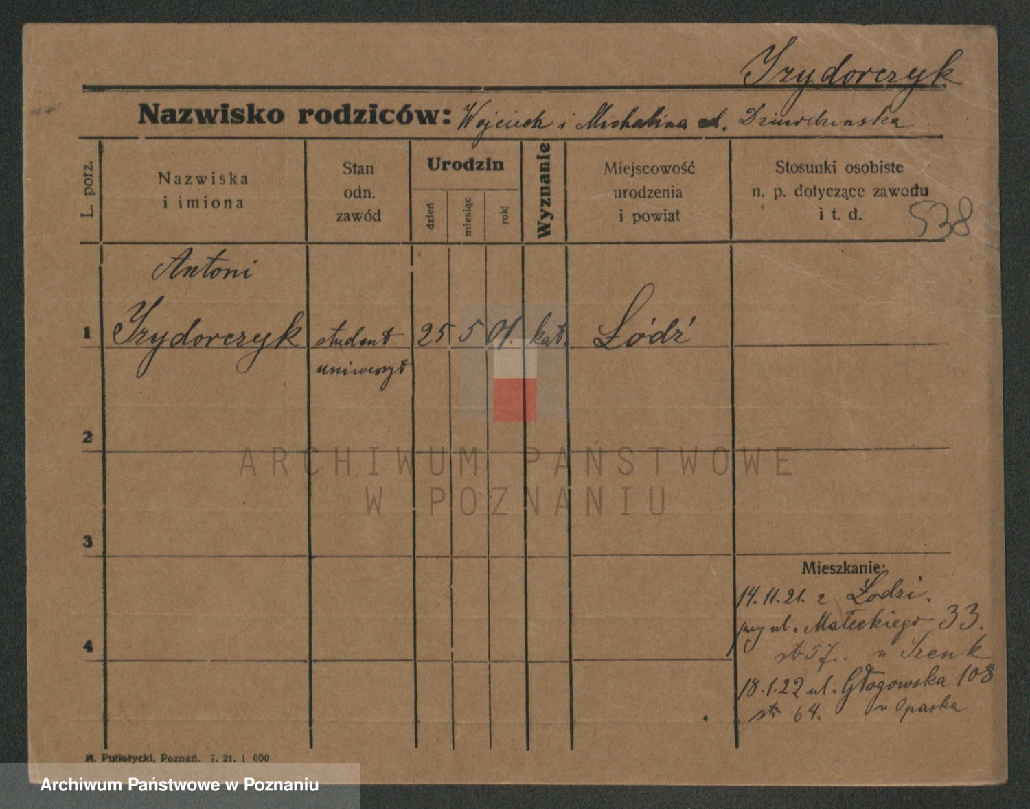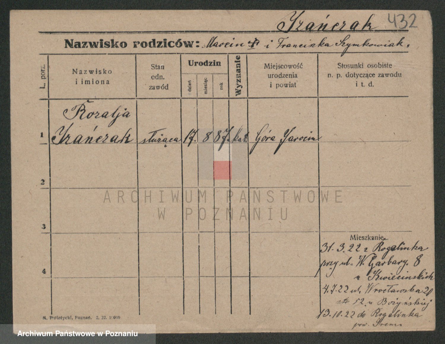 Podgląd karty osobowej dostępny jest po kliknięciu na nazwisko lub ikonkę karty. Można dokonywać powiększenia (ikony na górze) lub przechodzić między kolejnymi skanami (strzałki po bokach).