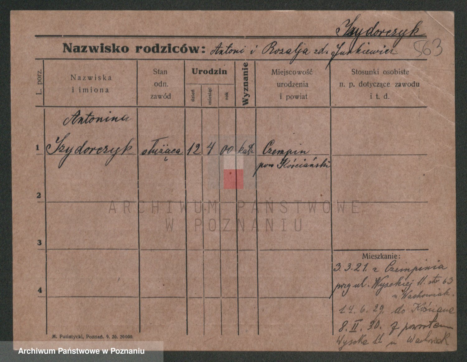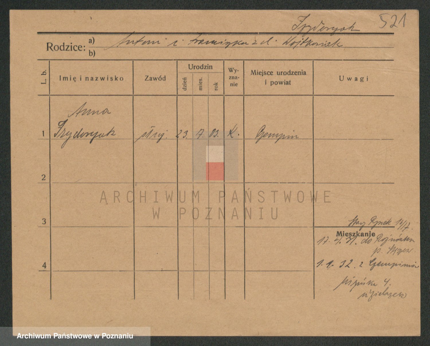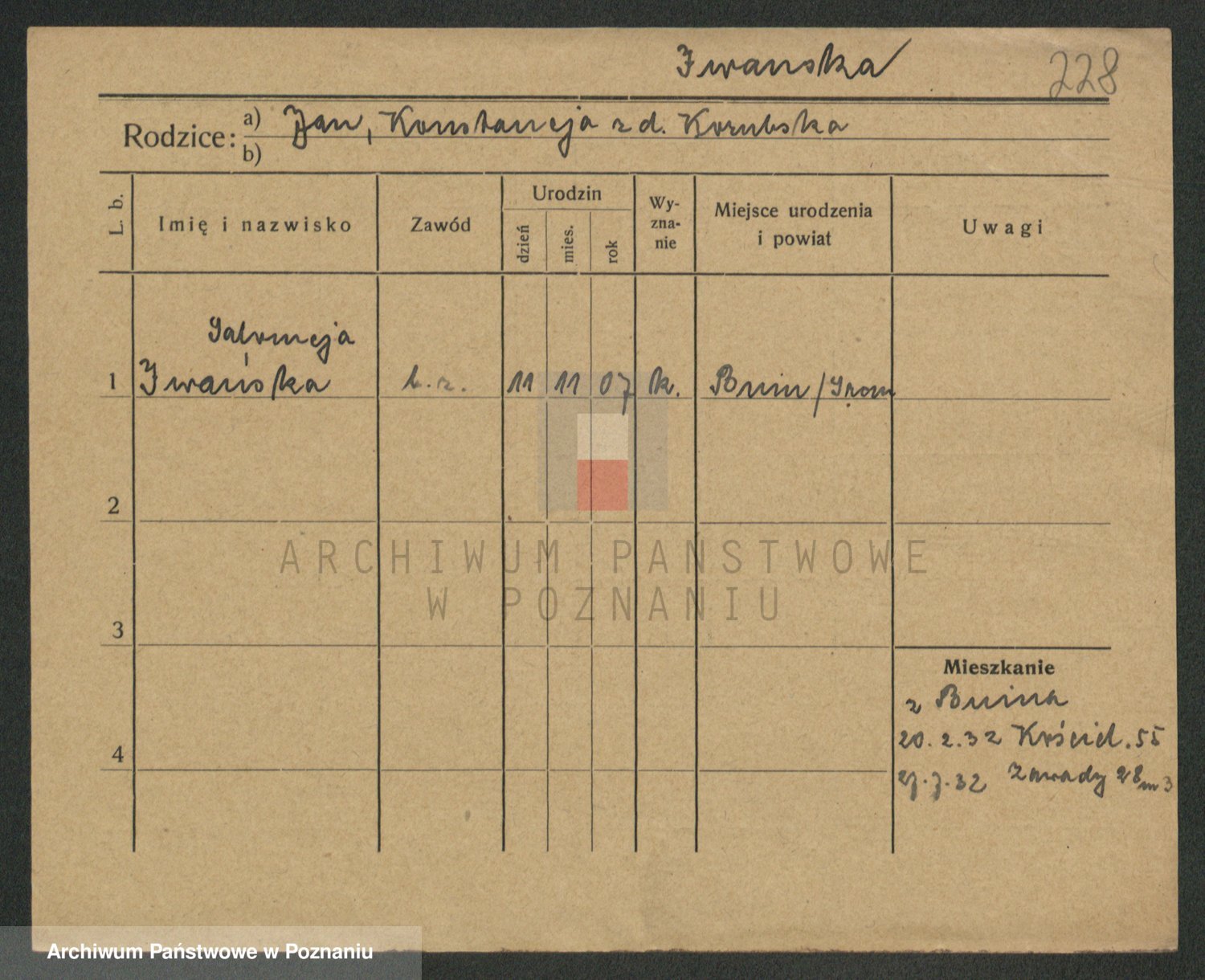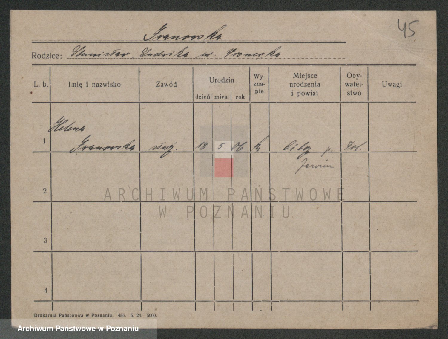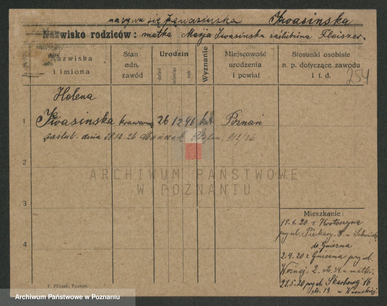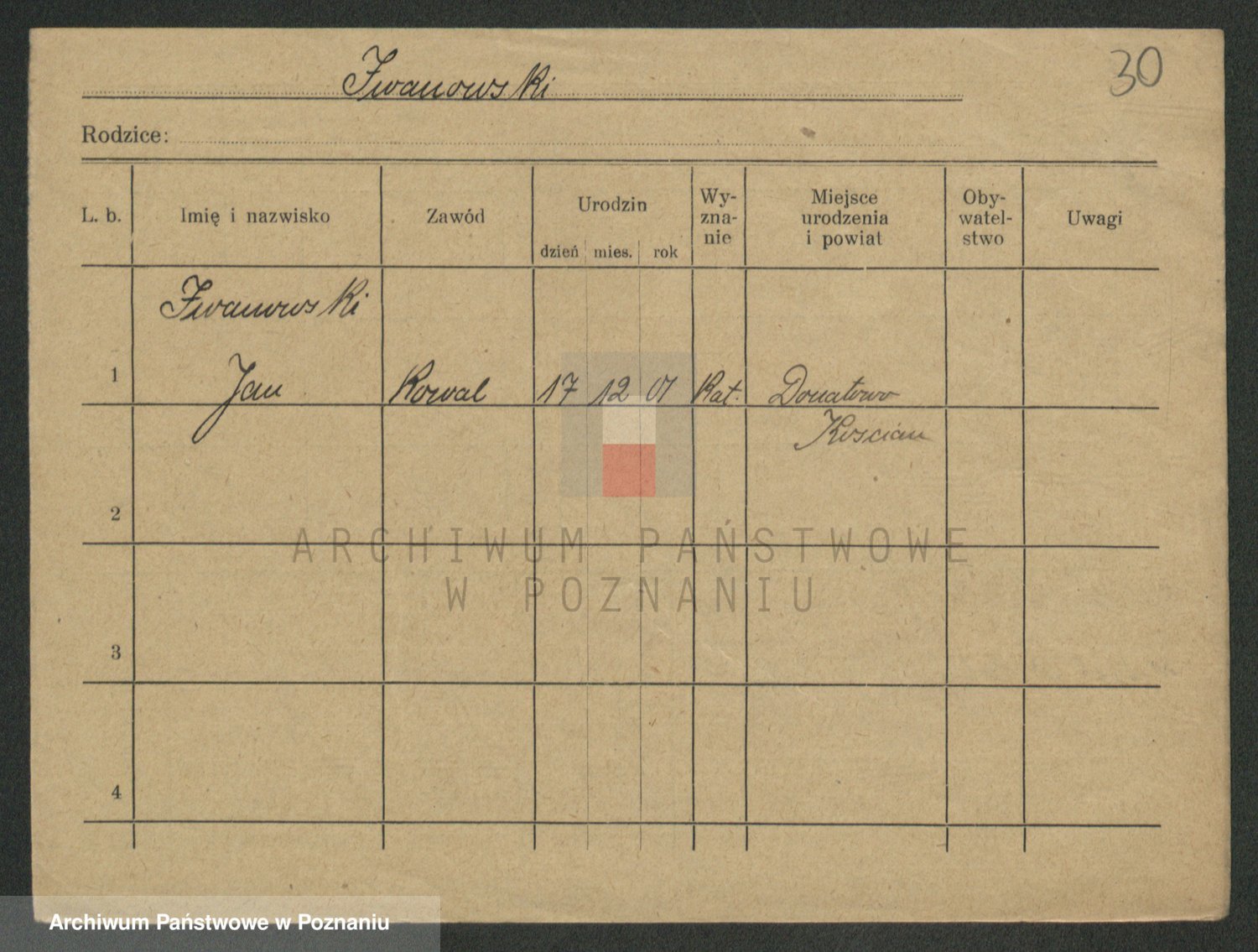 Podgląd karty osobowej dostępny jest po kliknięciu na nazwisko lub ikonkę karty. Można dokonywać powiększenia (ikony na górze) lub przechodzić między kolejnymi skanami (strzałki po bokach).