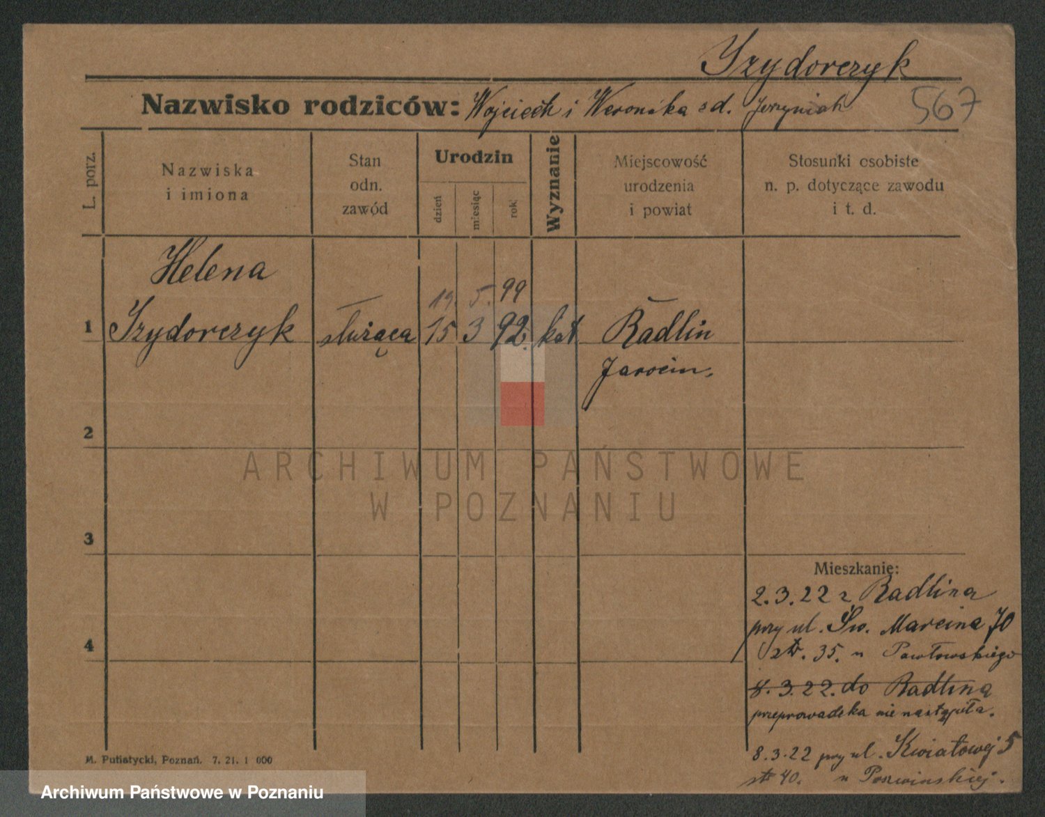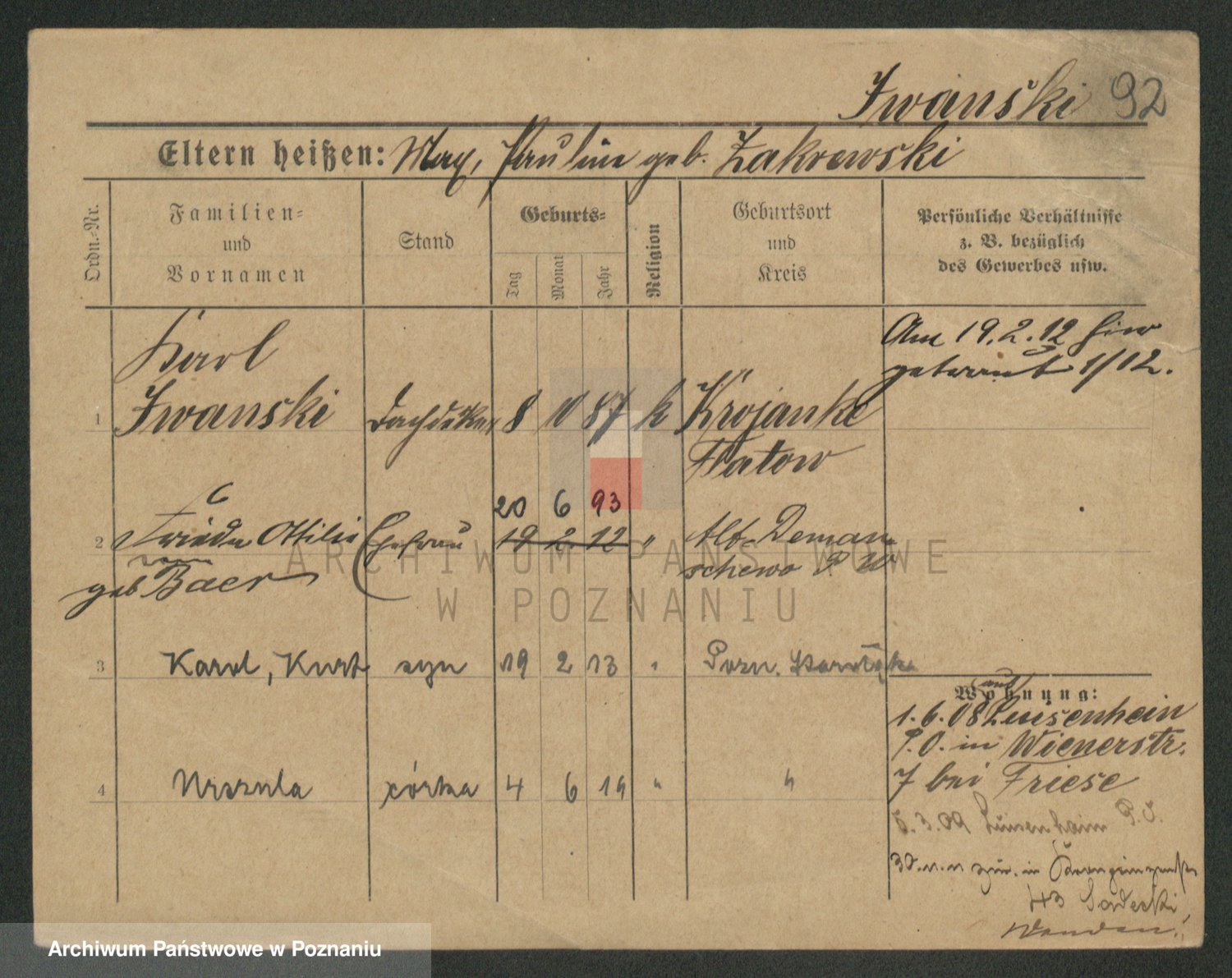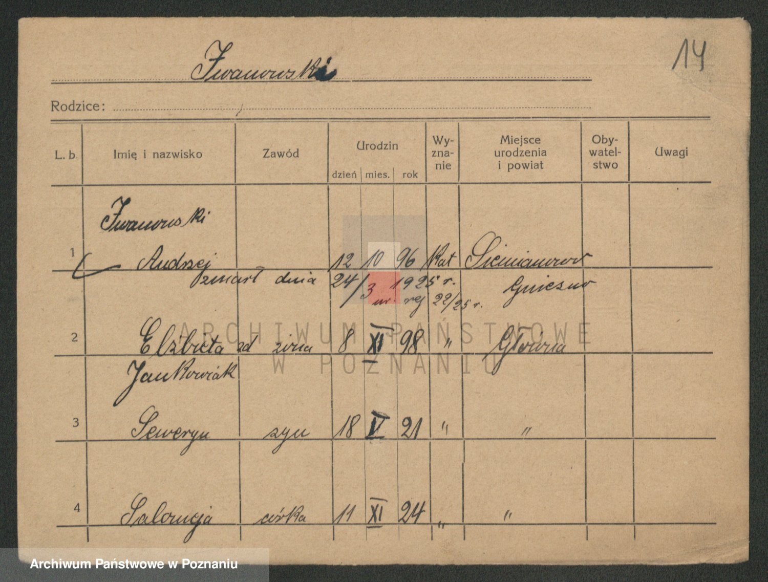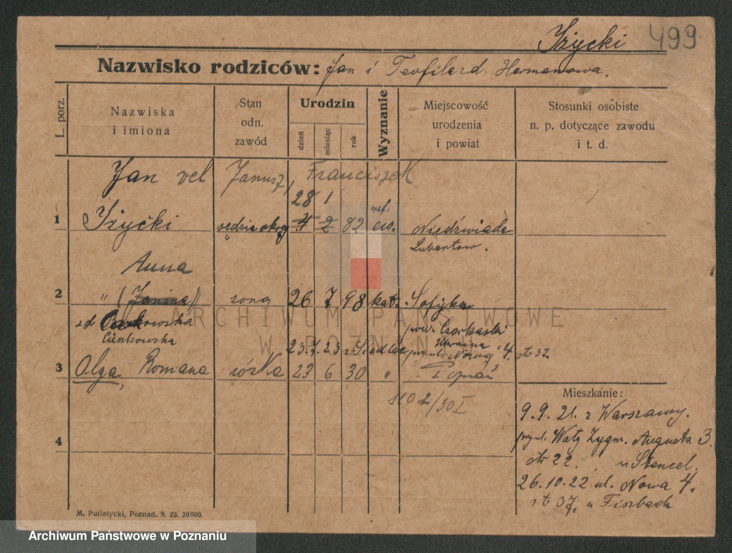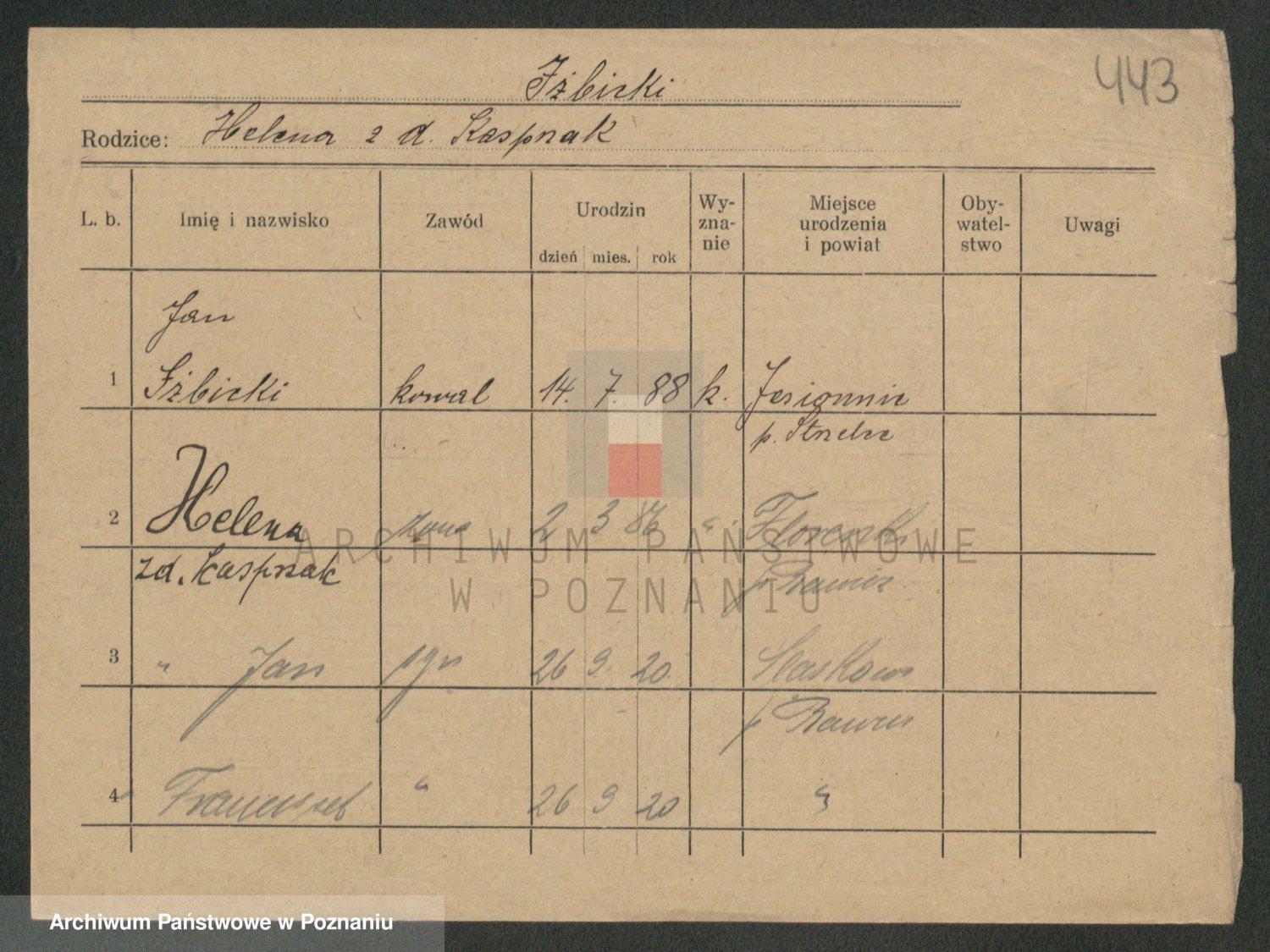 Podgląd karty osobowej dostępny jest po kliknięciu na nazwisko lub ikonkę karty. Można dokonywać powiększenia (ikony na górze) lub przechodzić między kolejnymi skanami (strzałki po bokach).