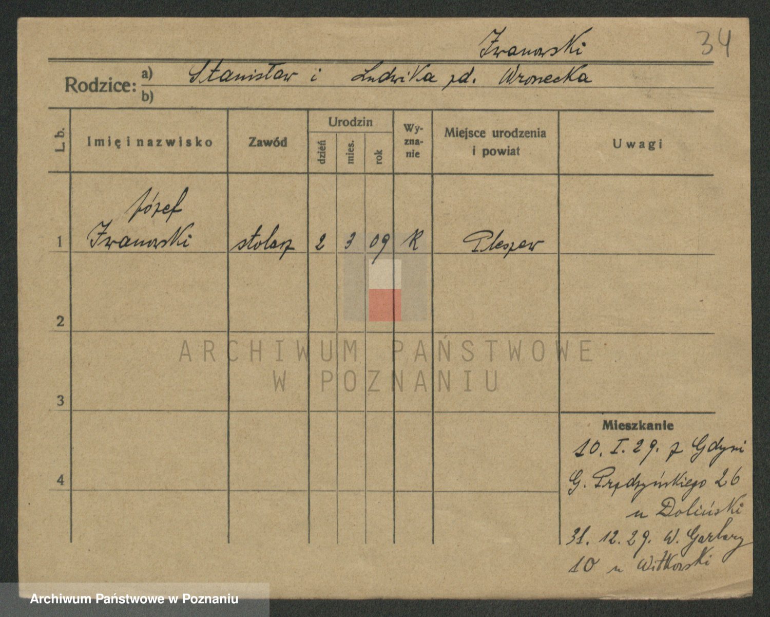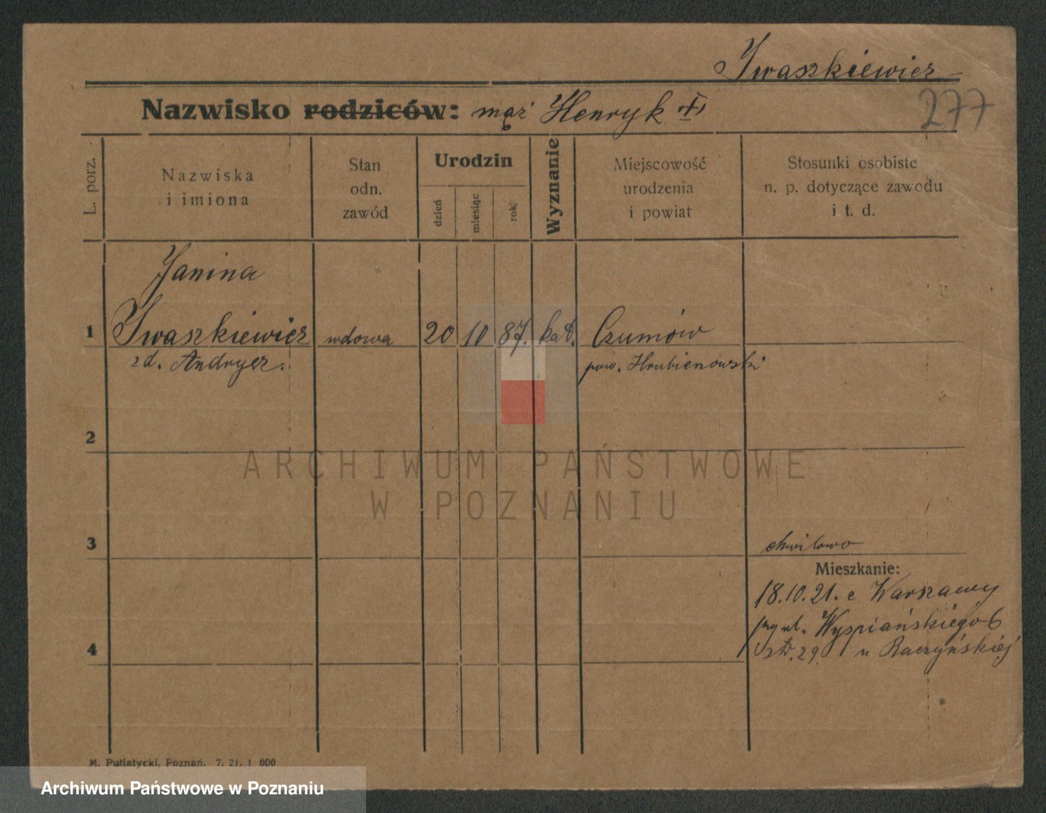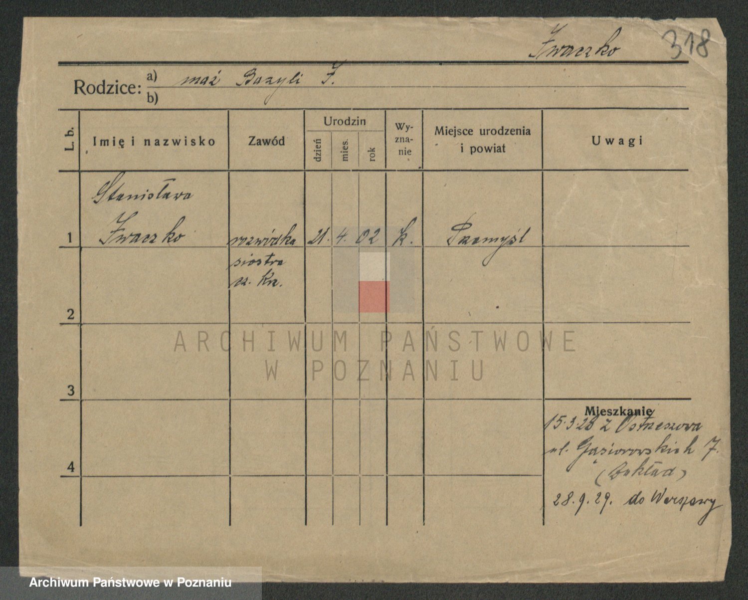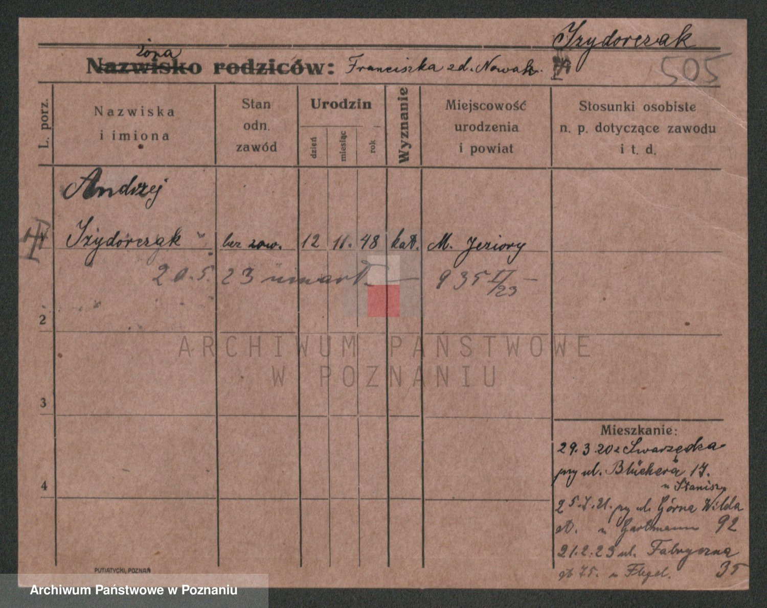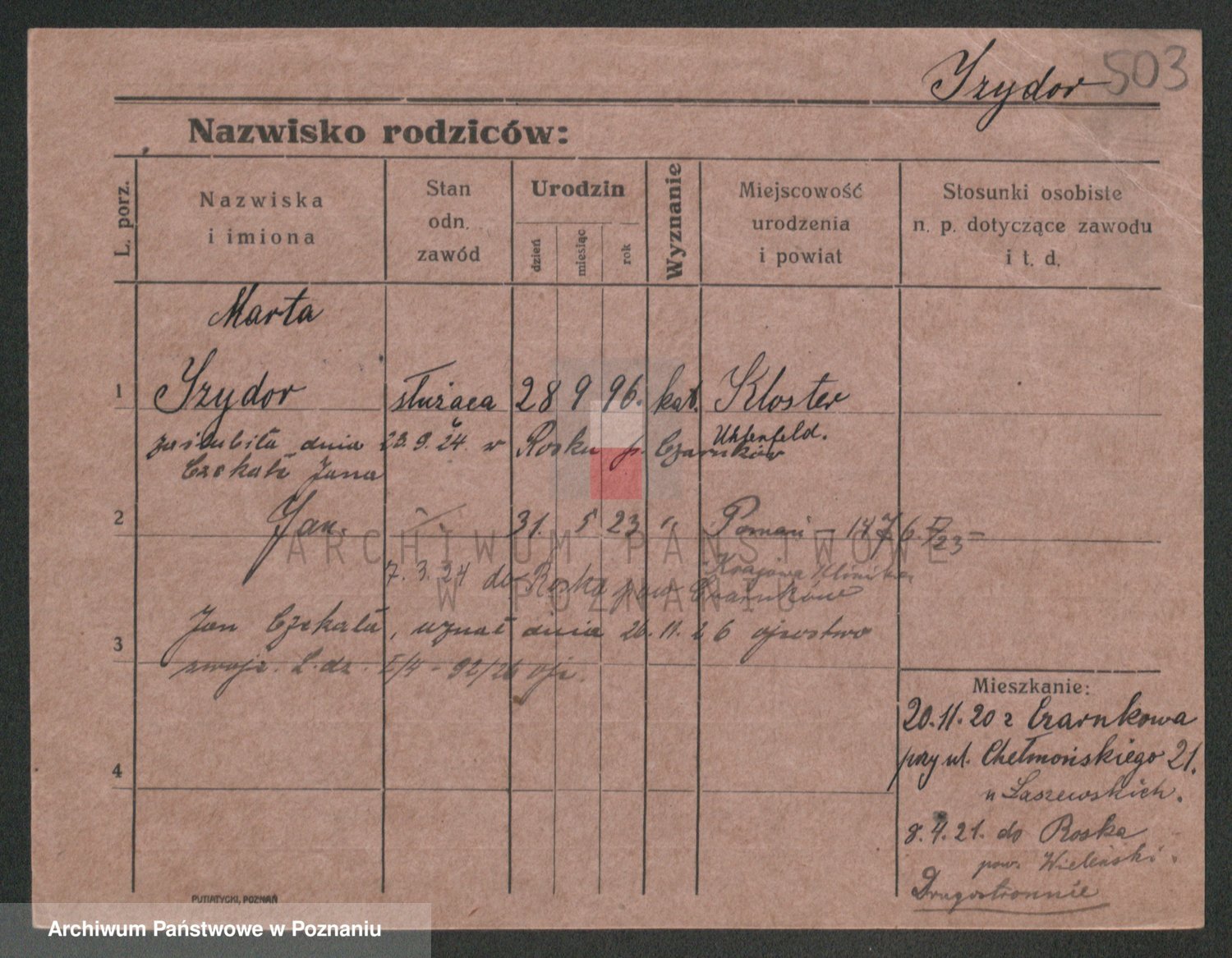 Podgląd karty osobowej dostępny jest po kliknięciu na nazwisko lub ikonkę karty. Można dokonywać powiększenia (ikony na górze) lub przechodzić między kolejnymi skanami (strzałki po bokach).