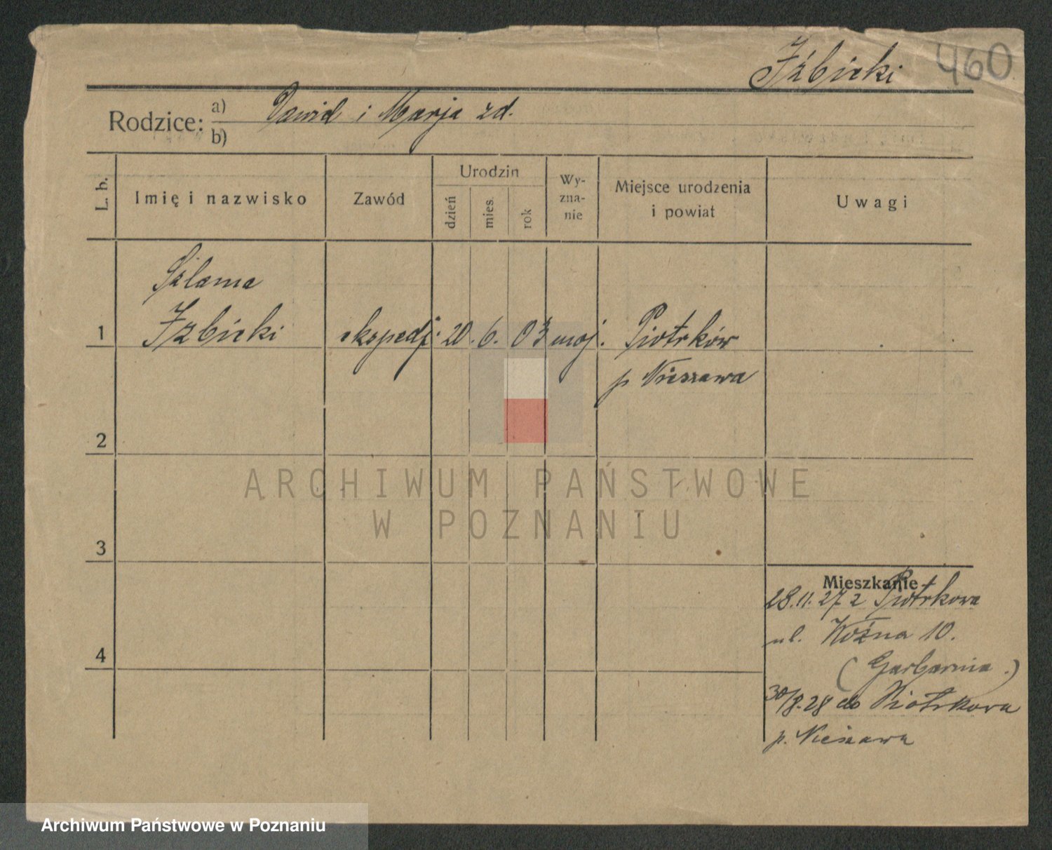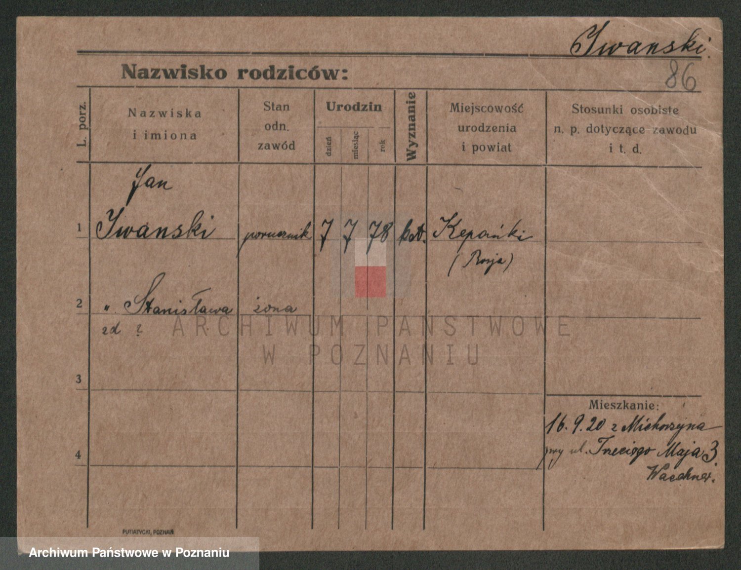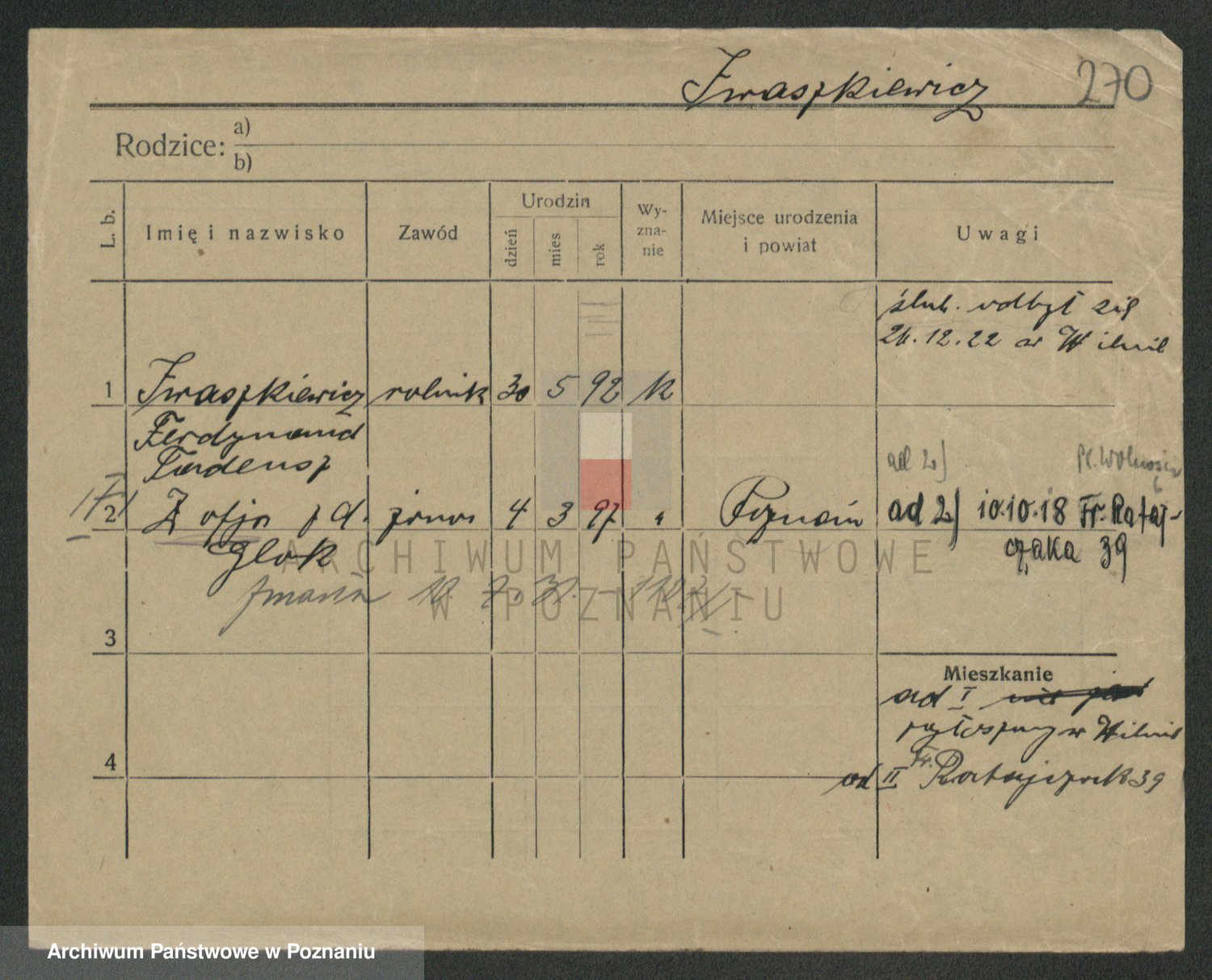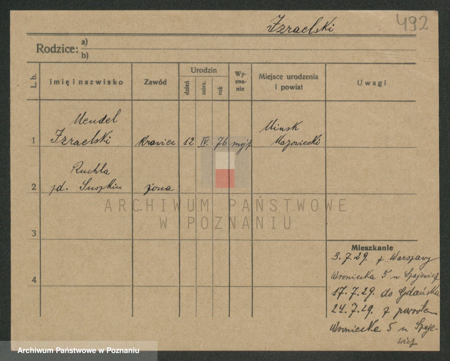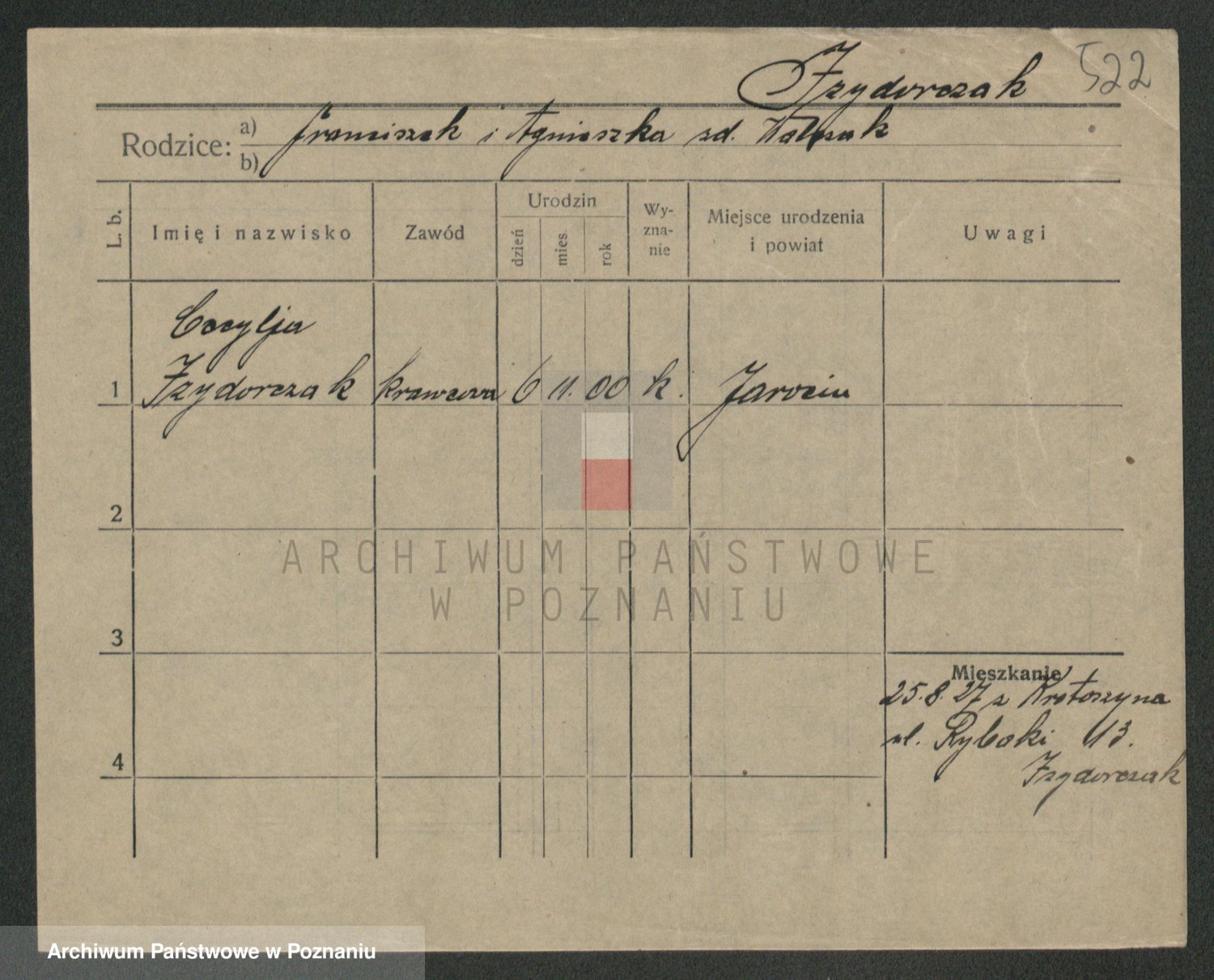 Podgląd karty osobowej dostępny jest po kliknięciu na nazwisko lub ikonkę karty. Można dokonywać powiększenia (ikony na górze) lub przechodzić między kolejnymi skanami (strzałki po bokach).