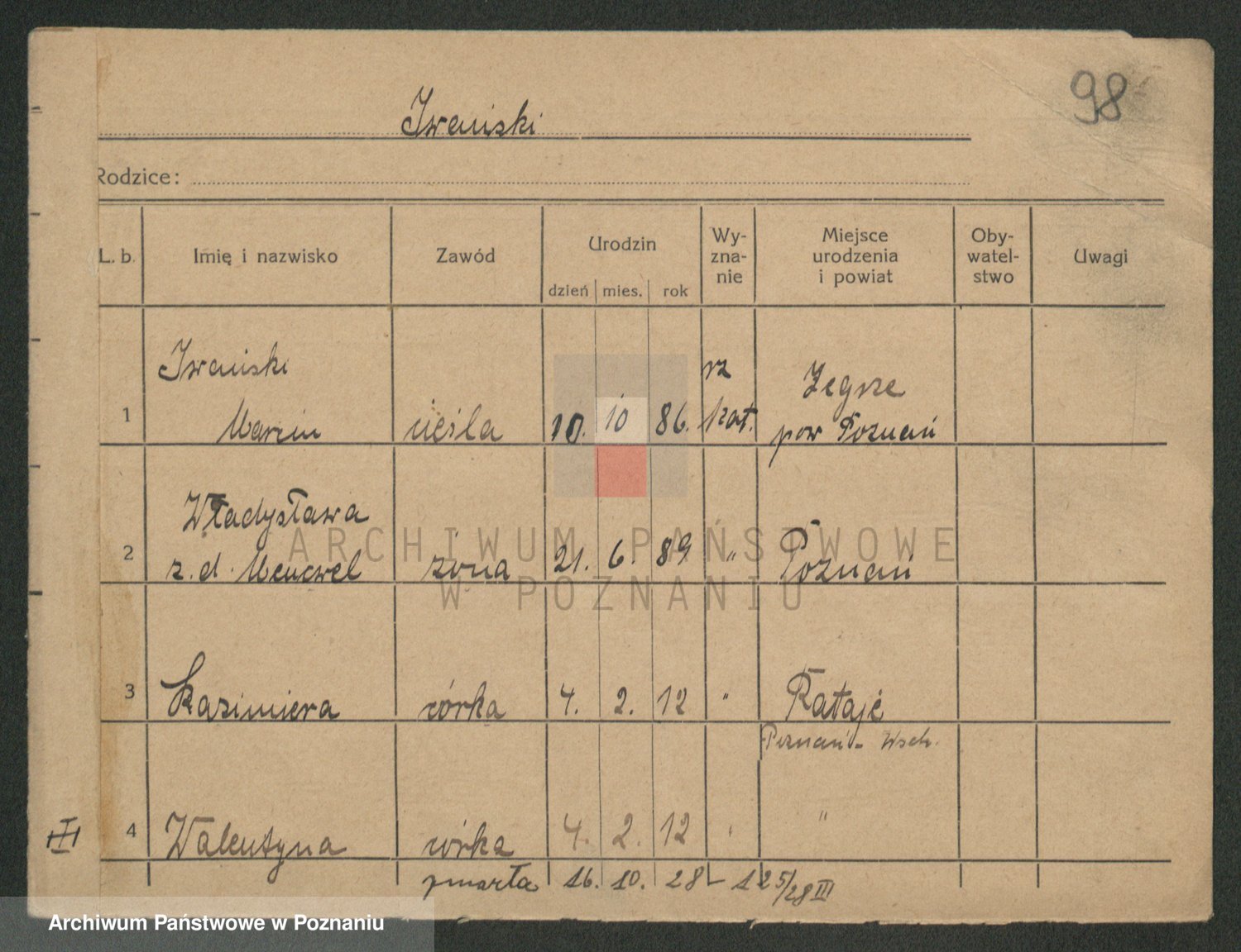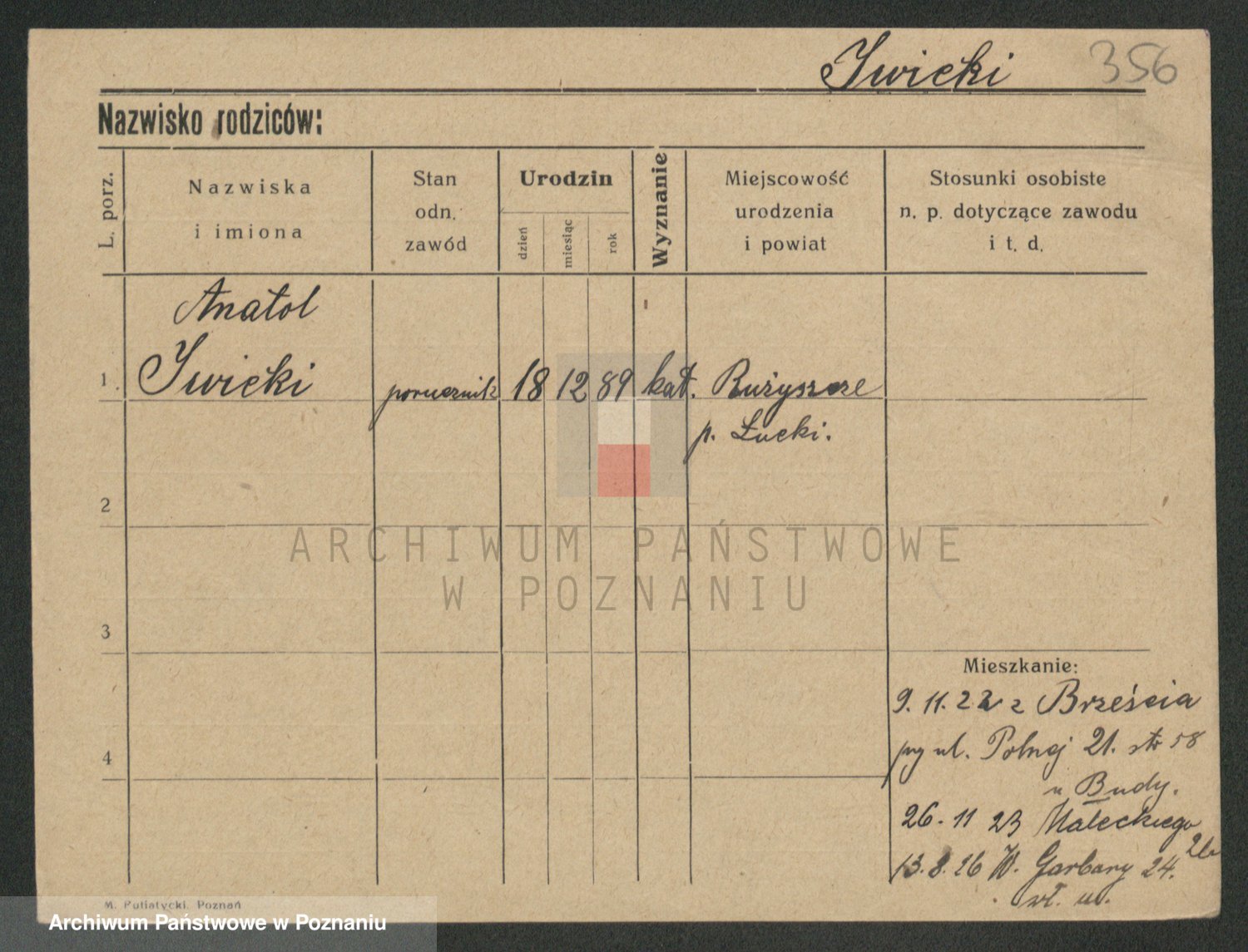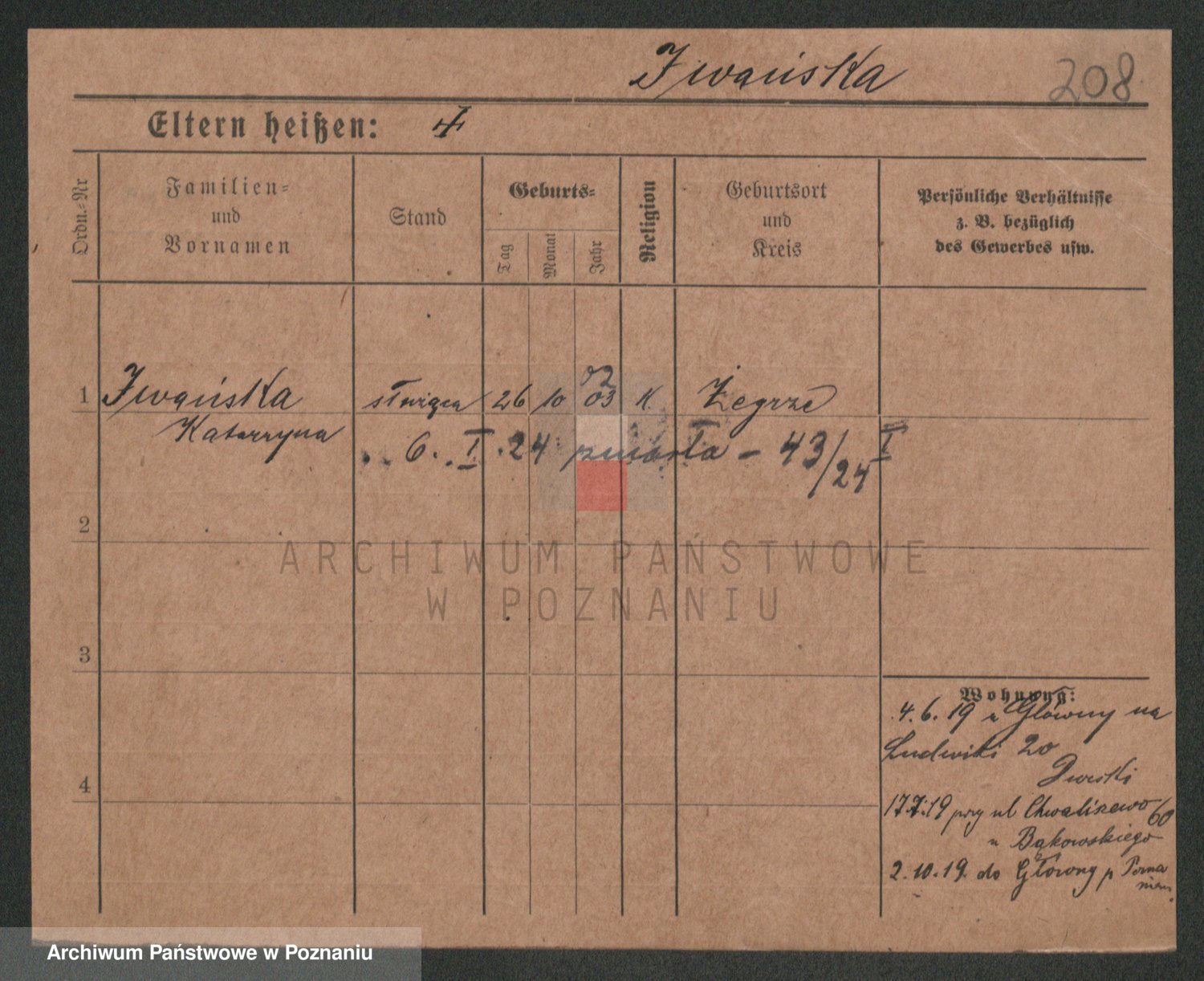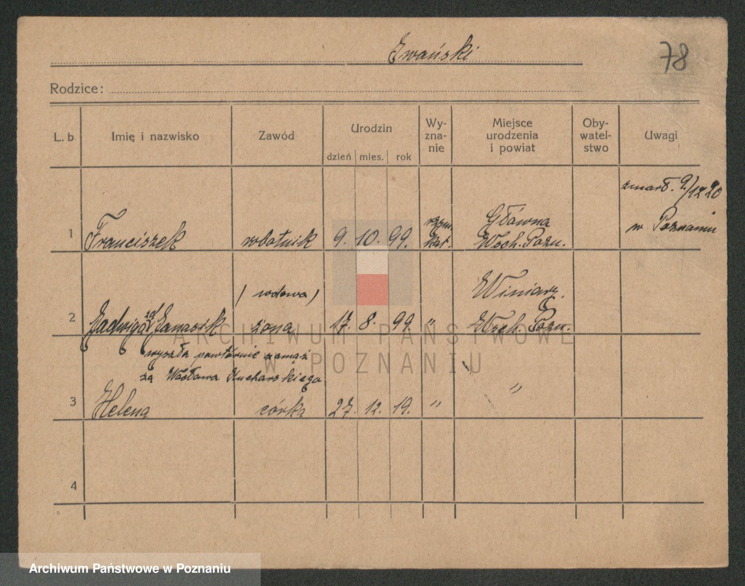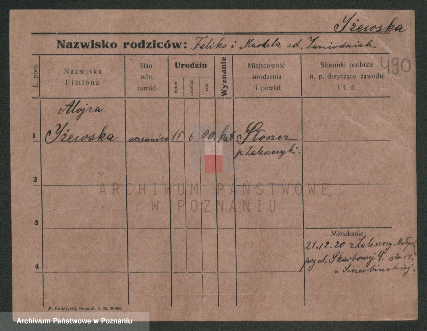 Podgląd karty osobowej dostępny jest po kliknięciu na nazwisko lub ikonkę karty. Można dokonywać powiększenia (ikony na górze) lub przechodzić między kolejnymi skanami (strzałki po bokach).