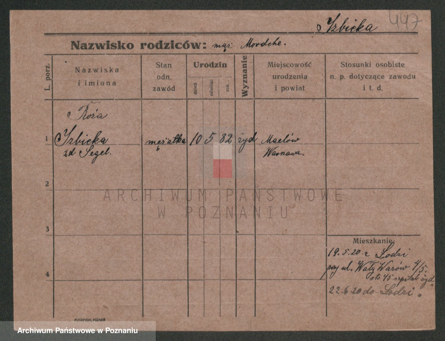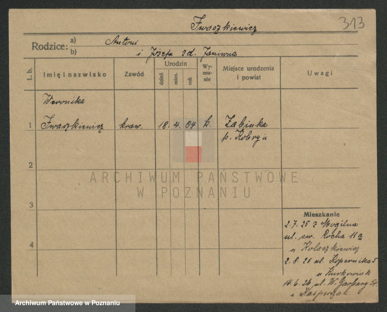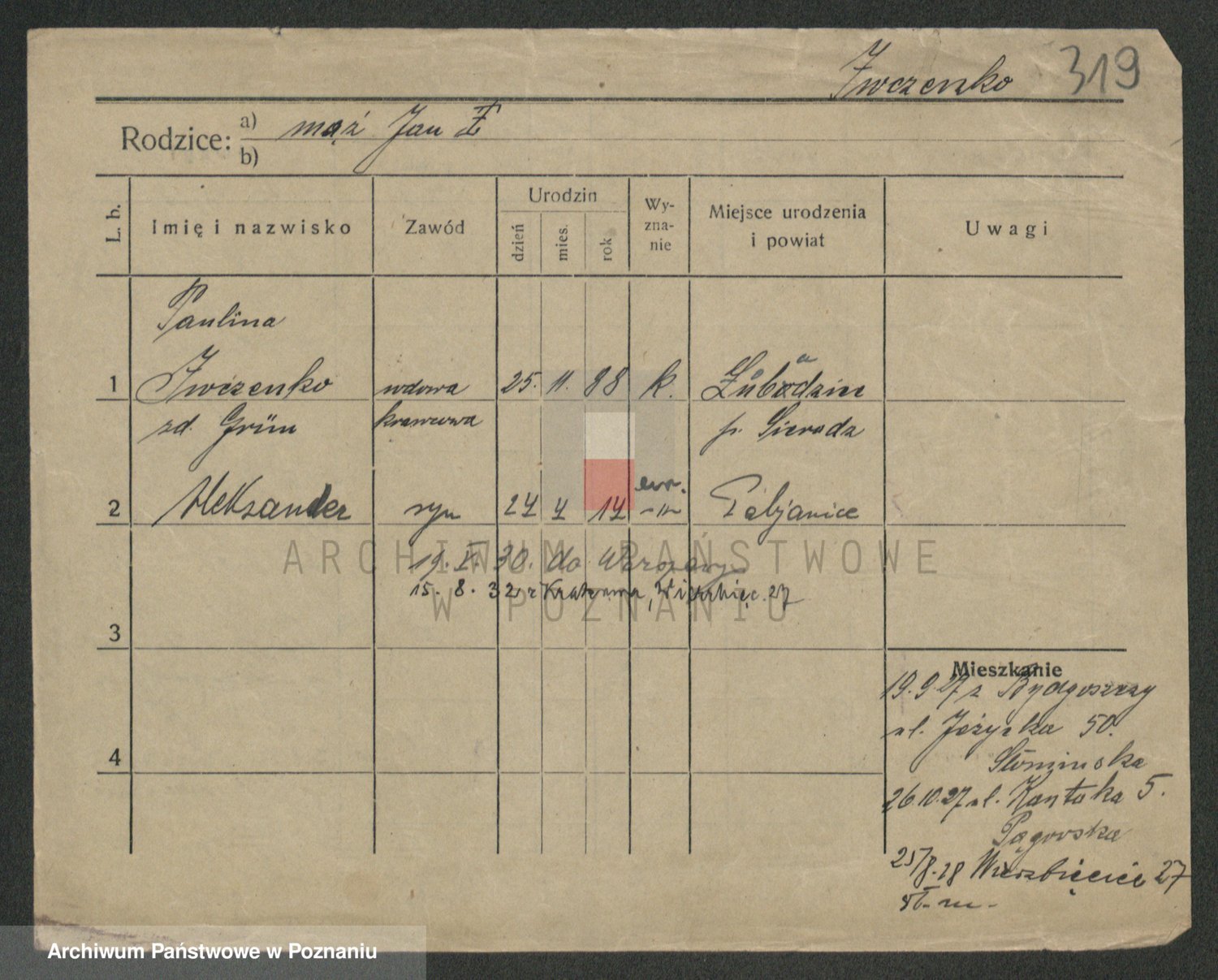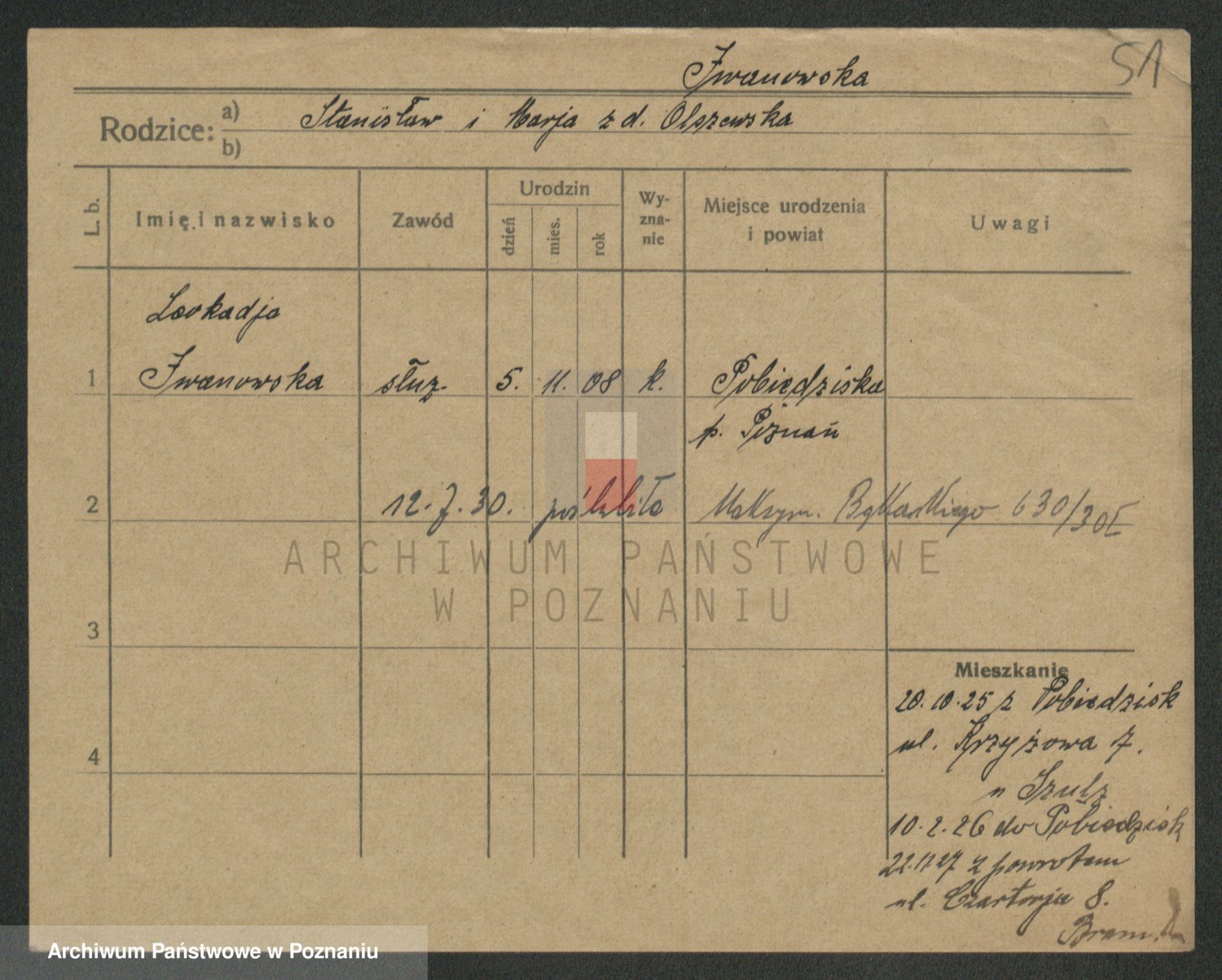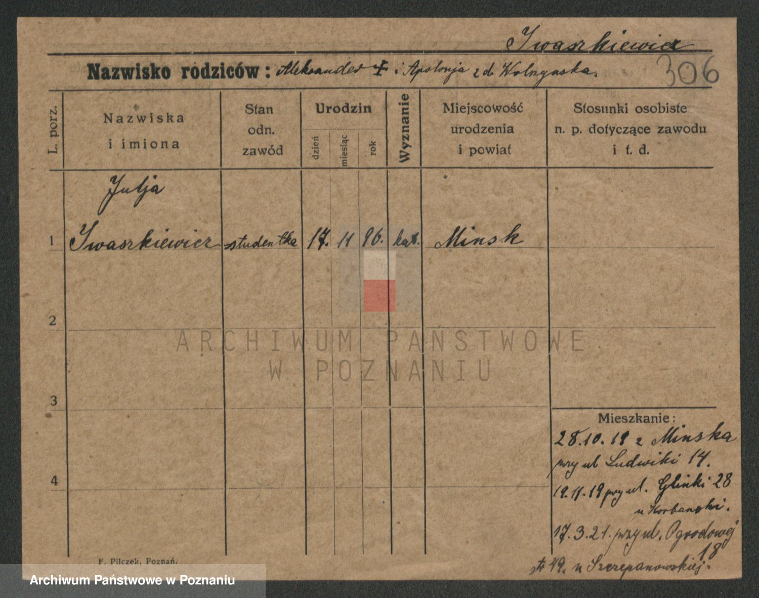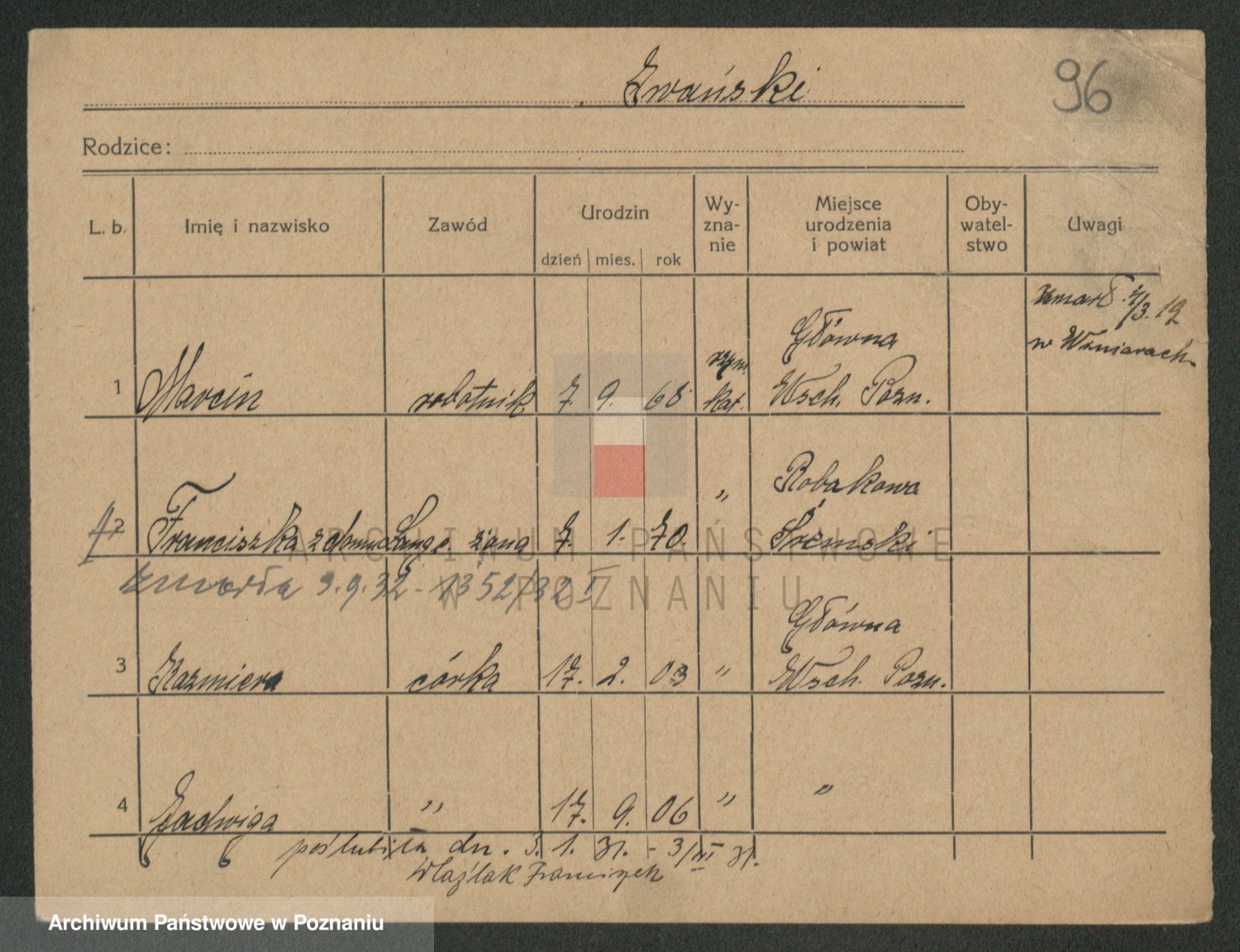 Podgląd karty osobowej dostępny jest po kliknięciu na nazwisko lub ikonkę karty. Można dokonywać powiększenia (ikony na górze) lub przechodzić między kolejnymi skanami (strzałki po bokach).