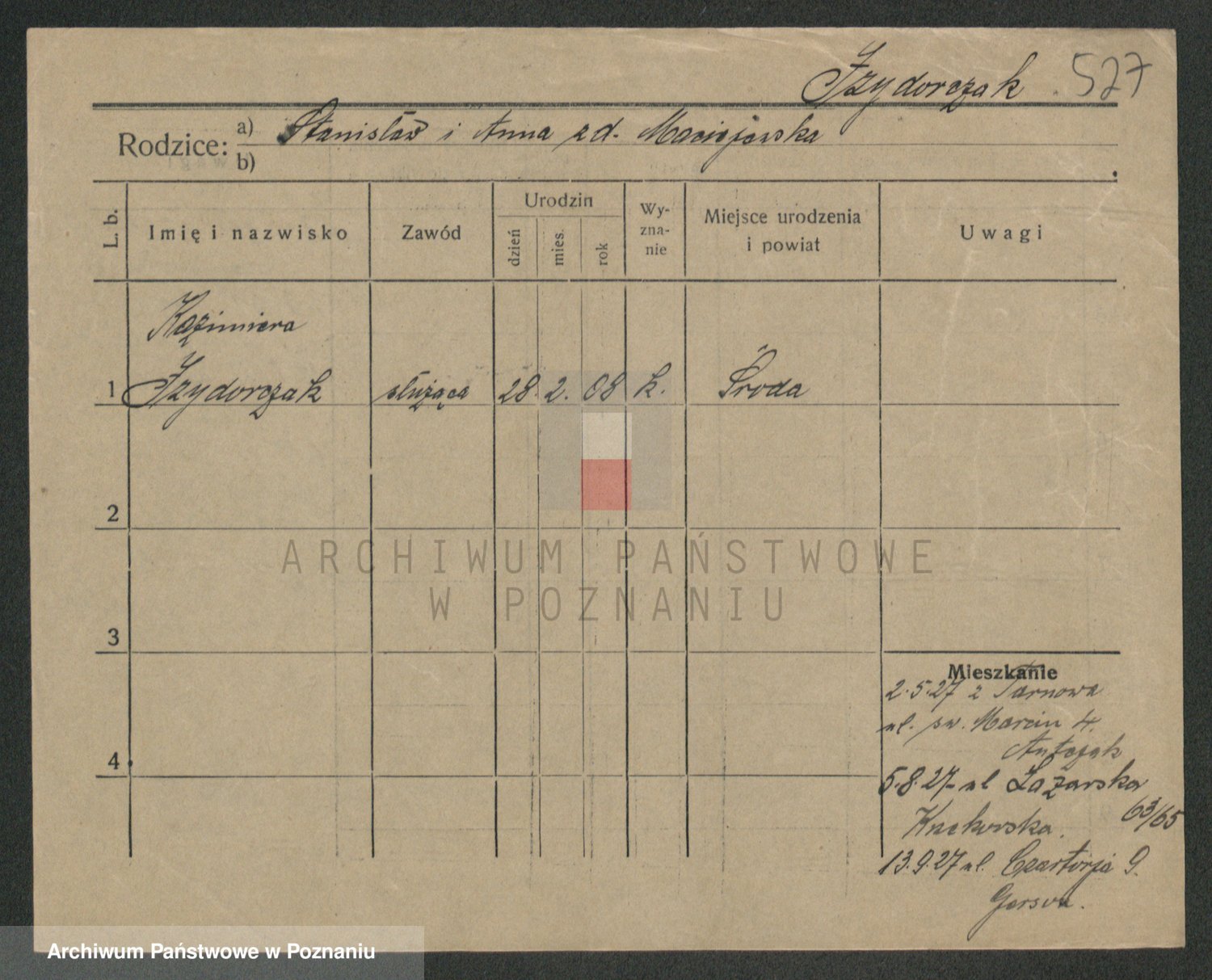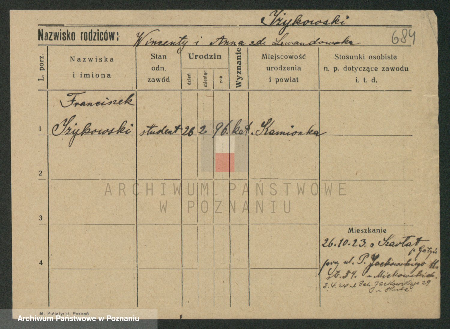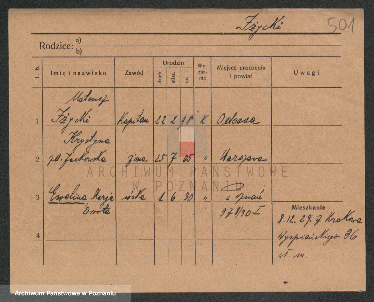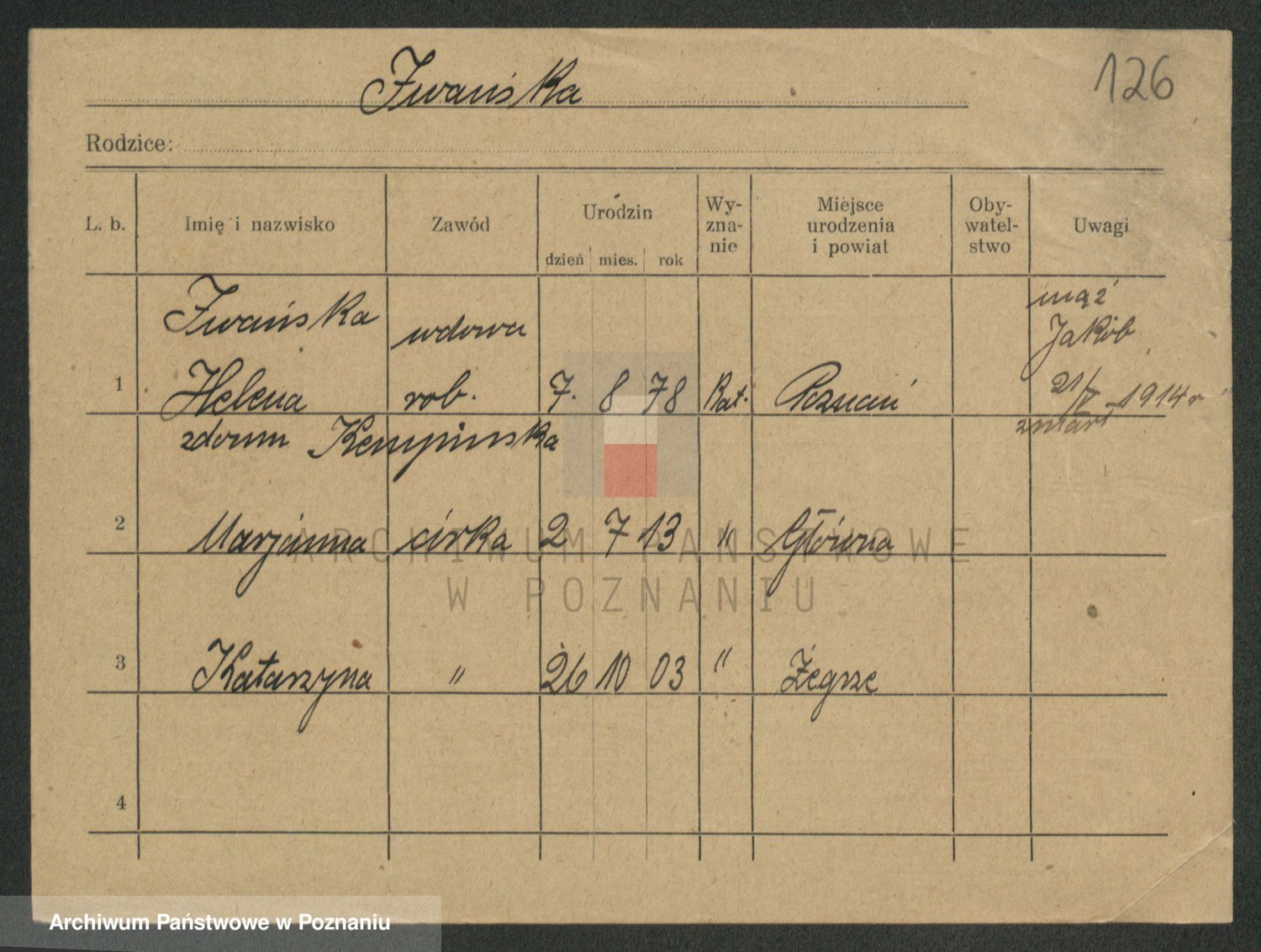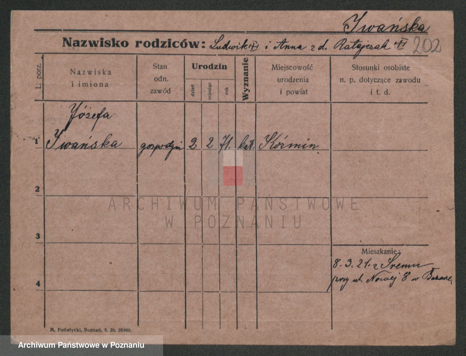 Podgląd karty osobowej dostępny jest po kliknięciu na nazwisko lub ikonkę karty. Można dokonywać powiększenia (ikony na górze) lub przechodzić między kolejnymi skanami (strzałki po bokach).