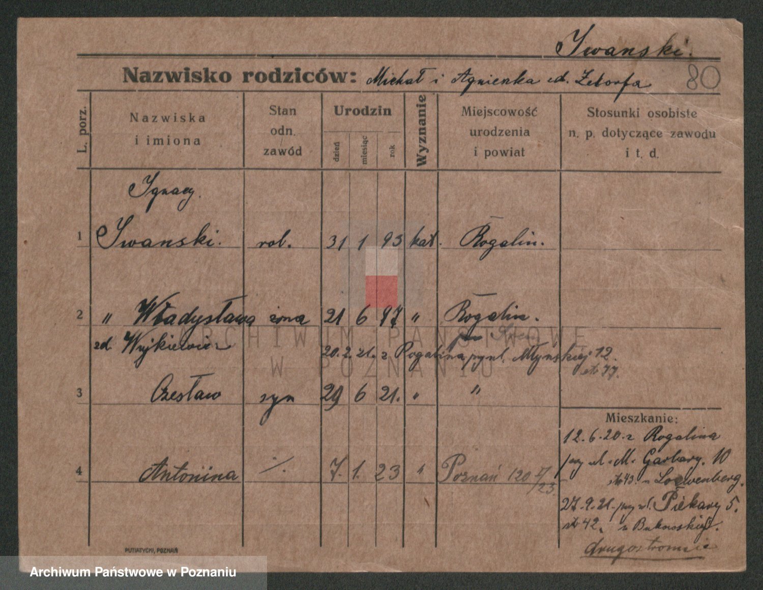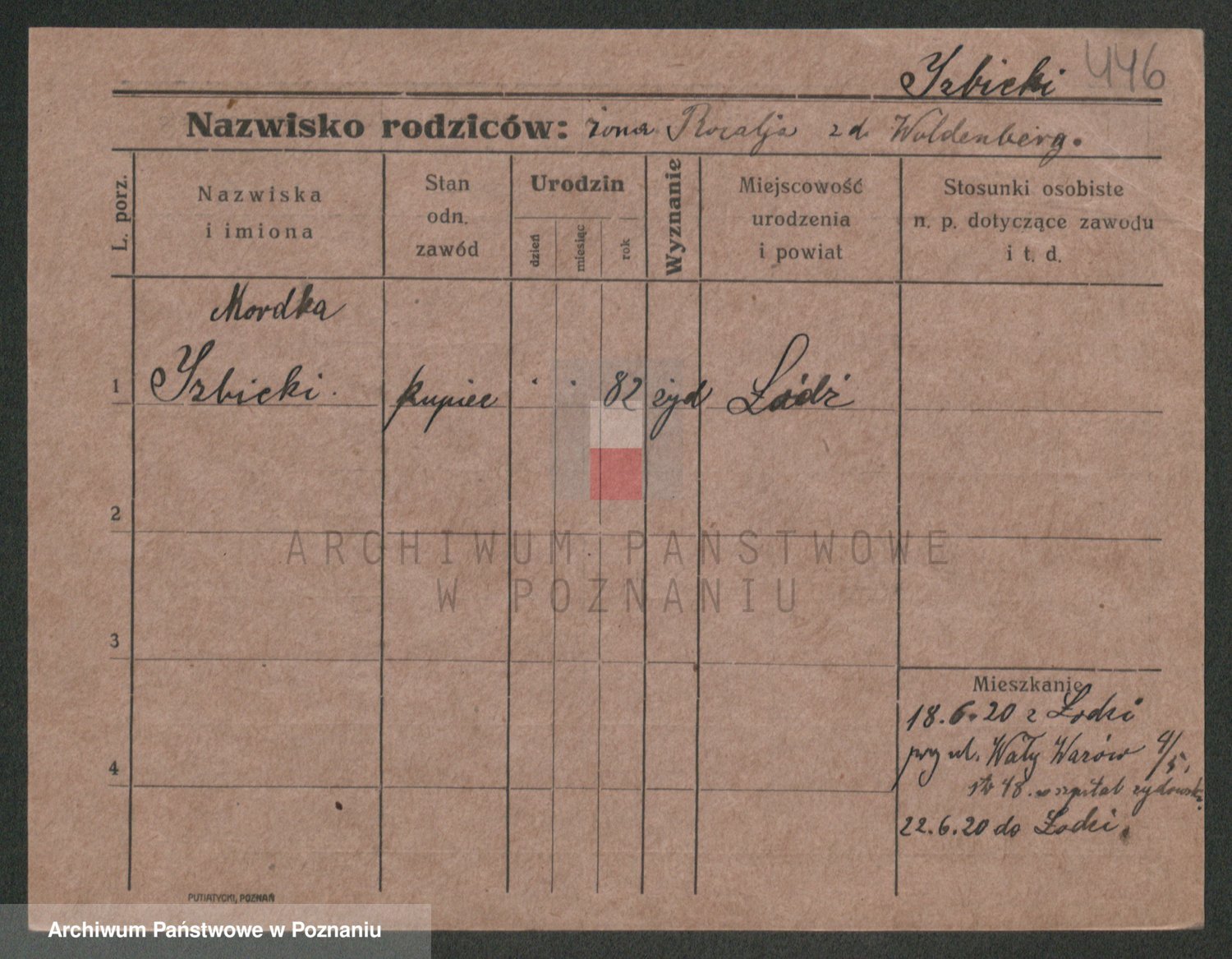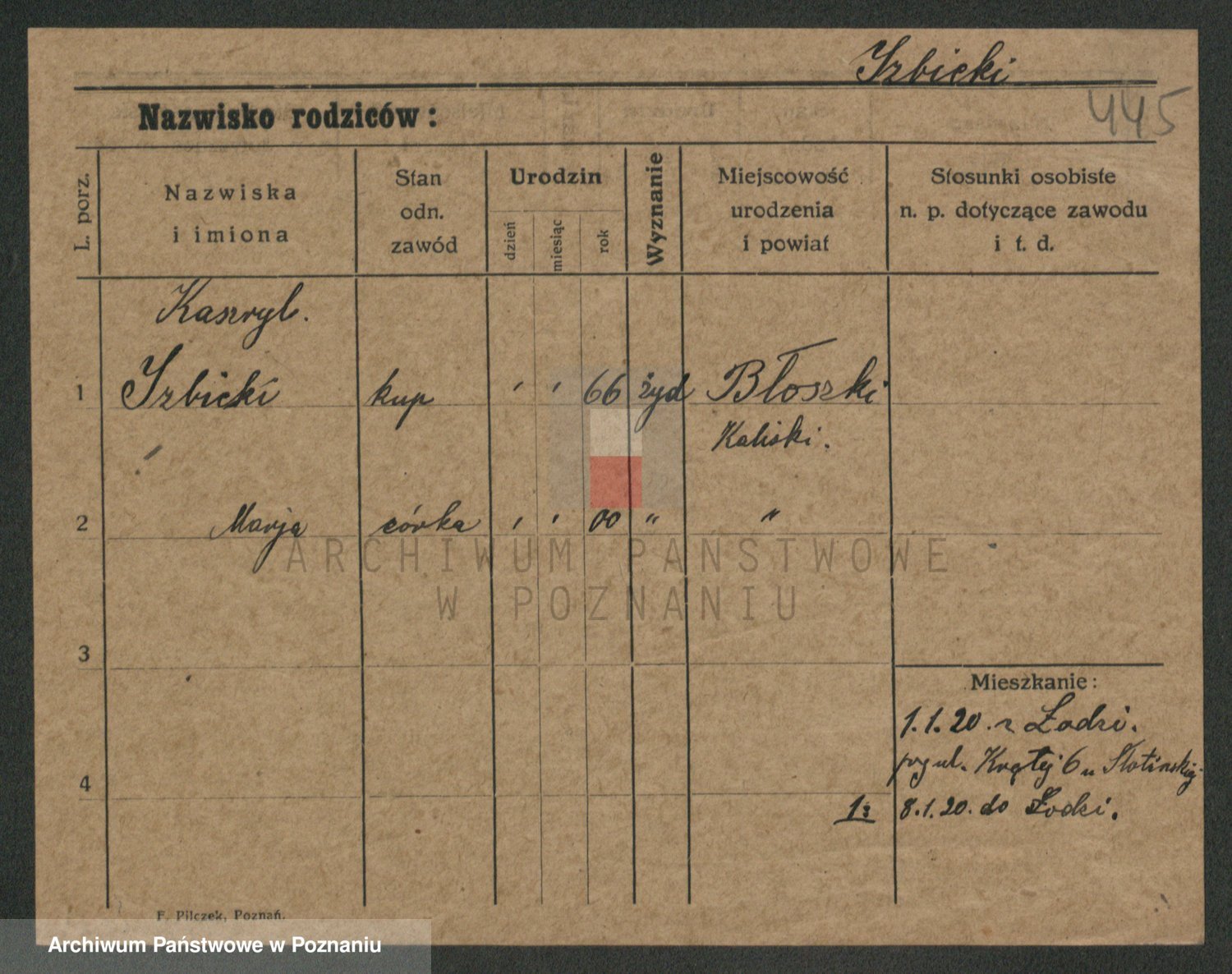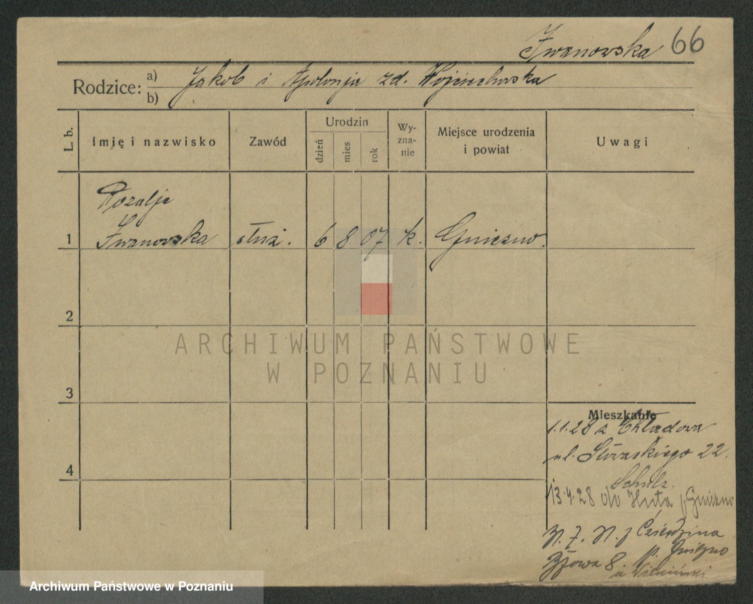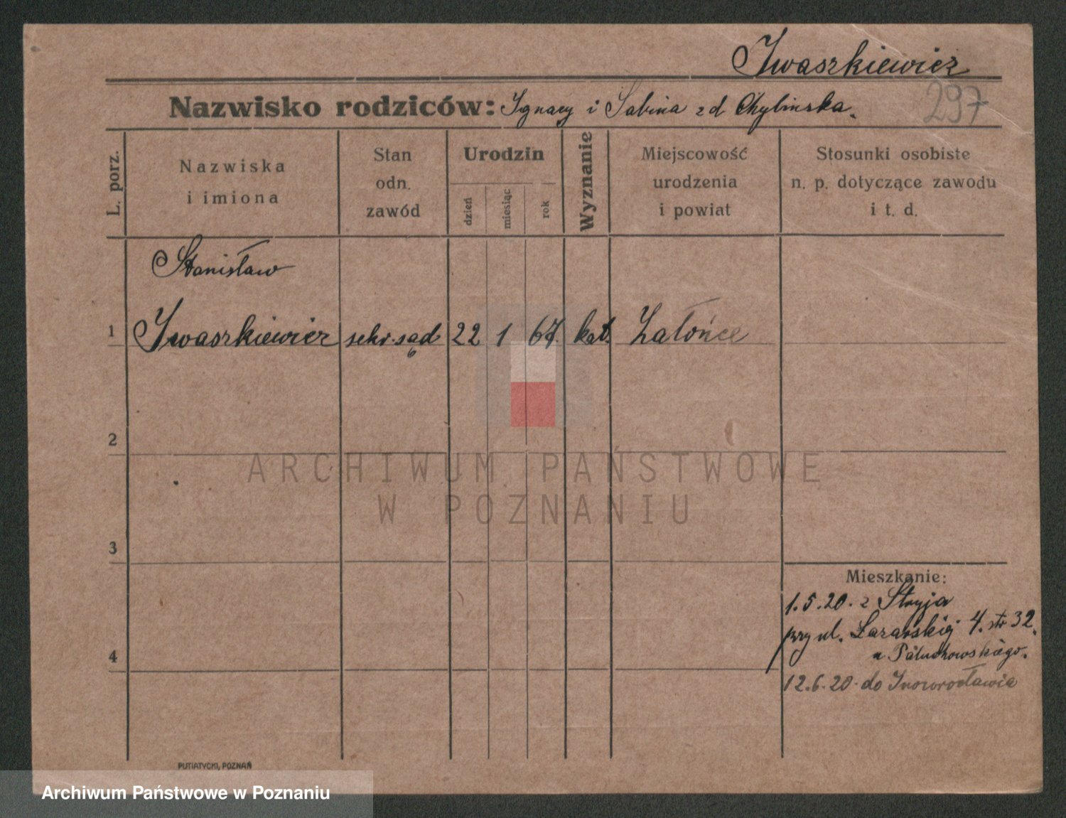 Podgląd karty osobowej dostępny jest po kliknięciu na nazwisko lub ikonkę karty. Można dokonywać powiększenia (ikony na górze) lub przechodzić między kolejnymi skanami (strzałki po bokach).