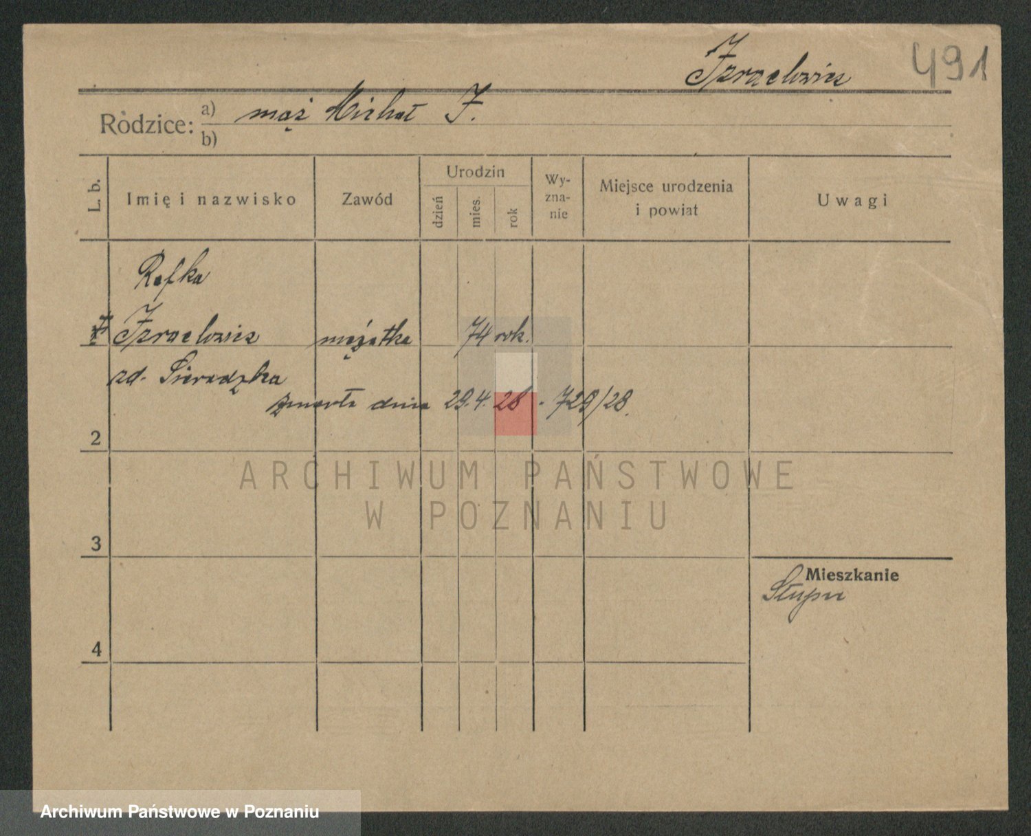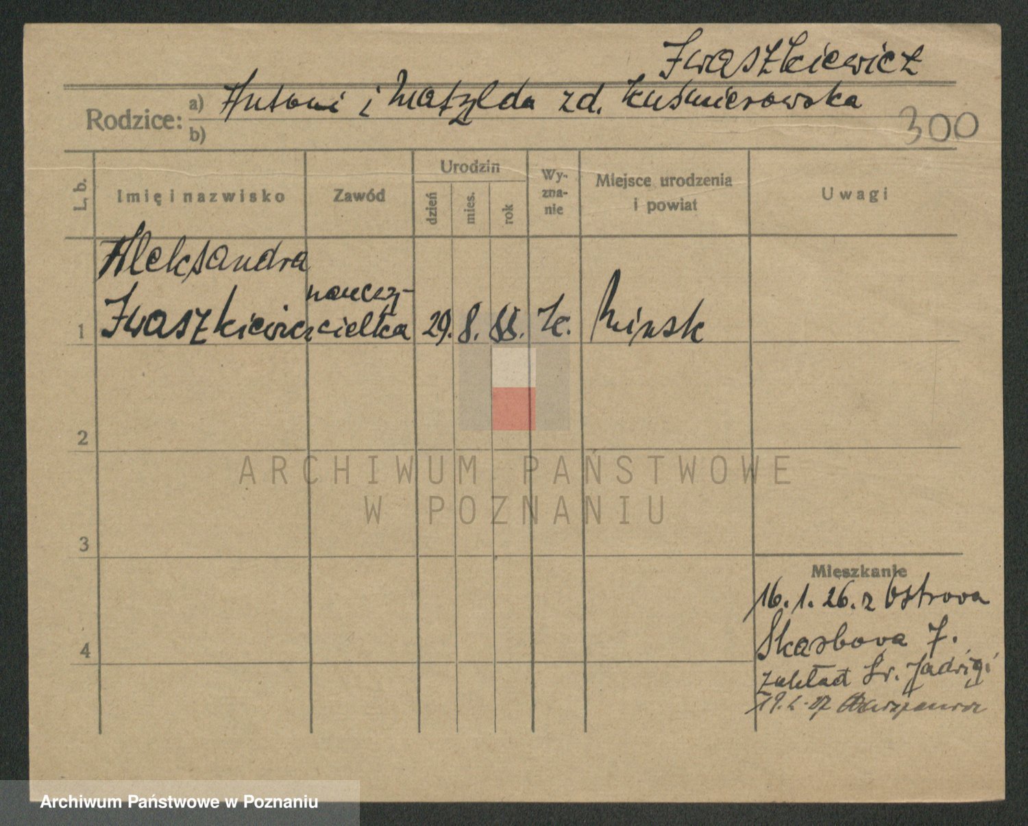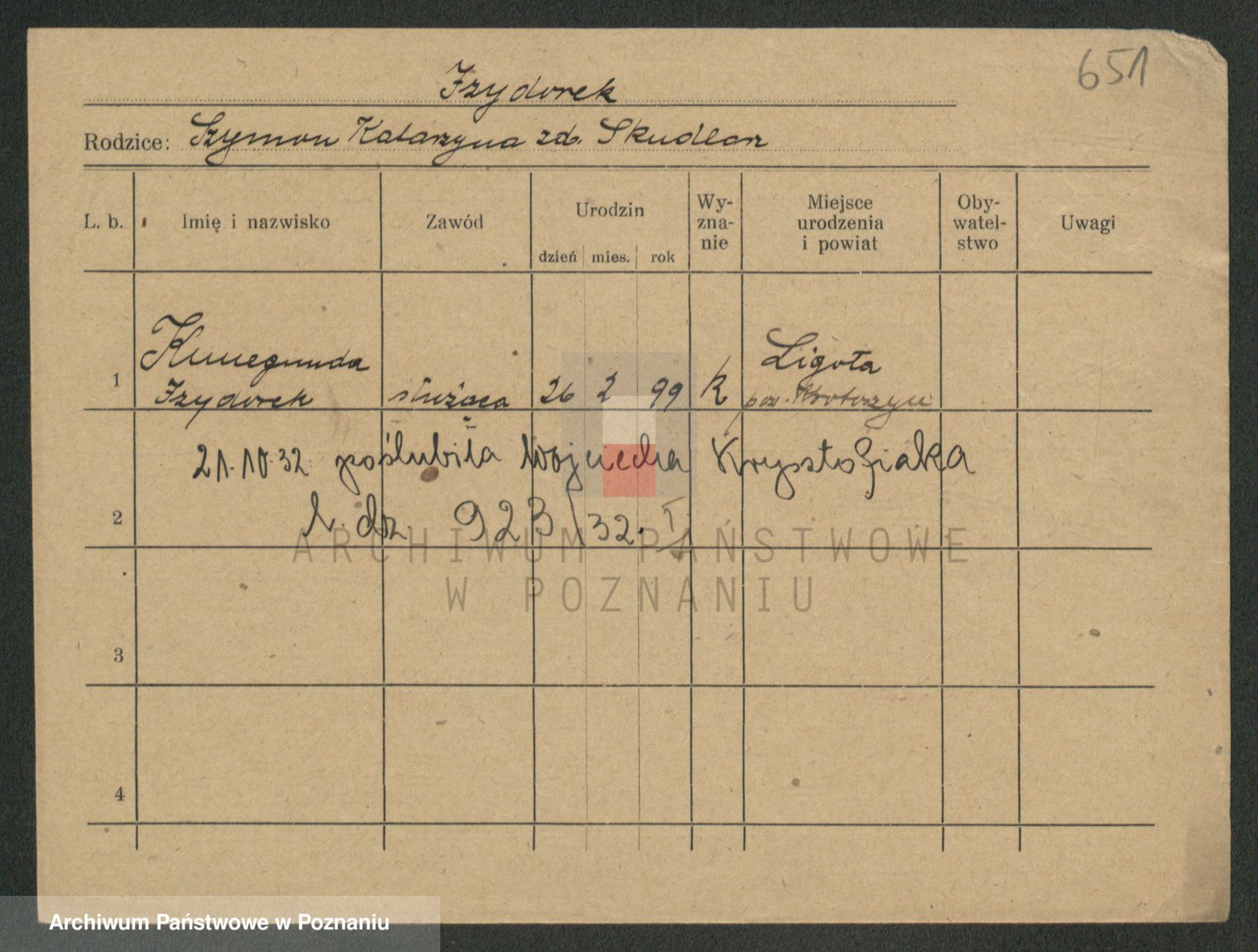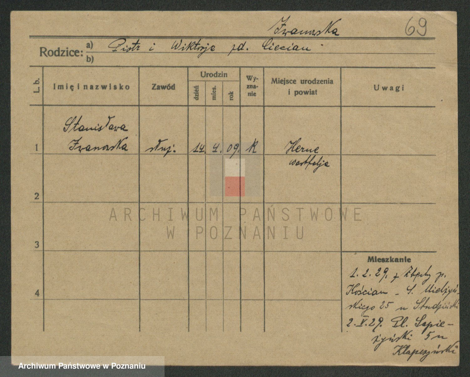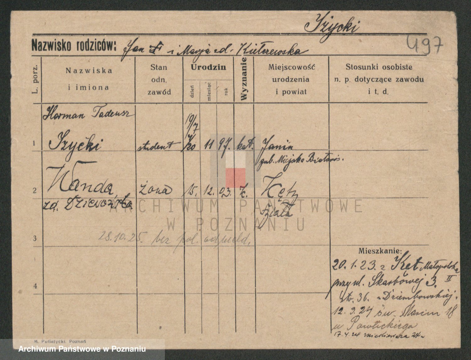 Podgląd karty osobowej dostępny jest po kliknięciu na nazwisko lub ikonkę karty. Można dokonywać powiększenia (ikony na górze) lub przechodzić między kolejnymi skanami (strzałki po bokach).