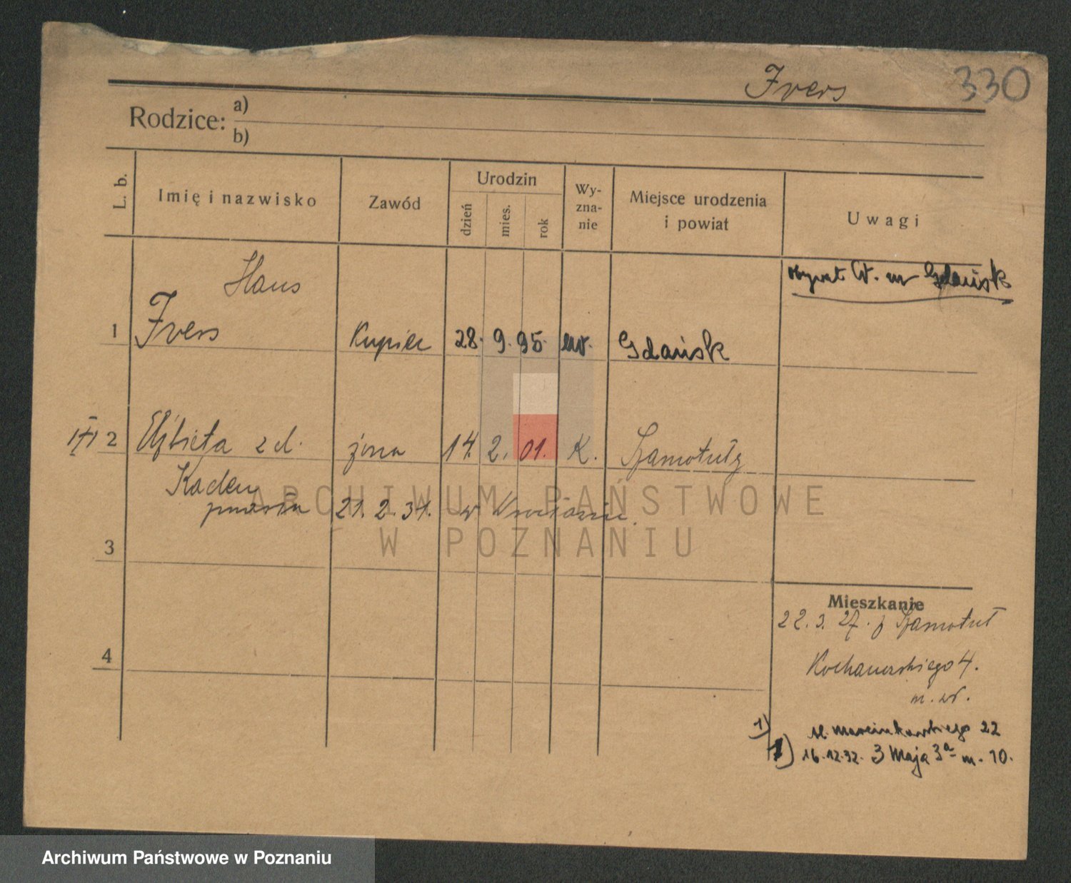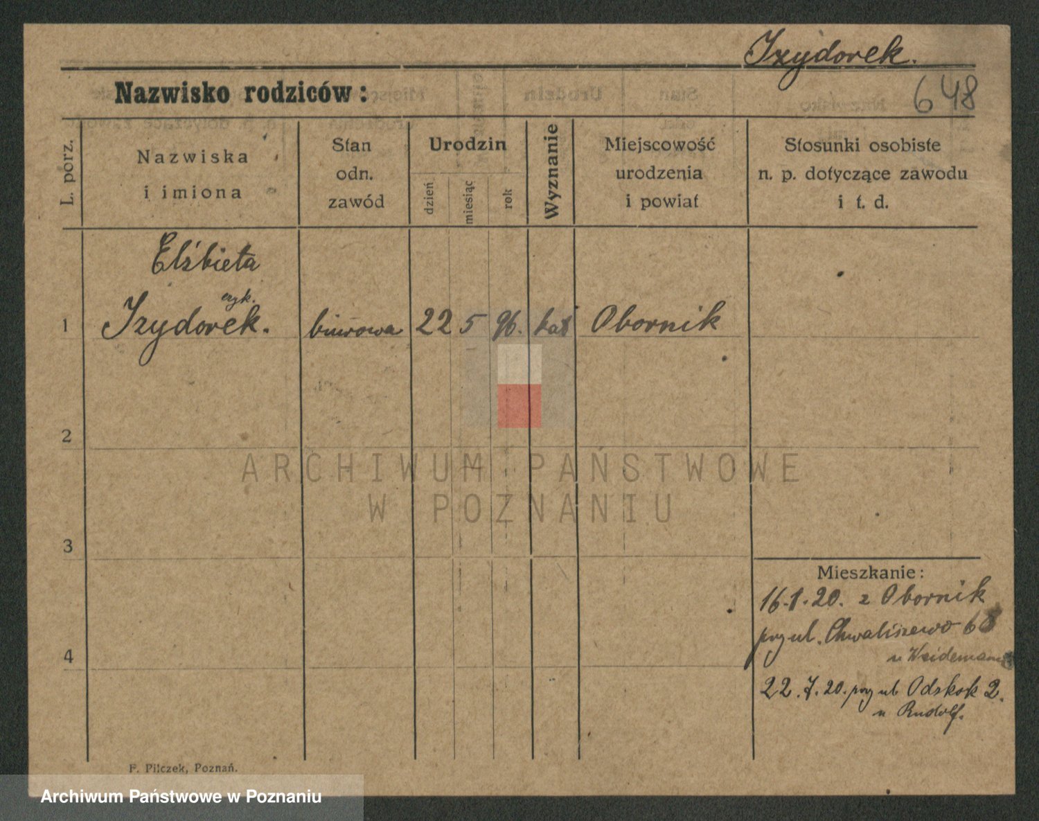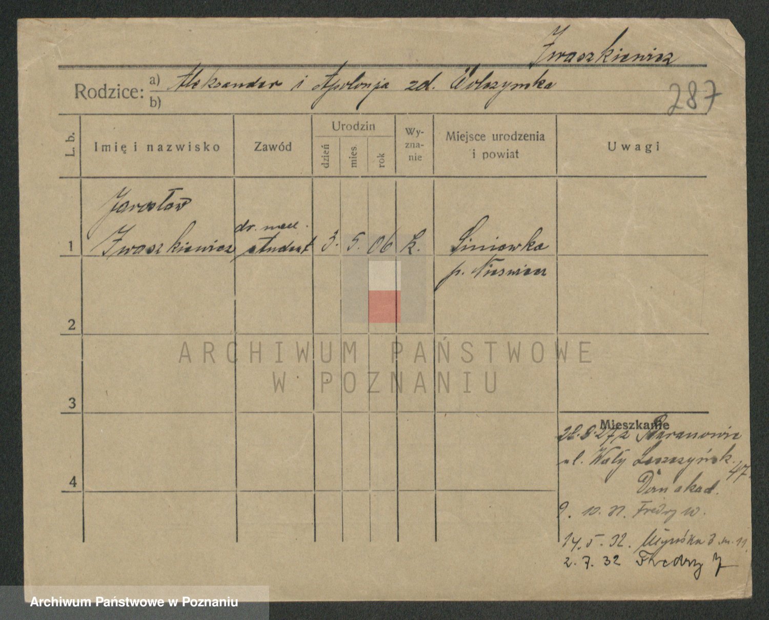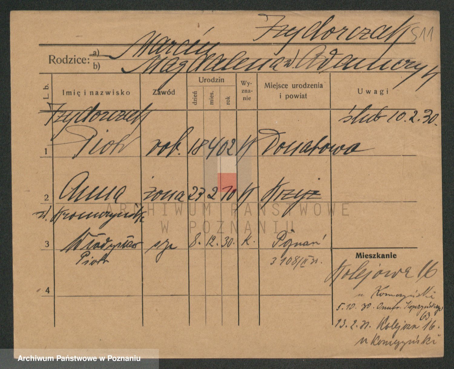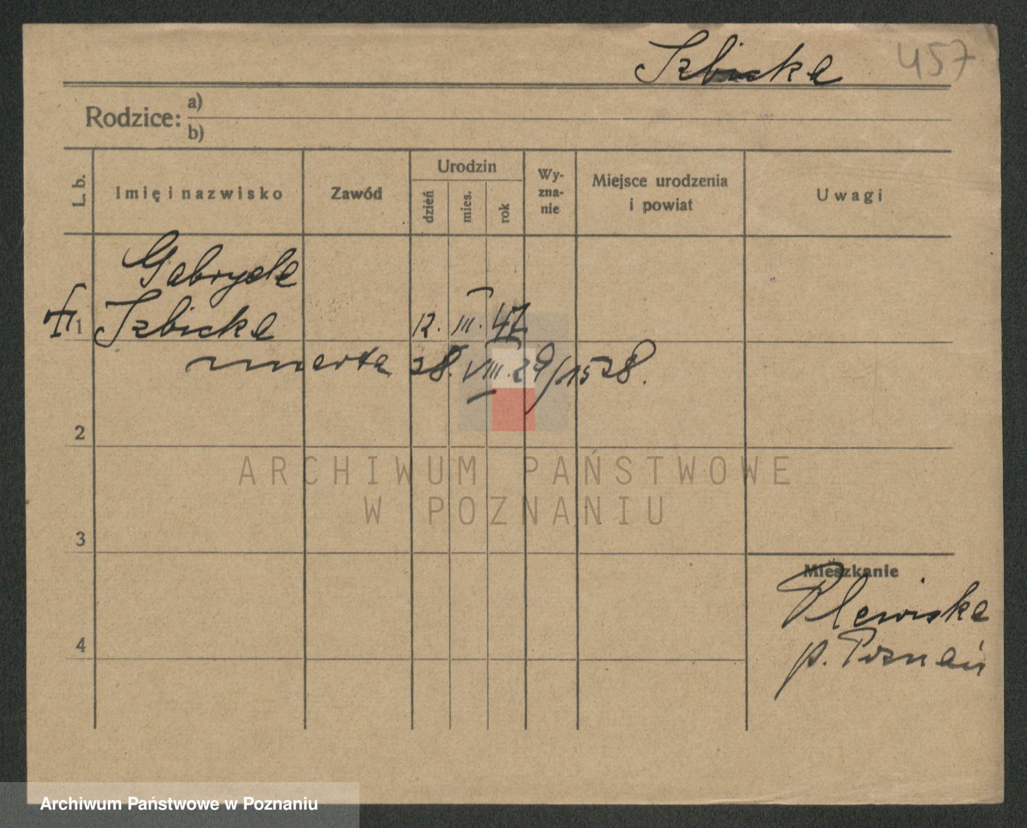 Podgląd karty osobowej dostępny jest po kliknięciu na nazwisko lub ikonkę karty. Można dokonywać powiększenia (ikony na górze) lub przechodzić między kolejnymi skanami (strzałki po bokach).