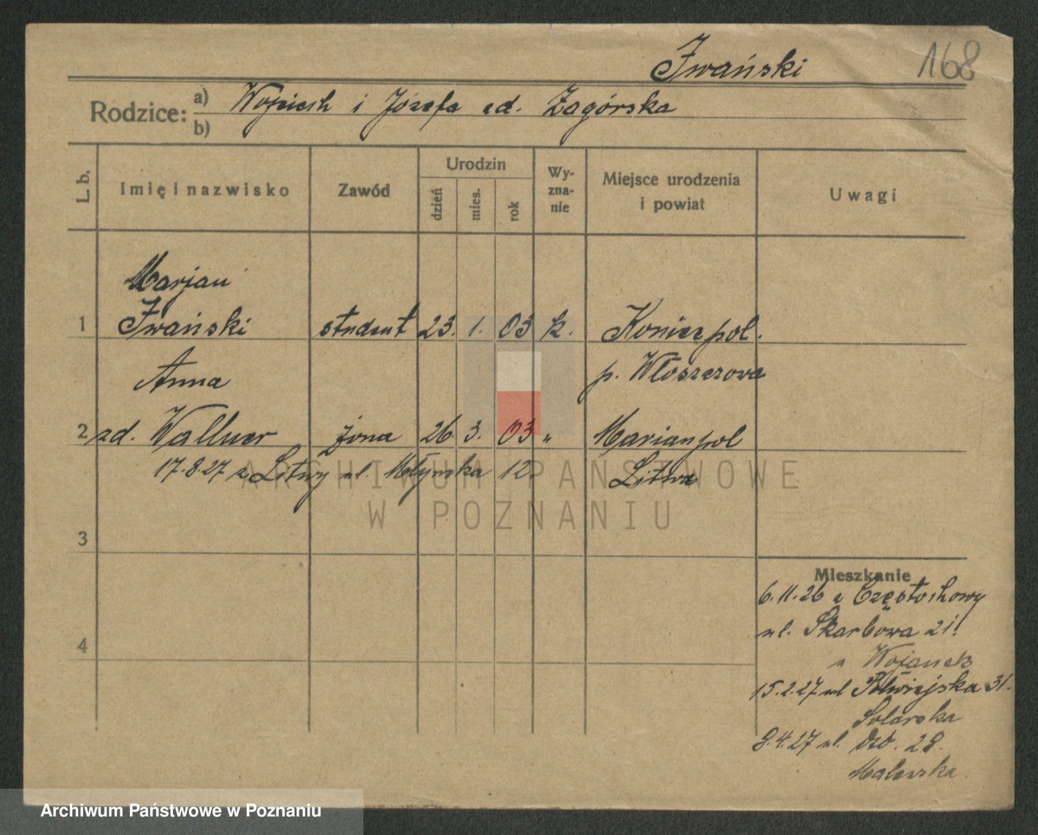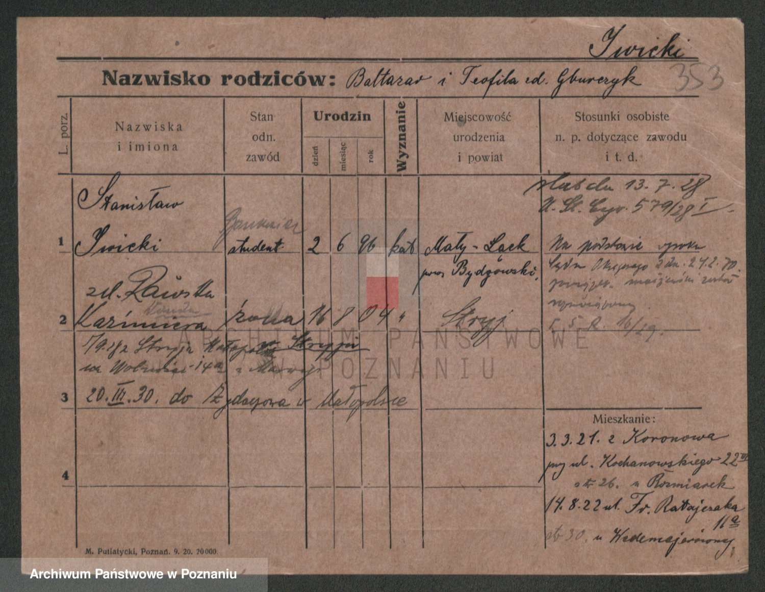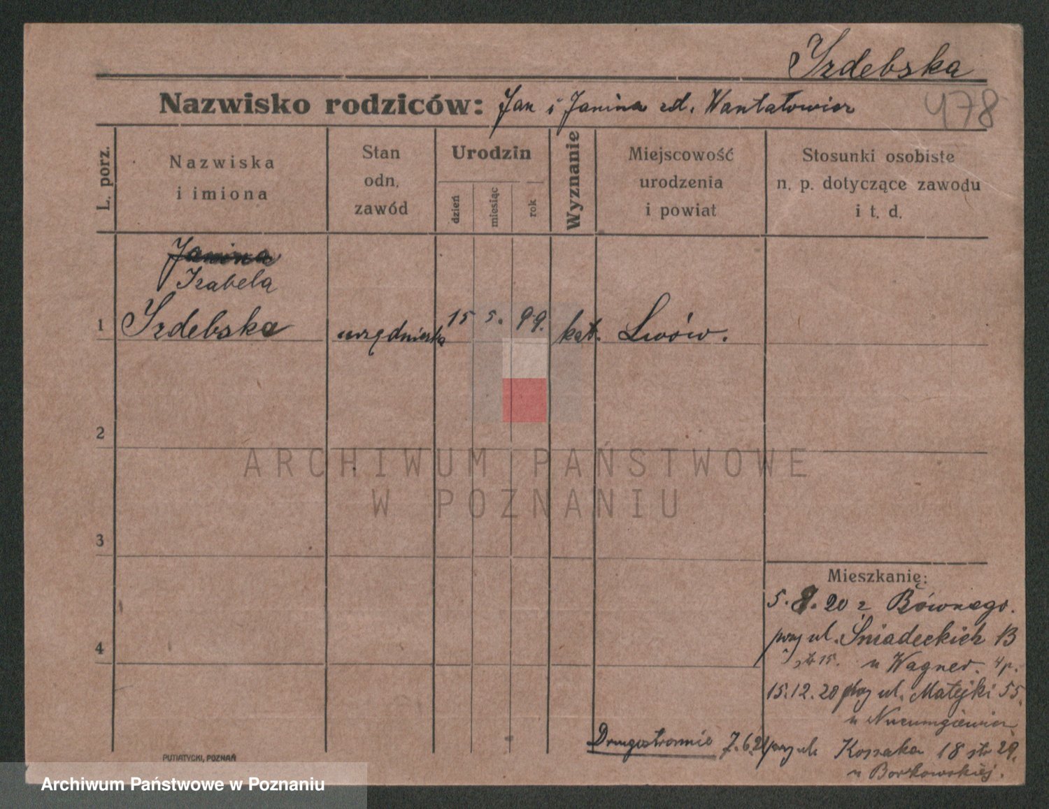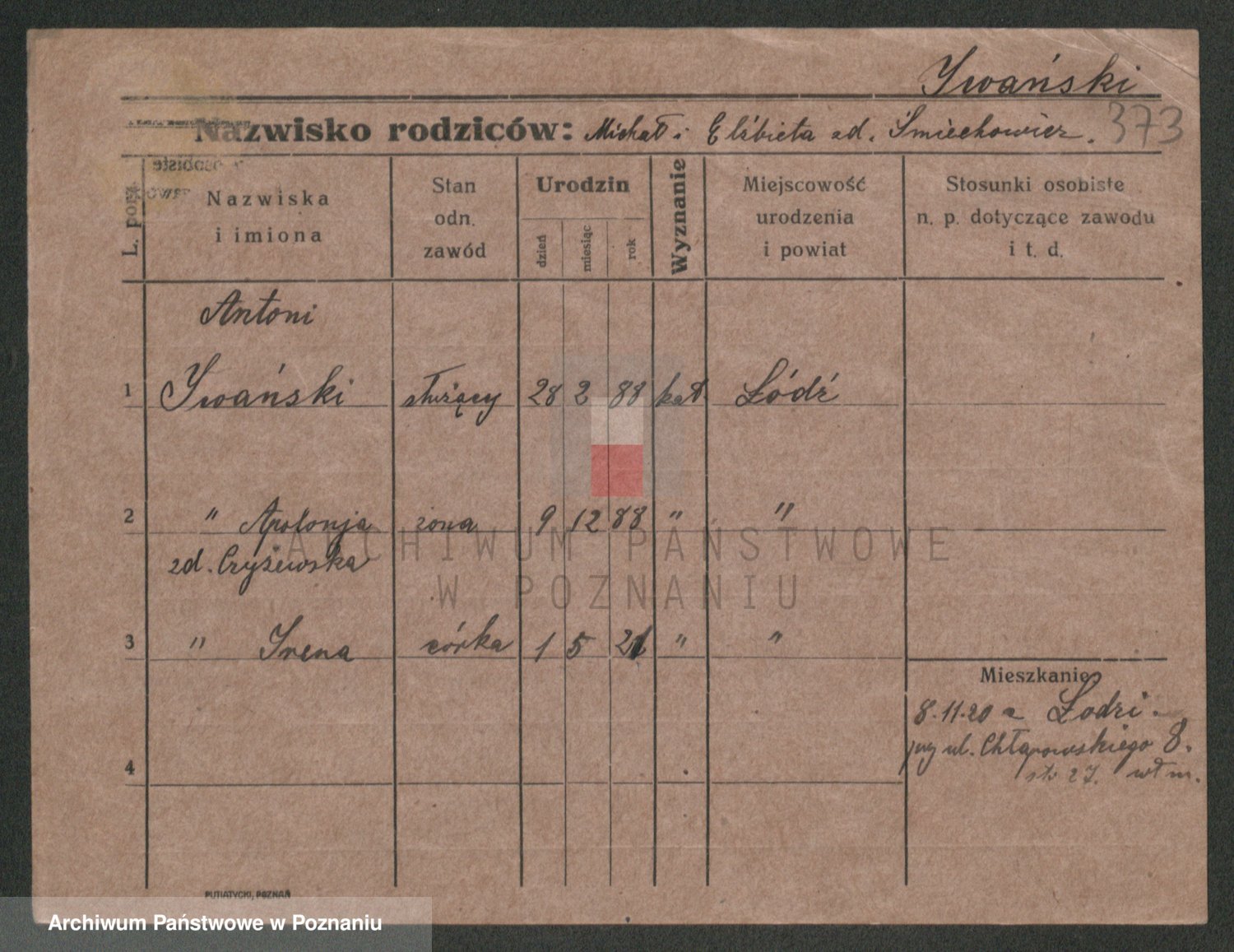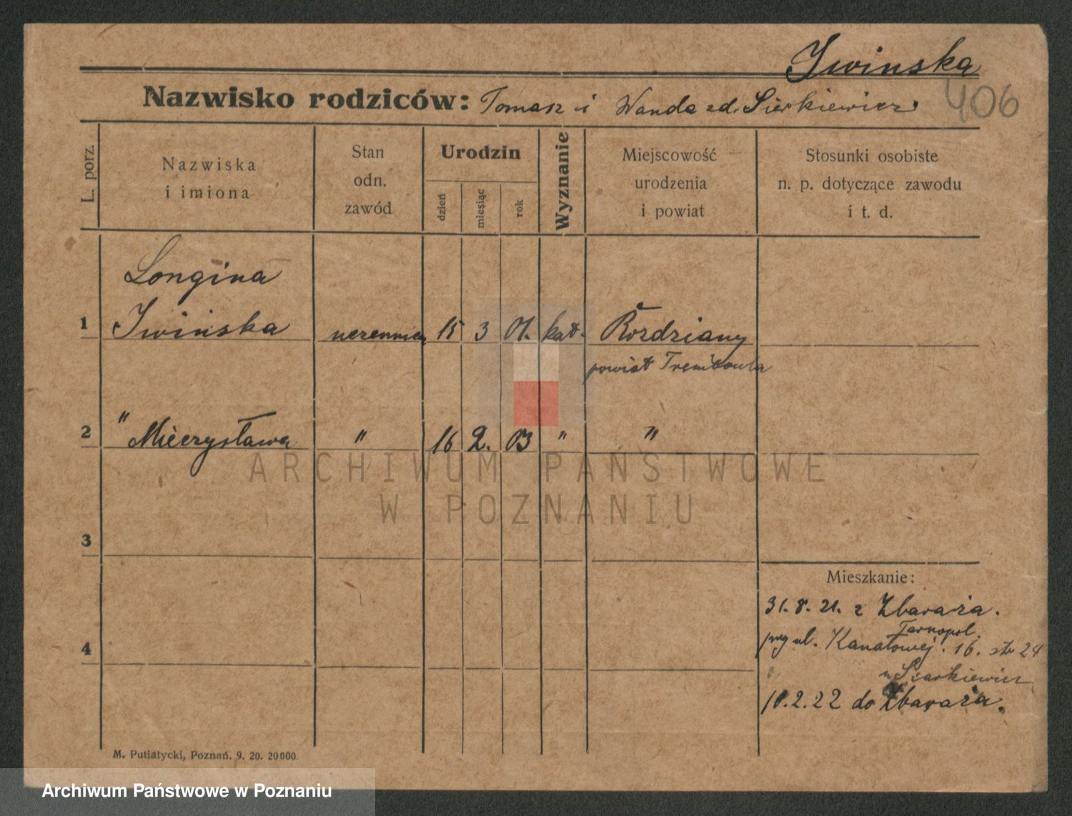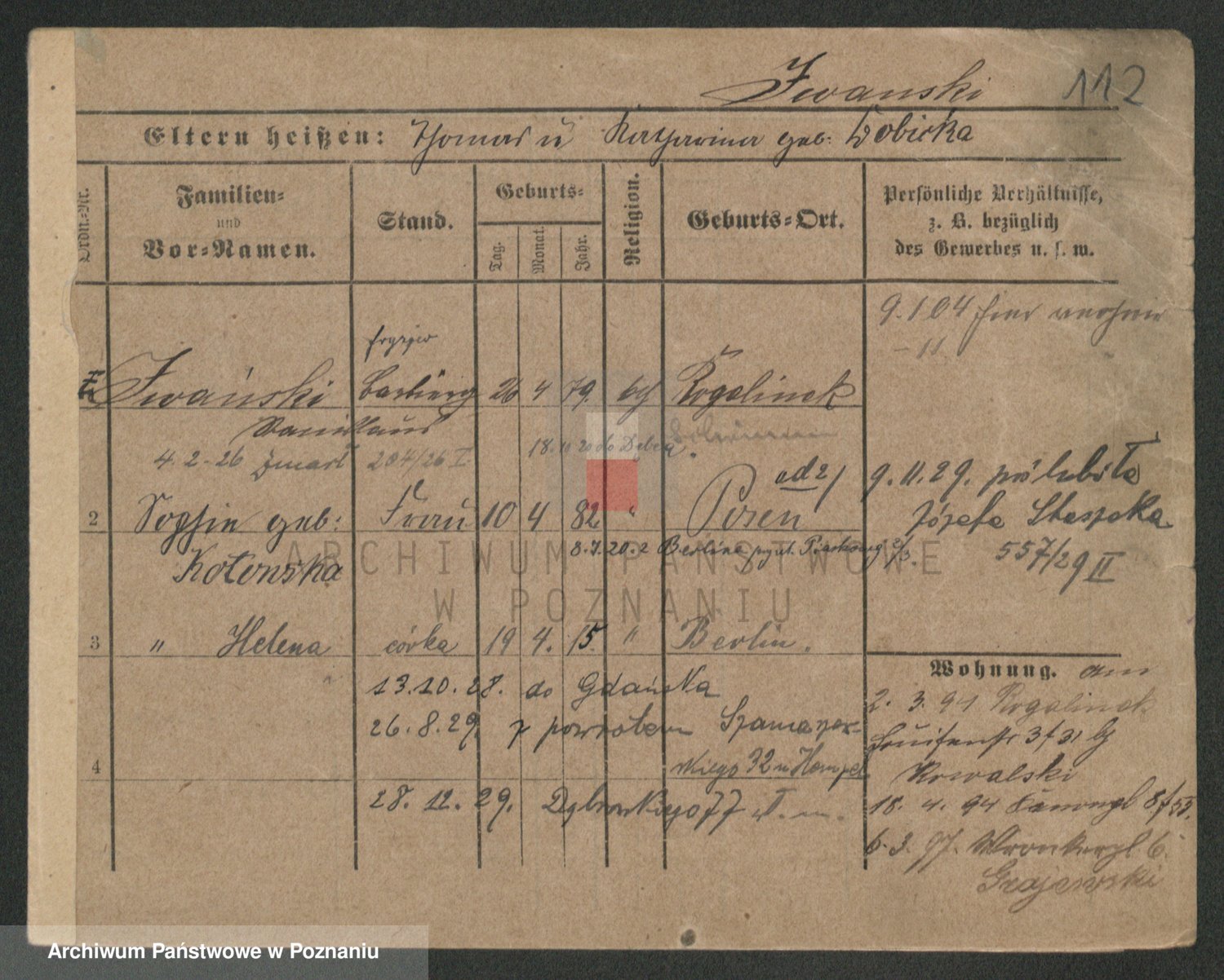 Podgląd karty osobowej dostępny jest po kliknięciu na nazwisko lub ikonkę karty. Można dokonywać powiększenia (ikony na górze) lub przechodzić między kolejnymi skanami (strzałki po bokach).
