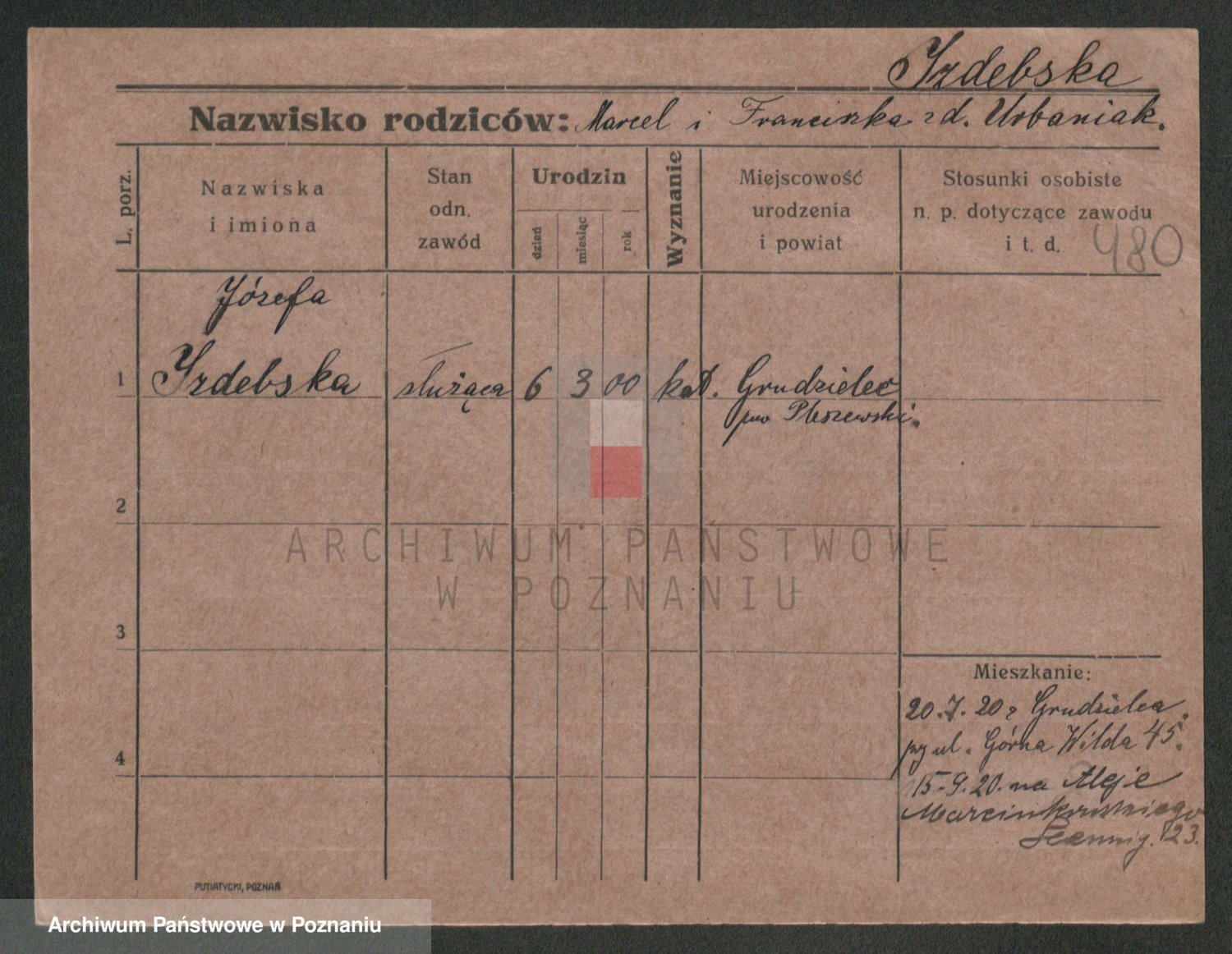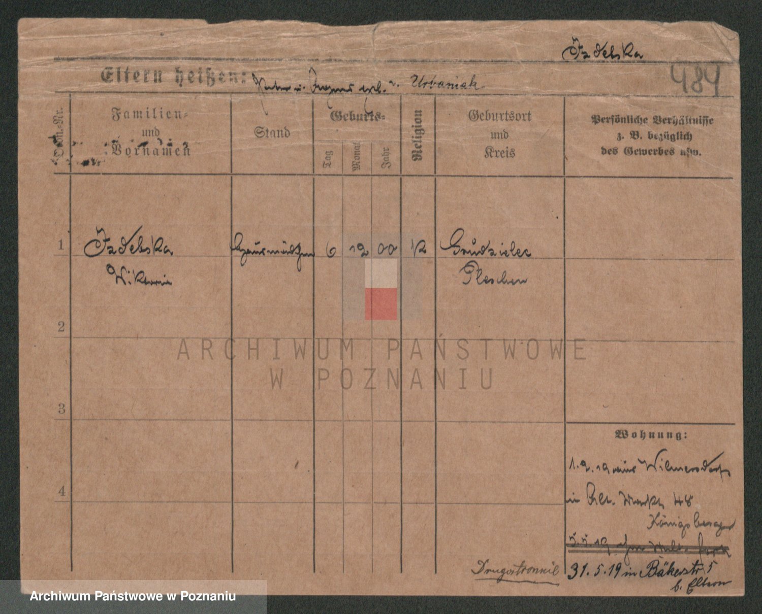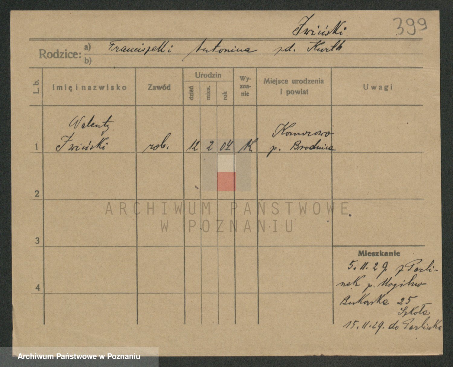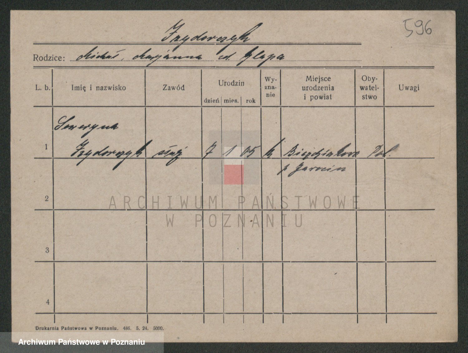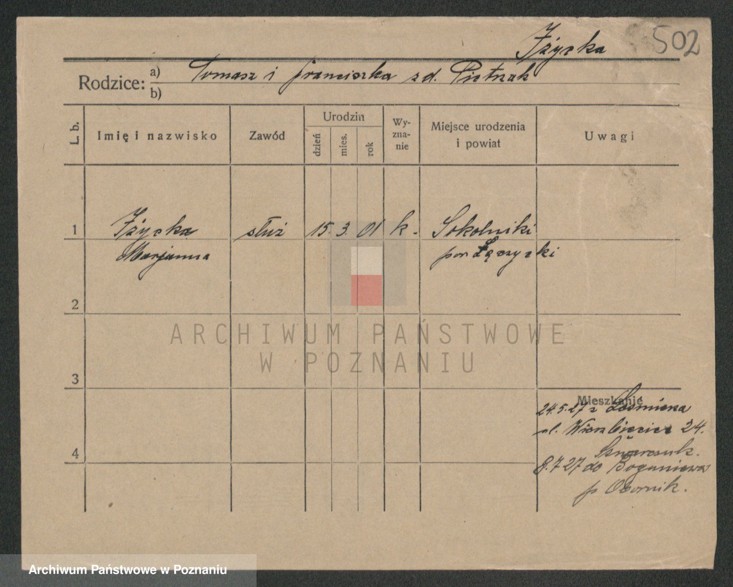 Podgląd karty osobowej dostępny jest po kliknięciu na nazwisko lub ikonkę karty. Można dokonywać powiększenia (ikony na górze) lub przechodzić między kolejnymi skanami (strzałki po bokach).