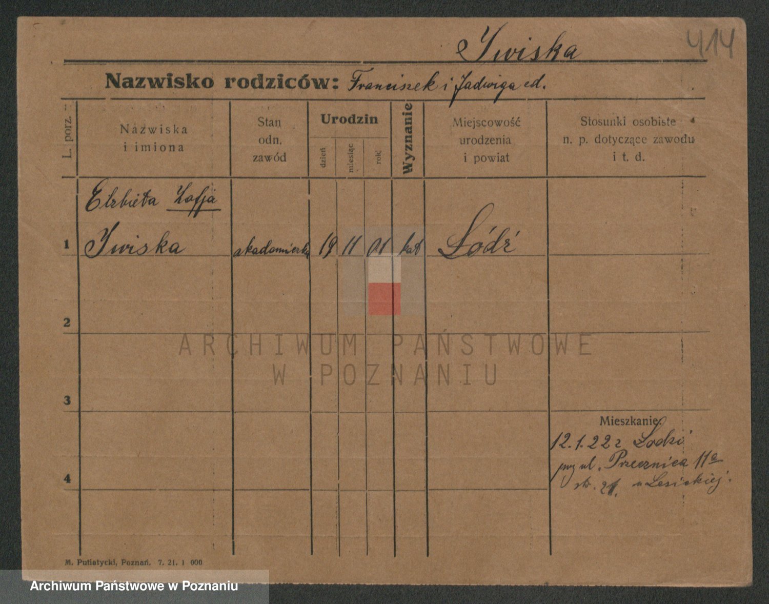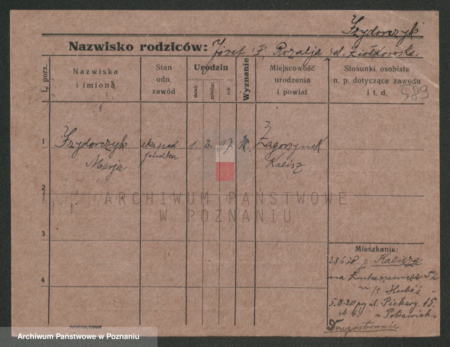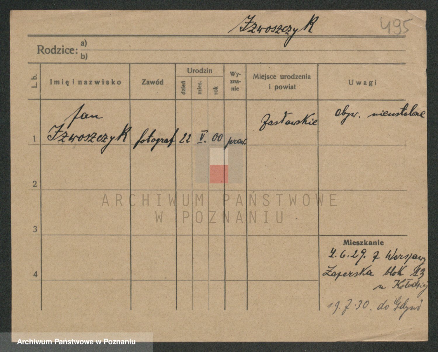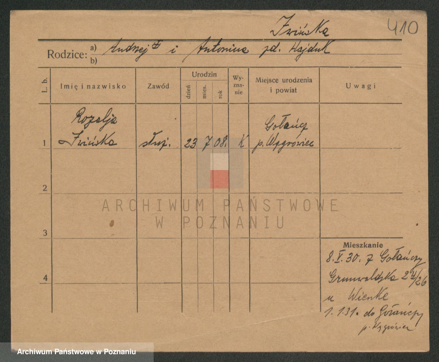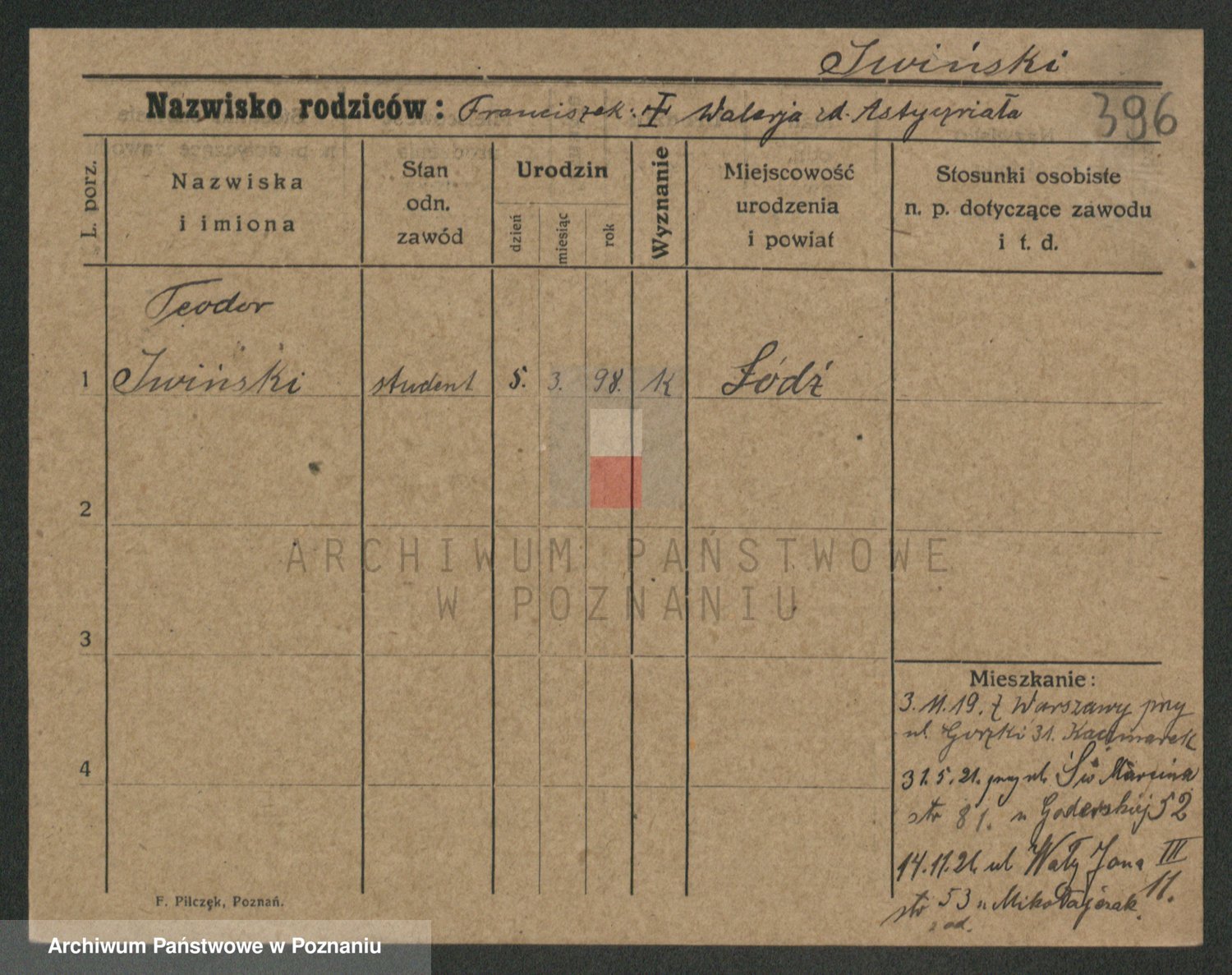 Podgląd karty osobowej dostępny jest po kliknięciu na nazwisko lub ikonkę karty. Można dokonywać powiększenia (ikony na górze) lub przechodzić między kolejnymi skanami (strzałki po bokach).