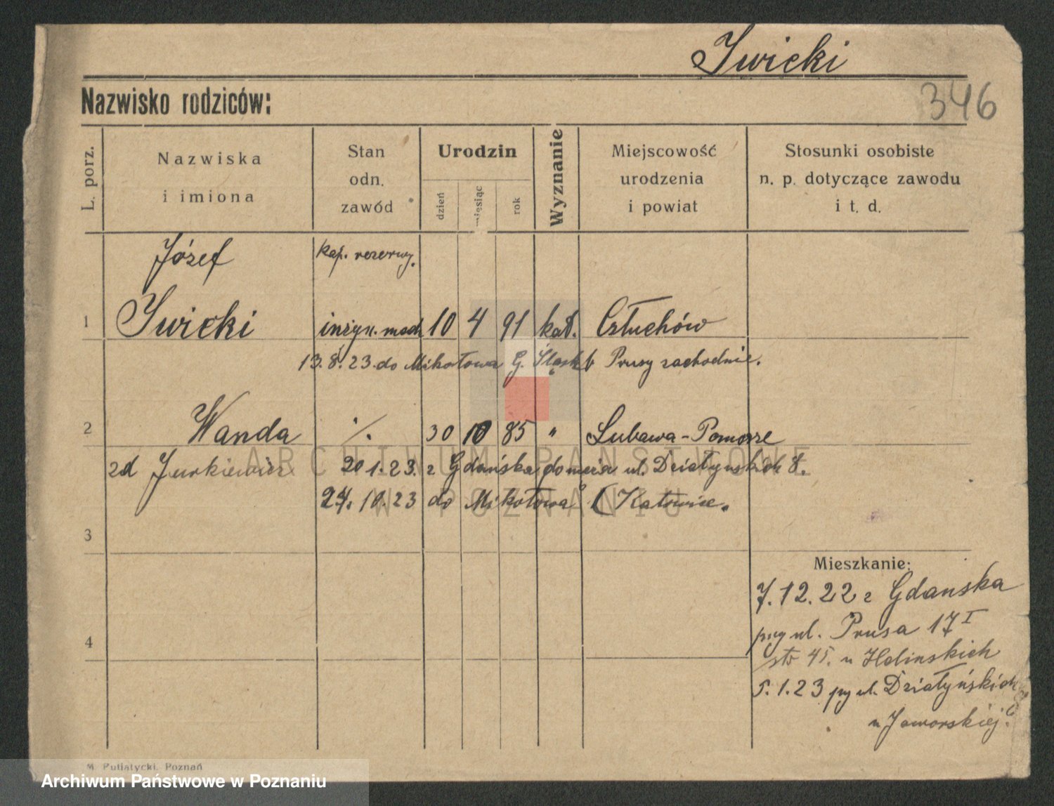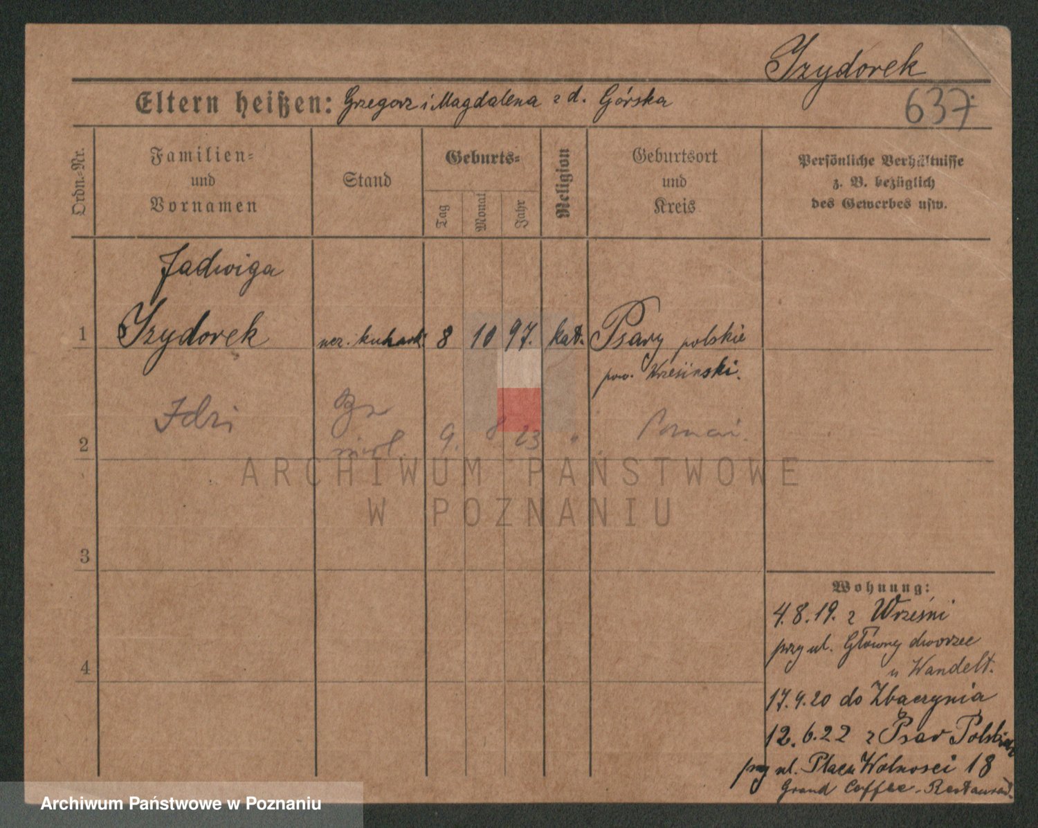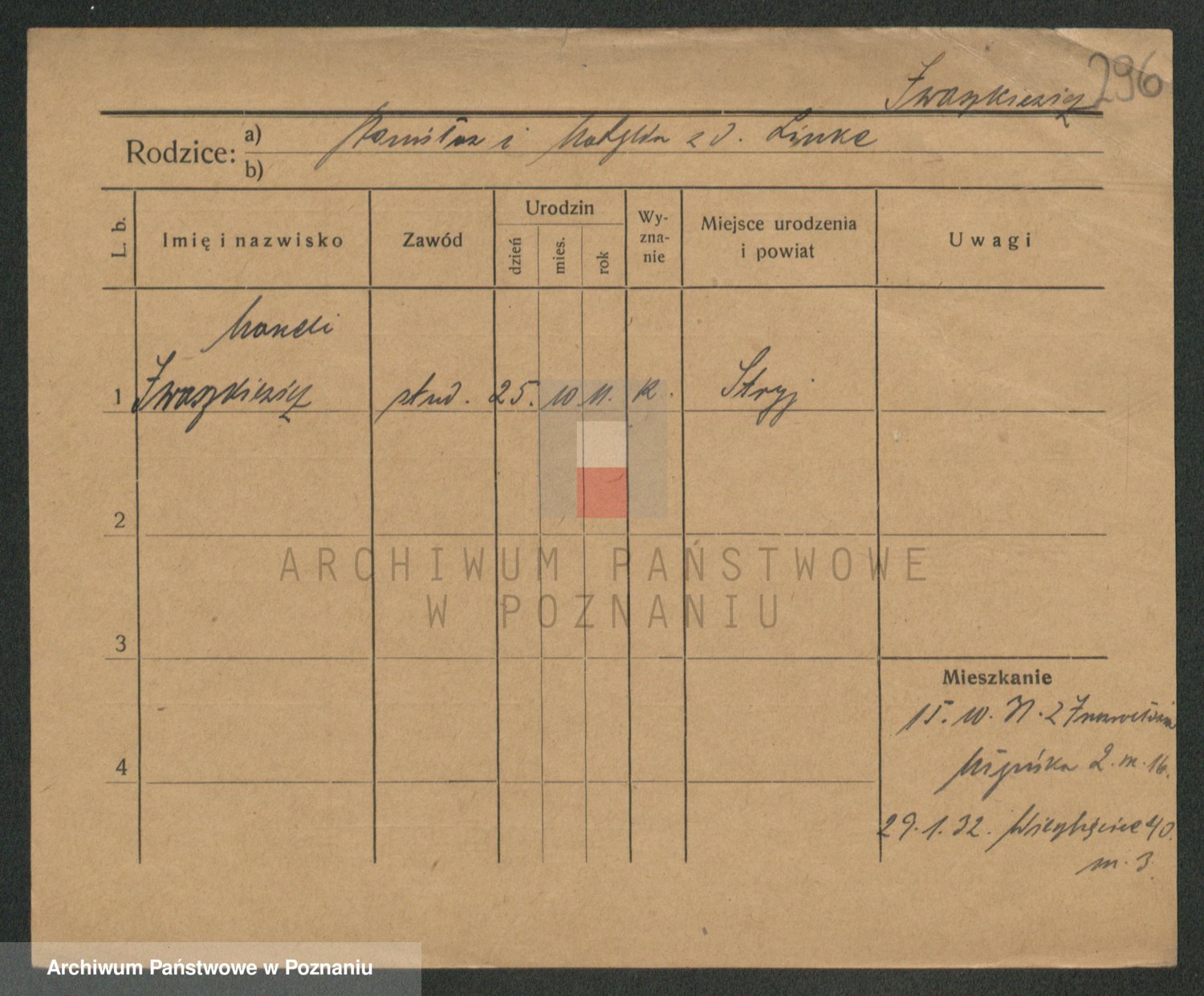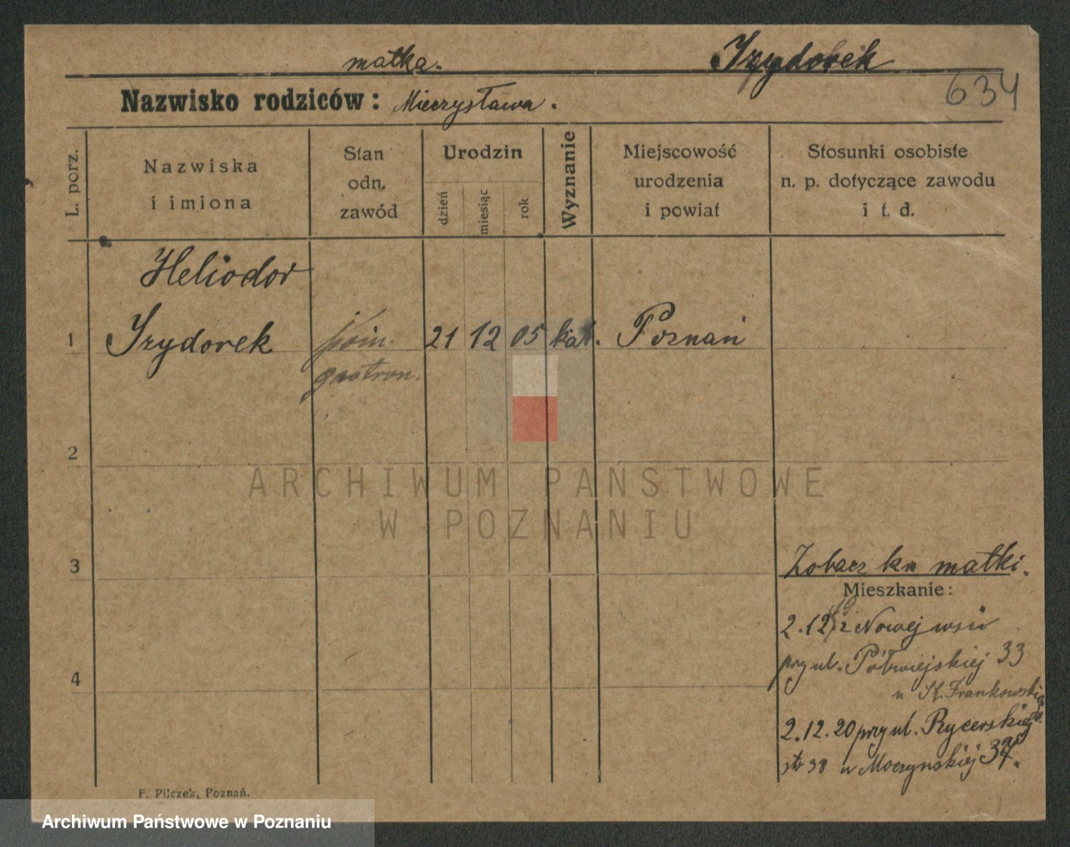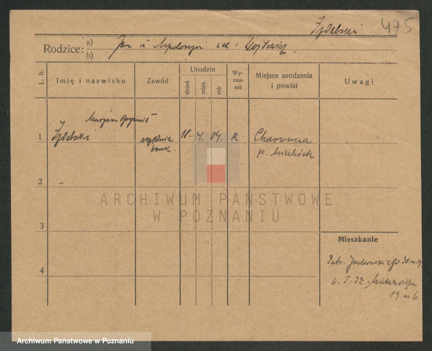 Podgląd karty osobowej dostępny jest po kliknięciu na nazwisko lub ikonkę karty. Można dokonywać powiększenia (ikony na górze) lub przechodzić między kolejnymi skanami (strzałki po bokach).