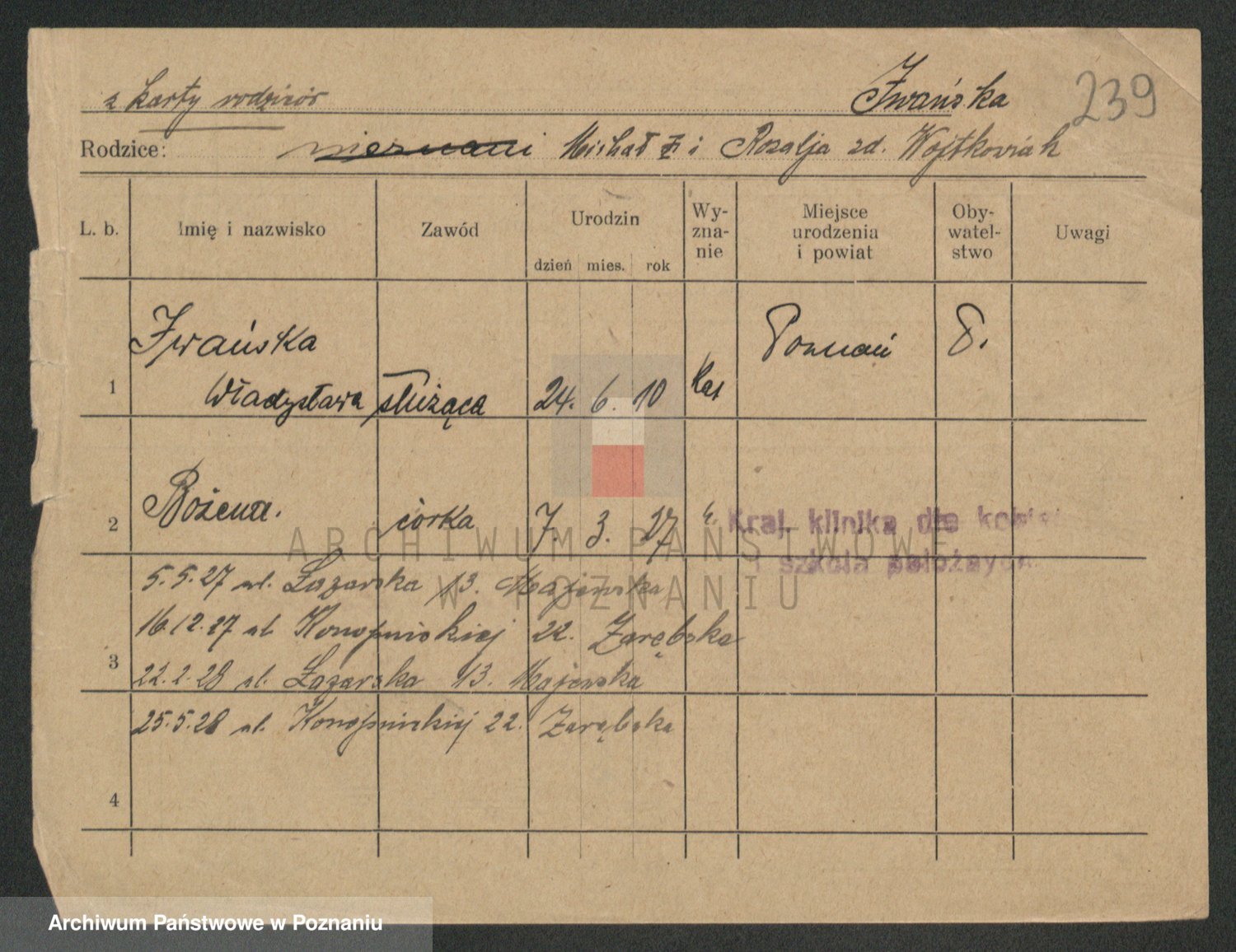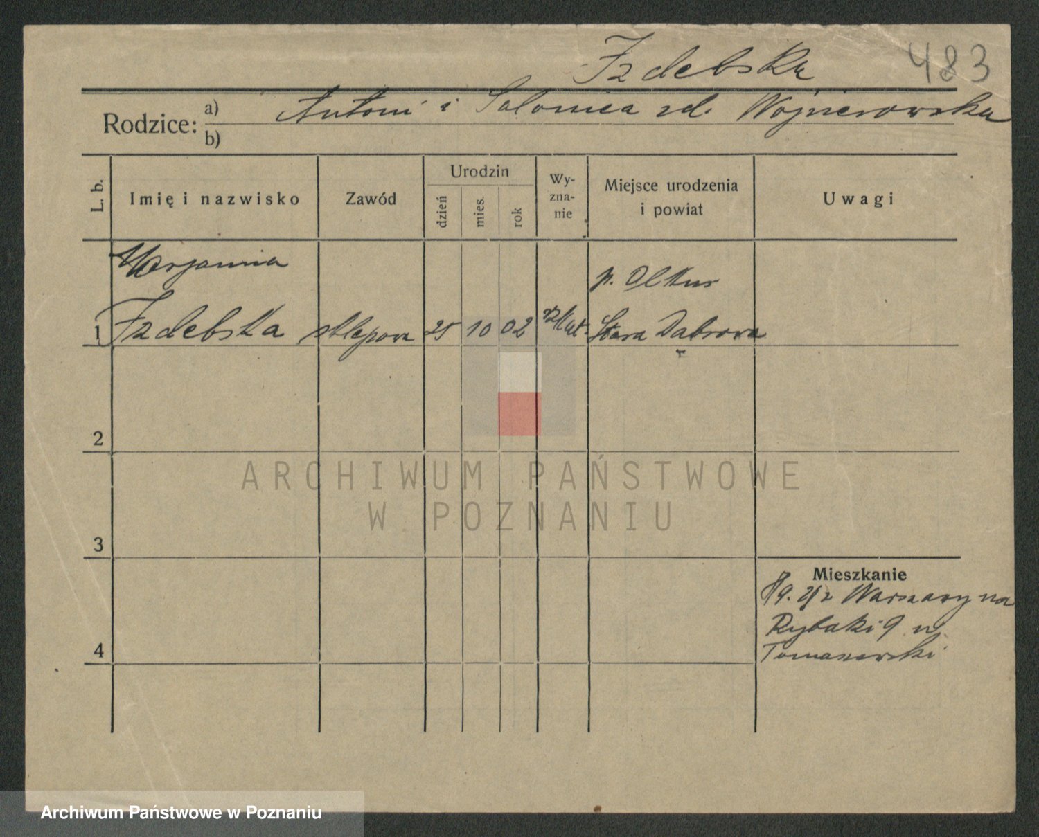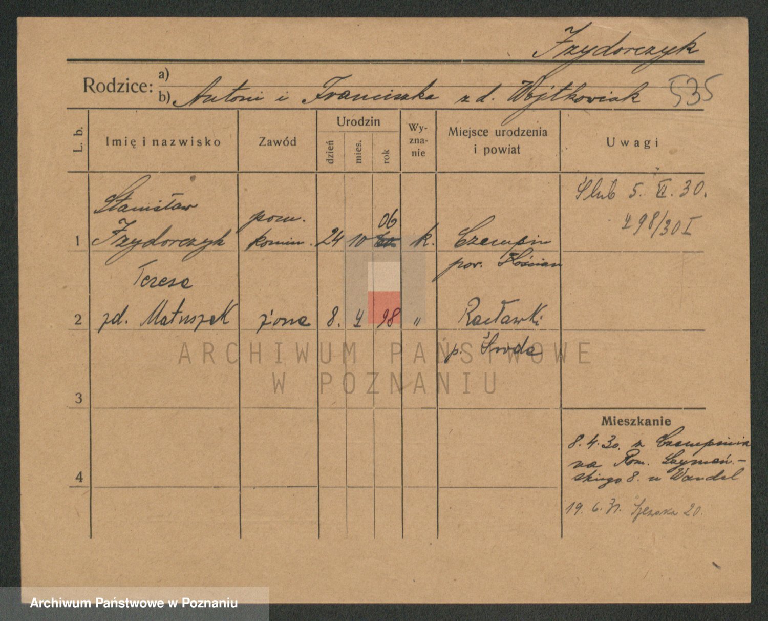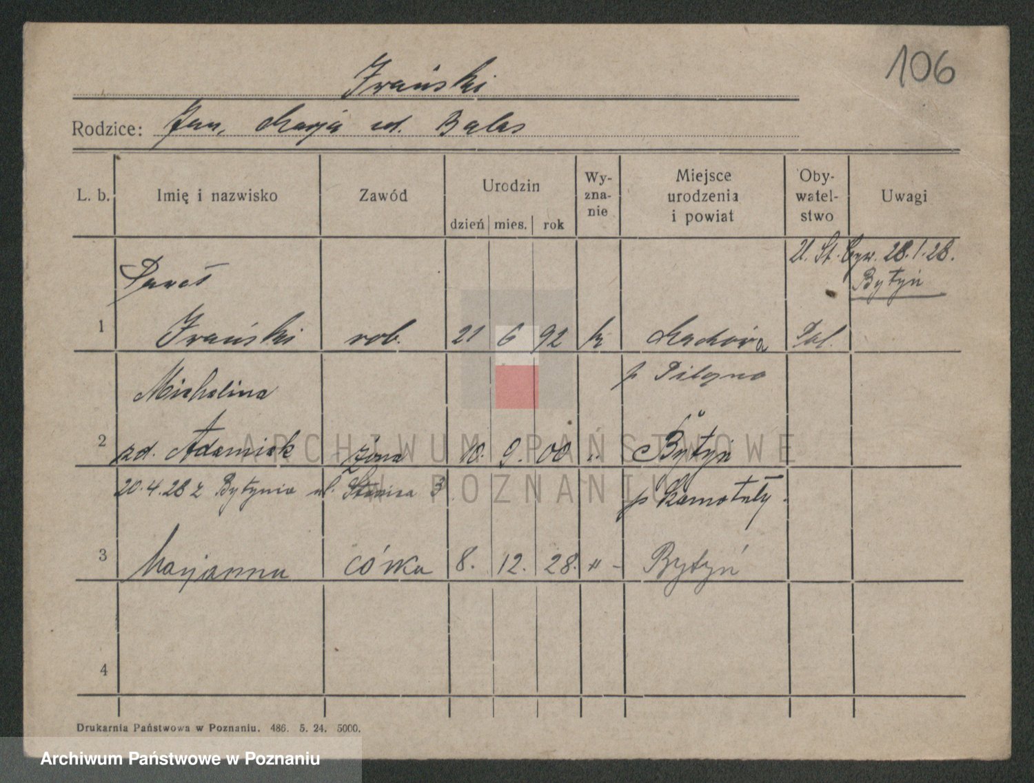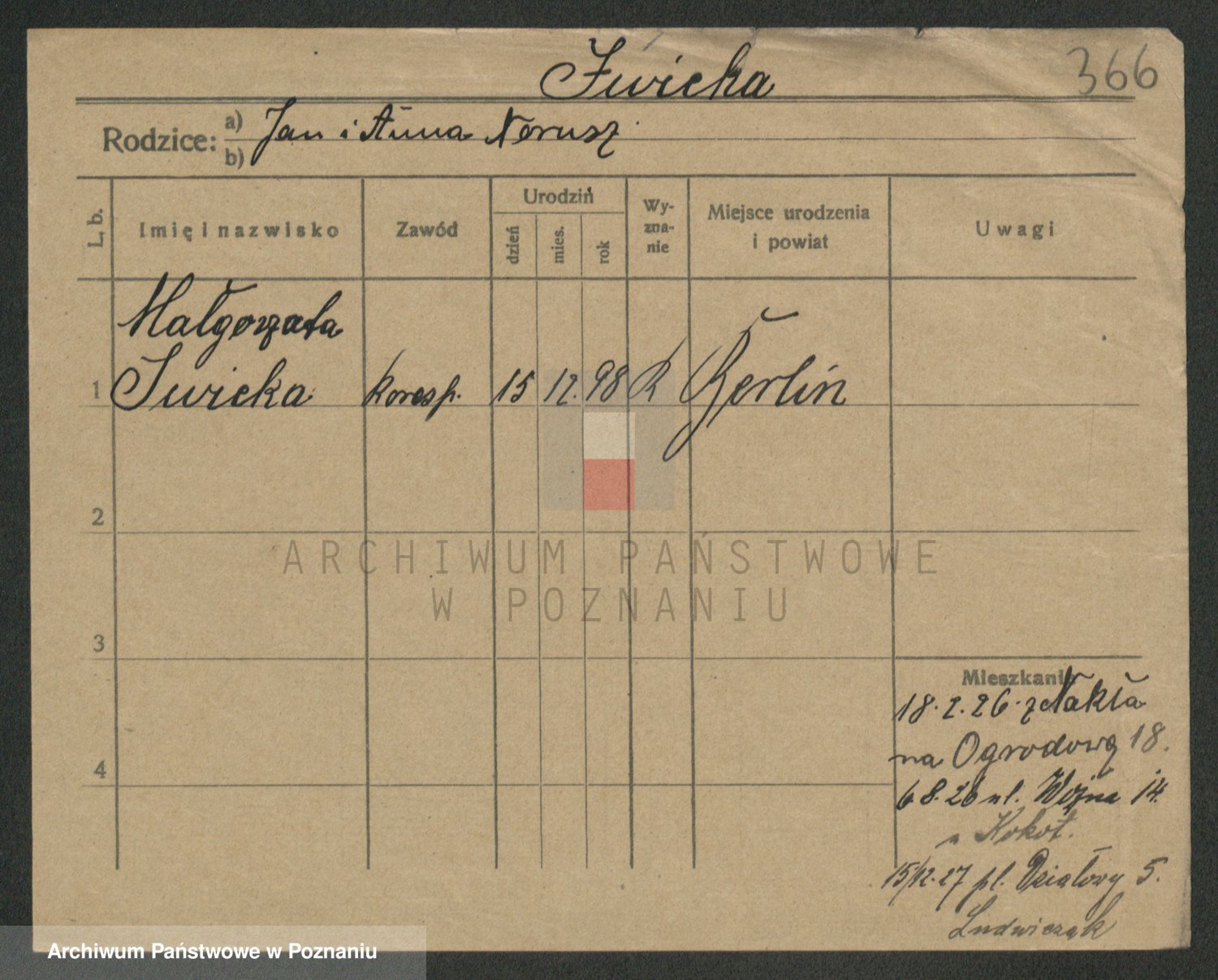 Podgląd karty osobowej dostępny jest po kliknięciu na nazwisko lub ikonkę karty. Można dokonywać powiększenia (ikony na górze) lub przechodzić między kolejnymi skanami (strzałki po bokach).