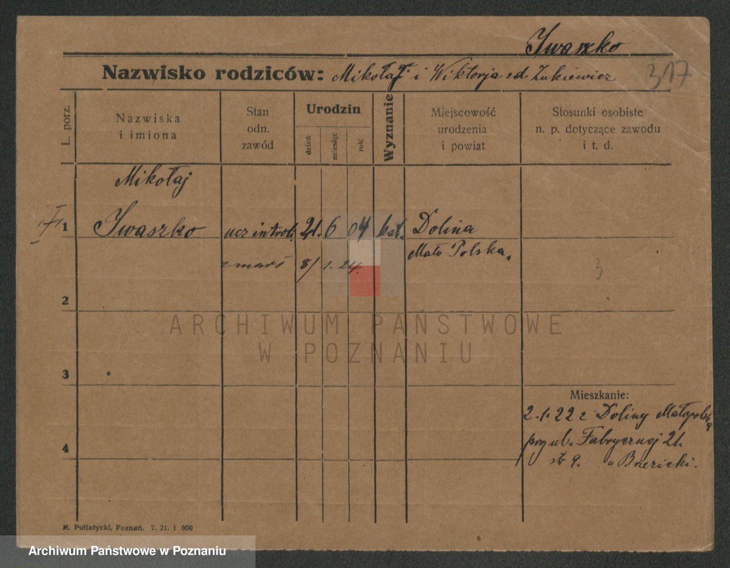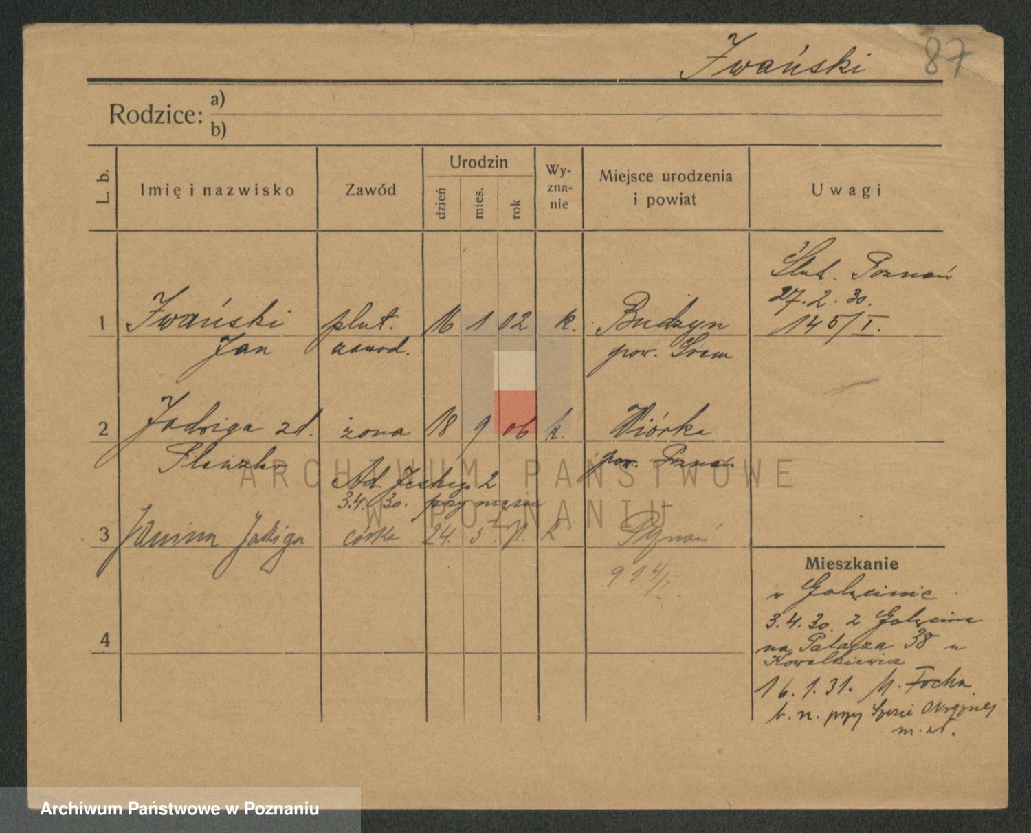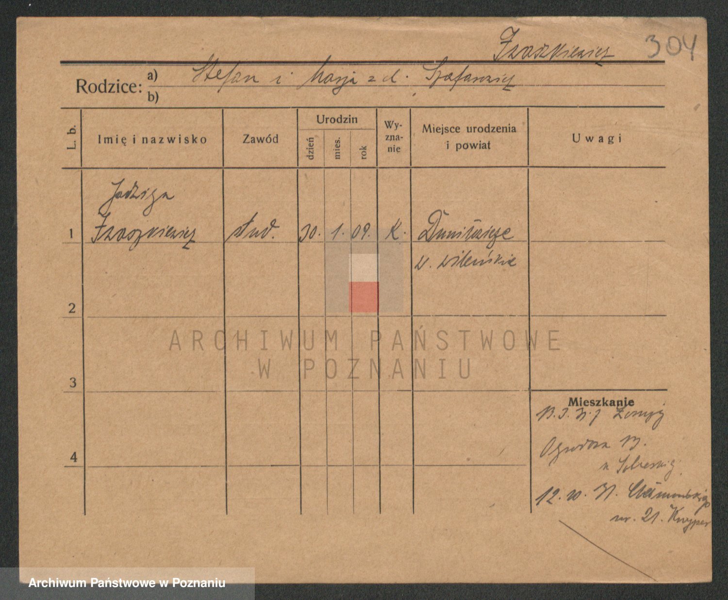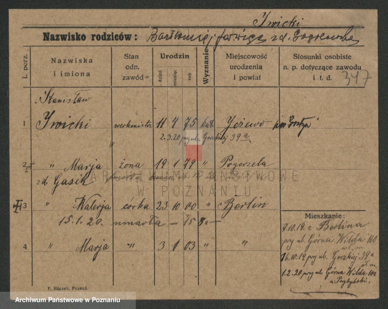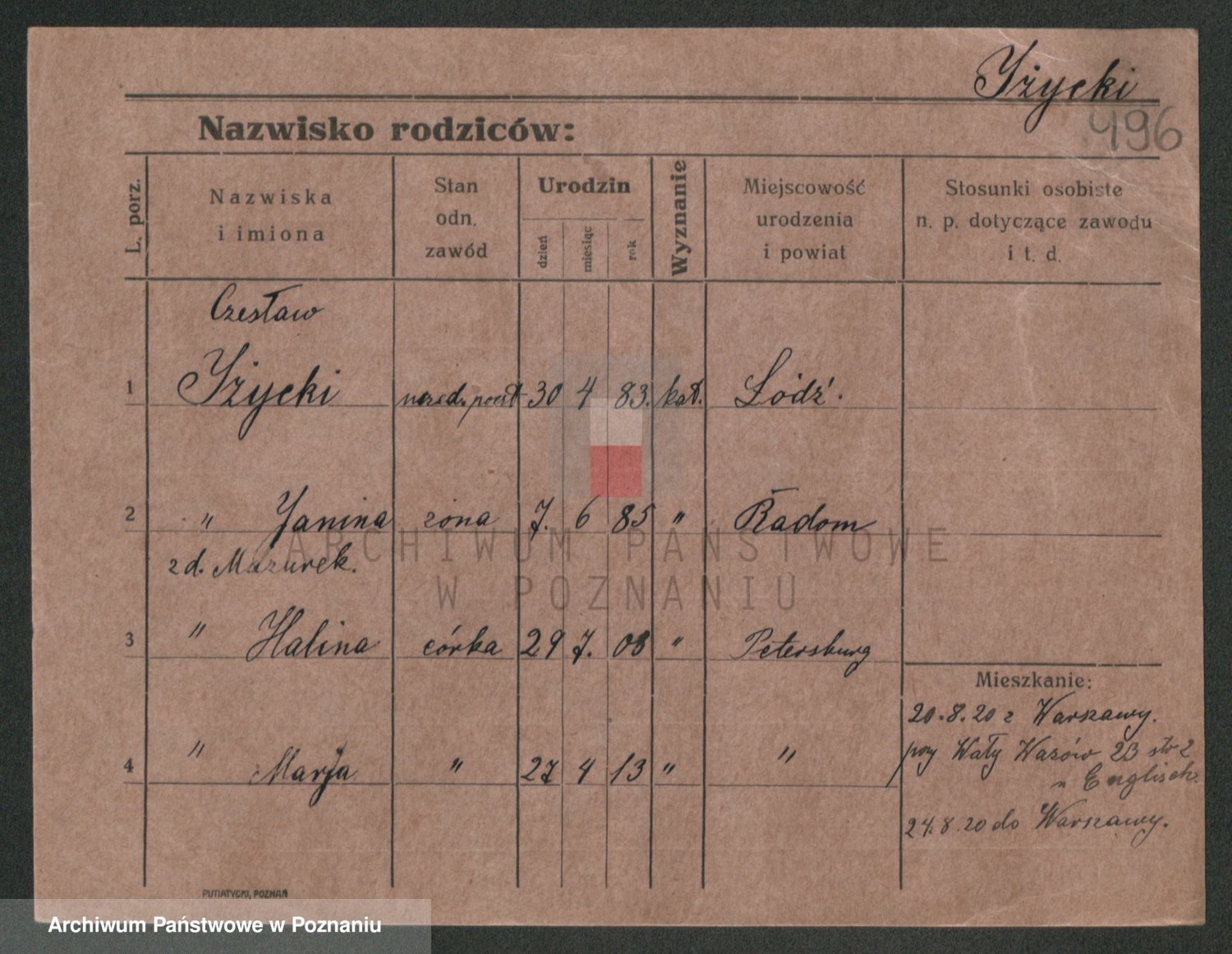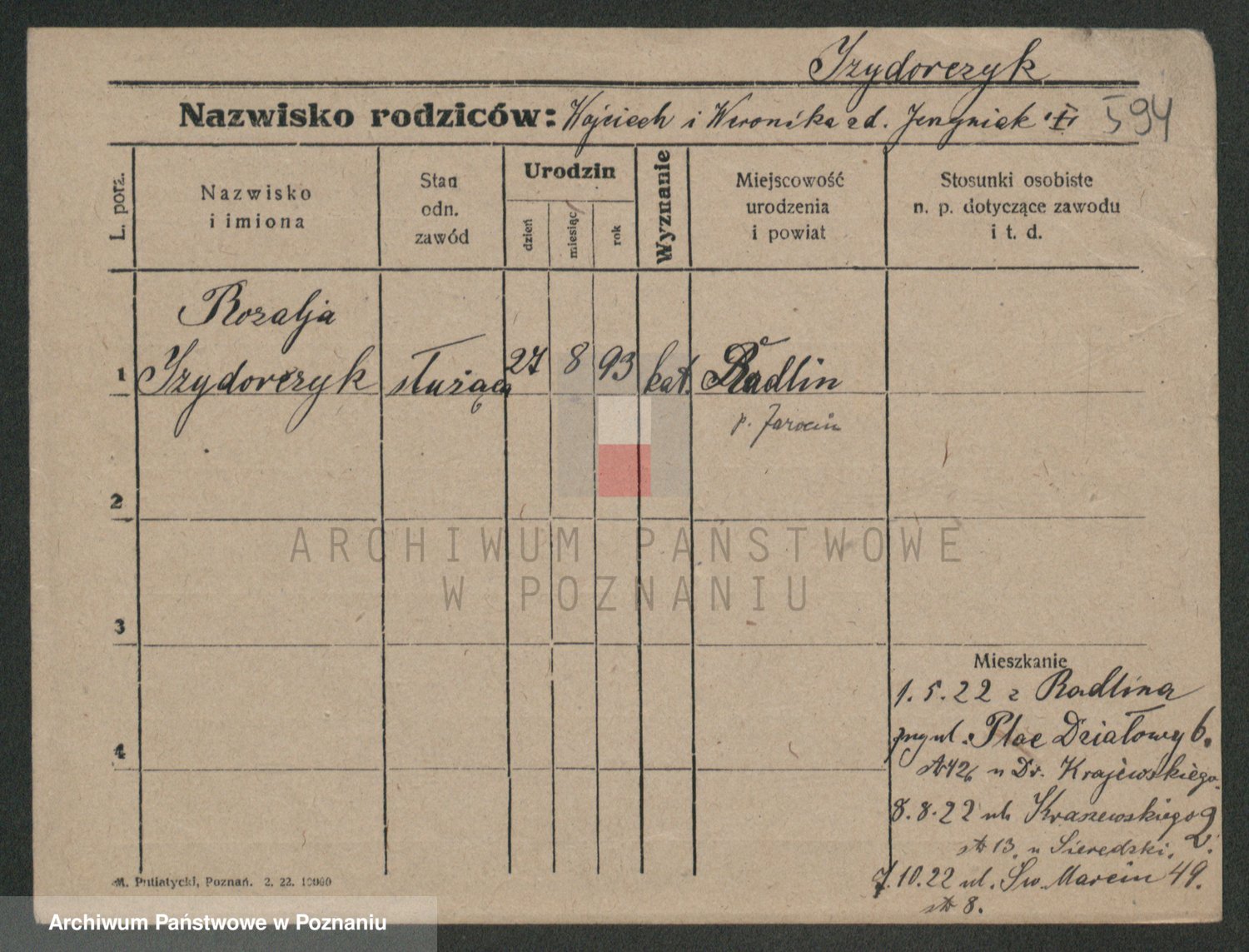 Podgląd karty osobowej dostępny jest po kliknięciu na nazwisko lub ikonkę karty. Można dokonywać powiększenia (ikony na górze) lub przechodzić między kolejnymi skanami (strzałki po bokach).