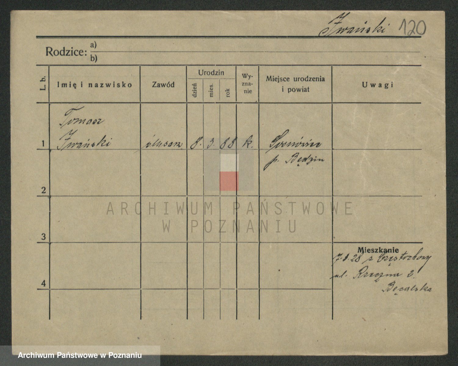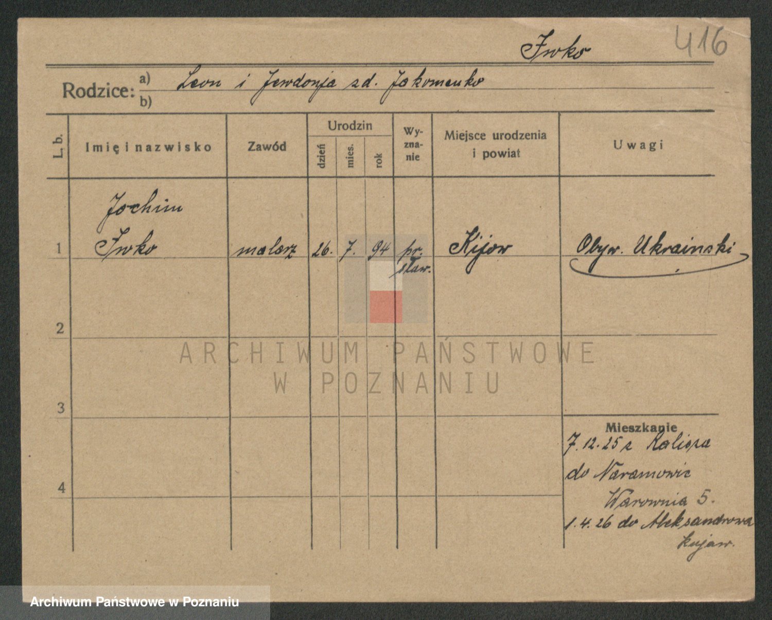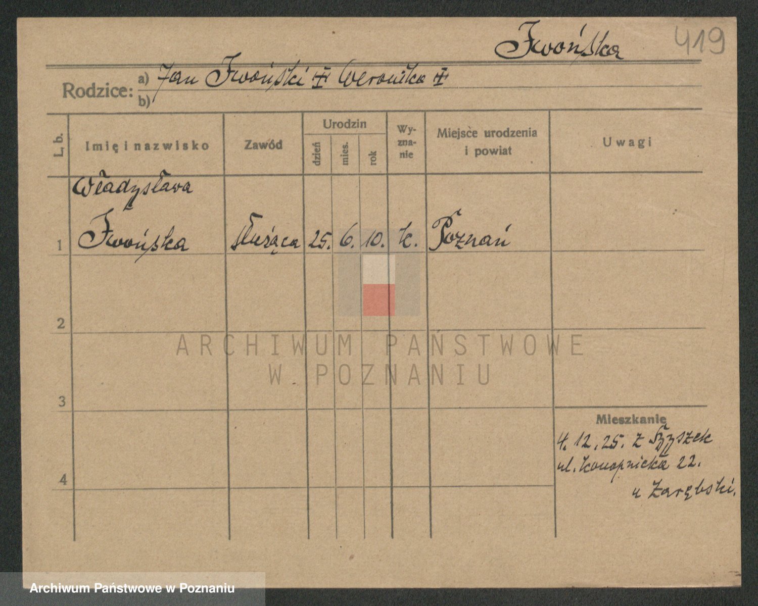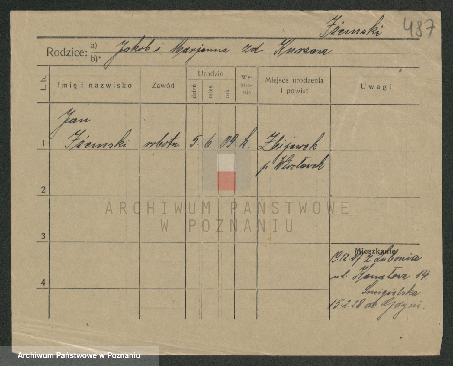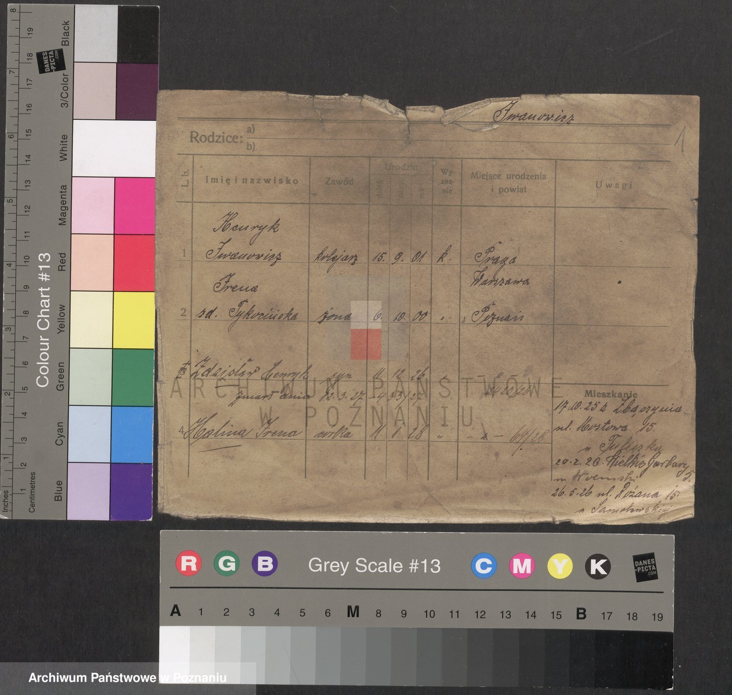 Podgląd karty osobowej dostępny jest po kliknięciu na nazwisko lub ikonkę karty. Można dokonywać powiększenia (ikony na górze) lub przechodzić między kolejnymi skanami (strzałki po bokach).