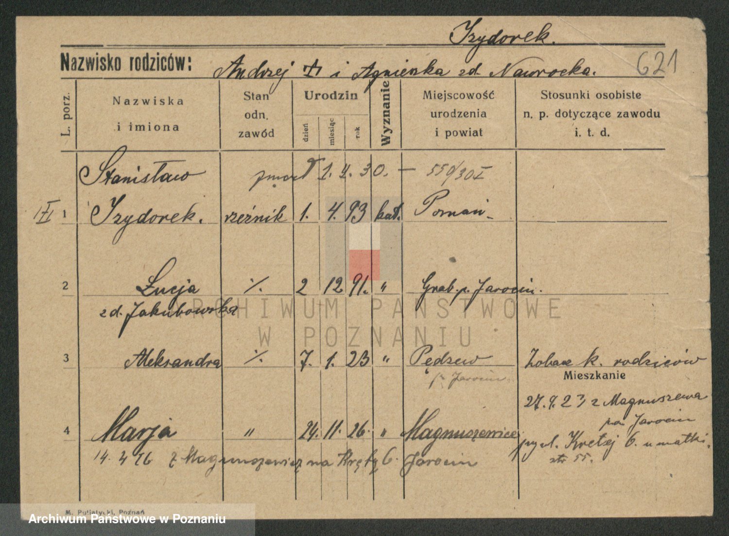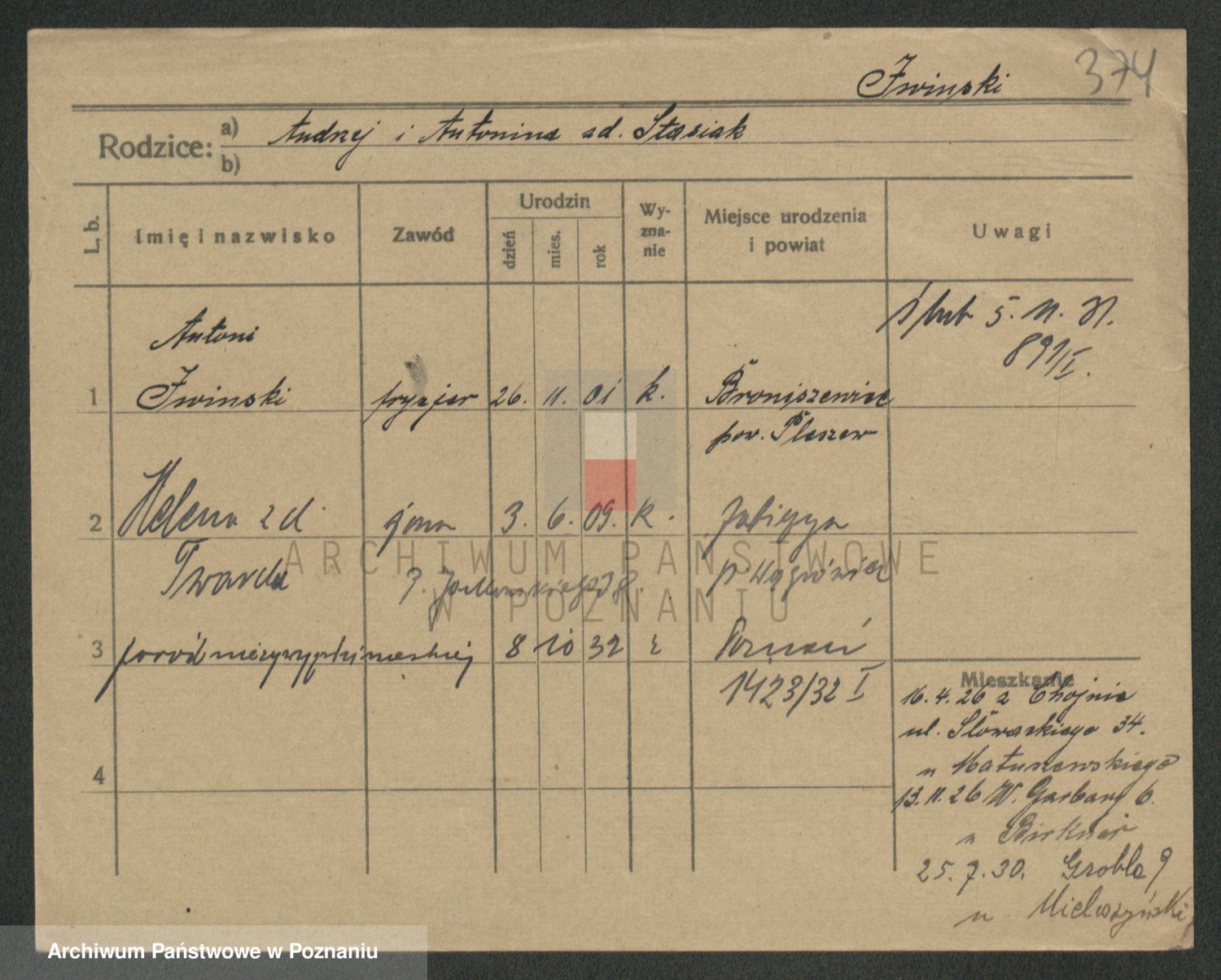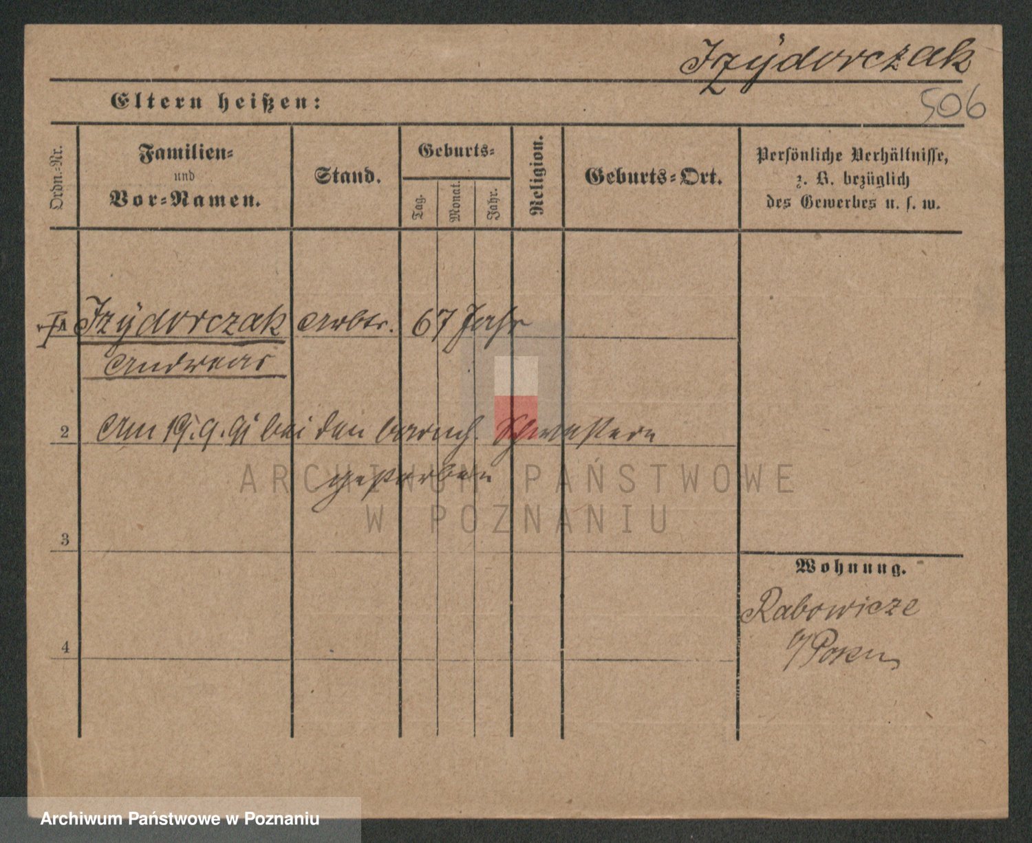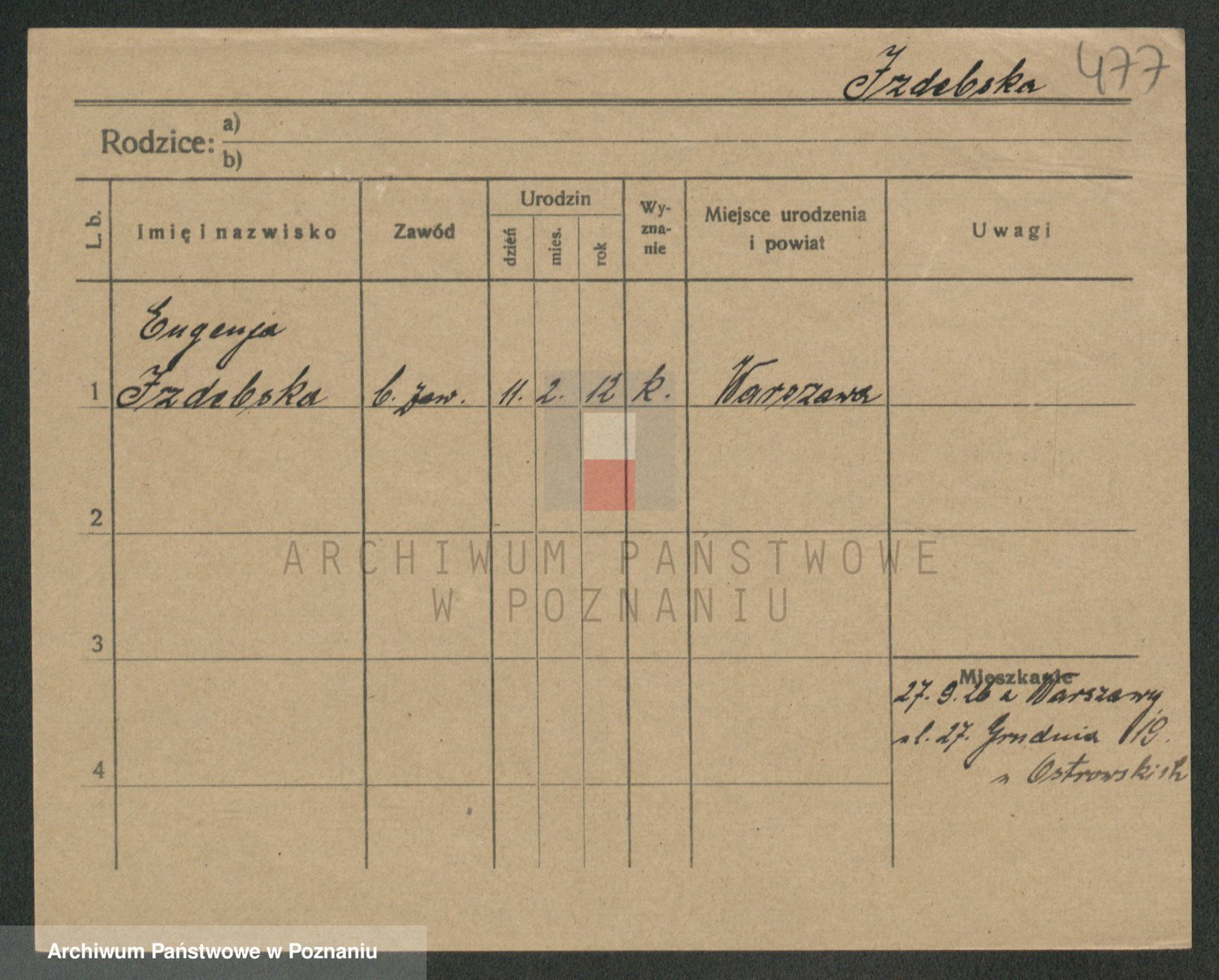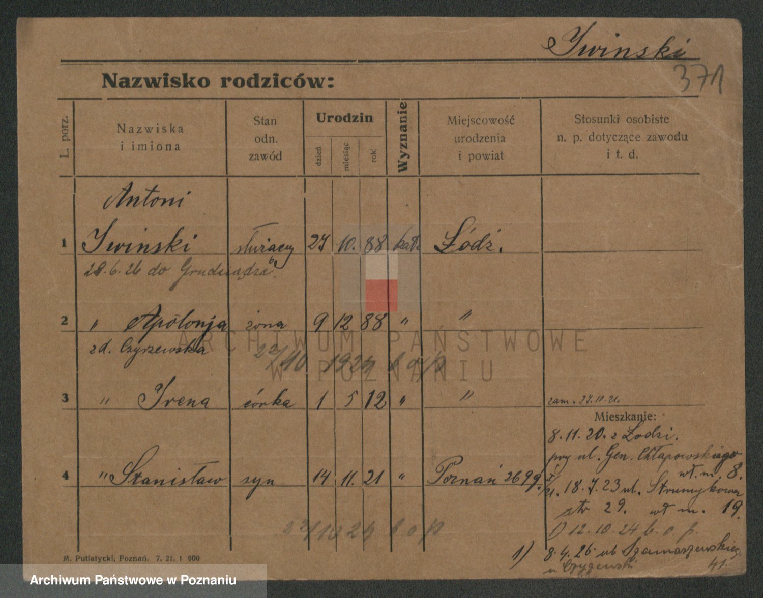 Podgląd karty osobowej dostępny jest po kliknięciu na nazwisko lub ikonkę karty. Można dokonywać powiększenia (ikony na górze) lub przechodzić między kolejnymi skanami (strzałki po bokach).