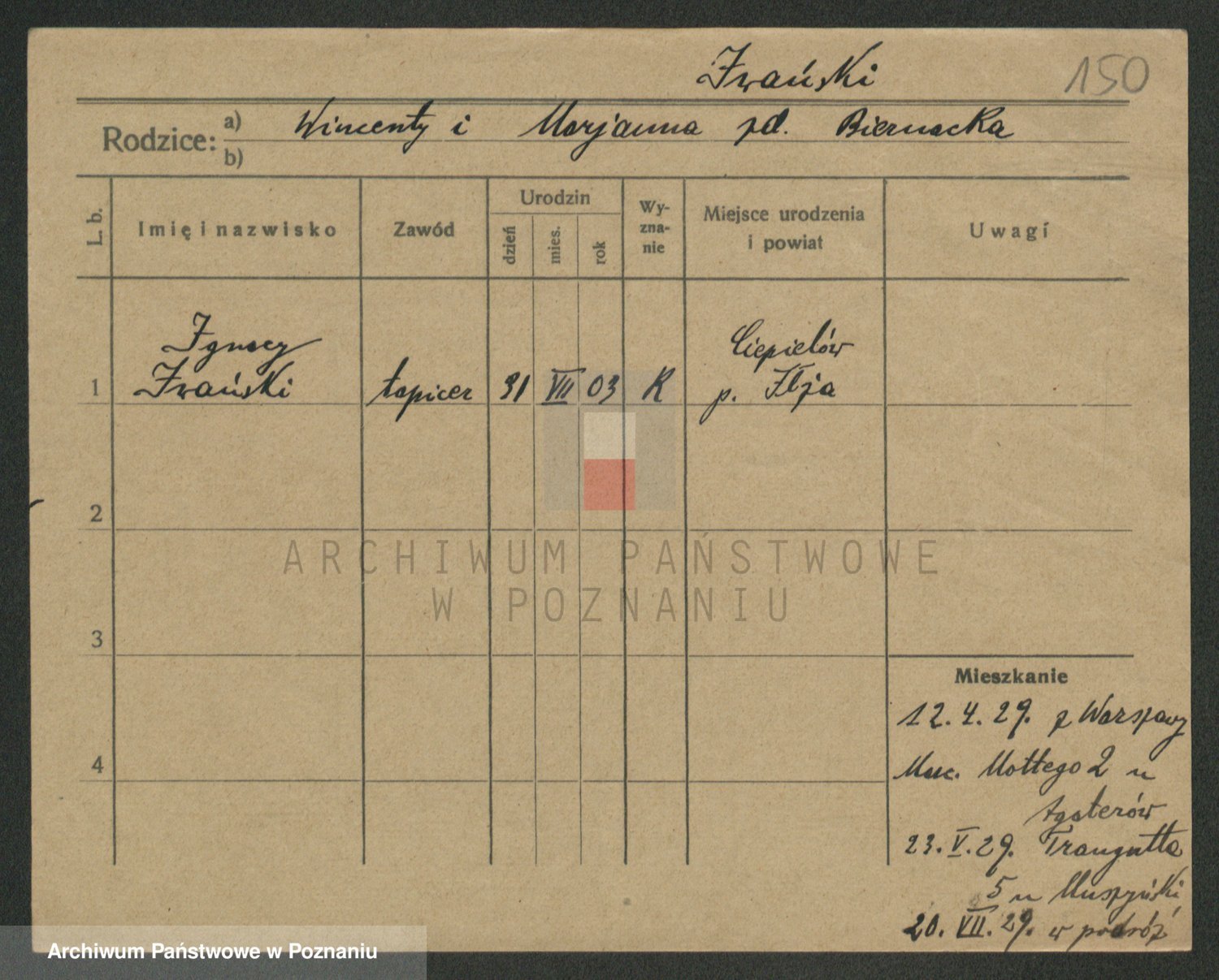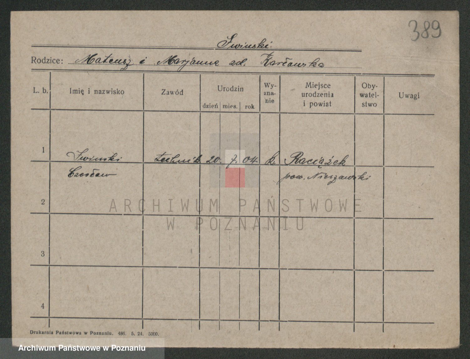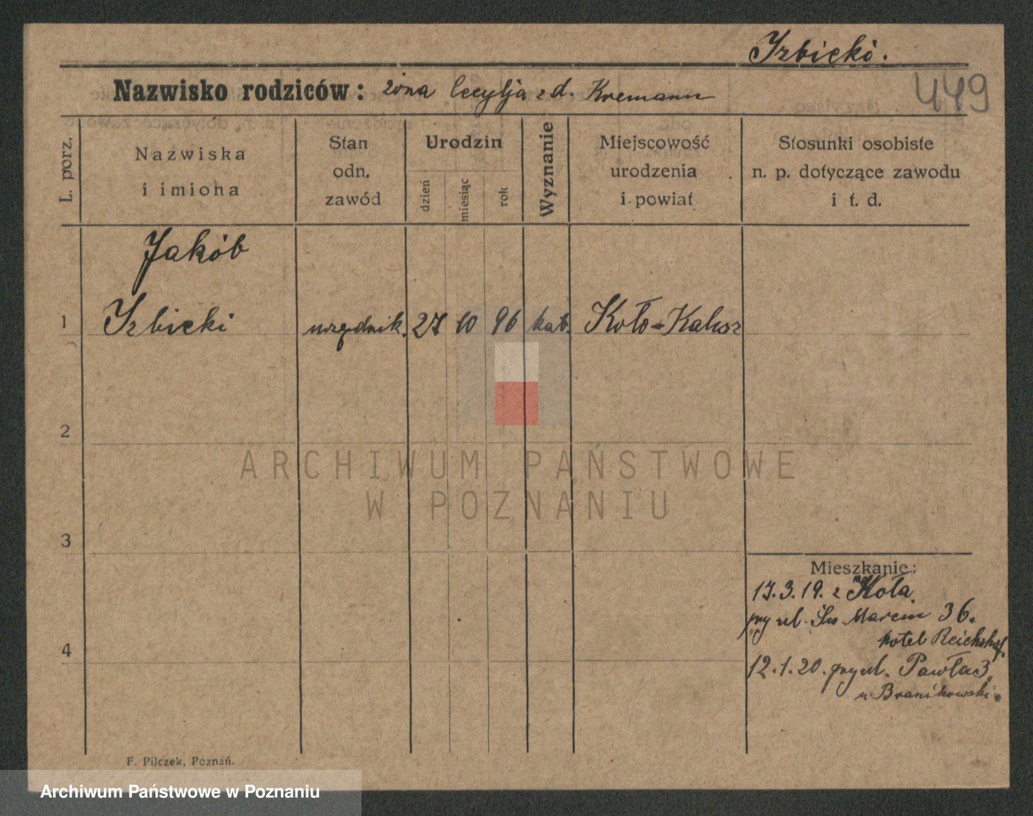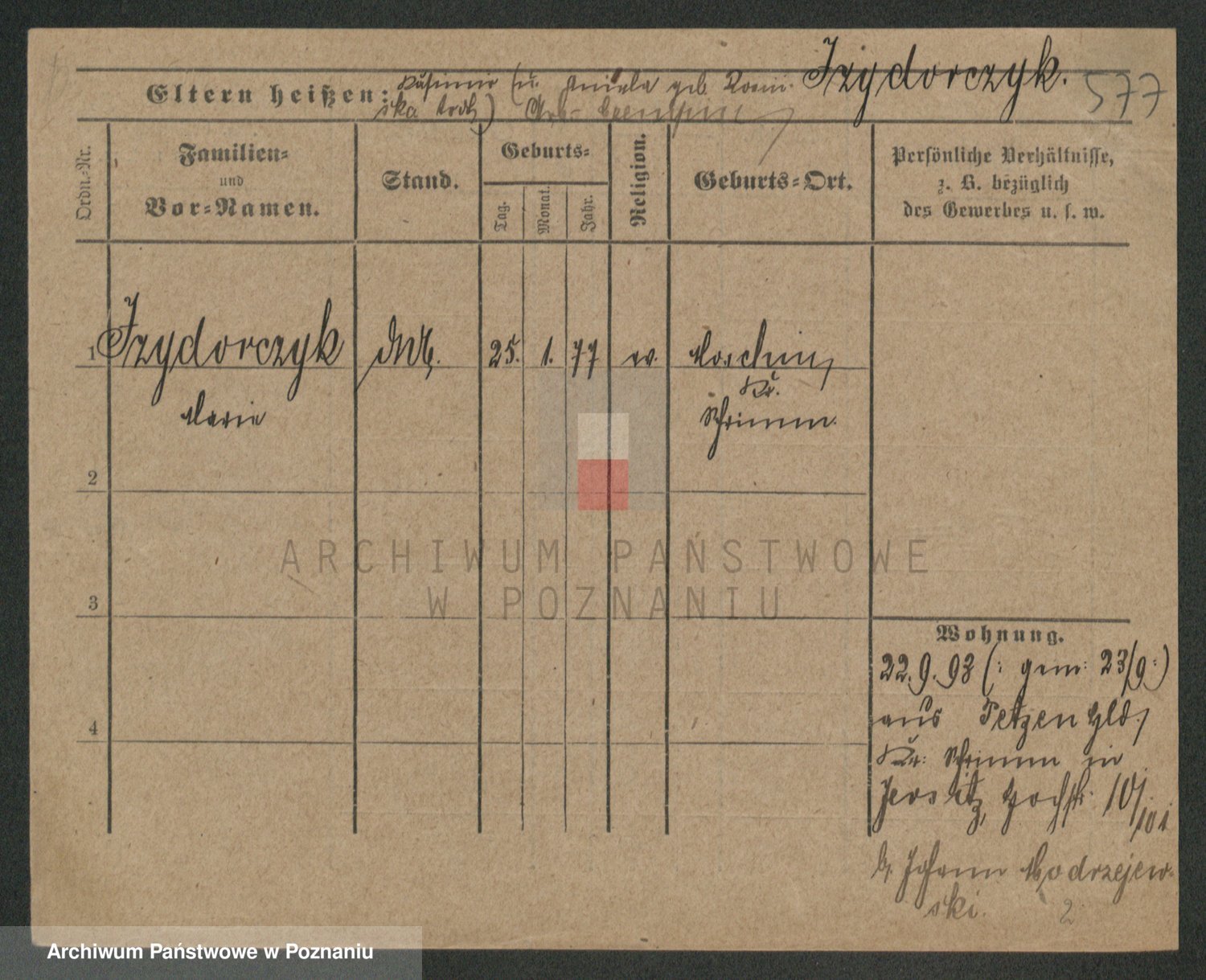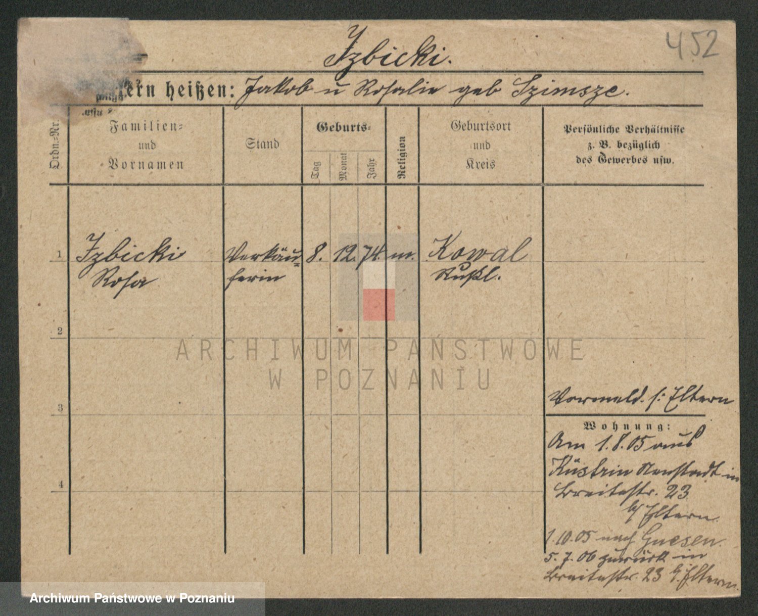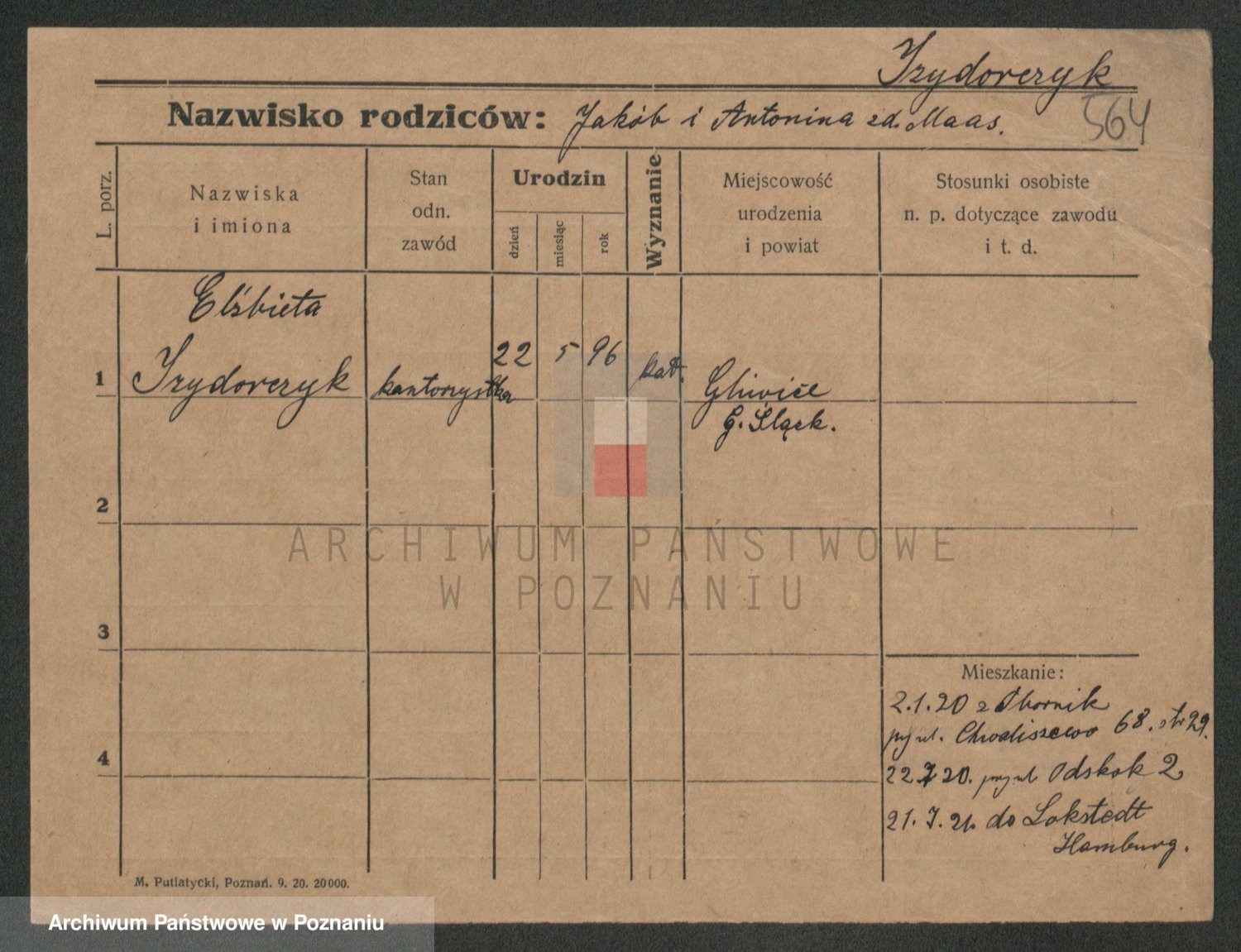 Podgląd karty osobowej dostępny jest po kliknięciu na nazwisko lub ikonkę karty. Można dokonywać powiększenia (ikony na górze) lub przechodzić między kolejnymi skanami (strzałki po bokach).