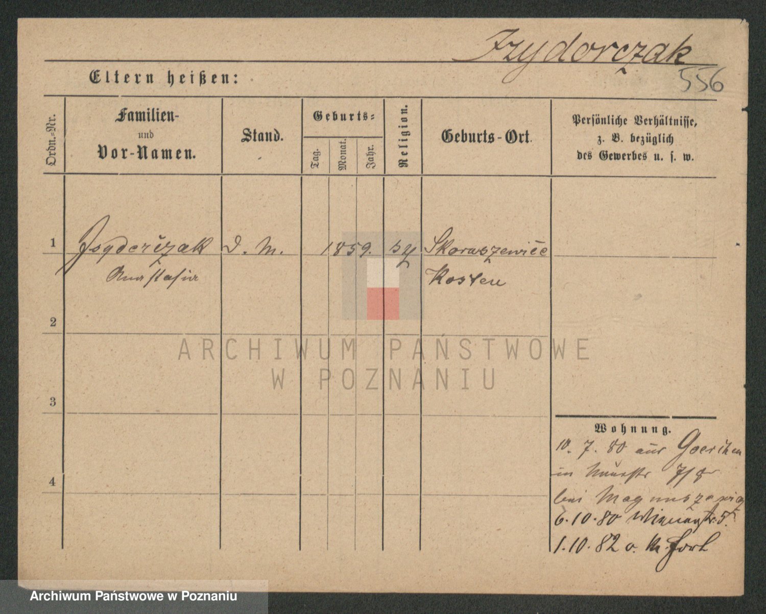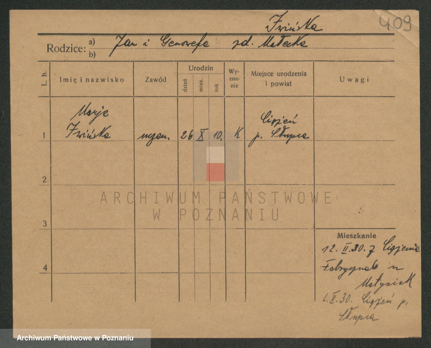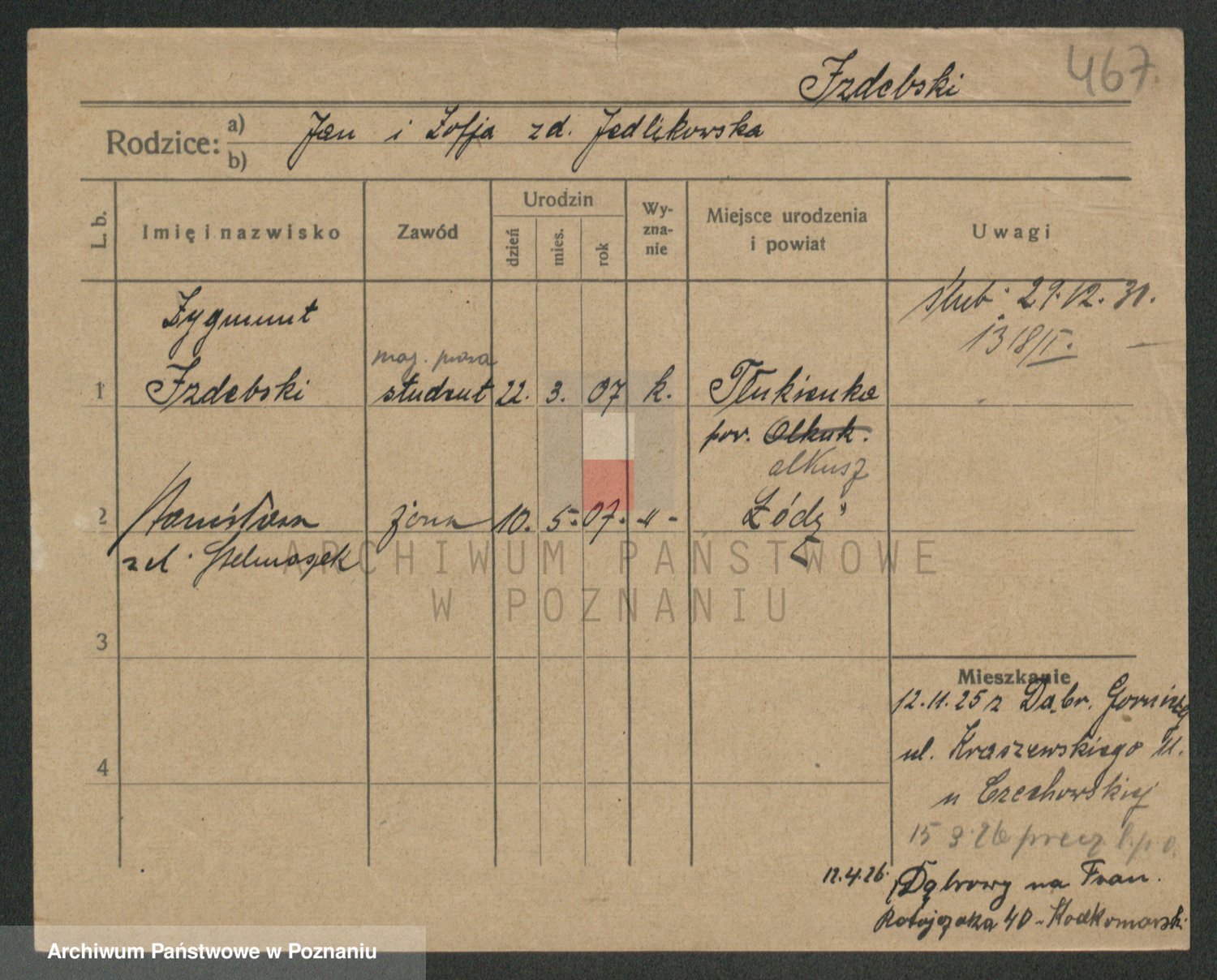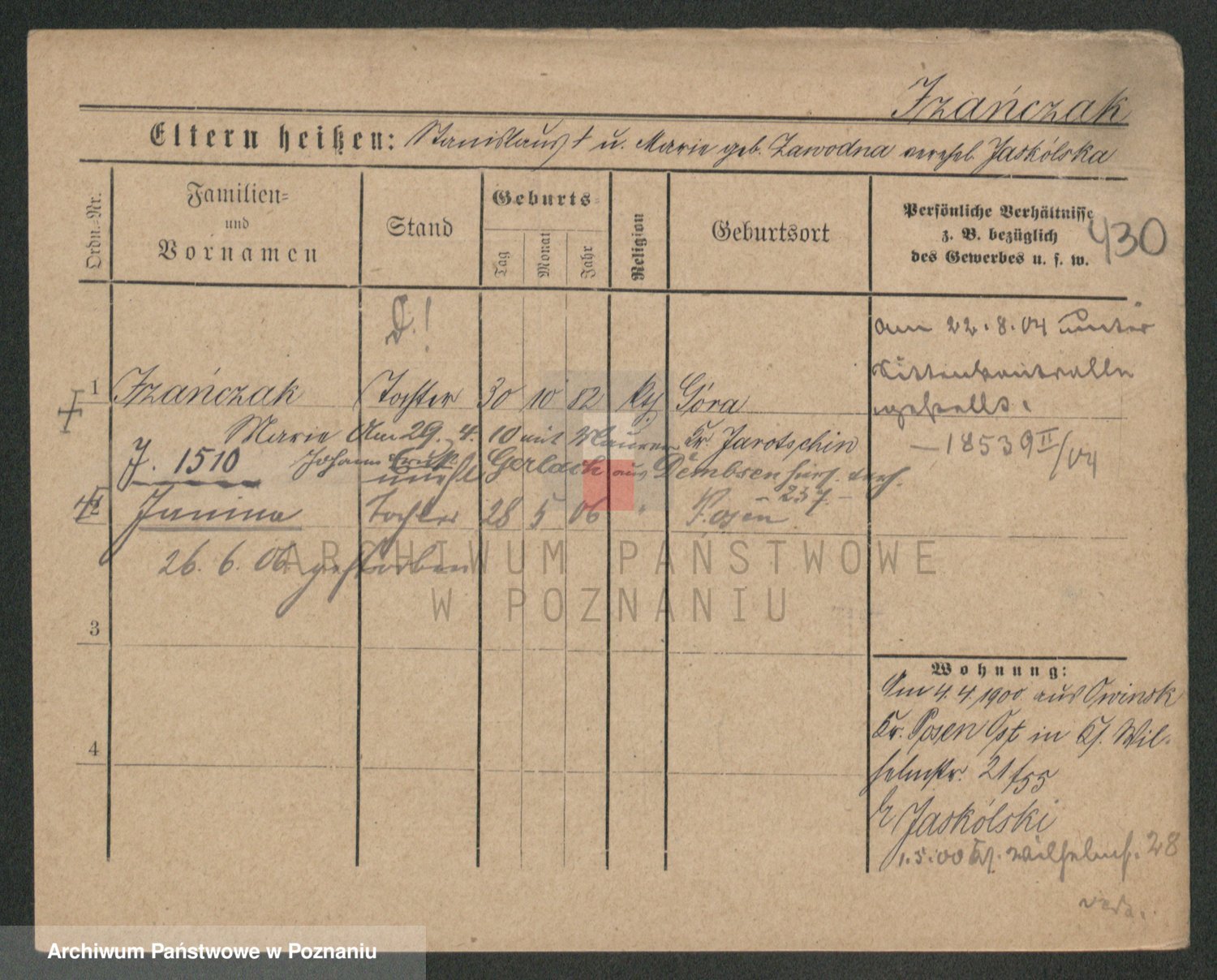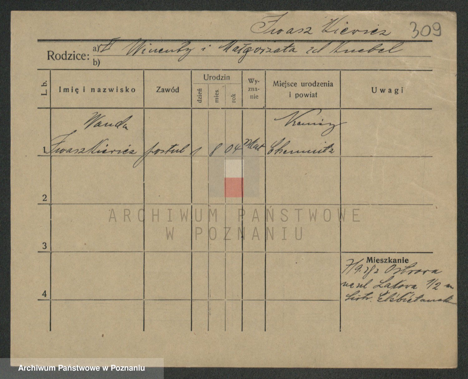 Podgląd karty osobowej dostępny jest po kliknięciu na nazwisko lub ikonkę karty. Można dokonywać powiększenia (ikony na górze) lub przechodzić między kolejnymi skanami (strzałki po bokach).
