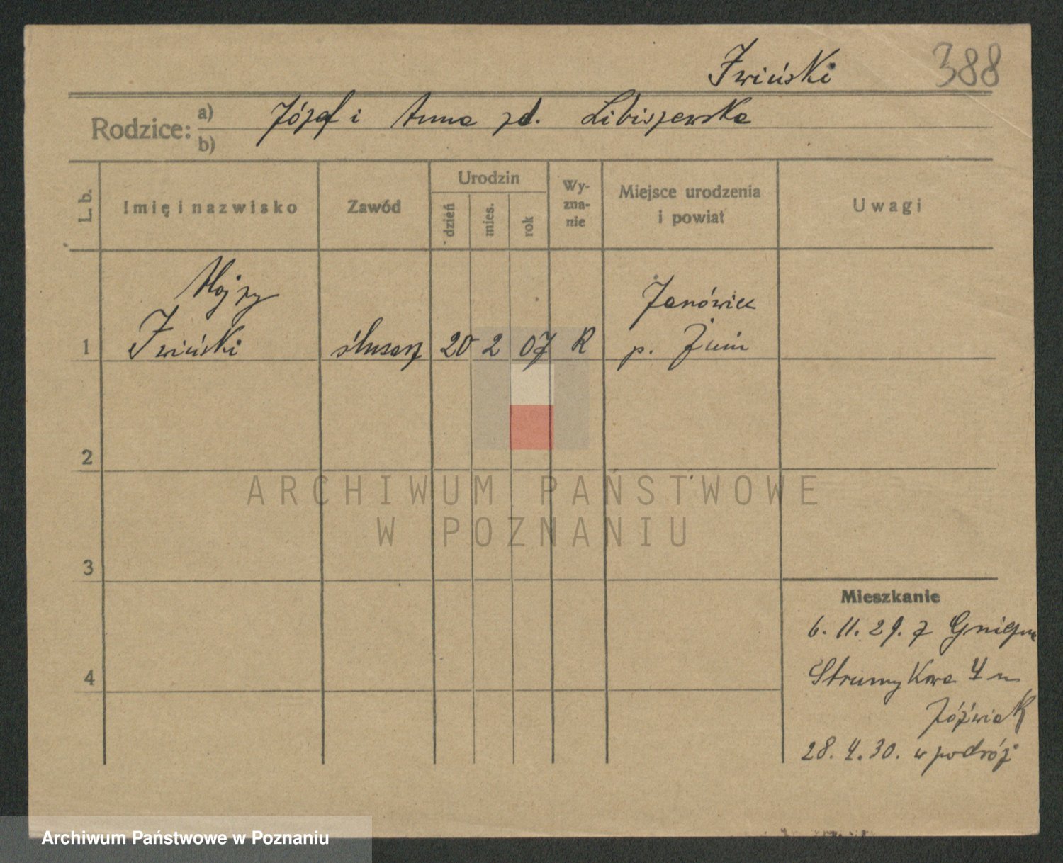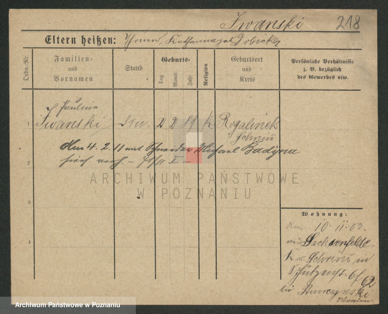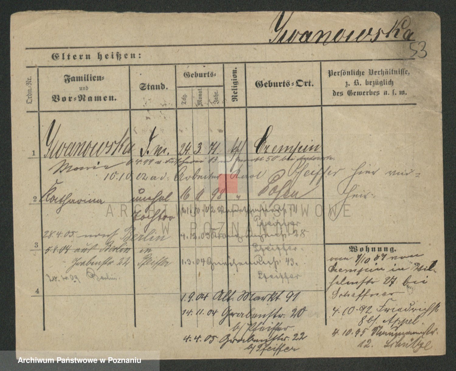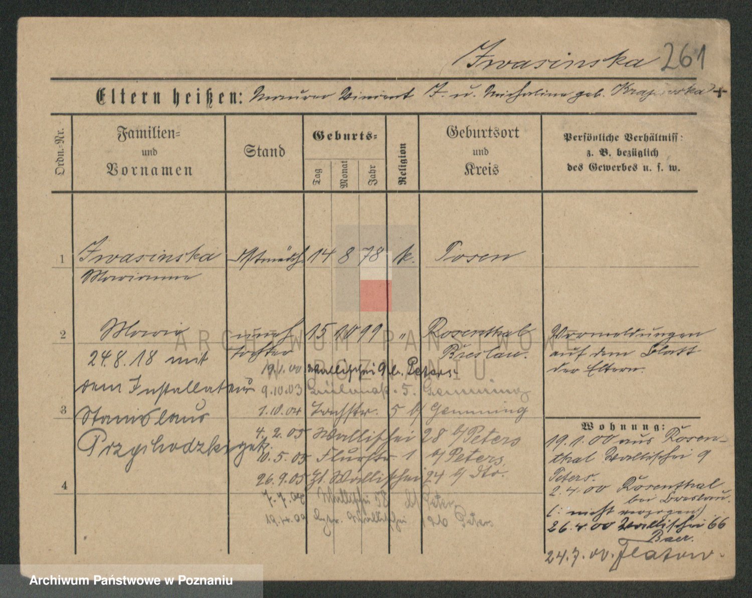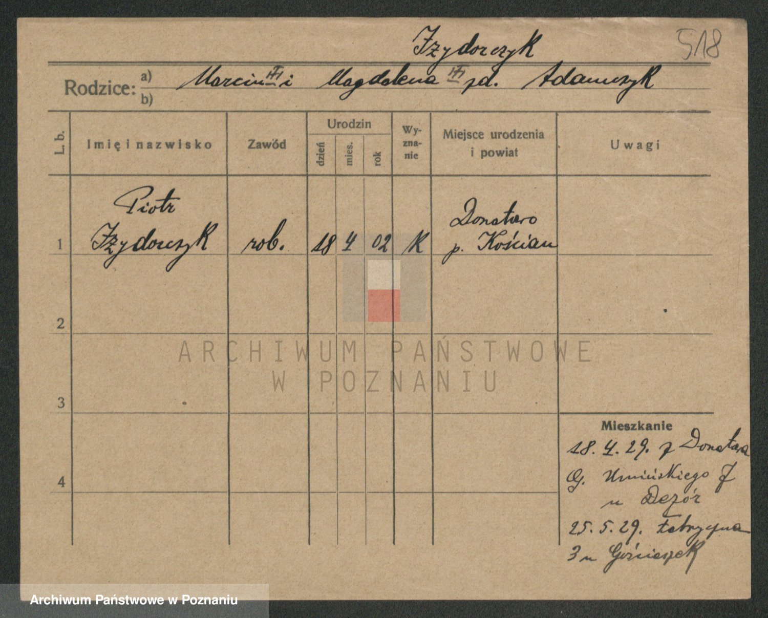 Podgląd karty osobowej dostępny jest po kliknięciu na nazwisko lub ikonkę karty. Można dokonywać powiększenia (ikony na górze) lub przechodzić między kolejnymi skanami (strzałki po bokach).